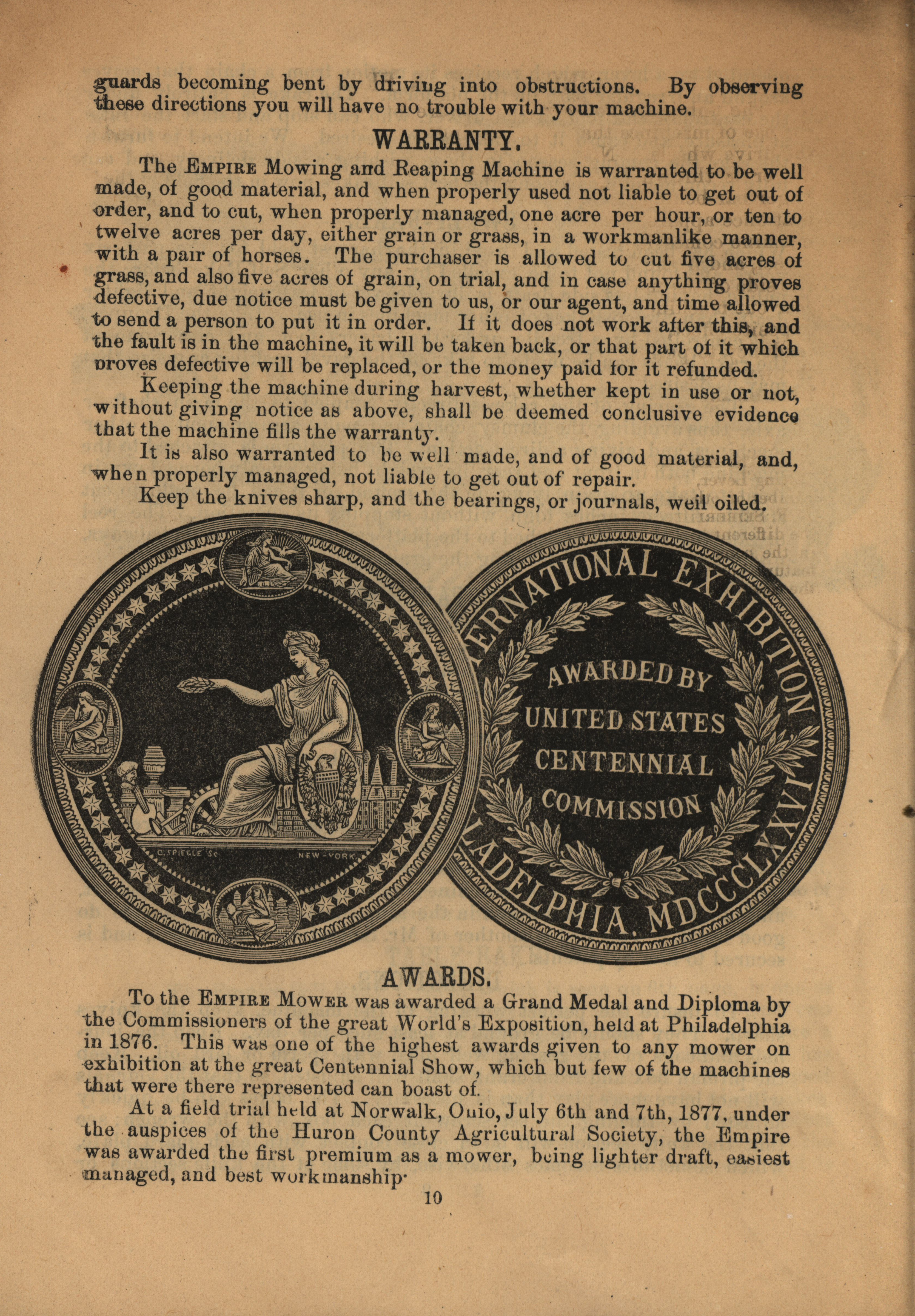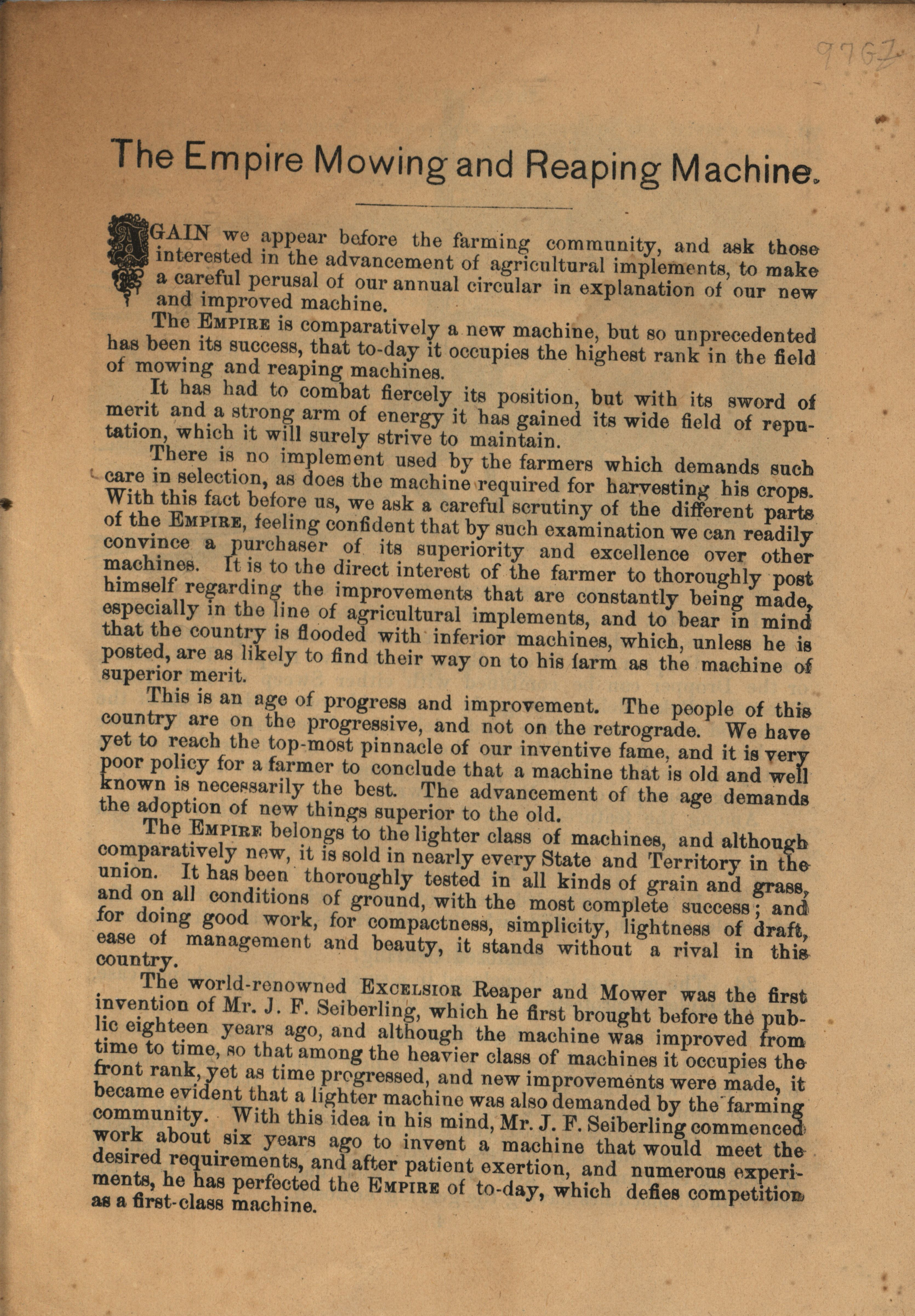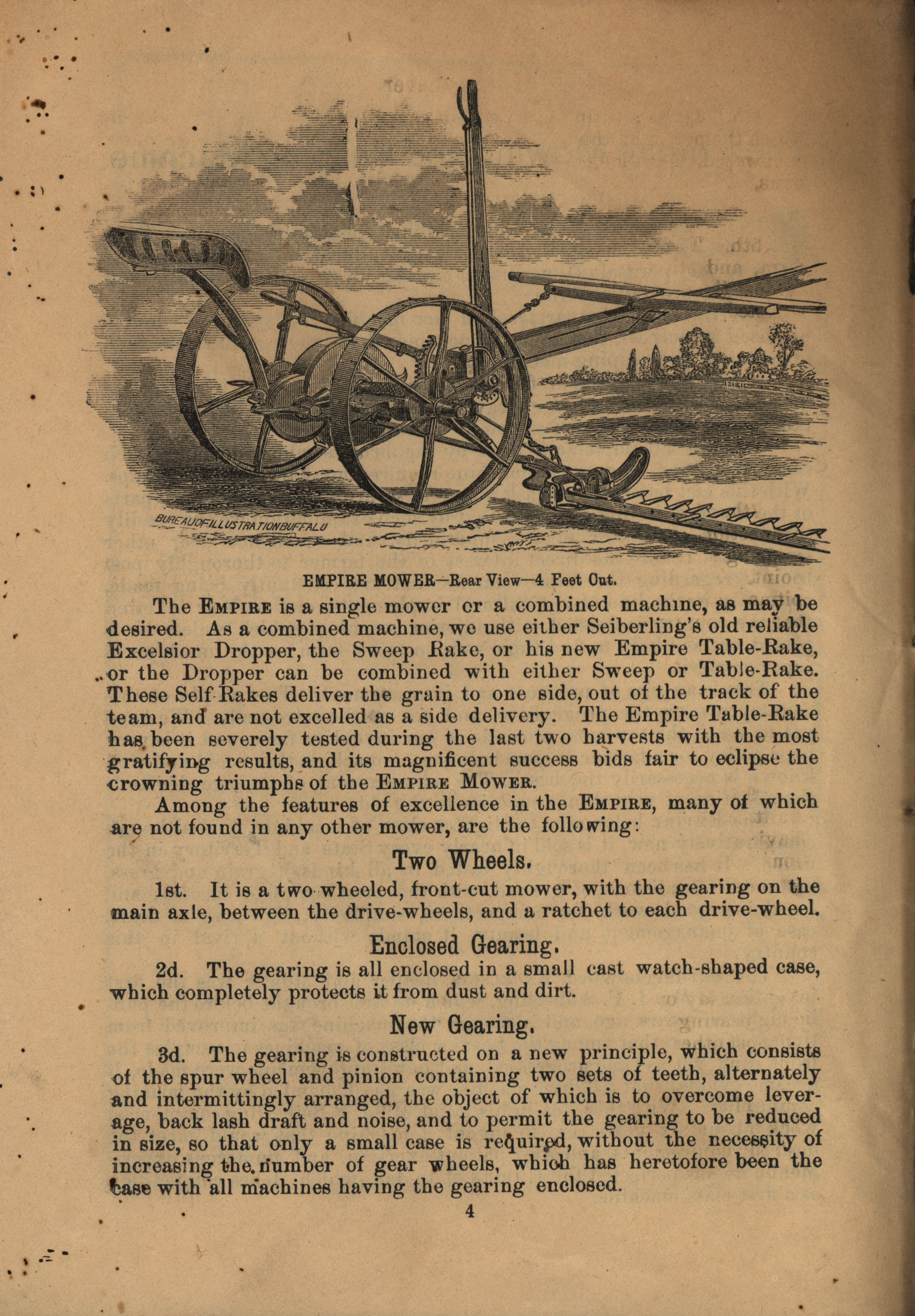 - Illustrated catalog describing the Empire mower and reaper product line offered by Cline, Seiberling and Company in 1878.