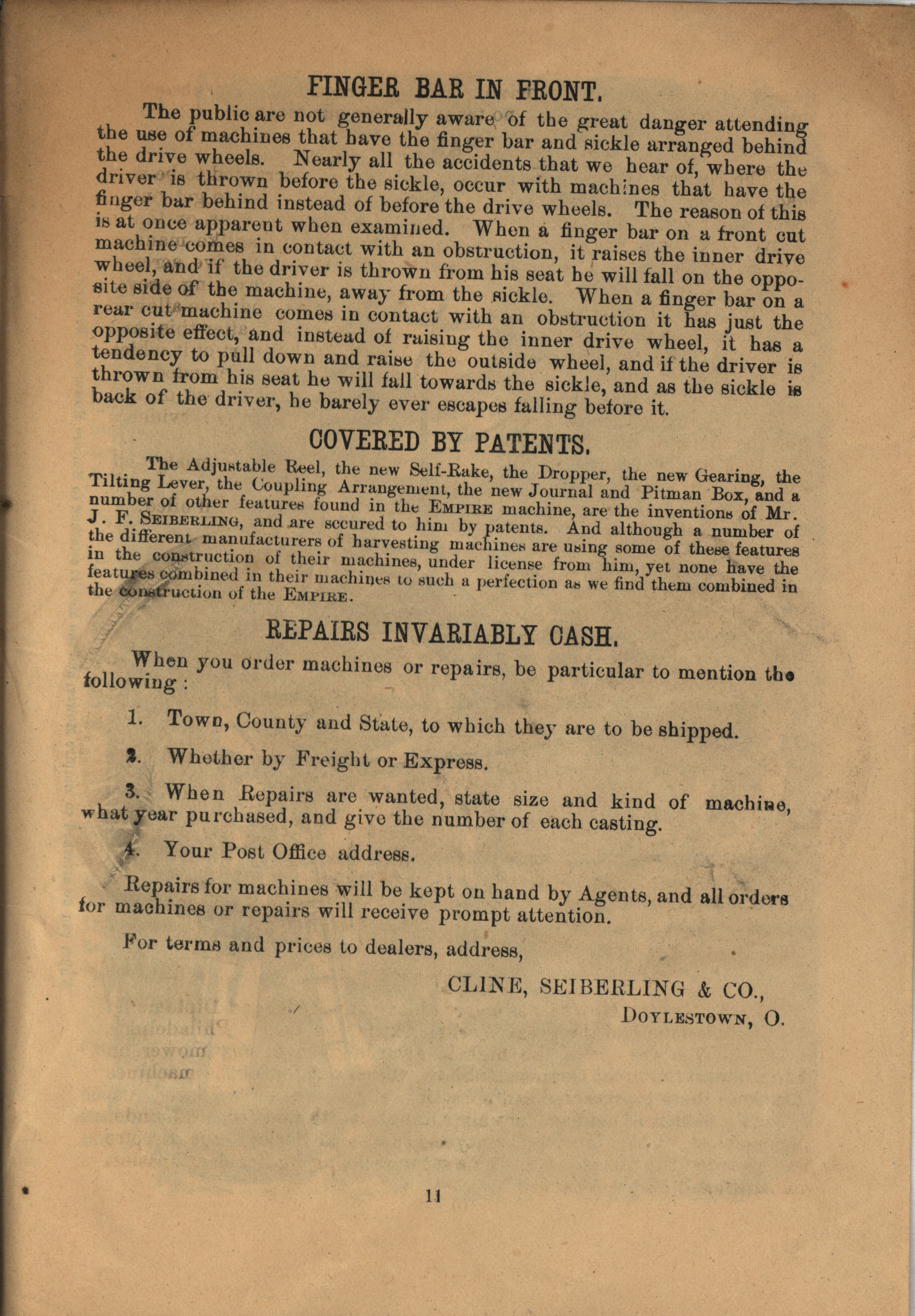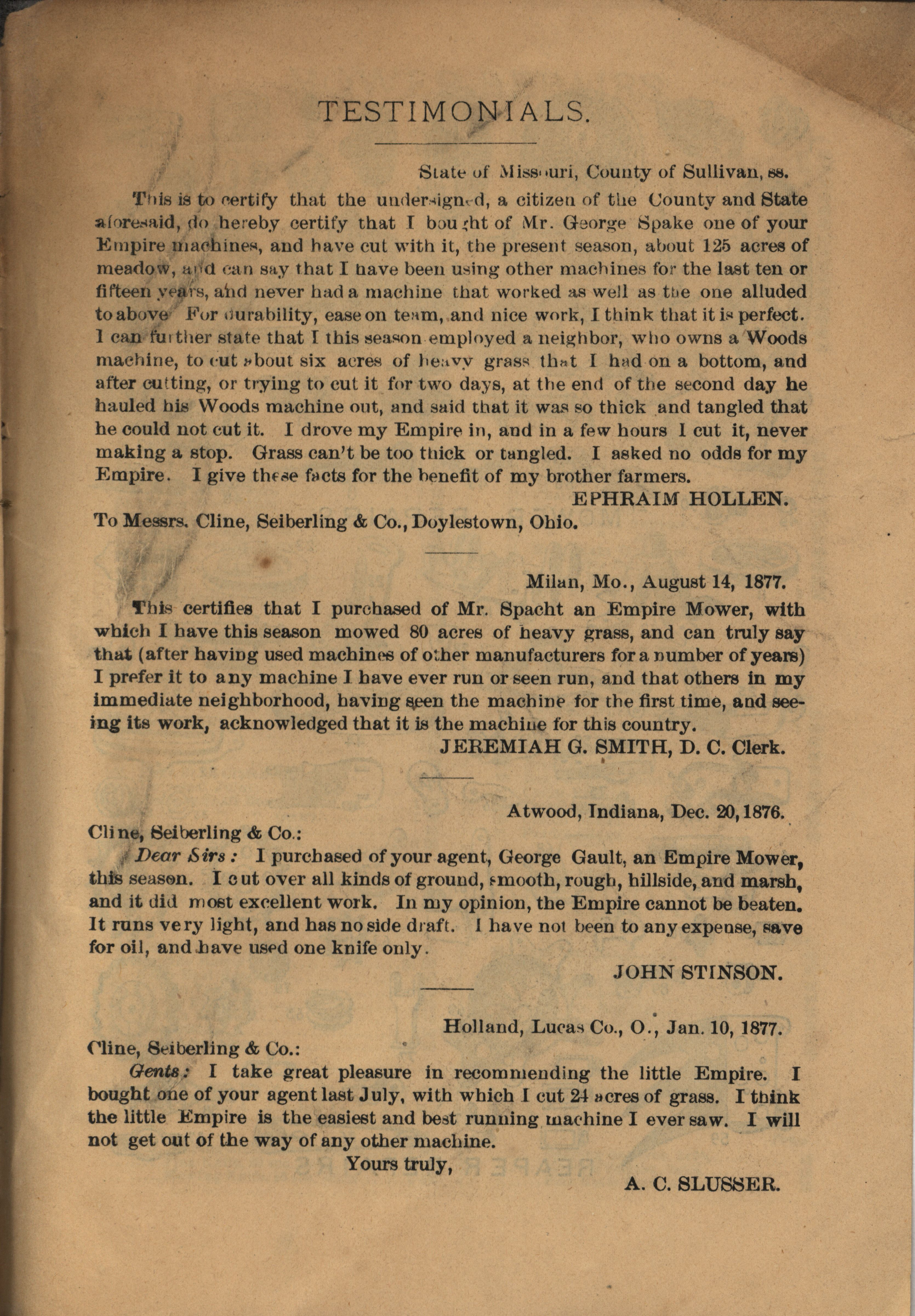 - "Cline, Seiberling and Company Empire Mower and Reaper catalog", Agricultural Machinery Literature Collection, Iowa State University Library Digital Collections