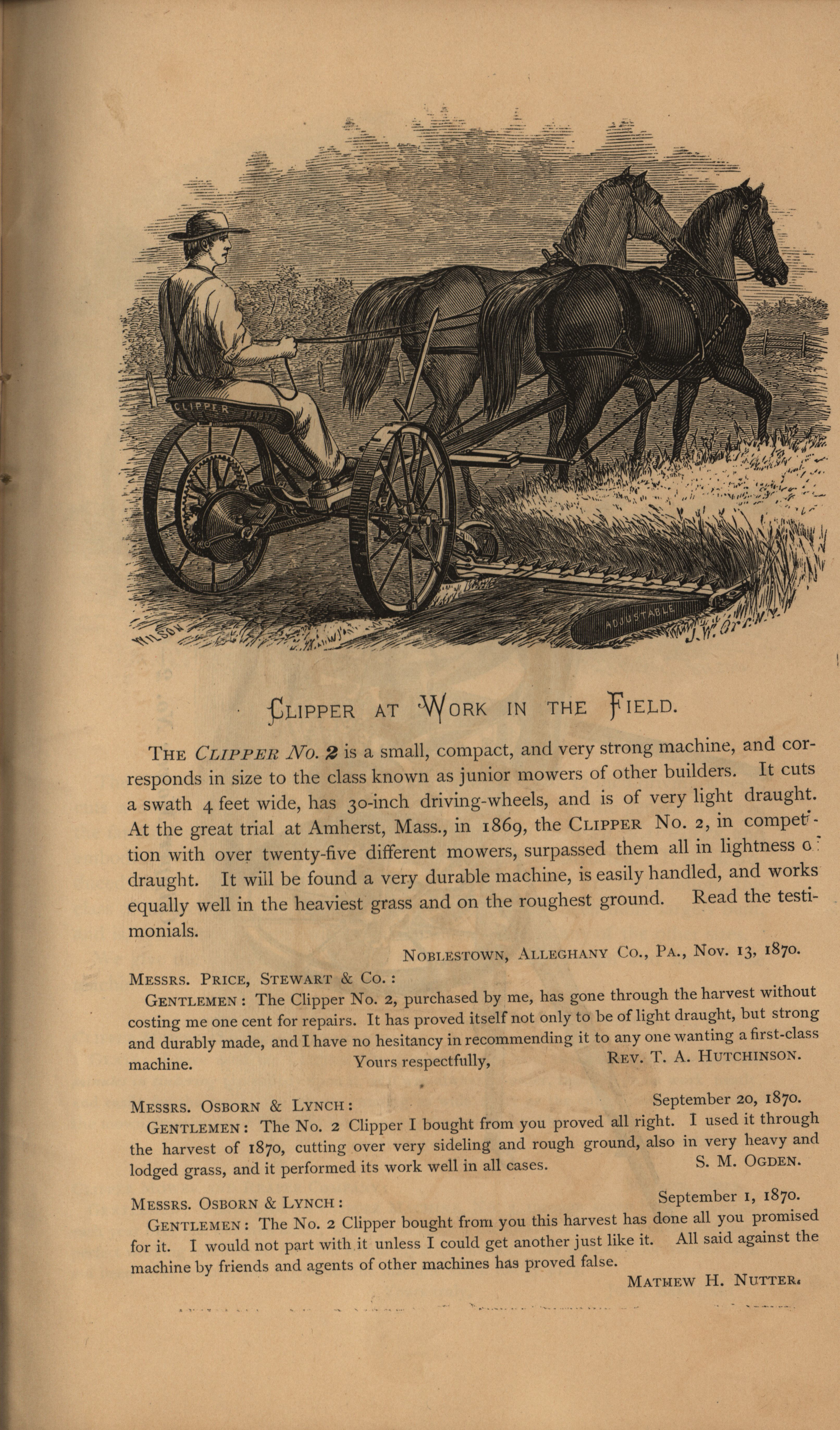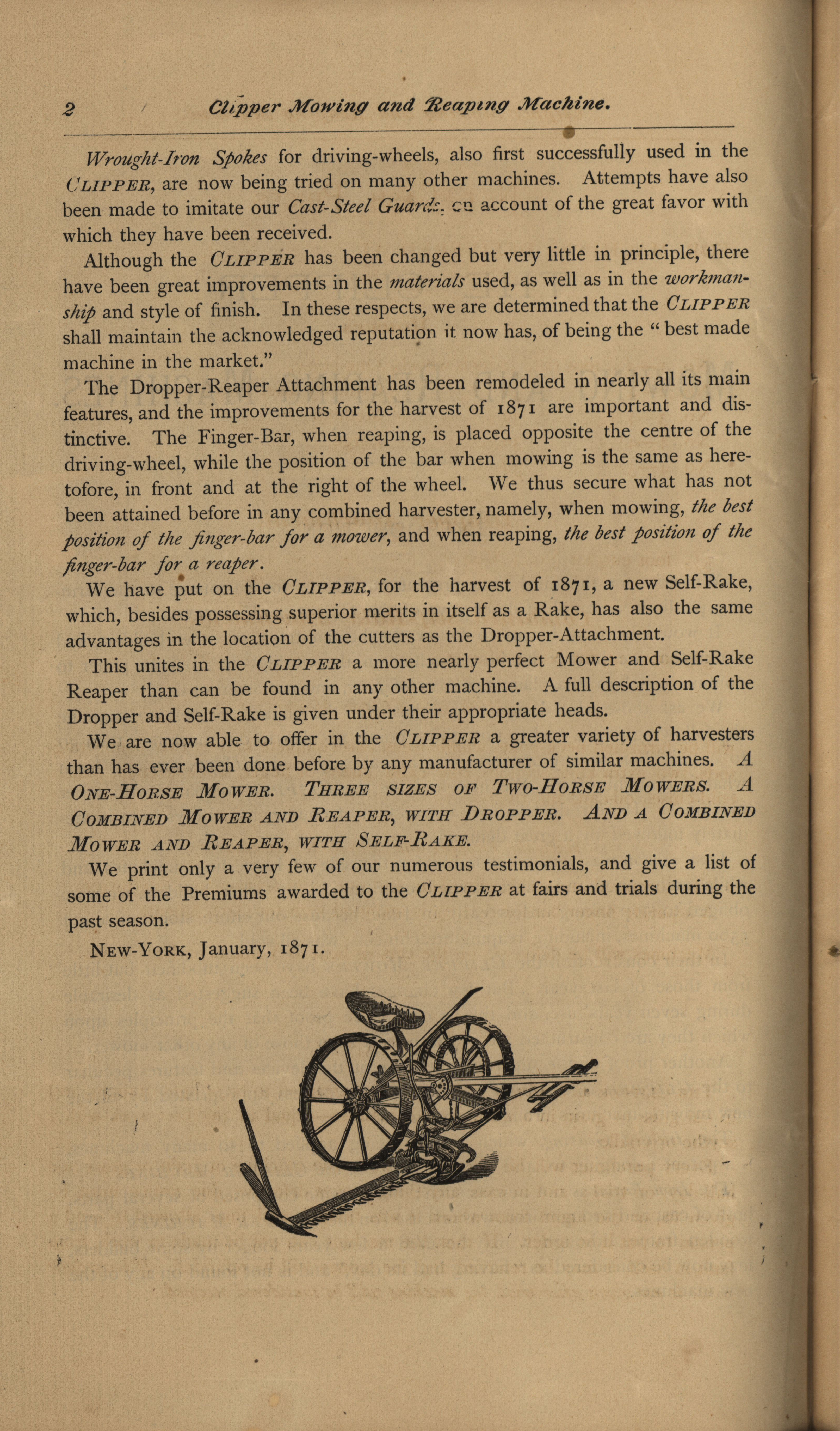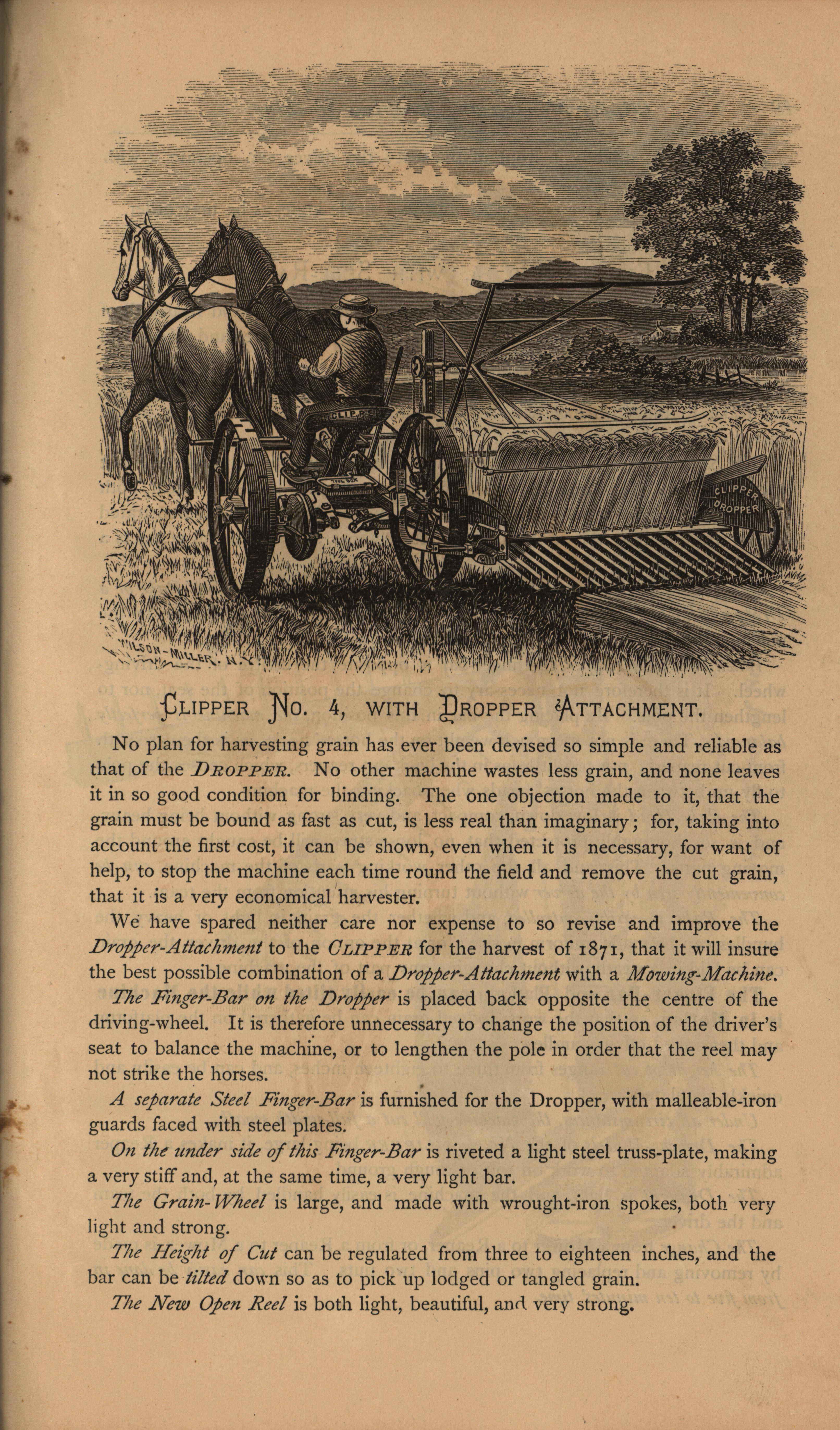 - Illustrated catalog describing the agricultural products offered by Clipper Mower and Reaper Company in 1871.