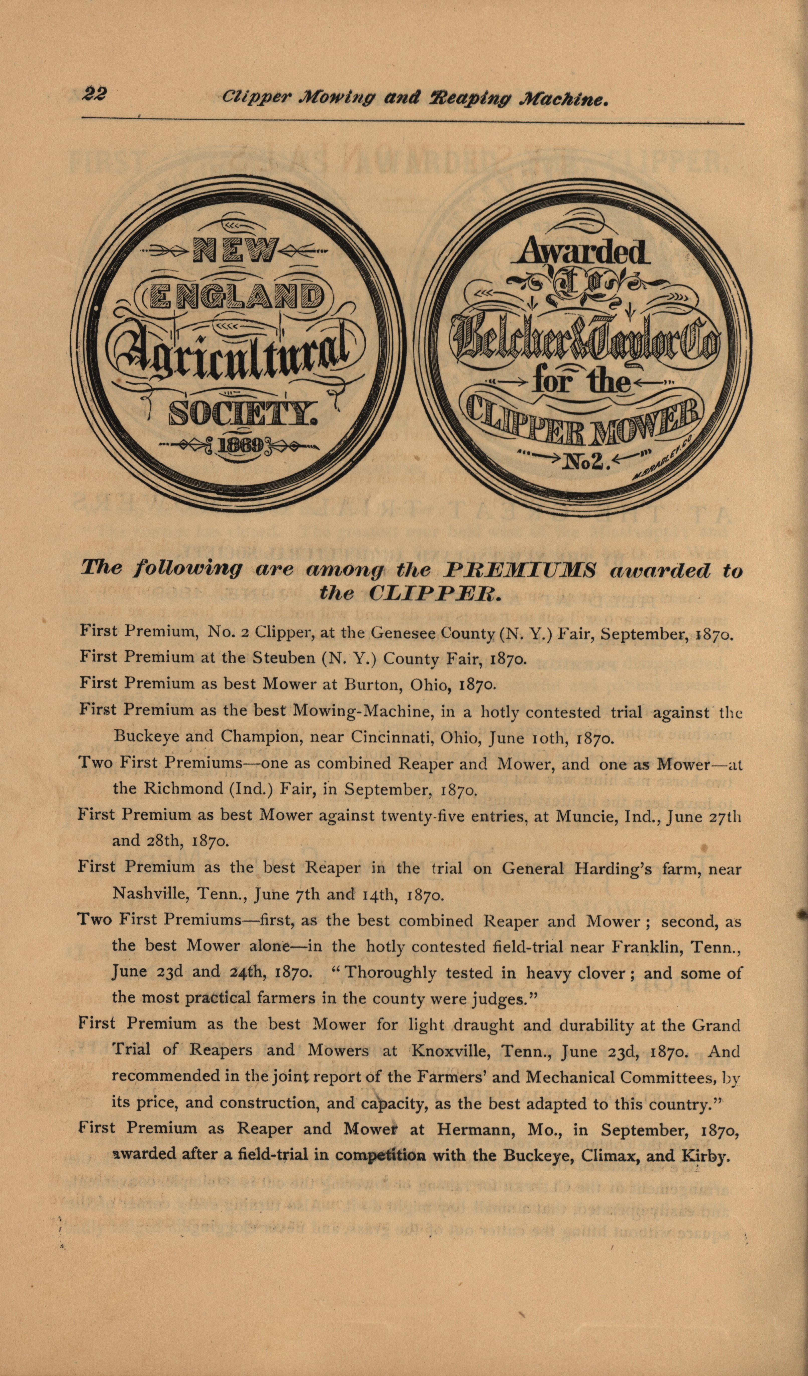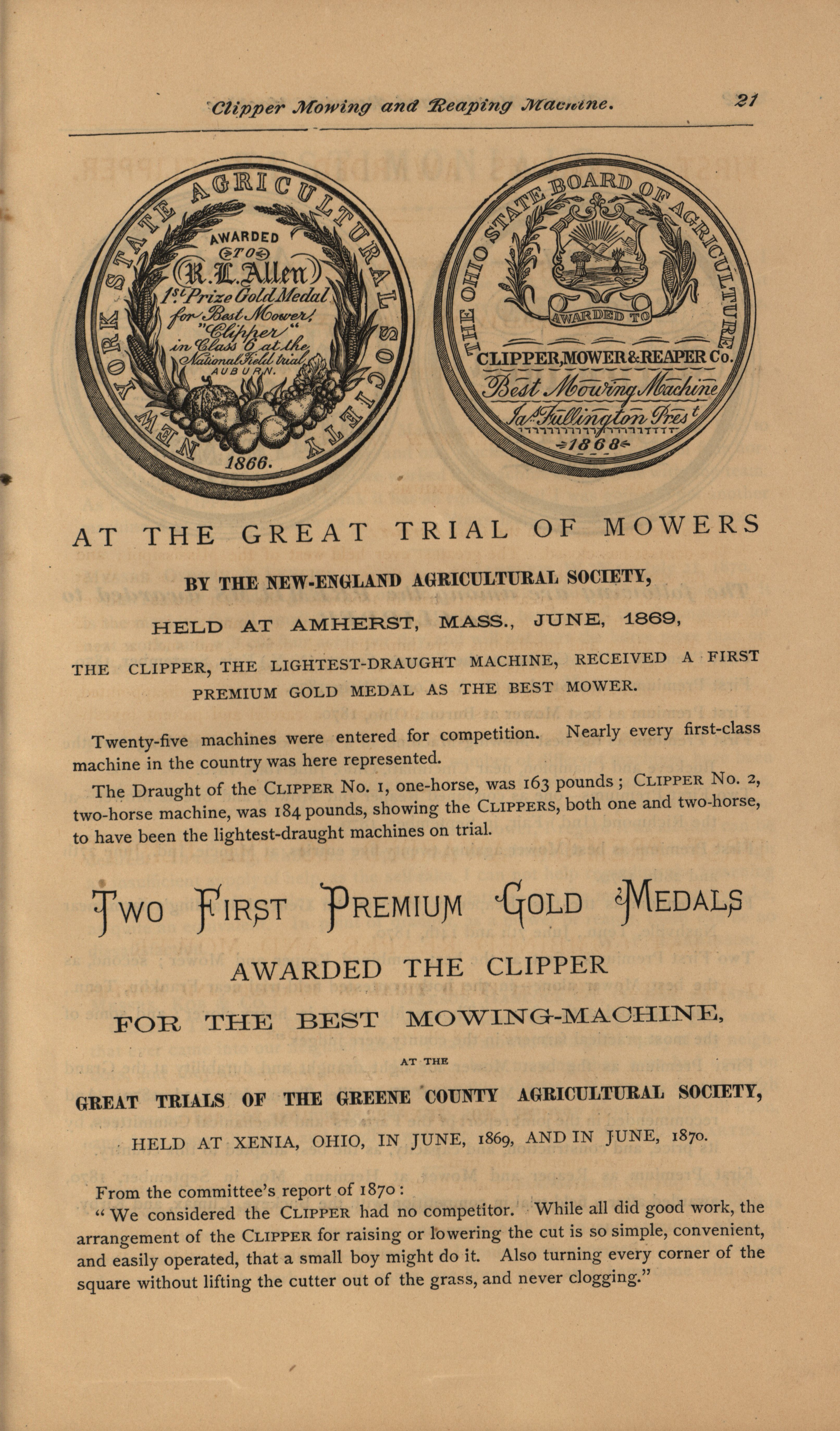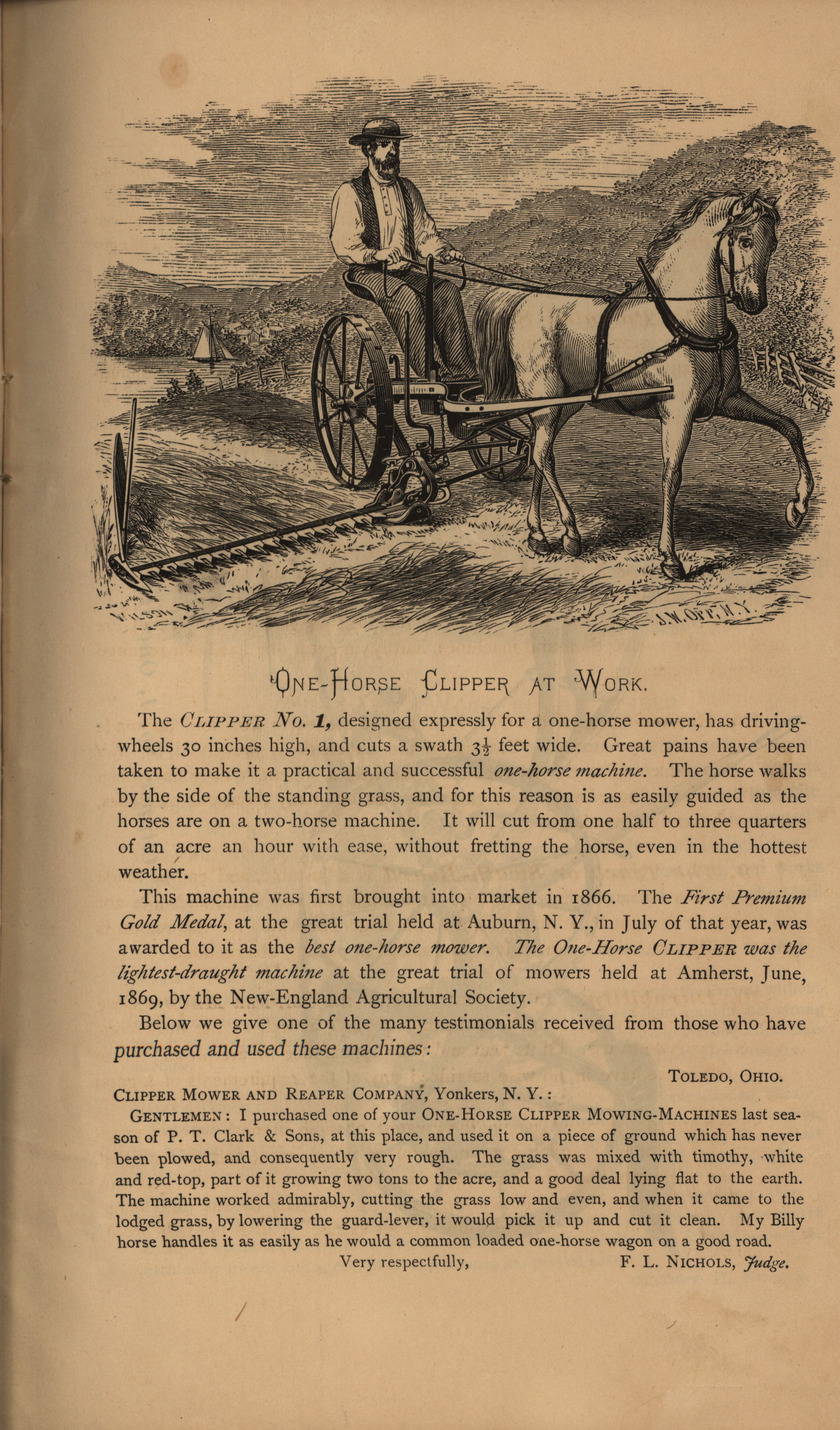 - Illustrated catalog describing the agricultural products offered by Clipper Mower and Reaper Company in 1871.