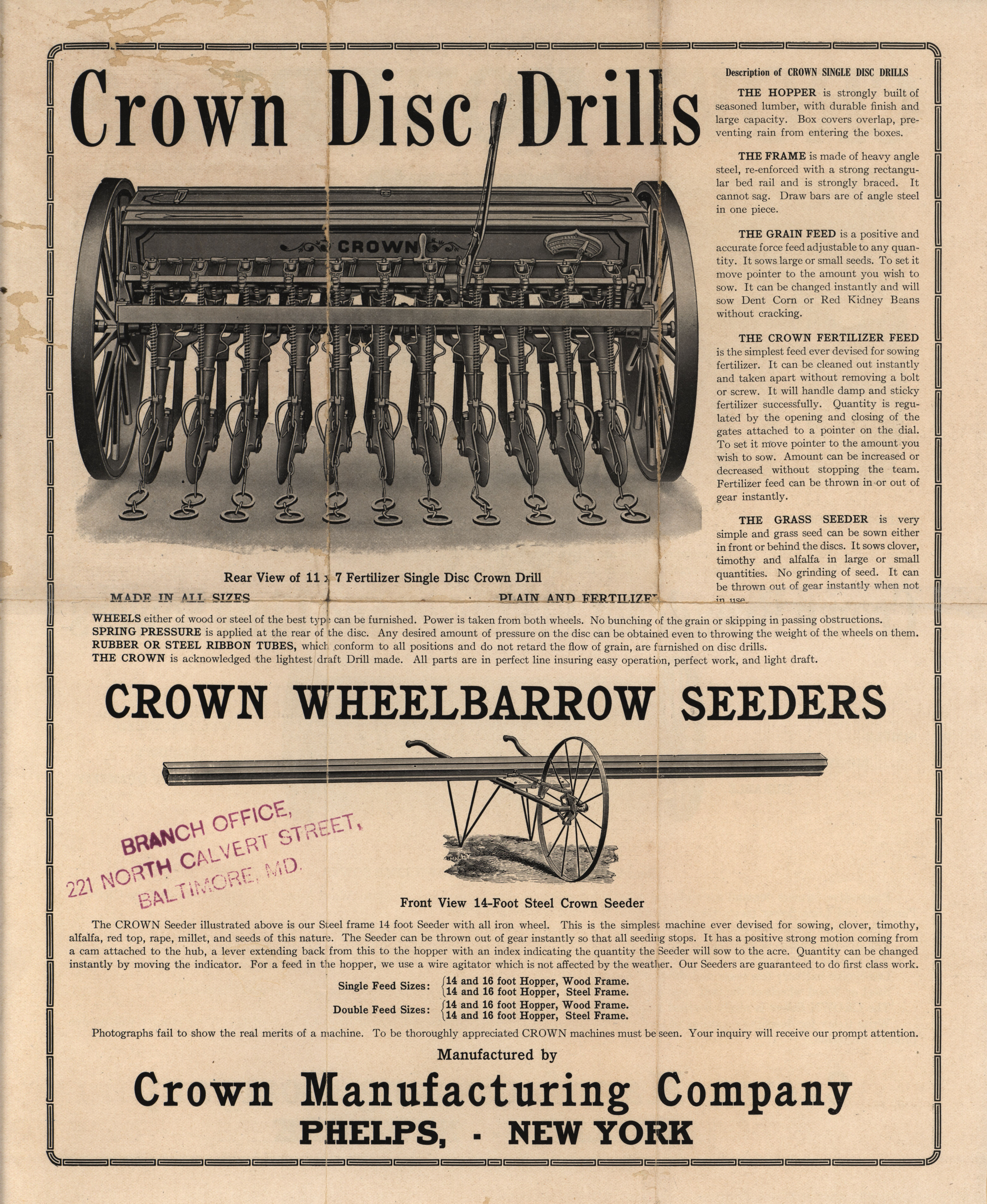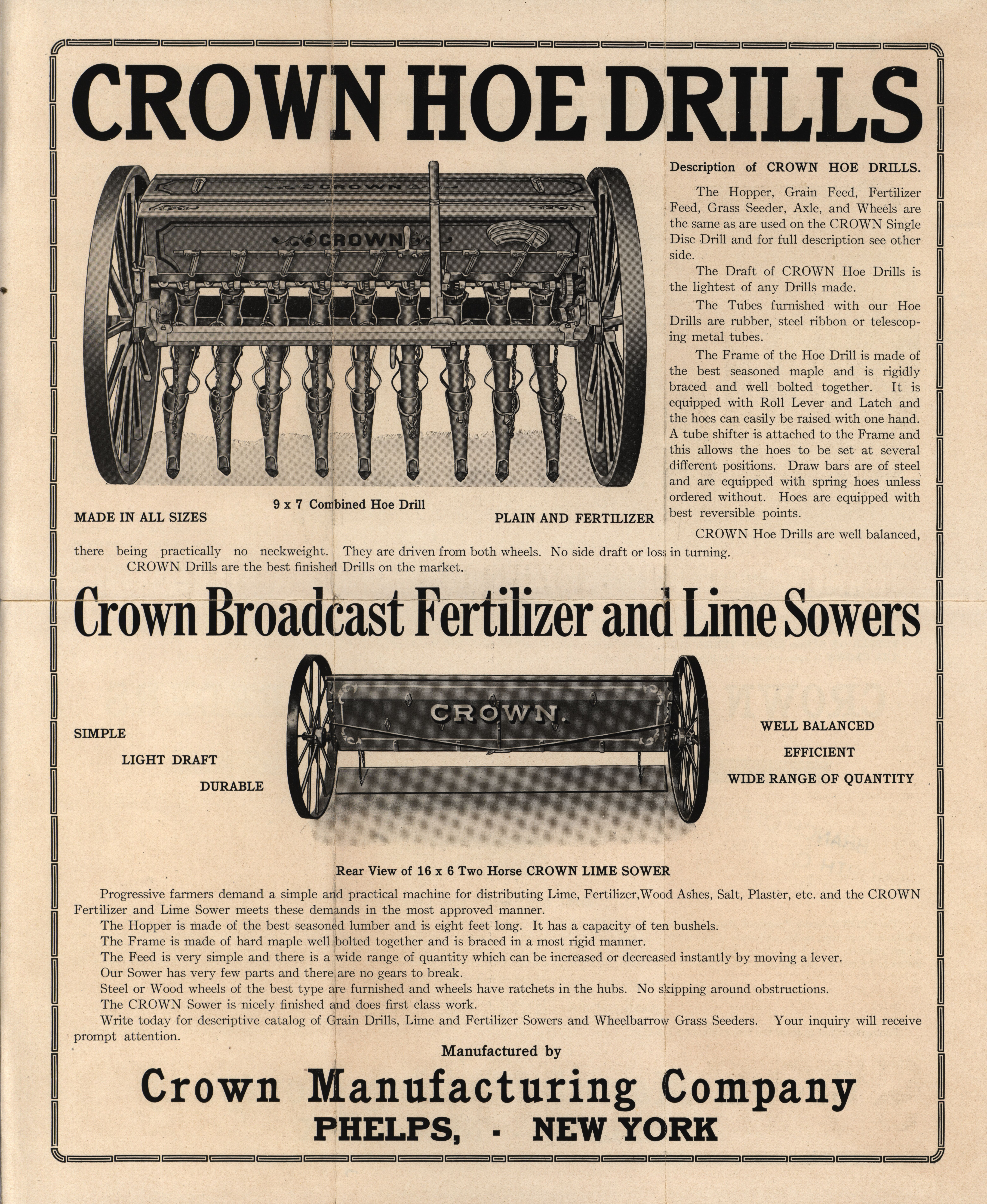 - "Crown Manufacturing Company drills, sowers, and seeders advertisement", Agricultural Machinery Literature Collection, Iowa State University Library Digital Collections
