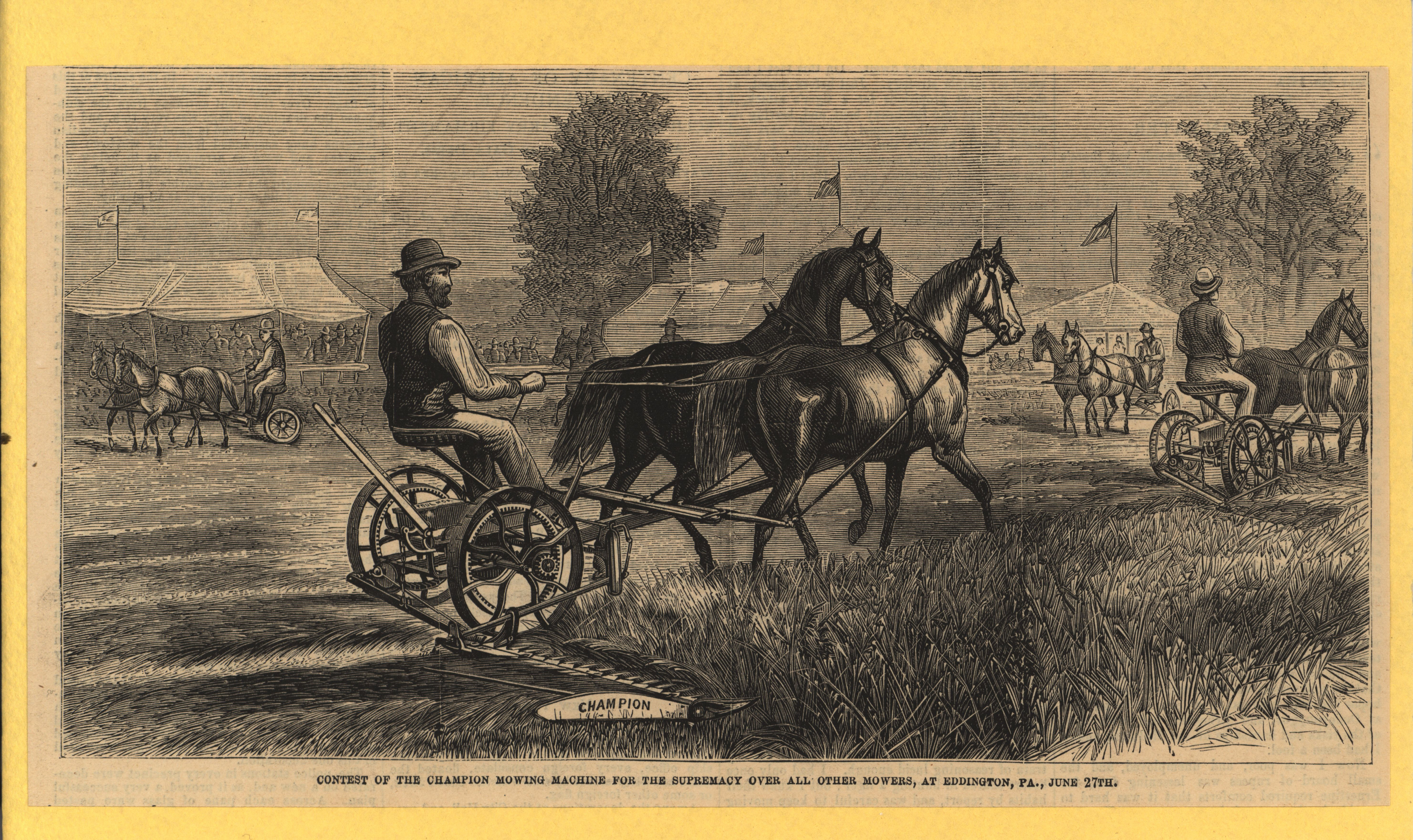 - Illustrated advertisement card for the Champion Mowing Machine depicting a mowing machine contest in Eddington, Pennsylvania.