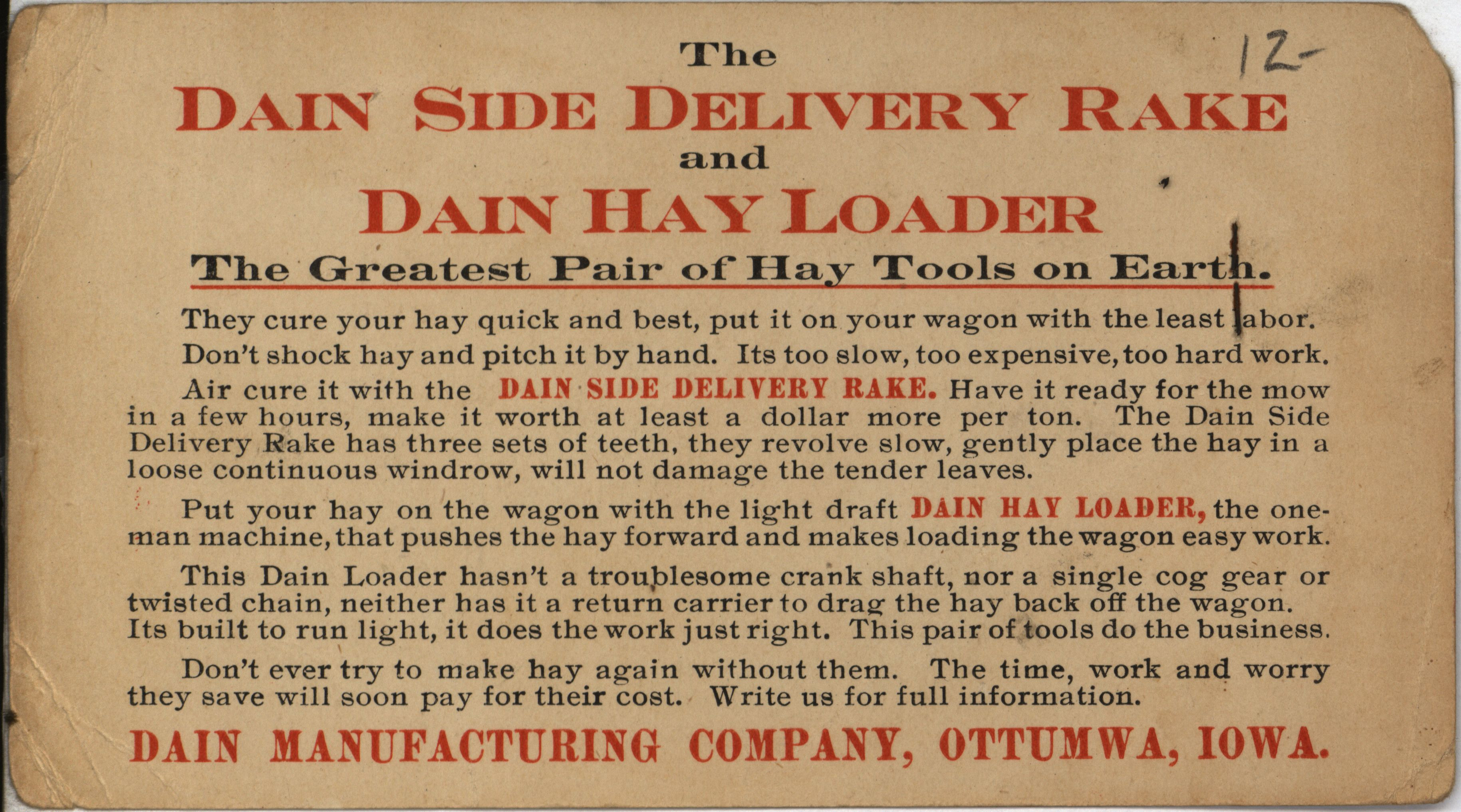 - "Dain Manufacturing Company Side Delivery Rake and Hay Loader illustrated advertisement card", Agricultural Machinery Literature Collection, Iowa State University Library Digital Collections