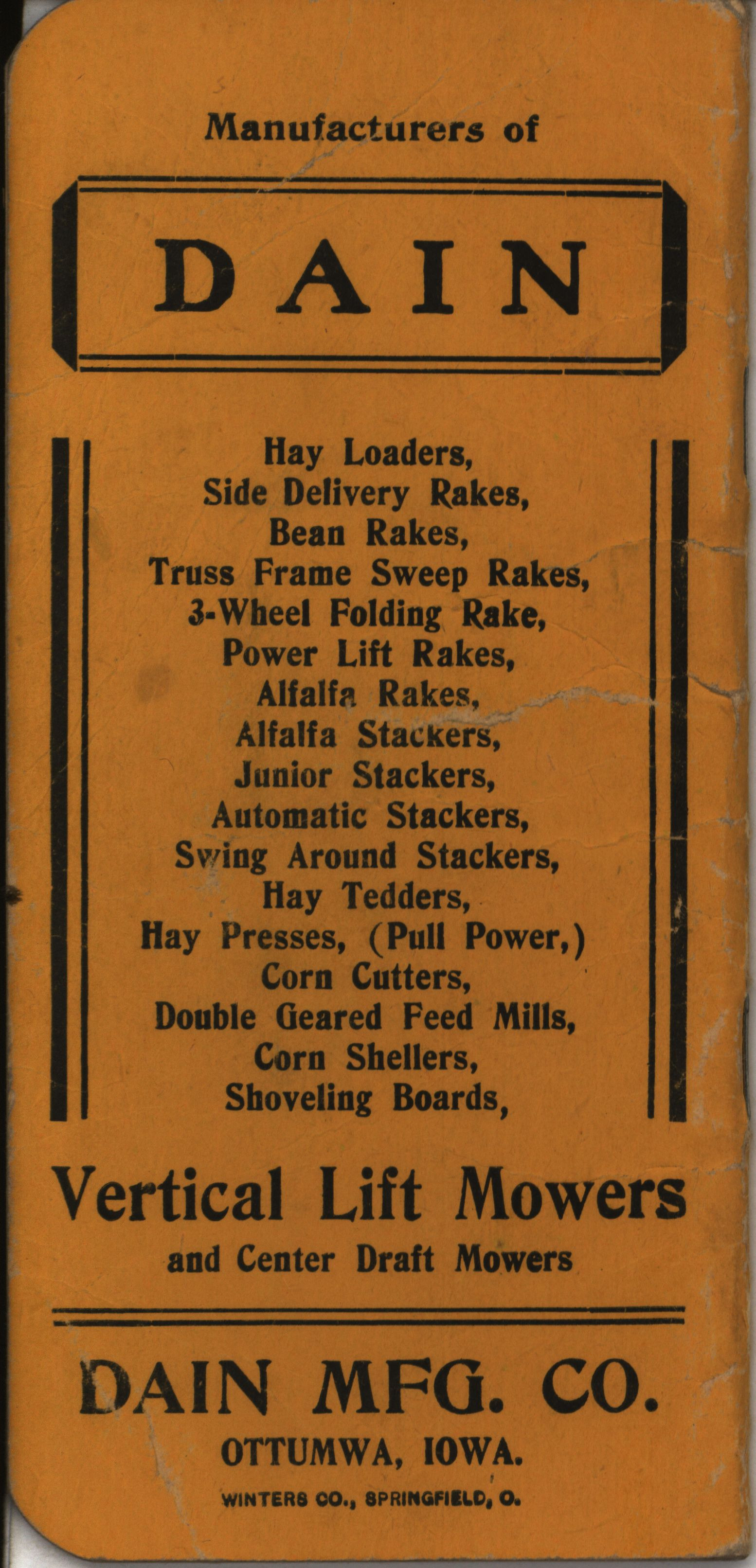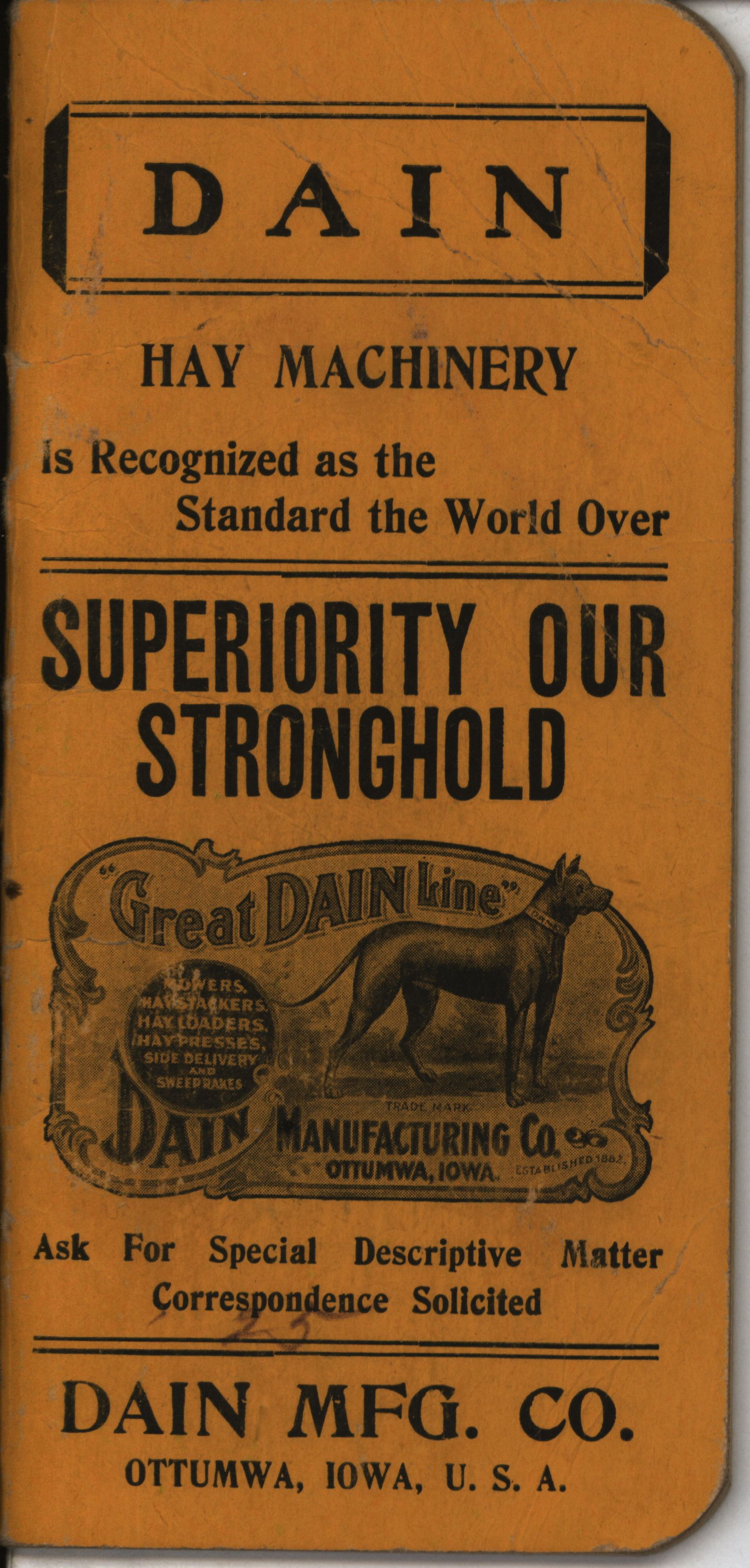 - Pocket book produced by Dain Manufacturing Company for farmers with advertisements for Dain Hay Machinery.