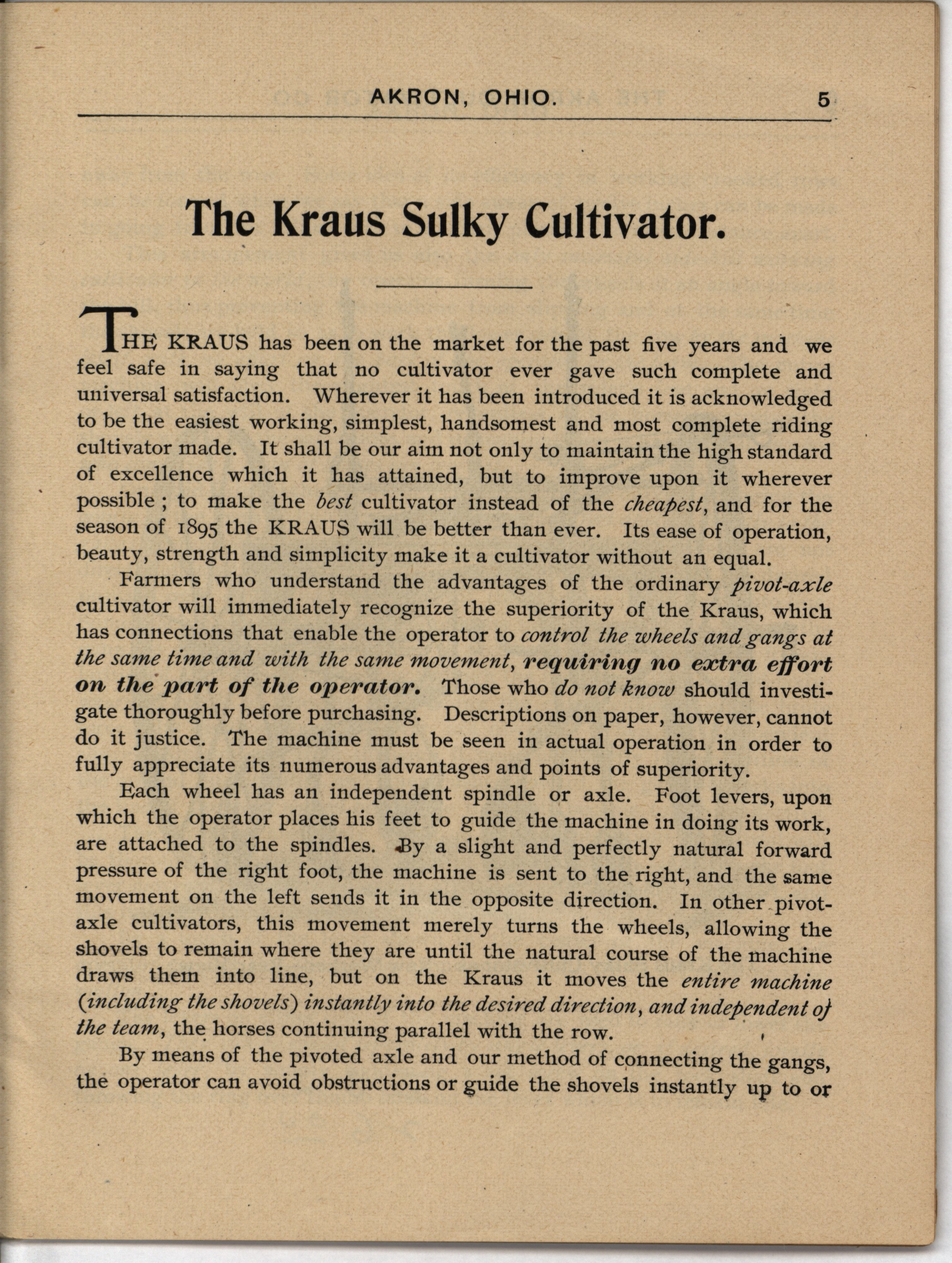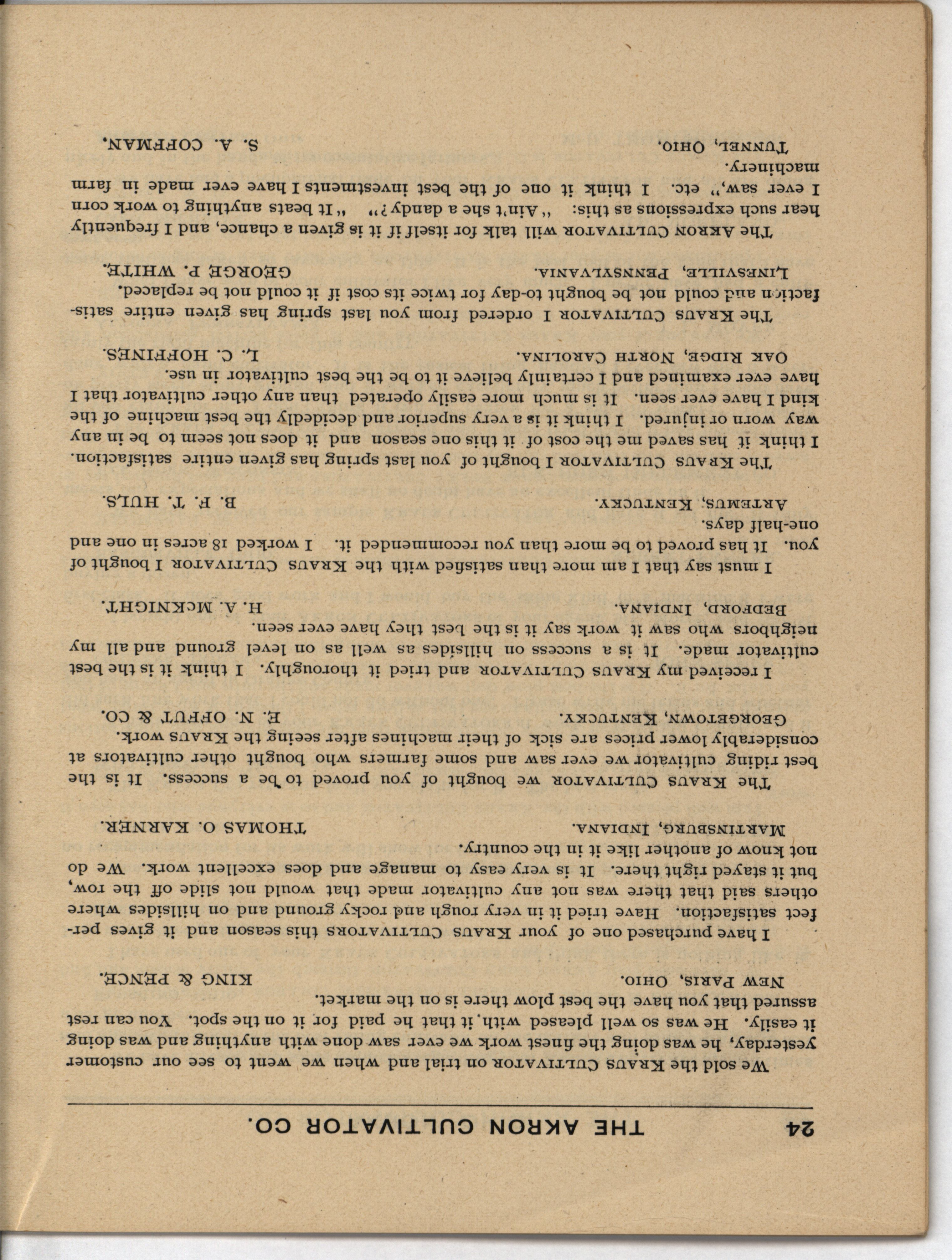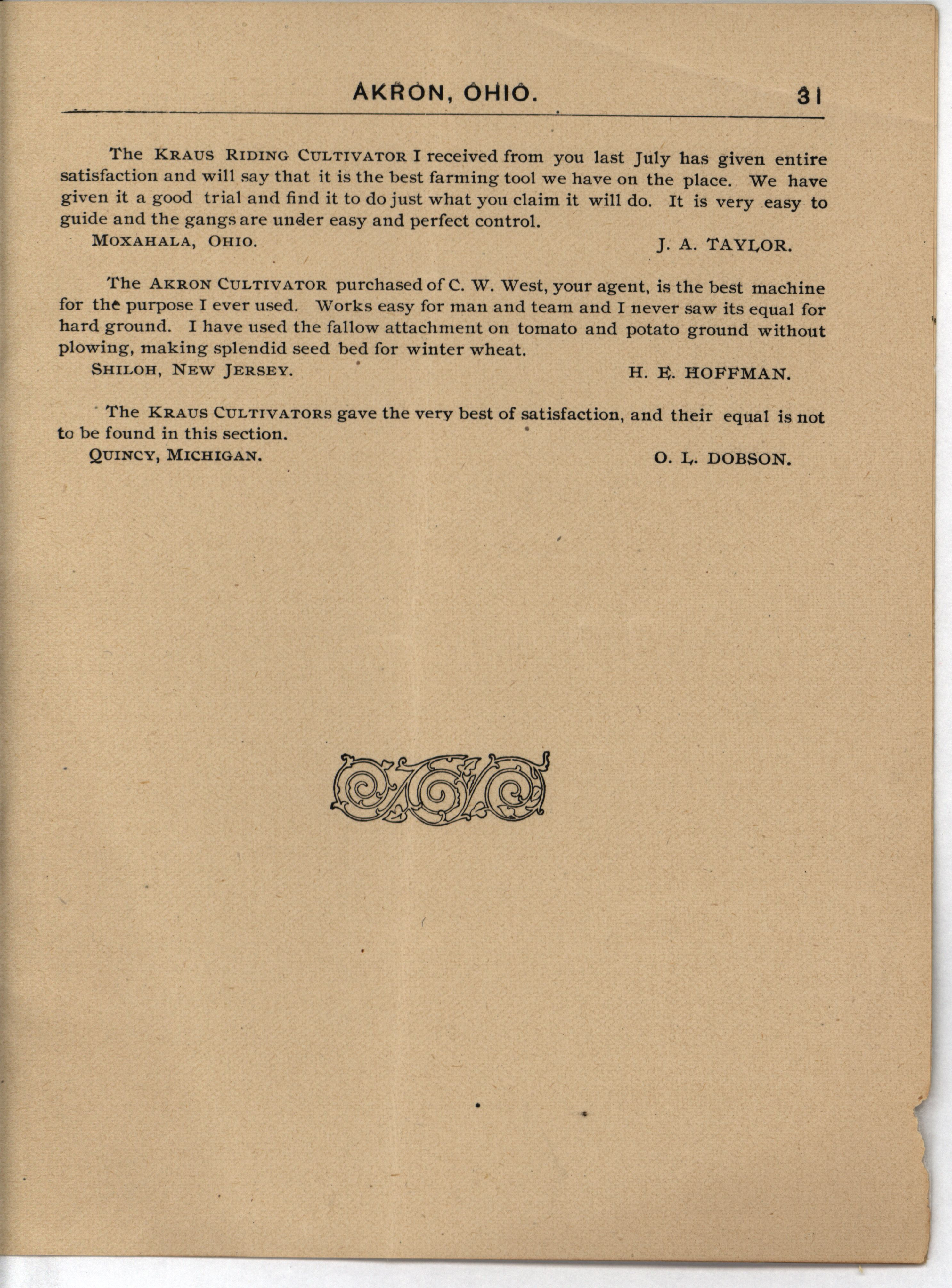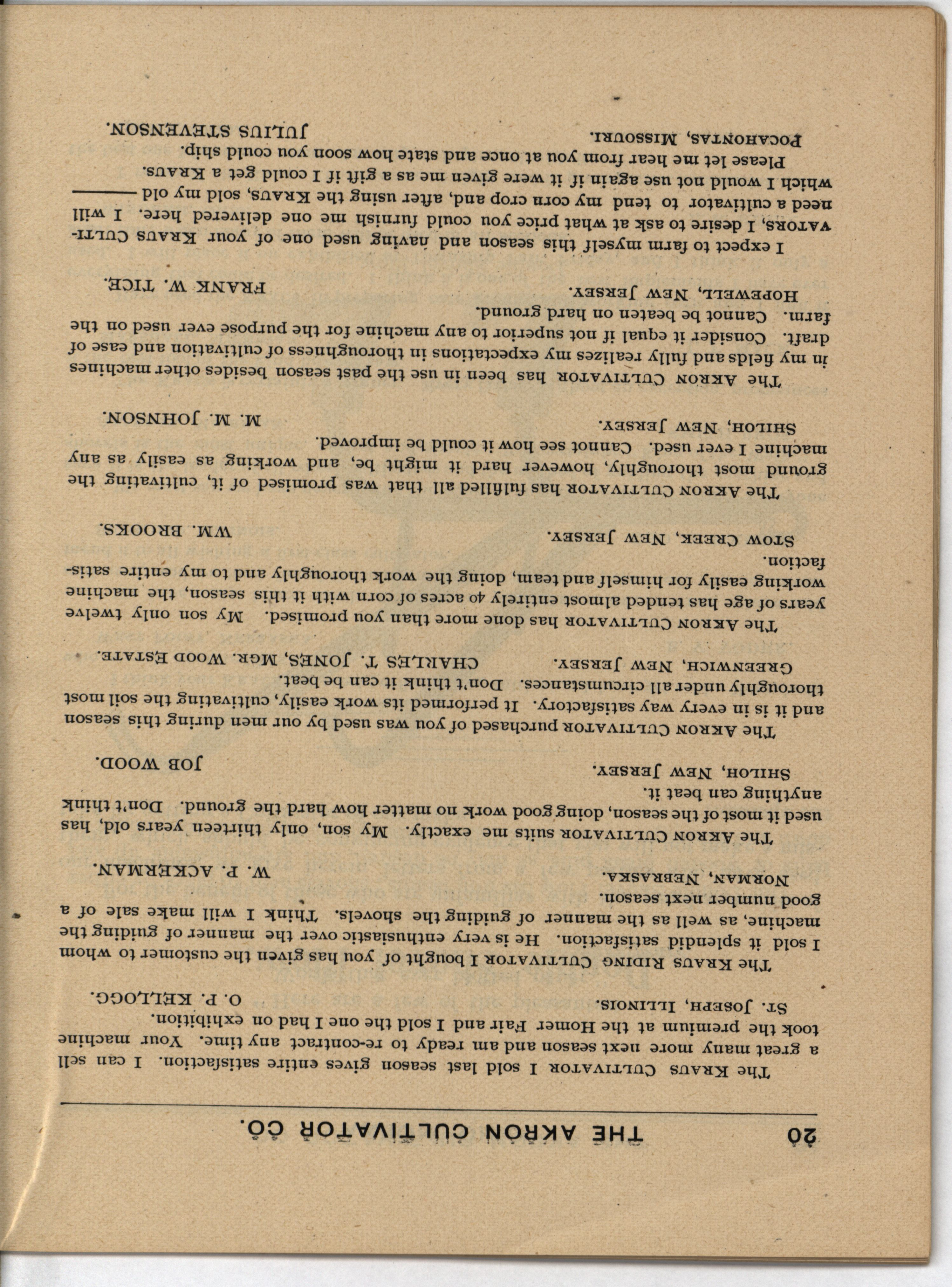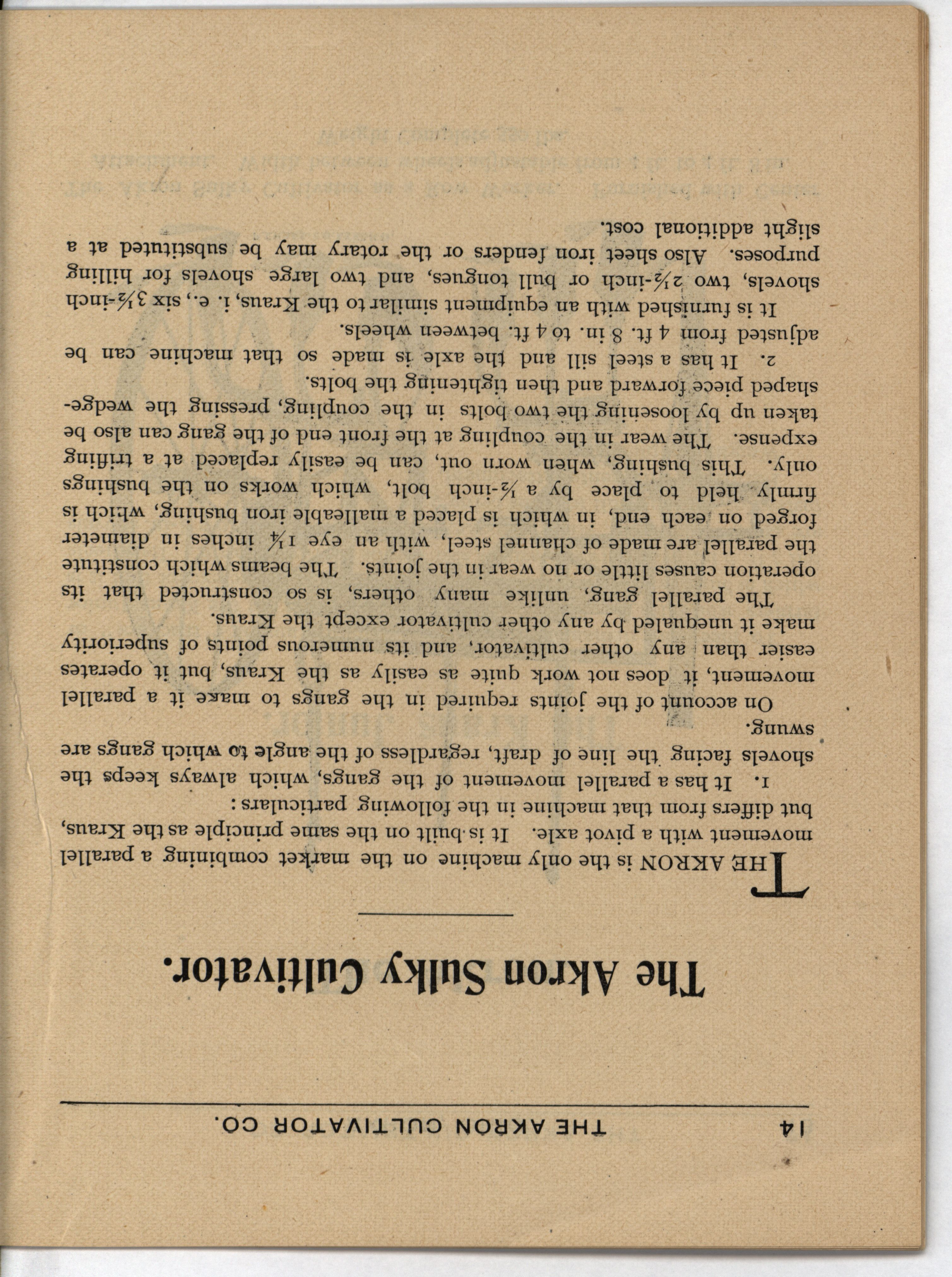- "Aultman, Mill & Co. agents for The Akron Cultivator Co., The Kraus and Akron Riding Cultivators", Agricultural Machinery Literature Collection, Iowa State University Library Digital Collections