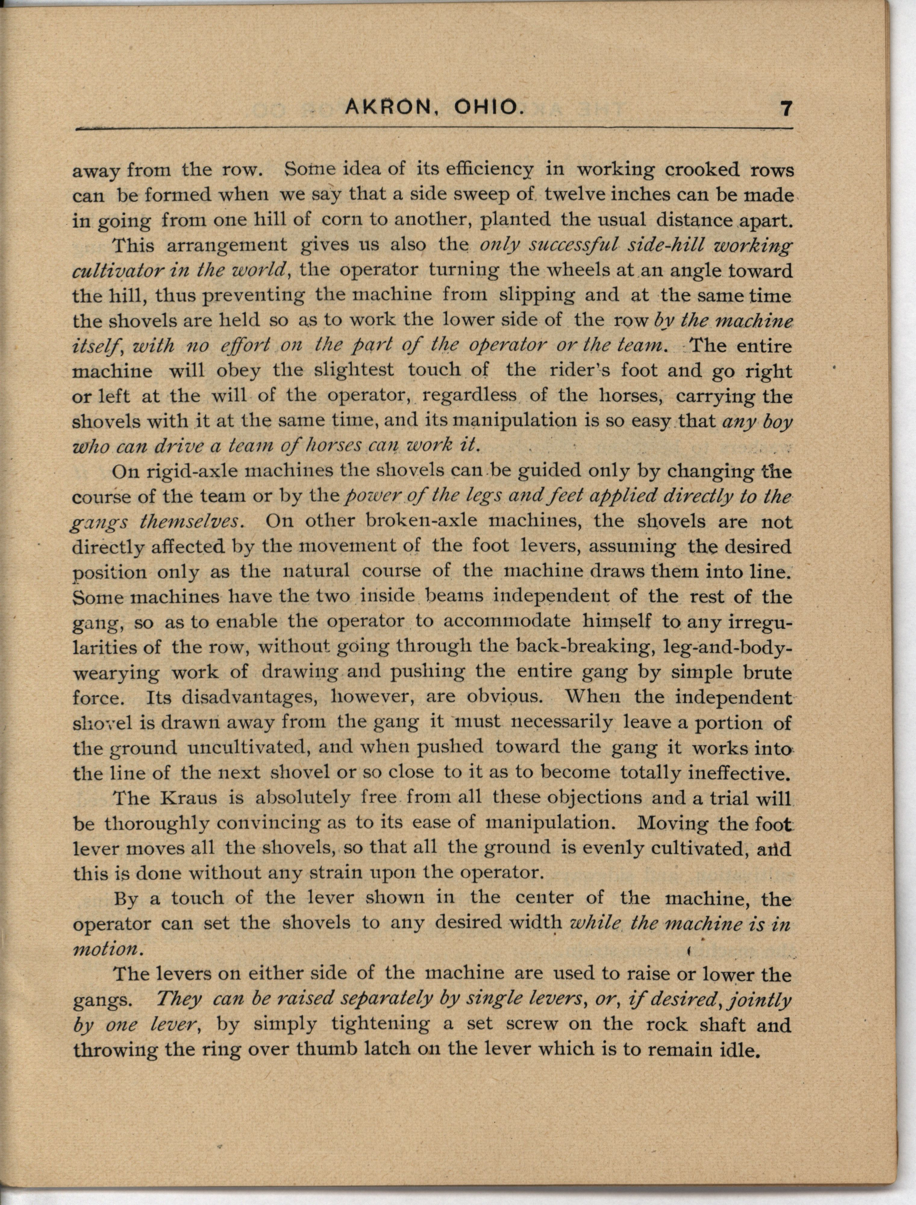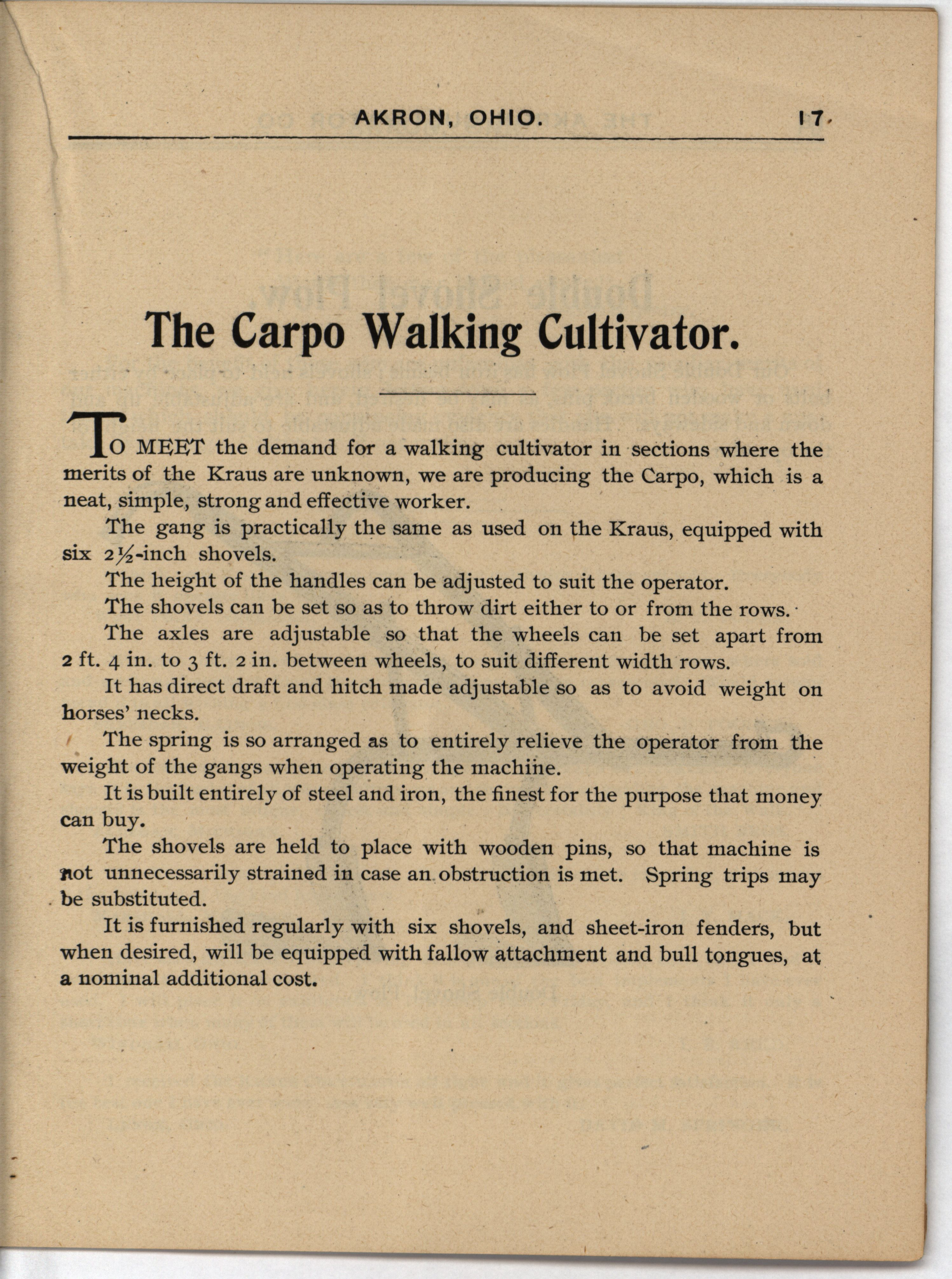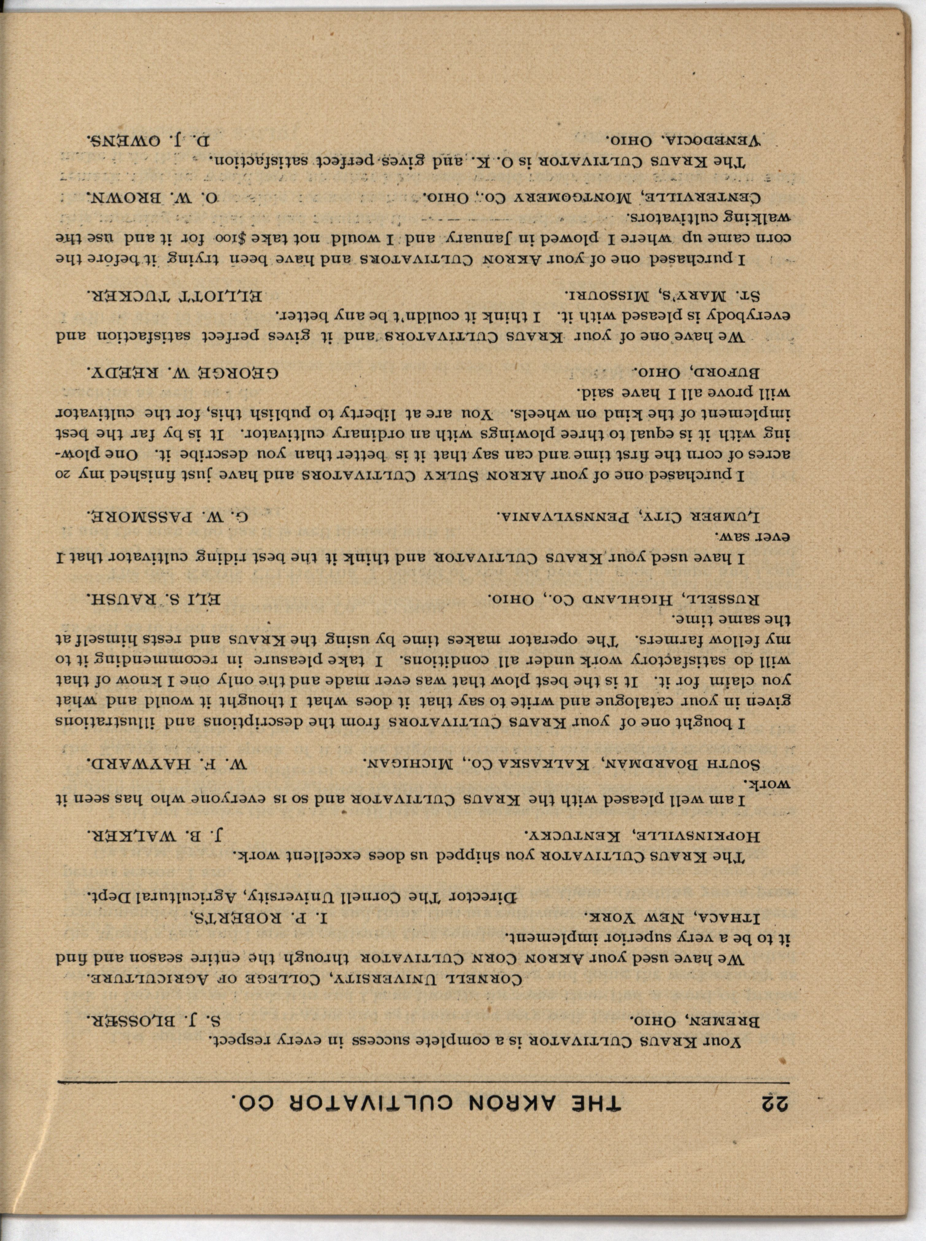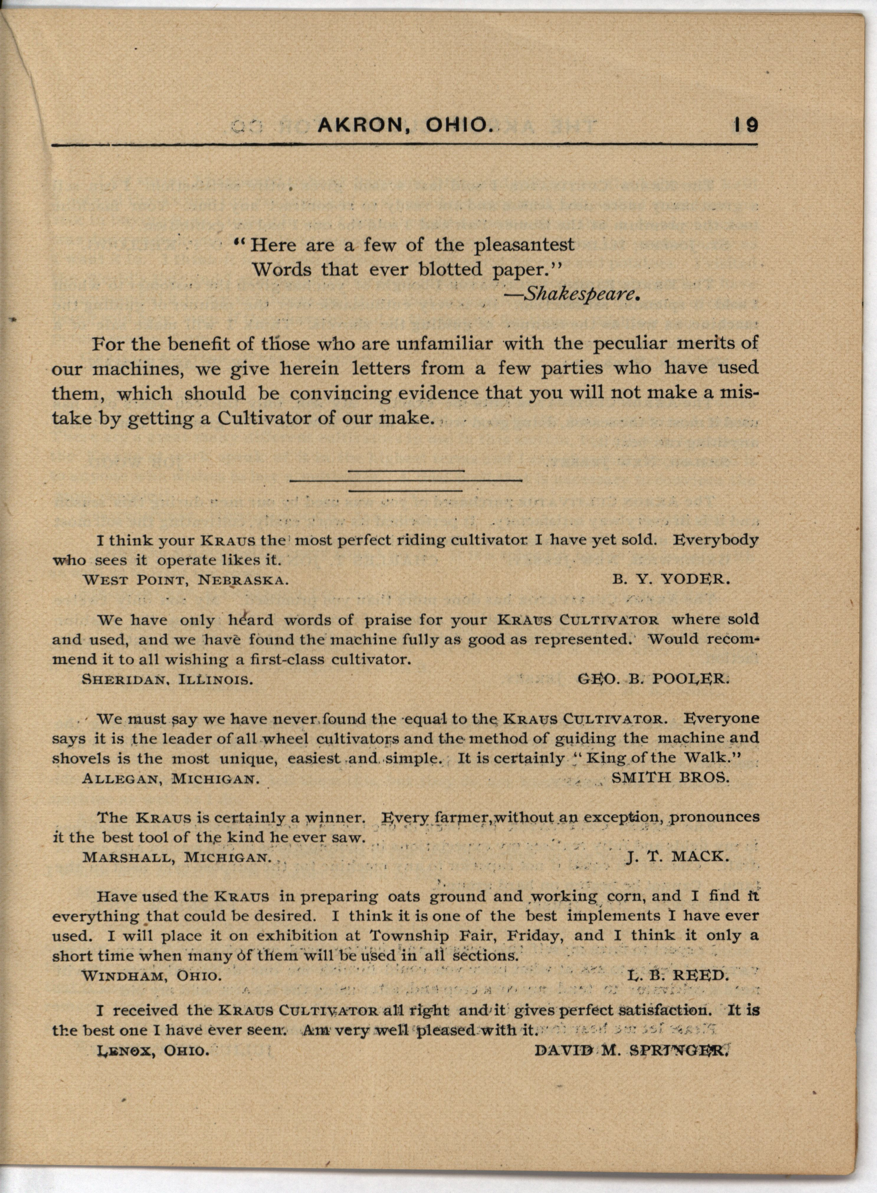 - "Aultman, Mill & Co. agents for The Akron Cultivator Co., The Kraus and Akron Riding Cultivators", Agricultural Machinery Literature Collection, Iowa State University Library Digital Collections