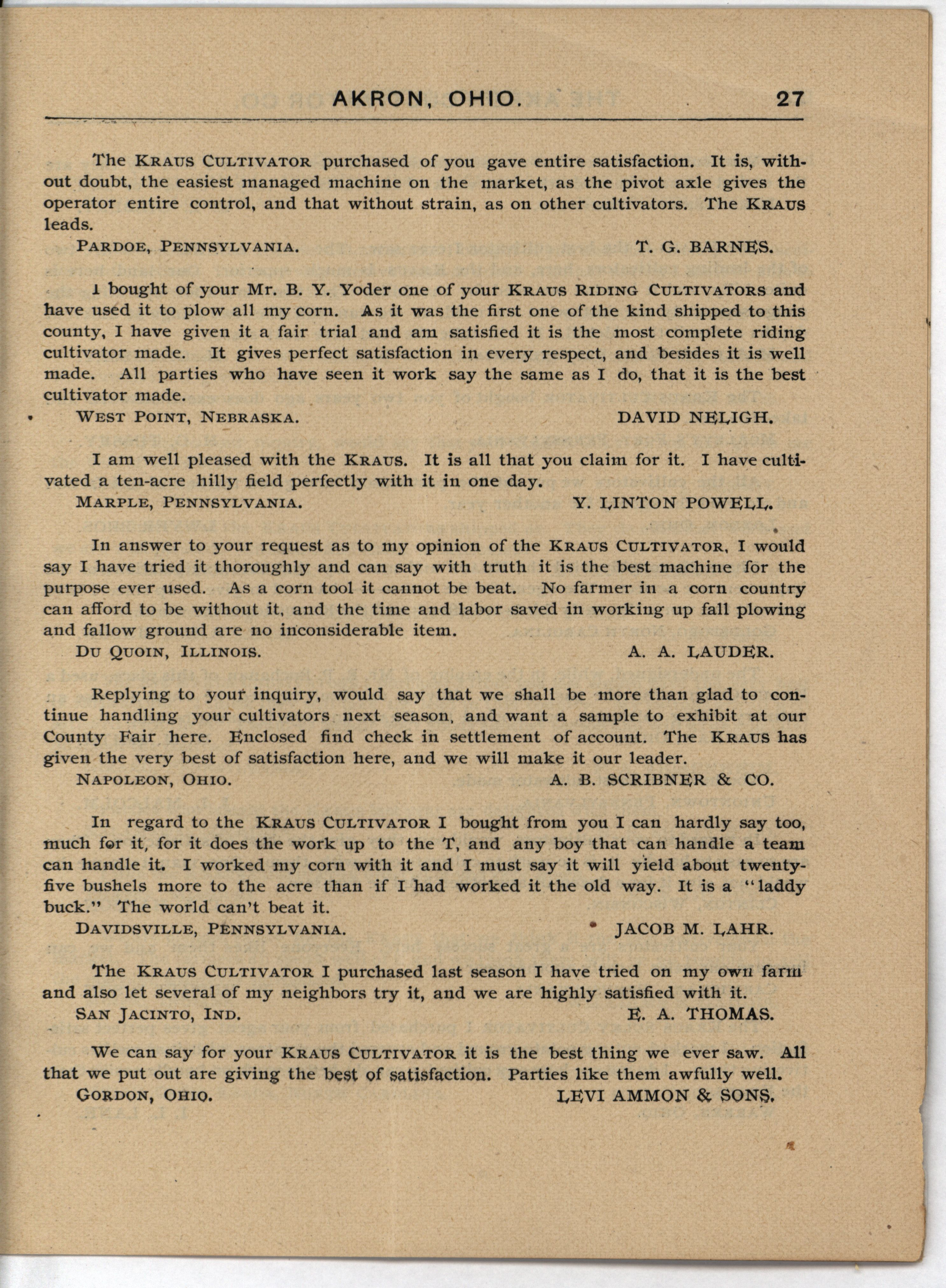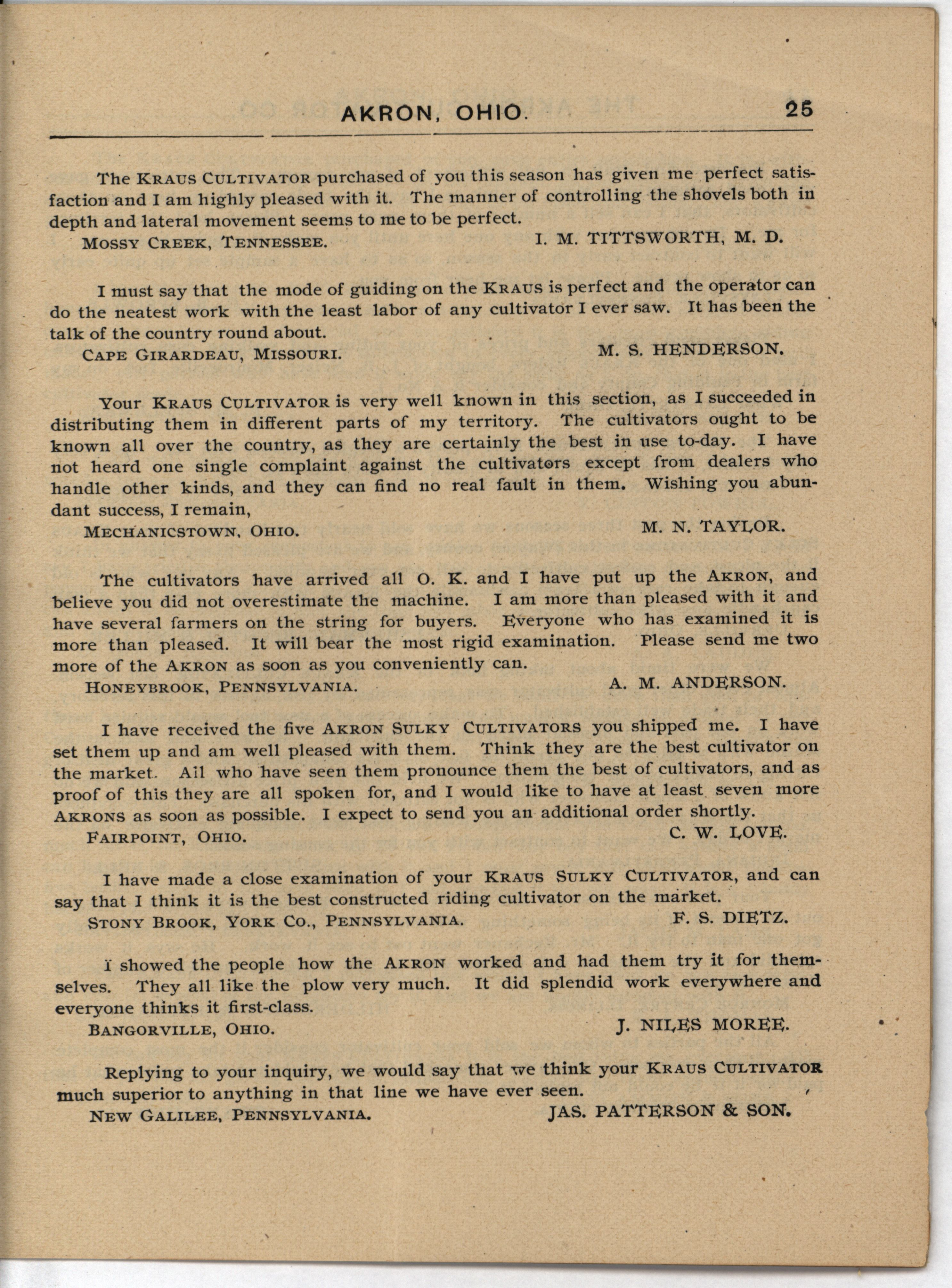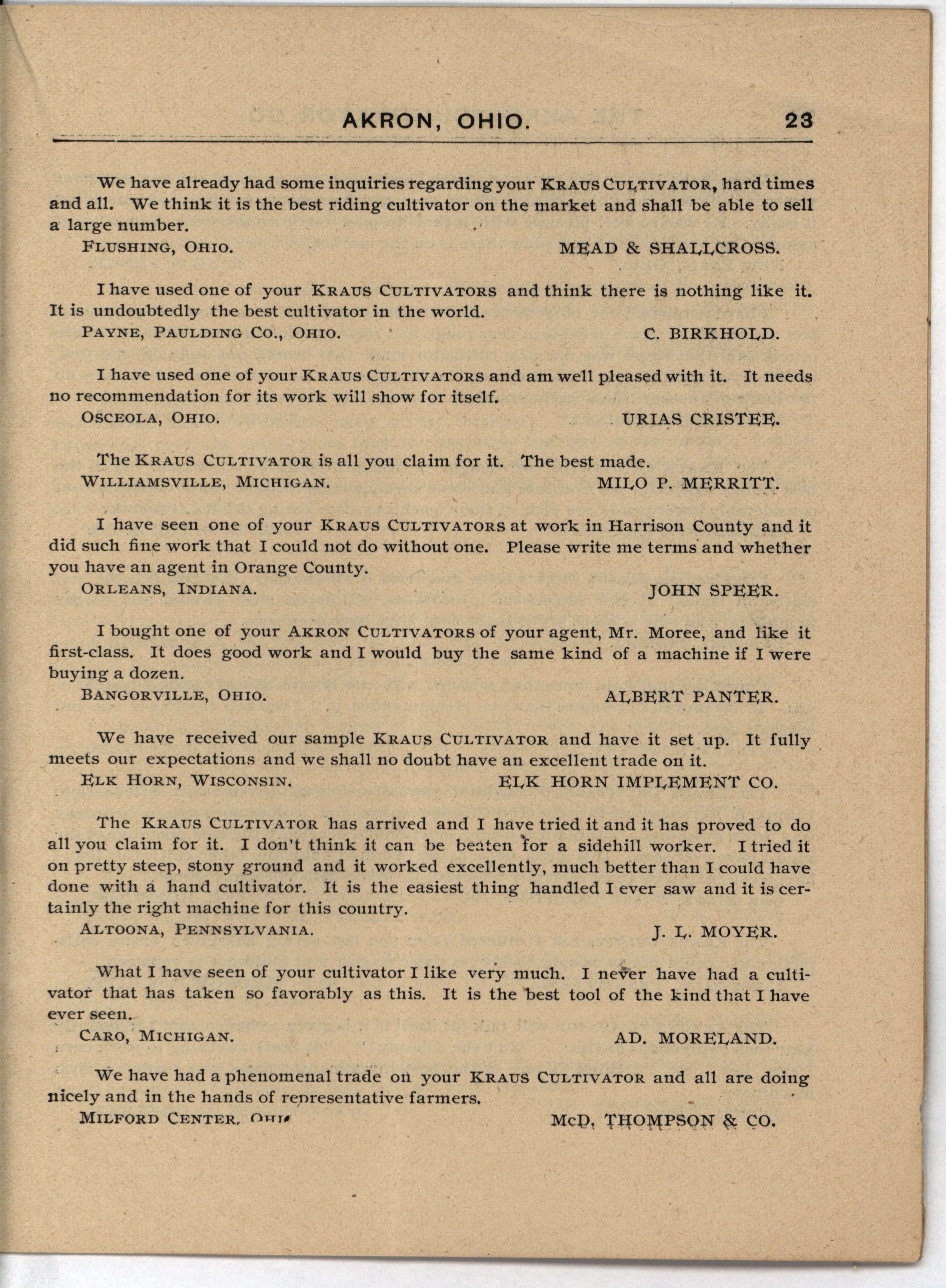 - Aultman, Mill & Co. agents for The Akron Cultivator Co., The Kraus and Akron Riding Cultivators