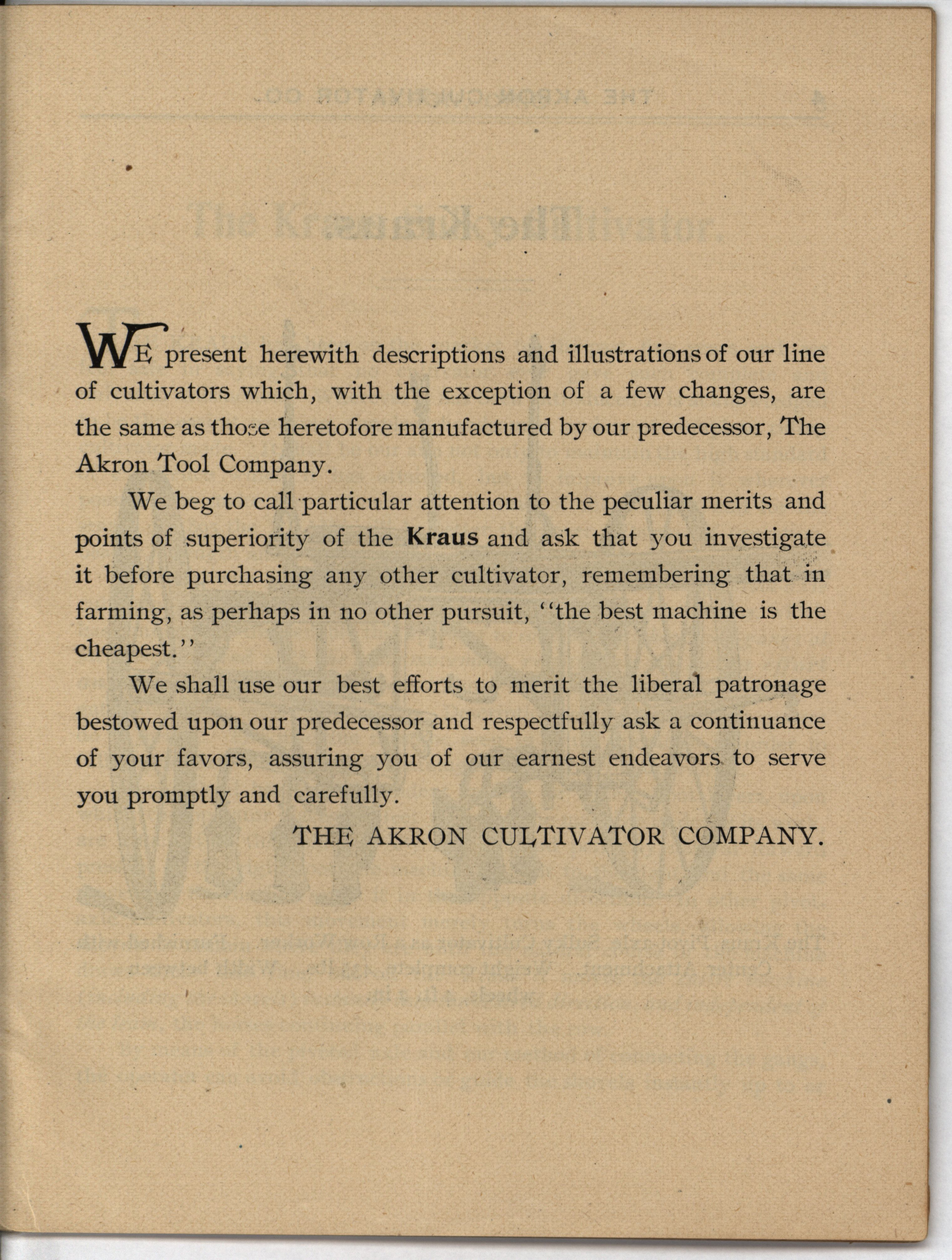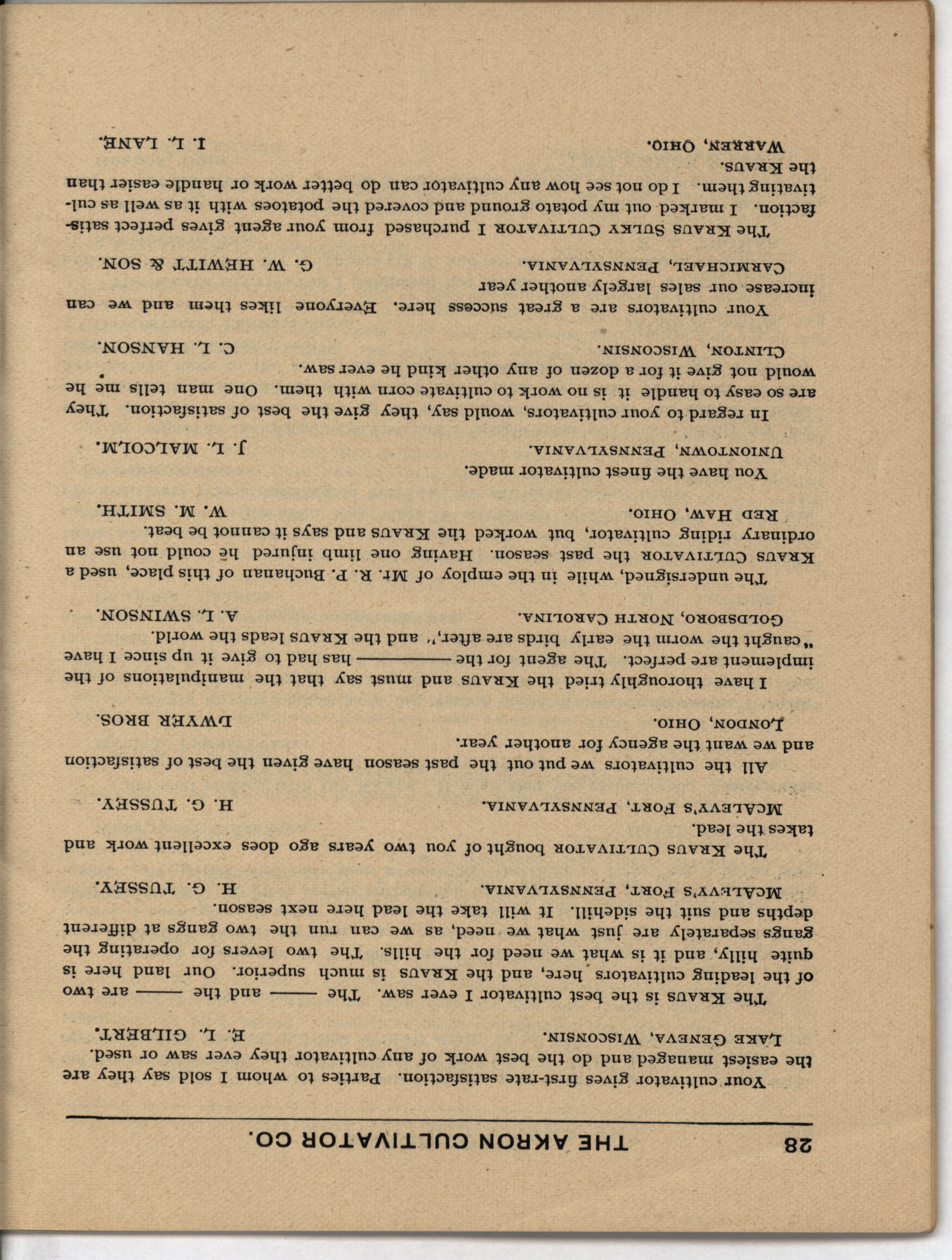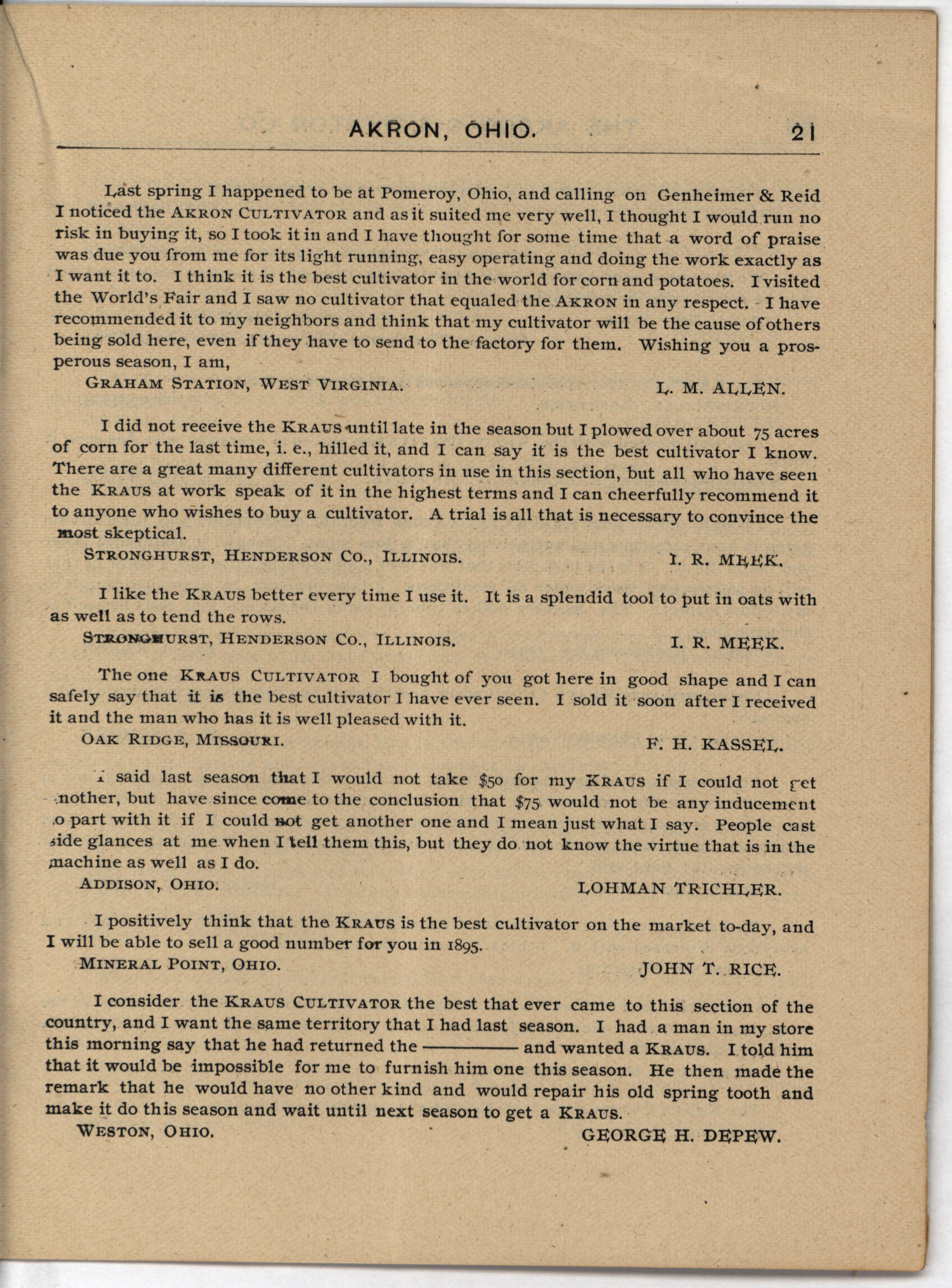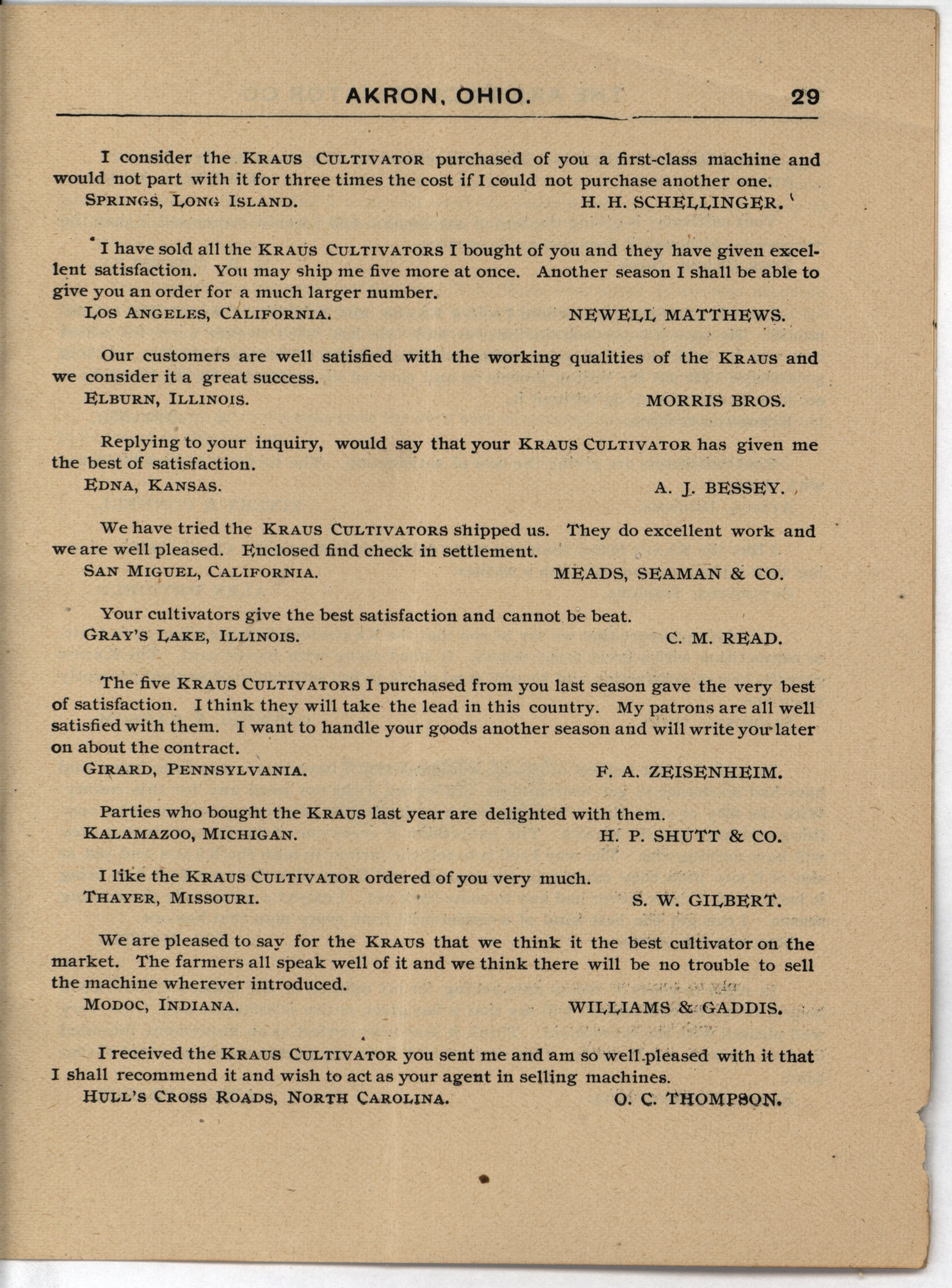 - Aultman, Mill & Co. agents for The Akron Cultivator Co., The Kraus and Akron Riding Cultivators