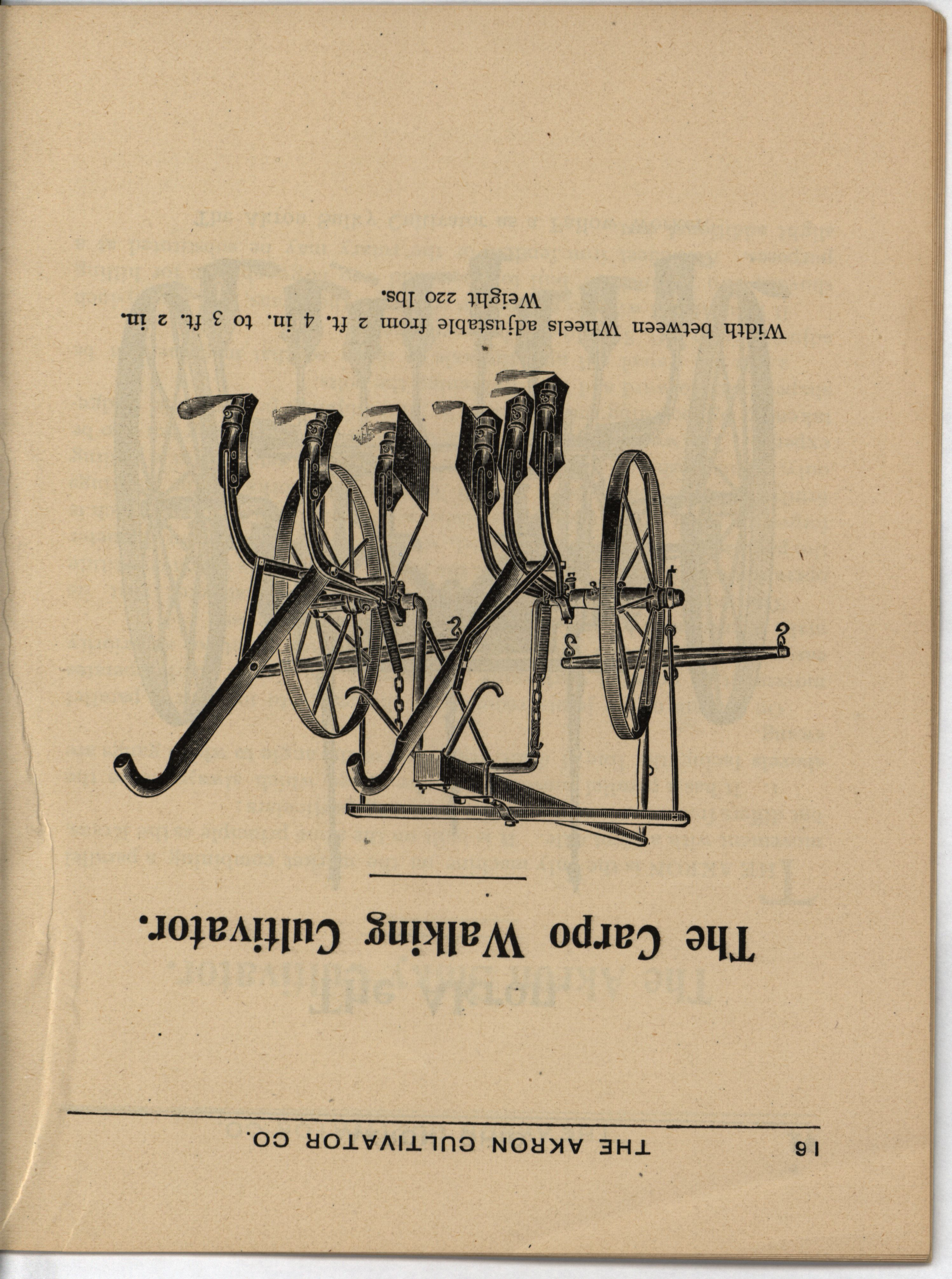 - Catalog detailing the cultivator products offered by the Akron Cultivator Company with illustrations.