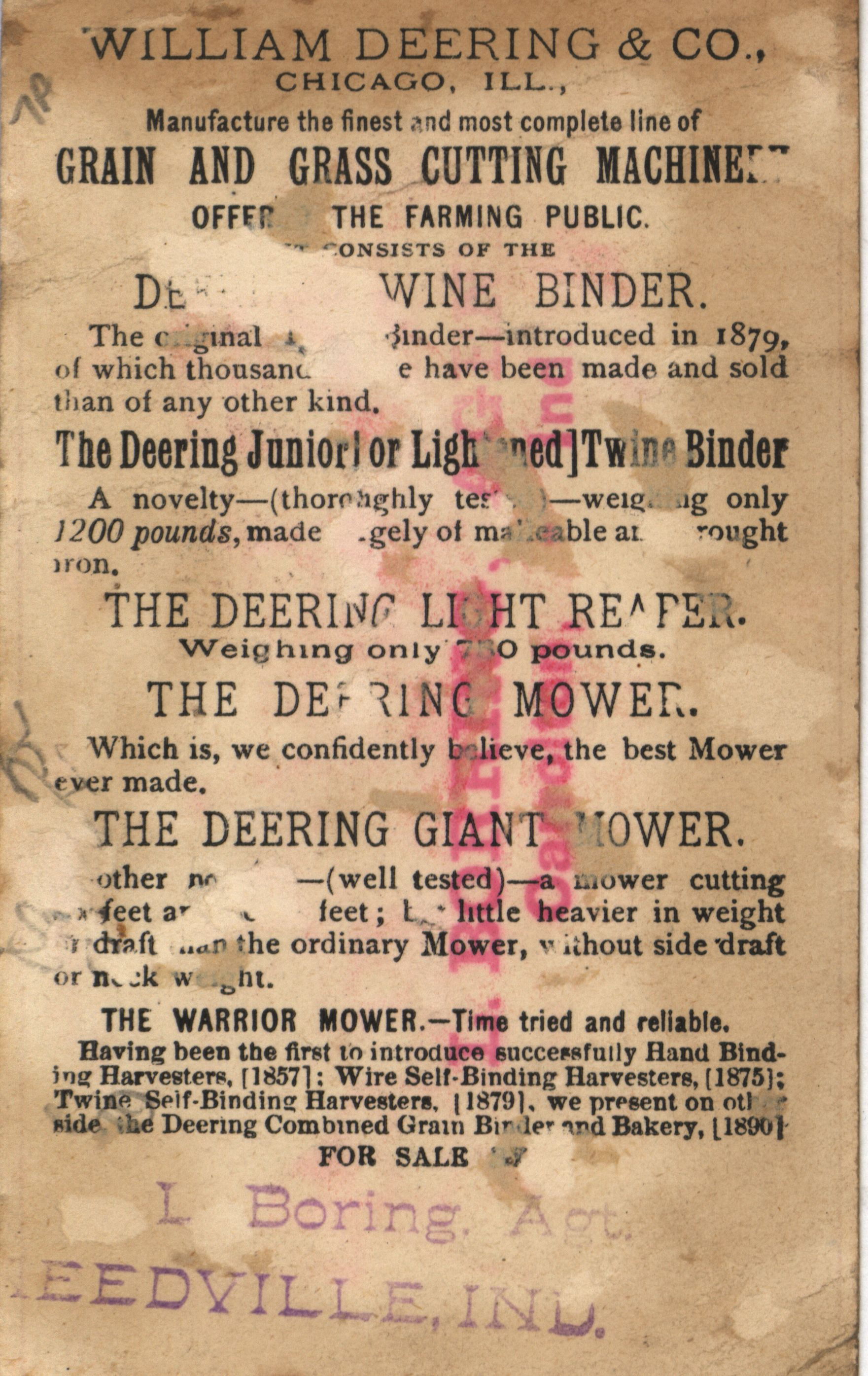 - "William Deering and Company advertisement card", Agricultural Machinery Literature Collection, Iowa State University Library Digital Collections