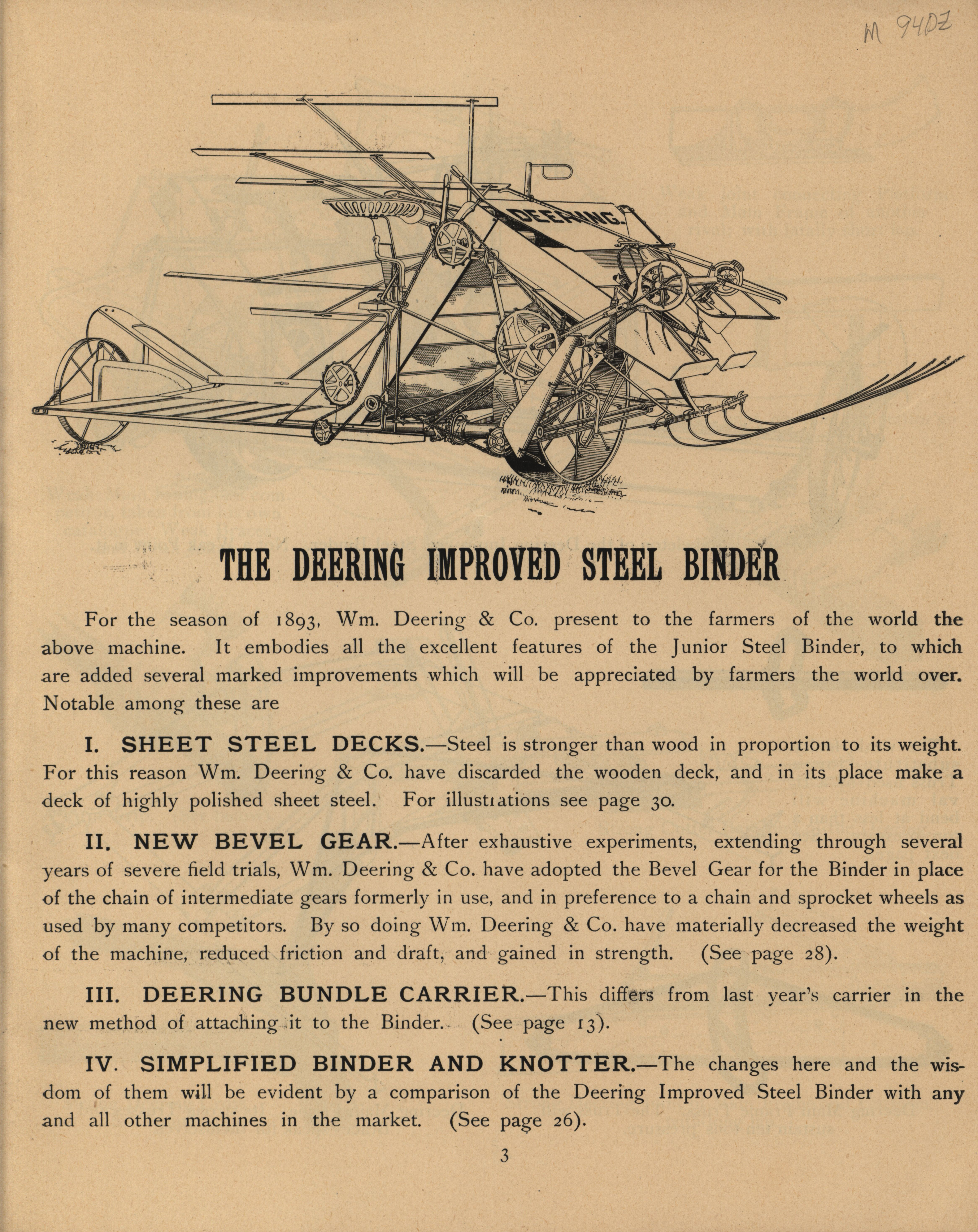 - "WM. Deering and Company 1893 Canvassers' Picture Book Showing the Mechanical Principles of the Deering Improved Steel Binder", Agricultural Machinery Literature Collection, Iowa State University Library Digital Collections