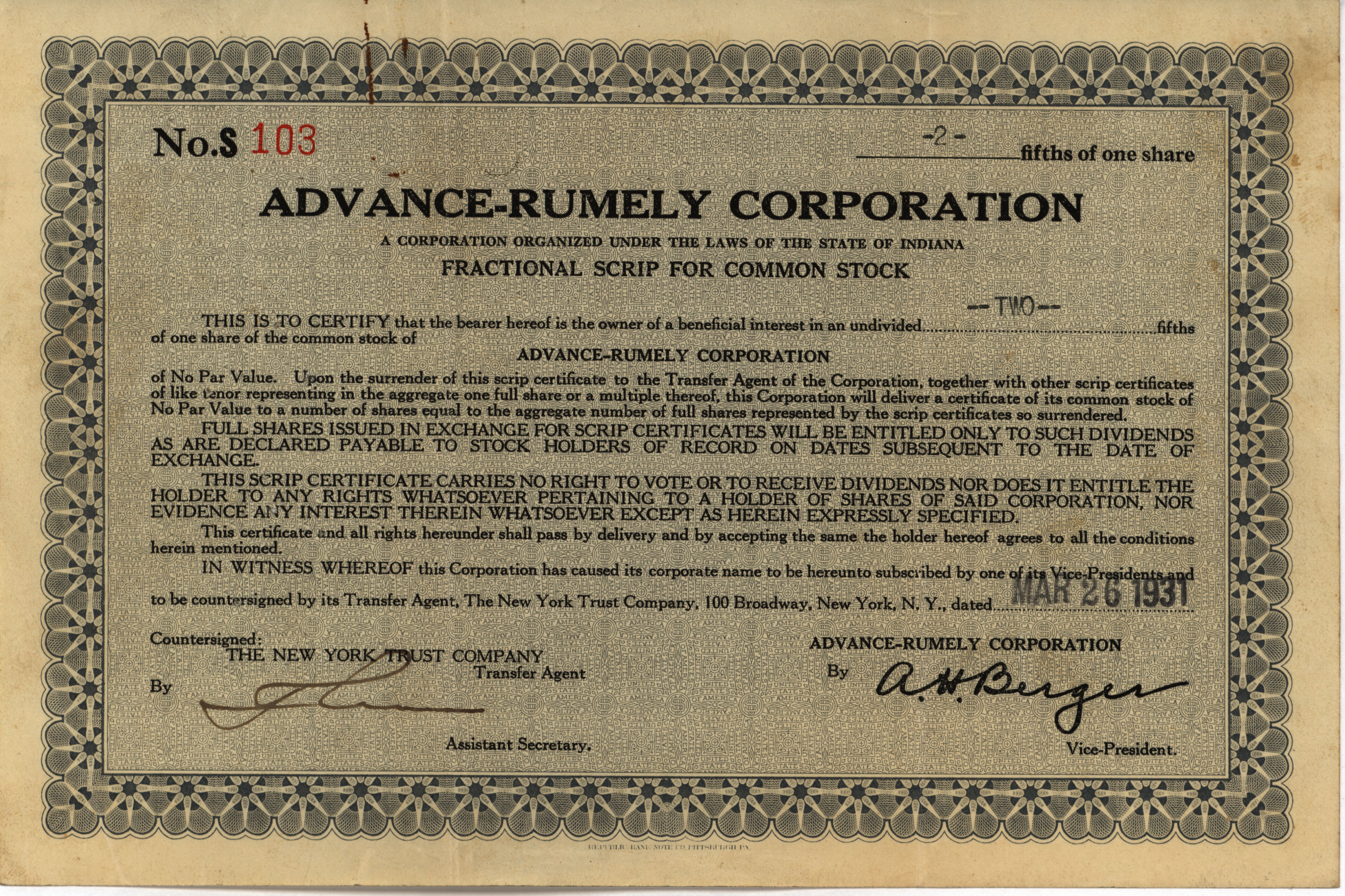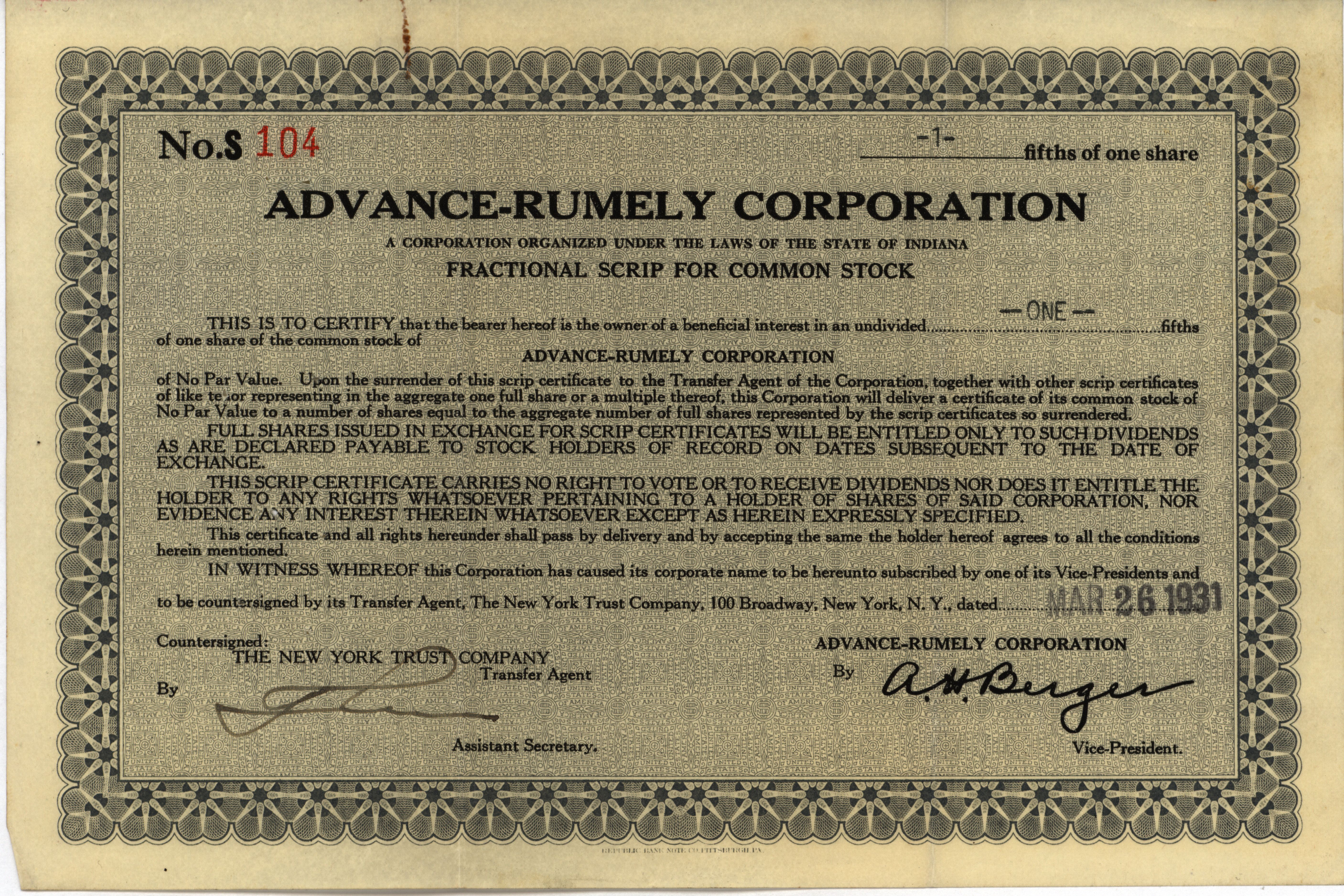 - "Advance-Rumely Corporation fractional scrip for common stock", Agricultural Machinery Literature Collection, Iowa State University Library Digital Collections