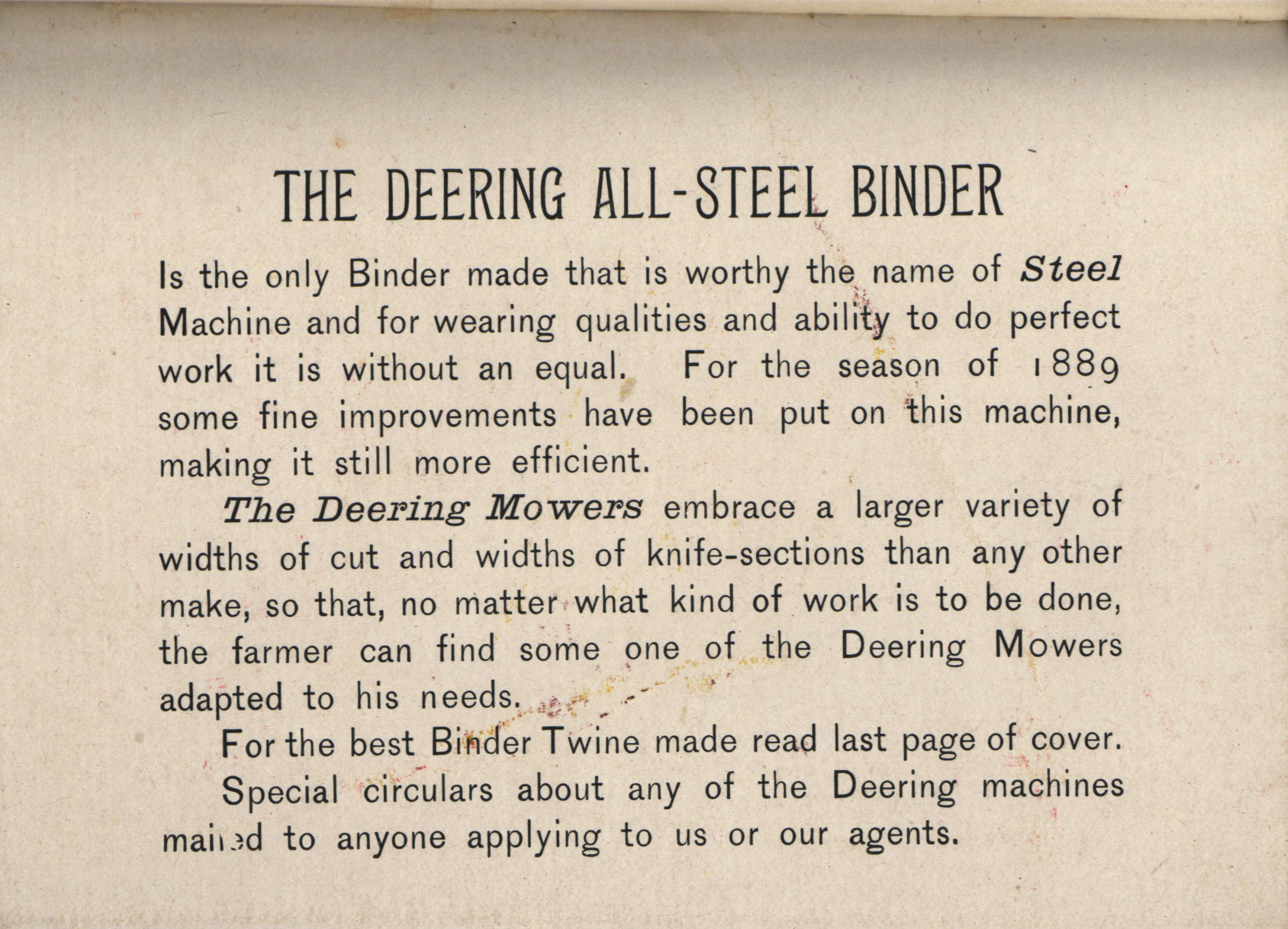 - "WM. Deering and Company advertisement pamphlet", Agricultural Machinery Literature Collection, Iowa State University Library Digital Collections