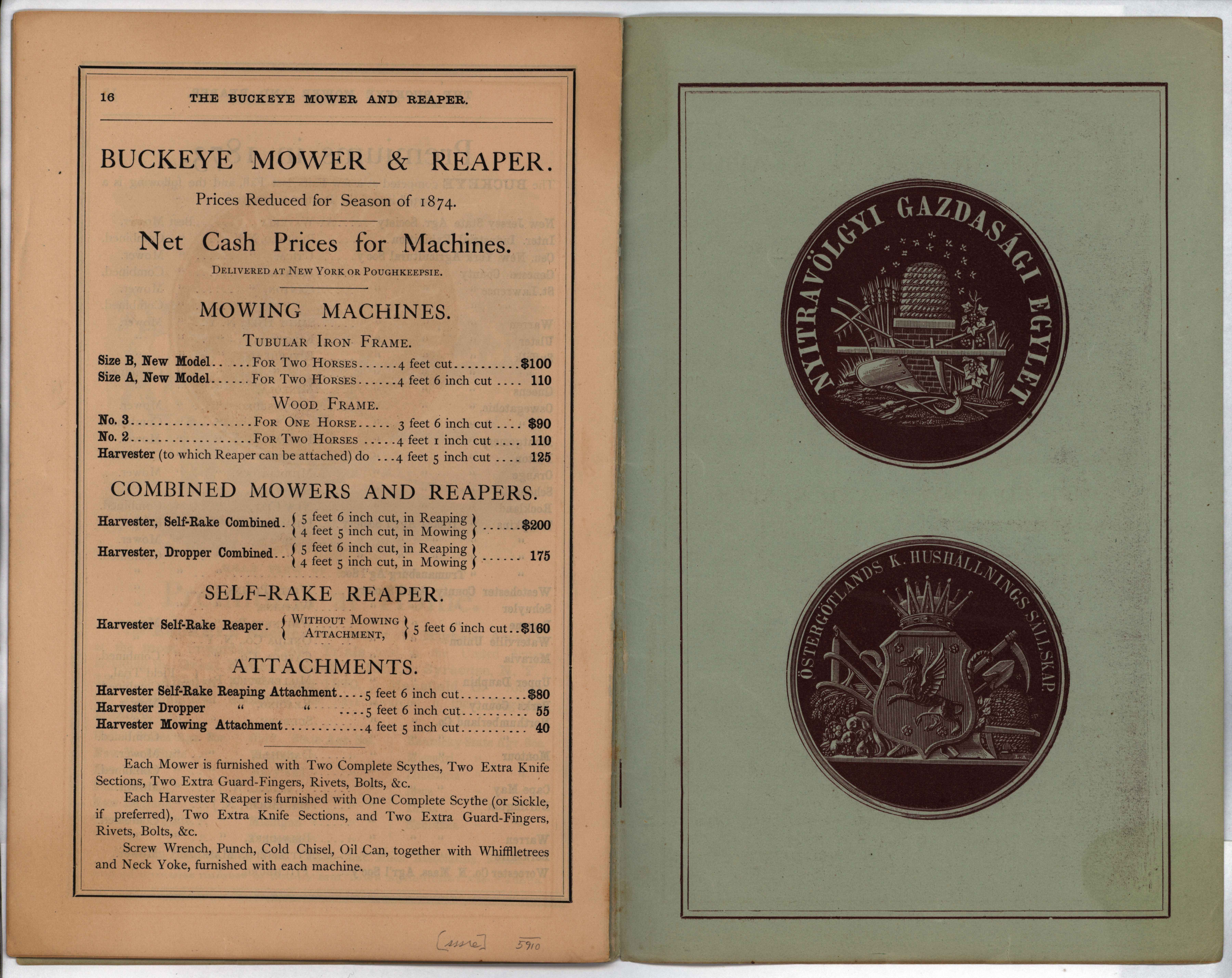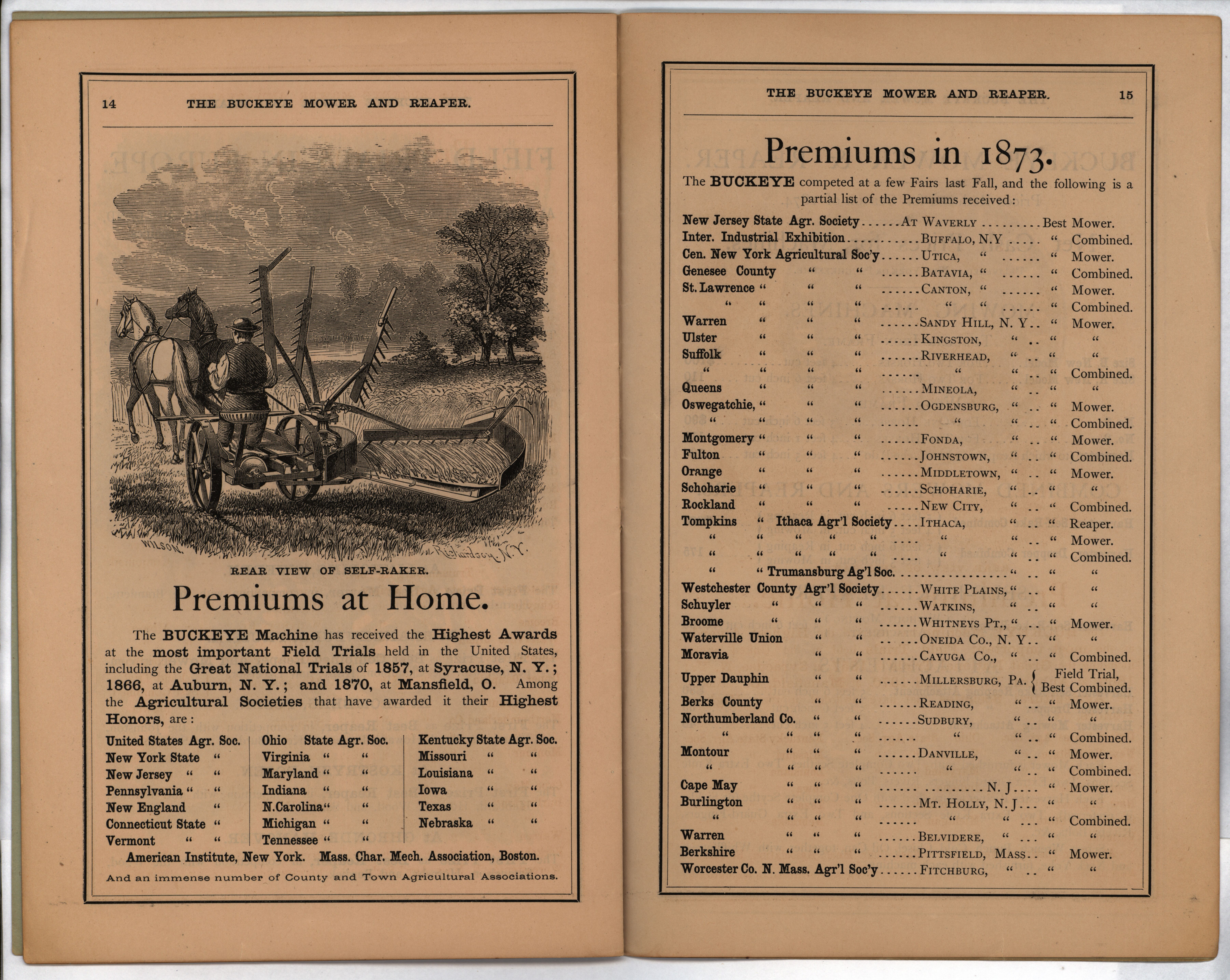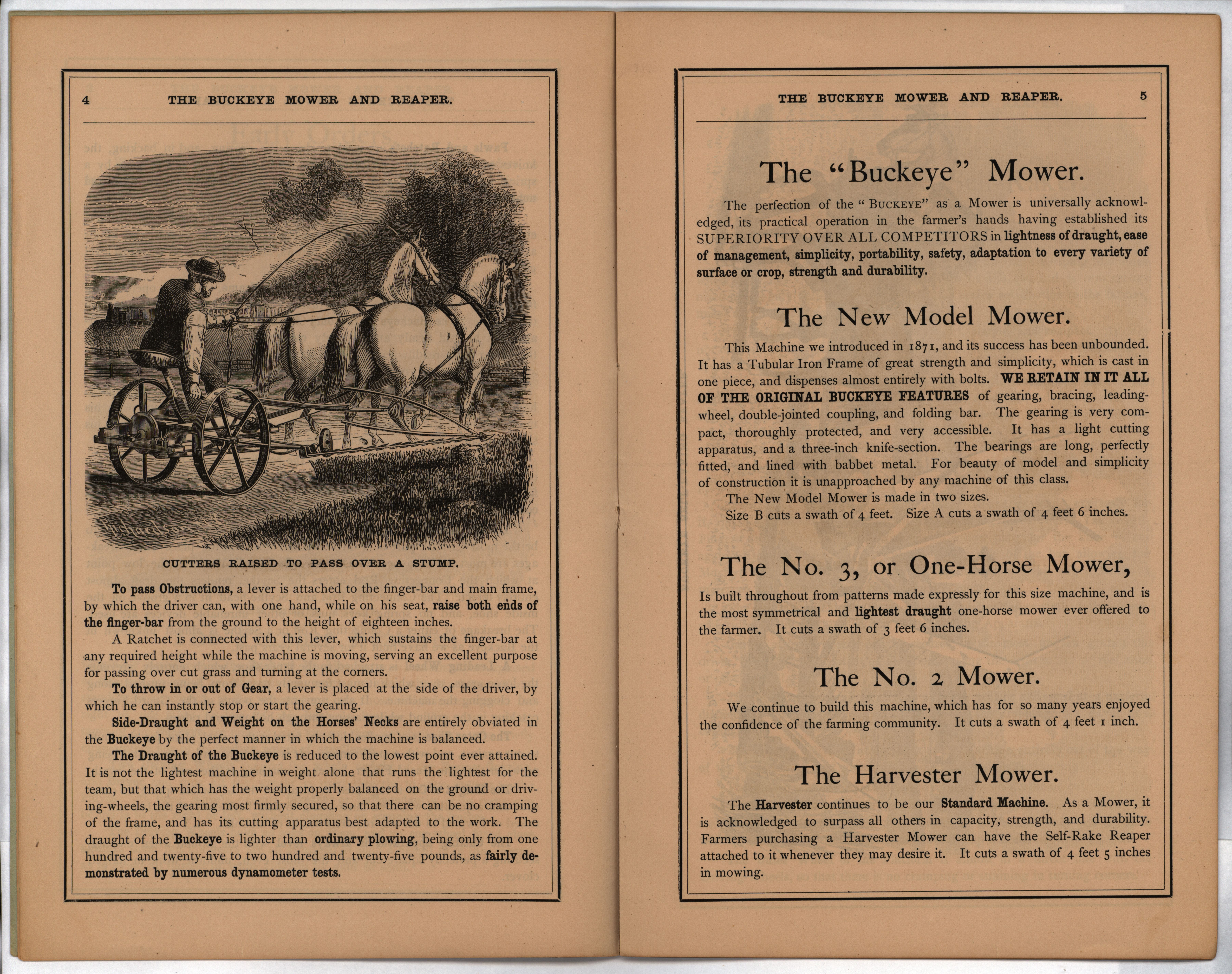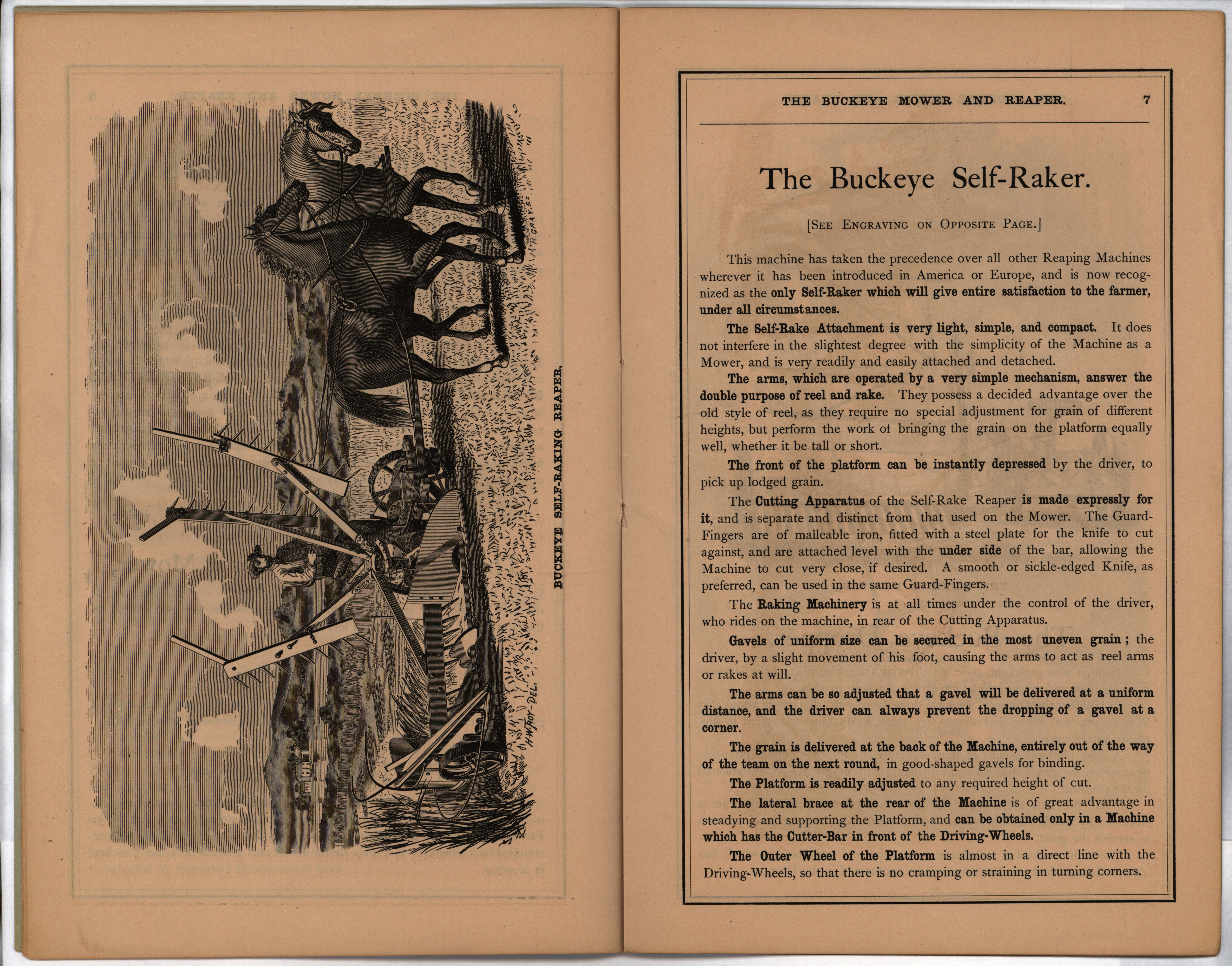 - "Buckeye mower and reaper with self-raker", Agricultural Machinery Literature Collection, Iowa State University Library Digital Collections