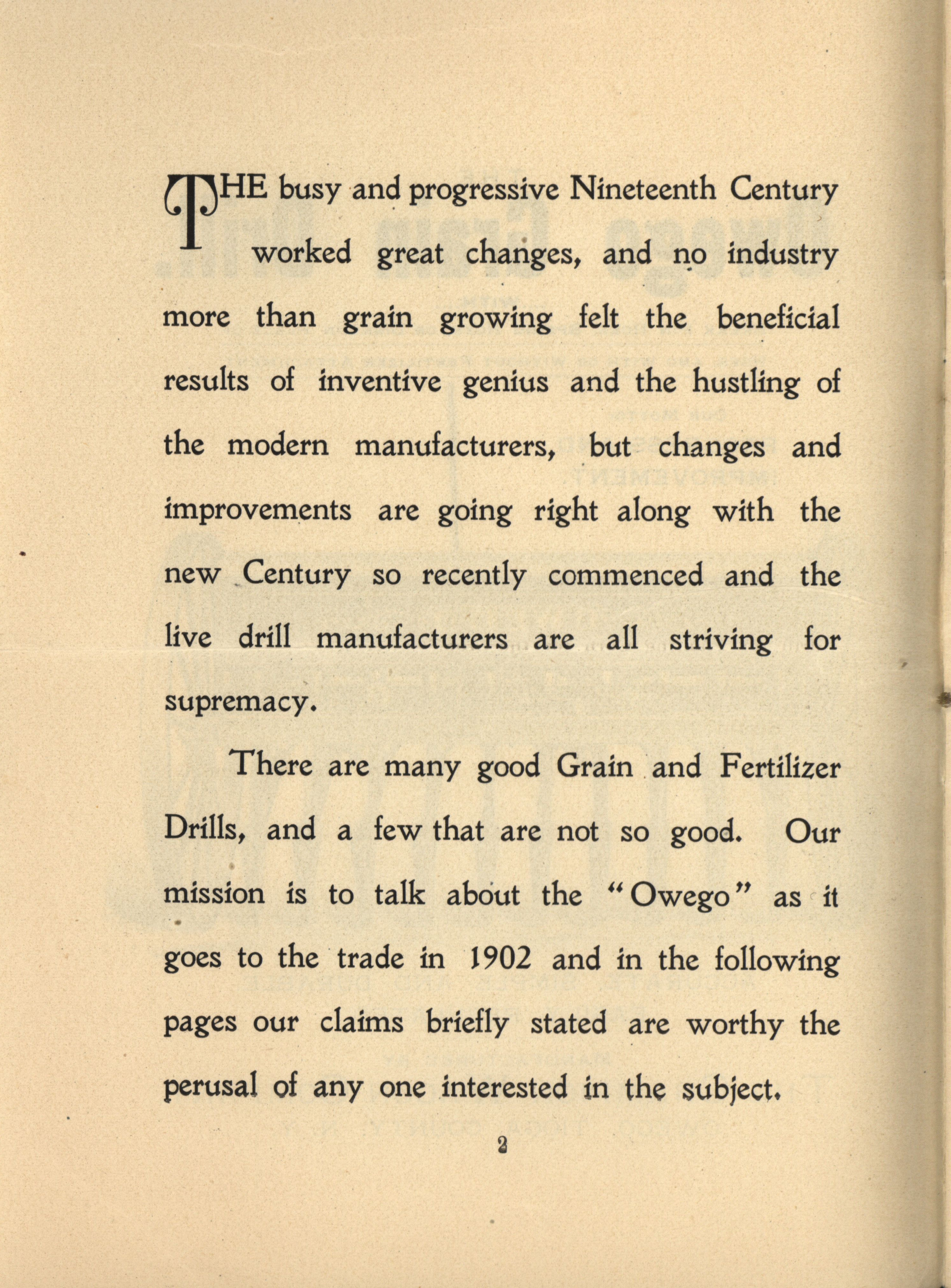 - Illustrated catalog describing the Owego Grain Drill product line offered by the Champion Wagon Company in 1902.