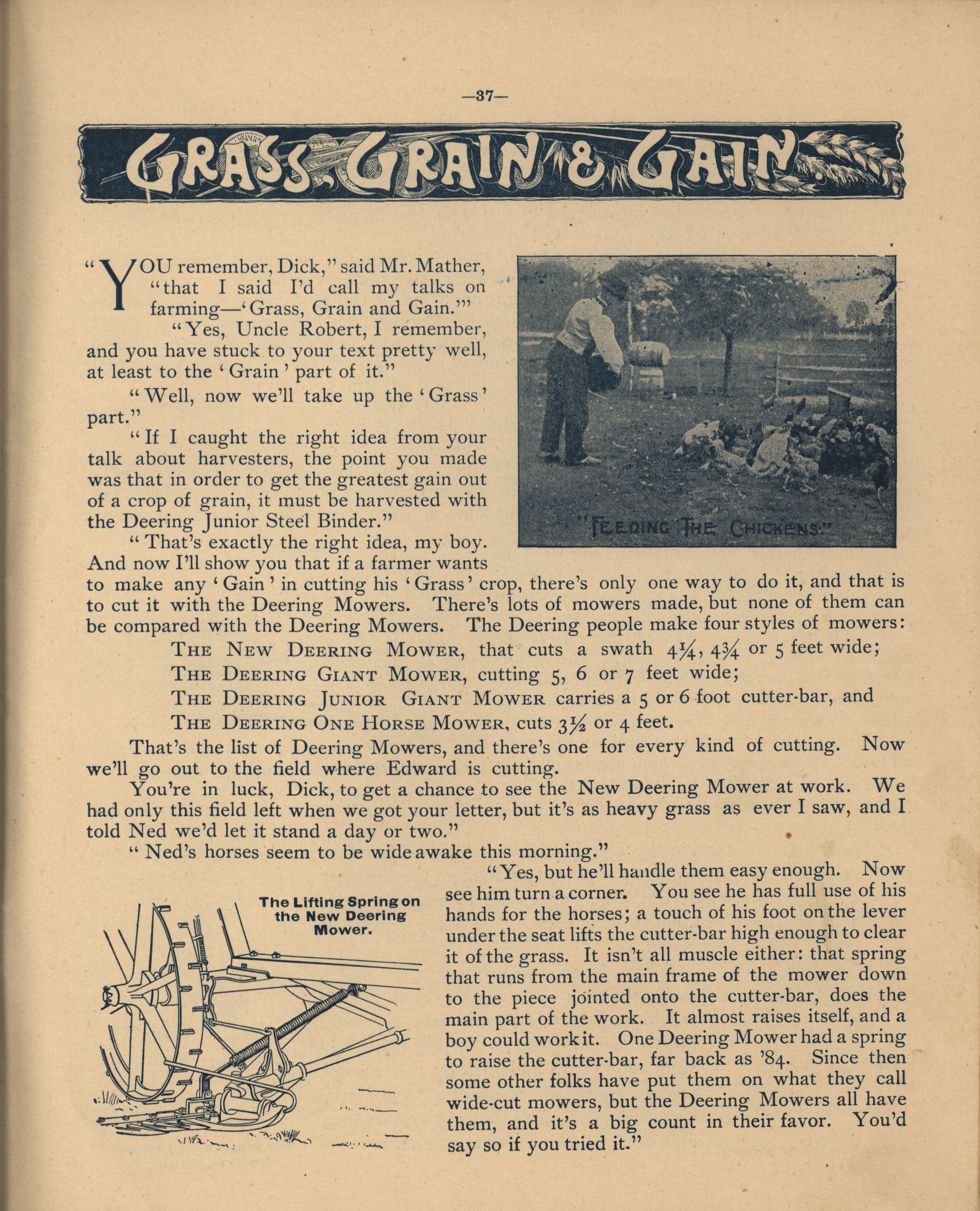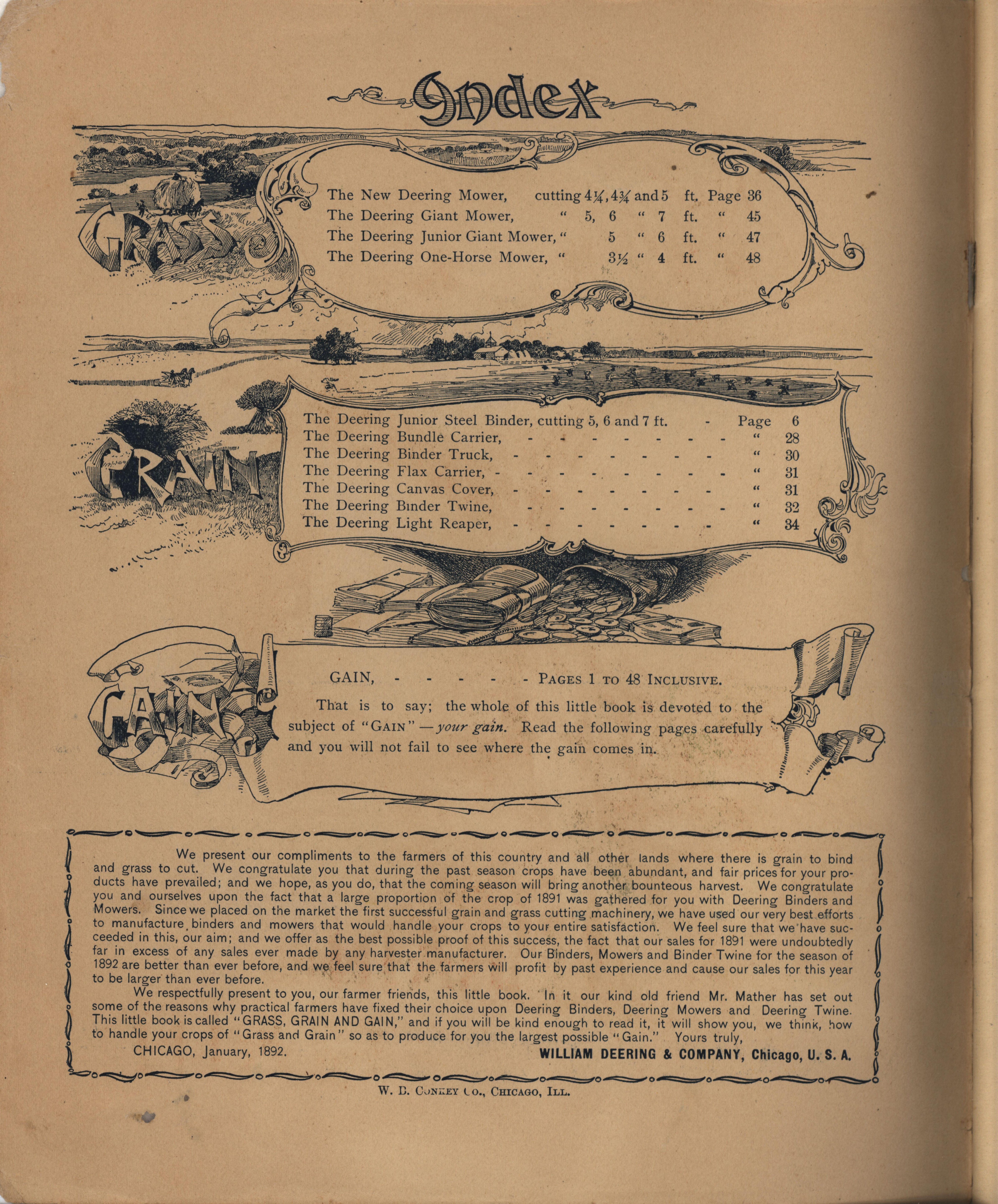 - "William Deering and Company Grass, Grain and Gain for Farmers", Agricultural Machinery Literature Collection, Iowa State University Library Digital Collections