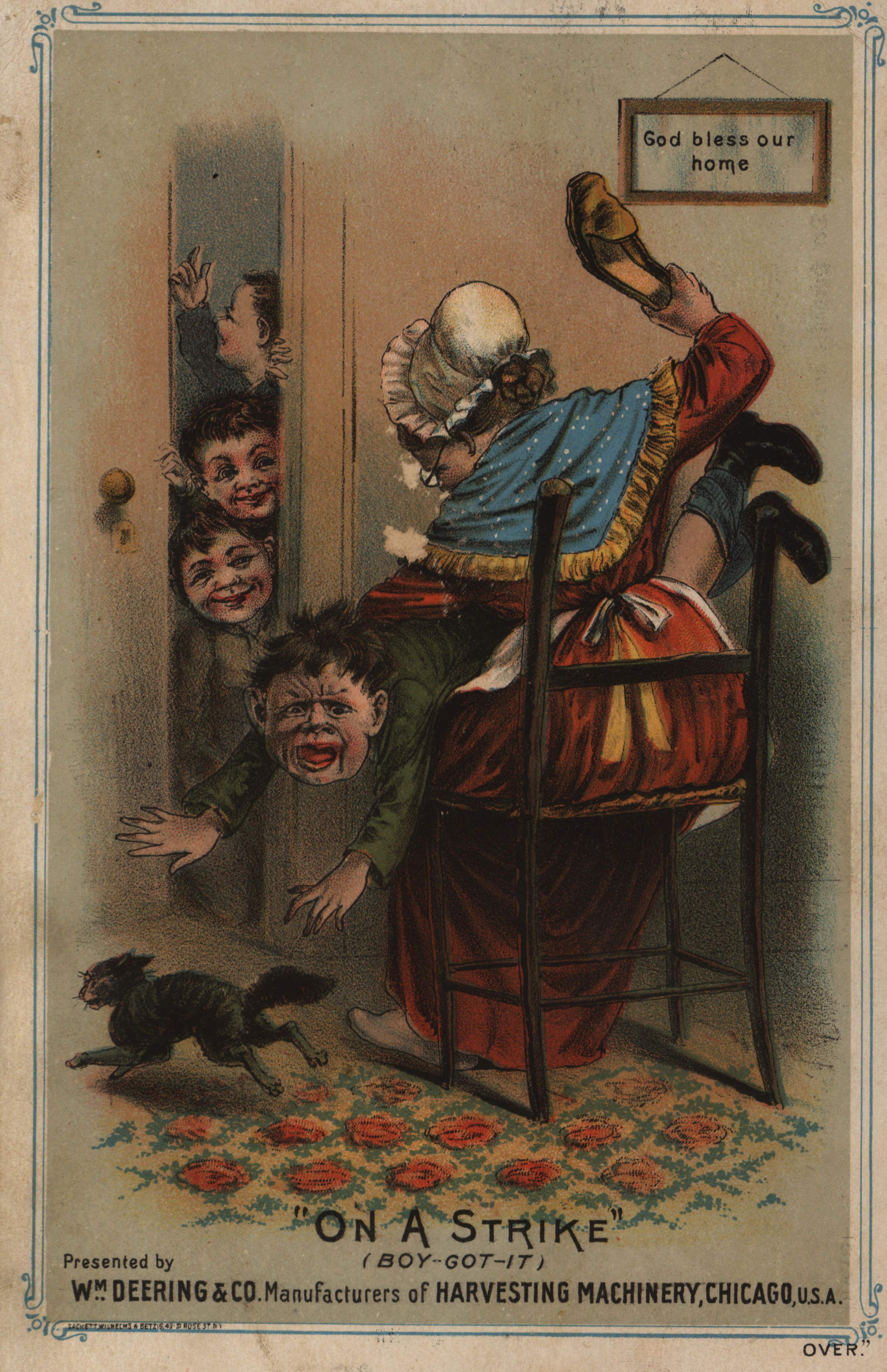 - Illustrated advertisement for WM. Deering and Company depicting an agricultural implement and a woman punishing a child.