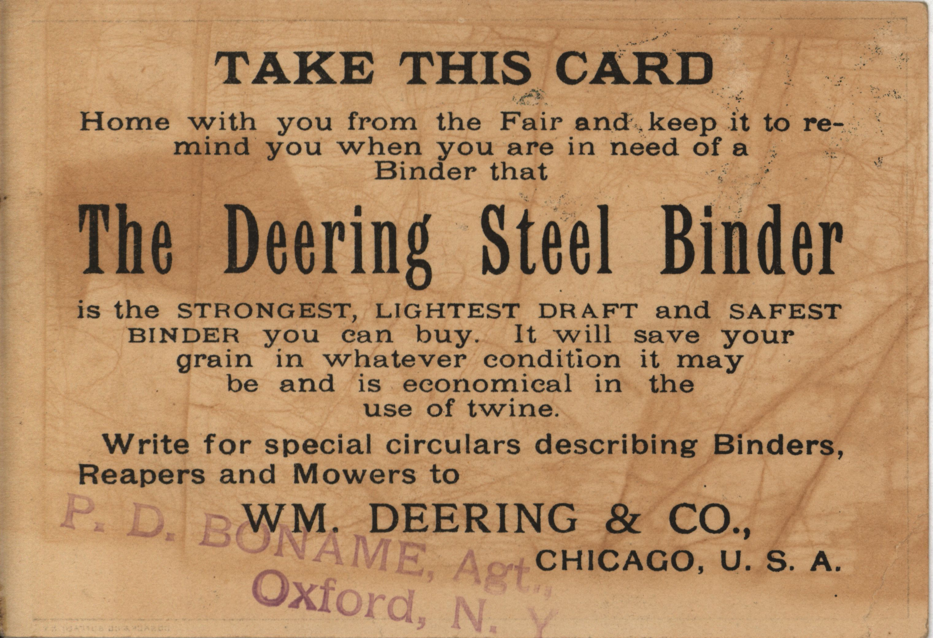- "WM. Deering and Company Deering Steel Binder advertisement card", Agricultural Machinery Literature Collection, Iowa State University Library Digital Collections