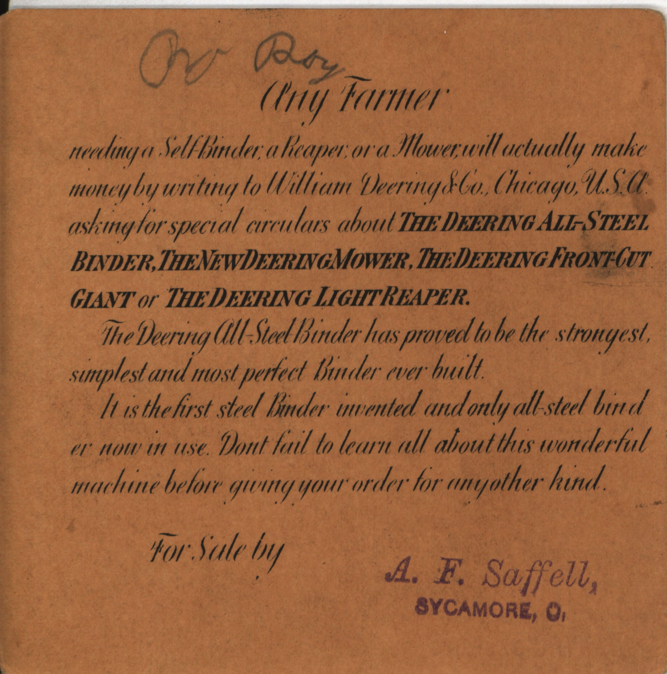 - "Deering Harvester Company advertisement card", Agricultural Machinery Literature Collection, Iowa State University Library Digital Collections