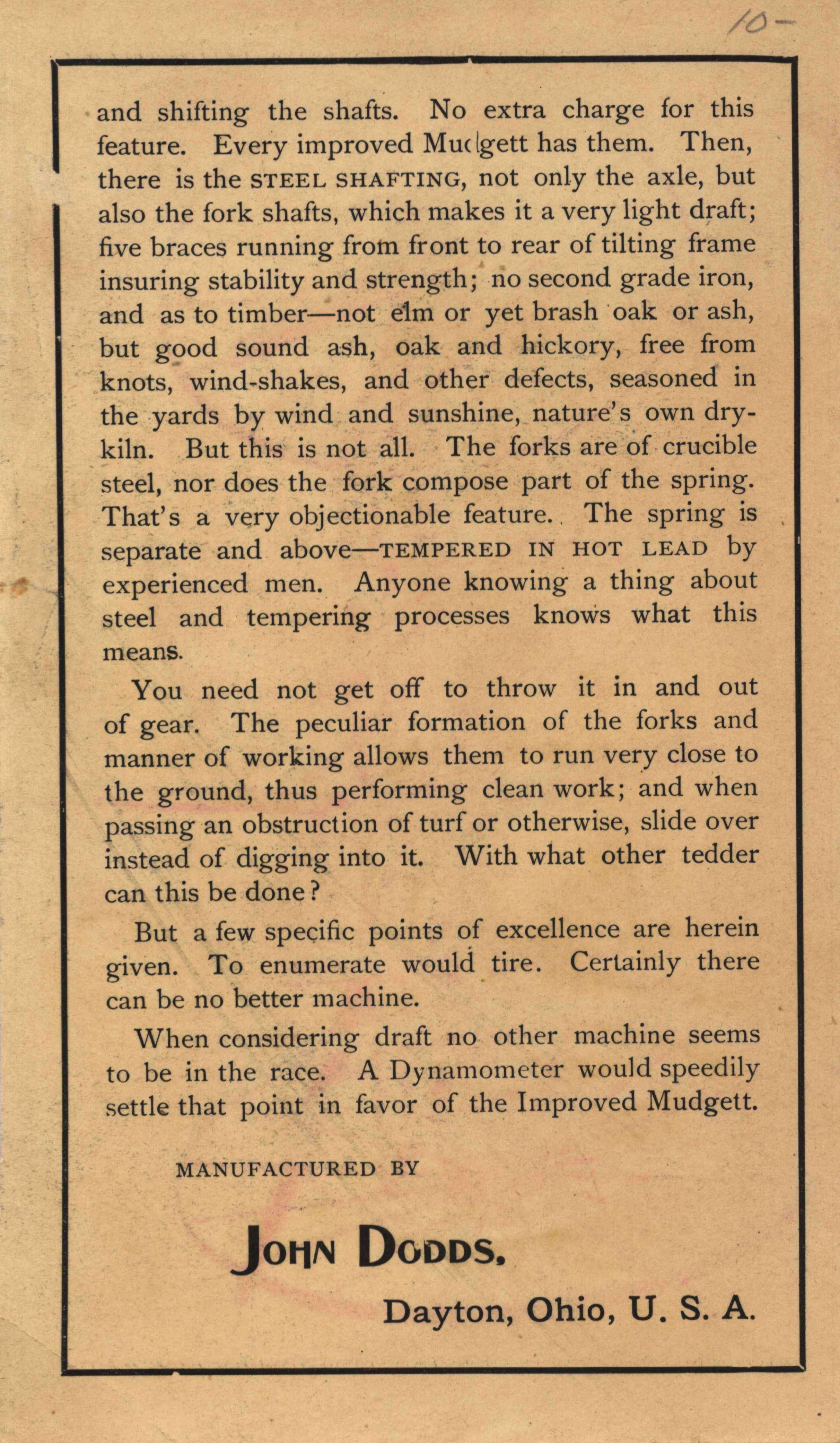 - "John Dodds Company Mudgett Hay Tedder advertisement card", Agricultural Machinery Literature Collection, Iowa State University Library Digital Collections