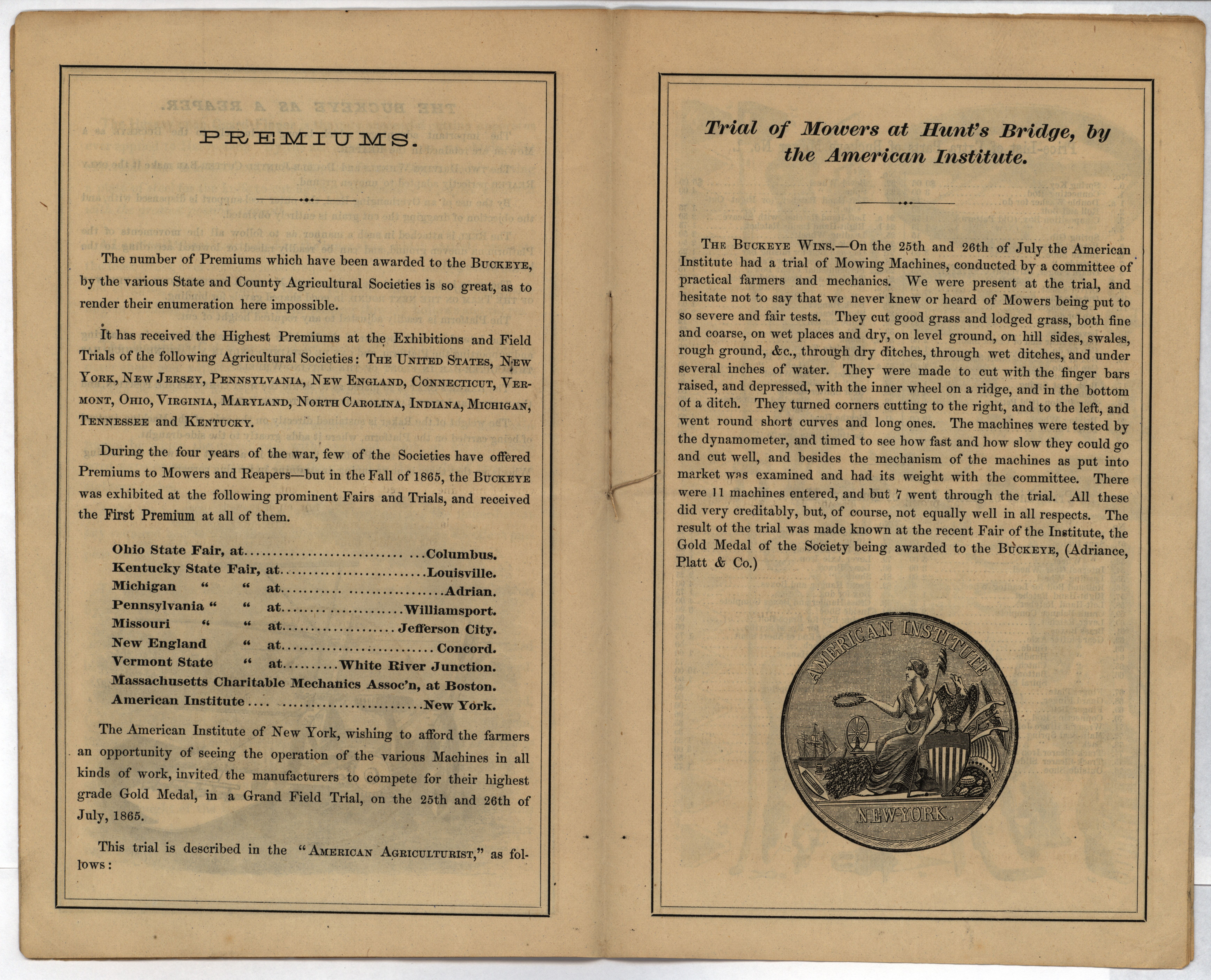 - Catalog of products related to and including the Buckeye Mower and Reaper offered by Adriance, Platt and Company. Includes list of prices and illustrations of the products and manufacturing plant.