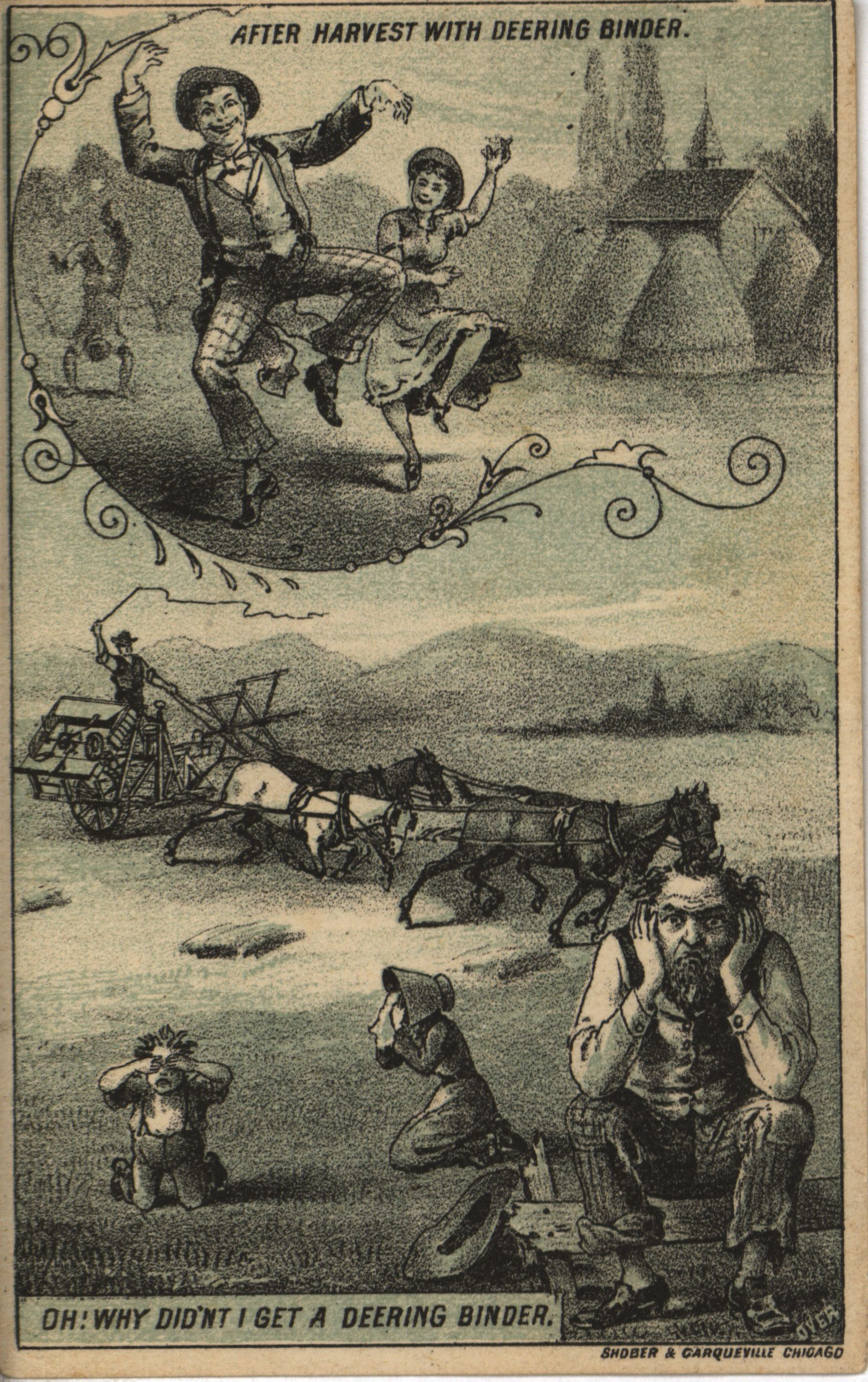 - Illustrated advertisement card for the Deering Twine Binder offered by William Deering and Company depicting a family with the binder dancing while one without wallows.