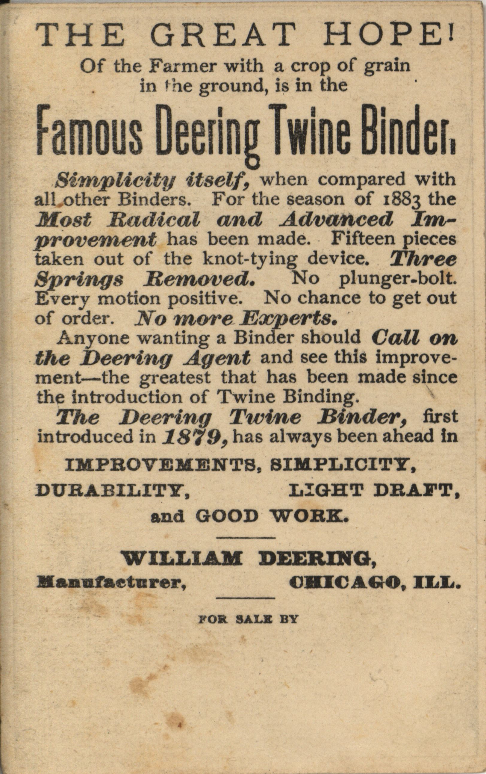 - "William Deering and Company twine binder advertisement card", Agricultural Machinery Literature Collection, Iowa State University Library Digital Collections