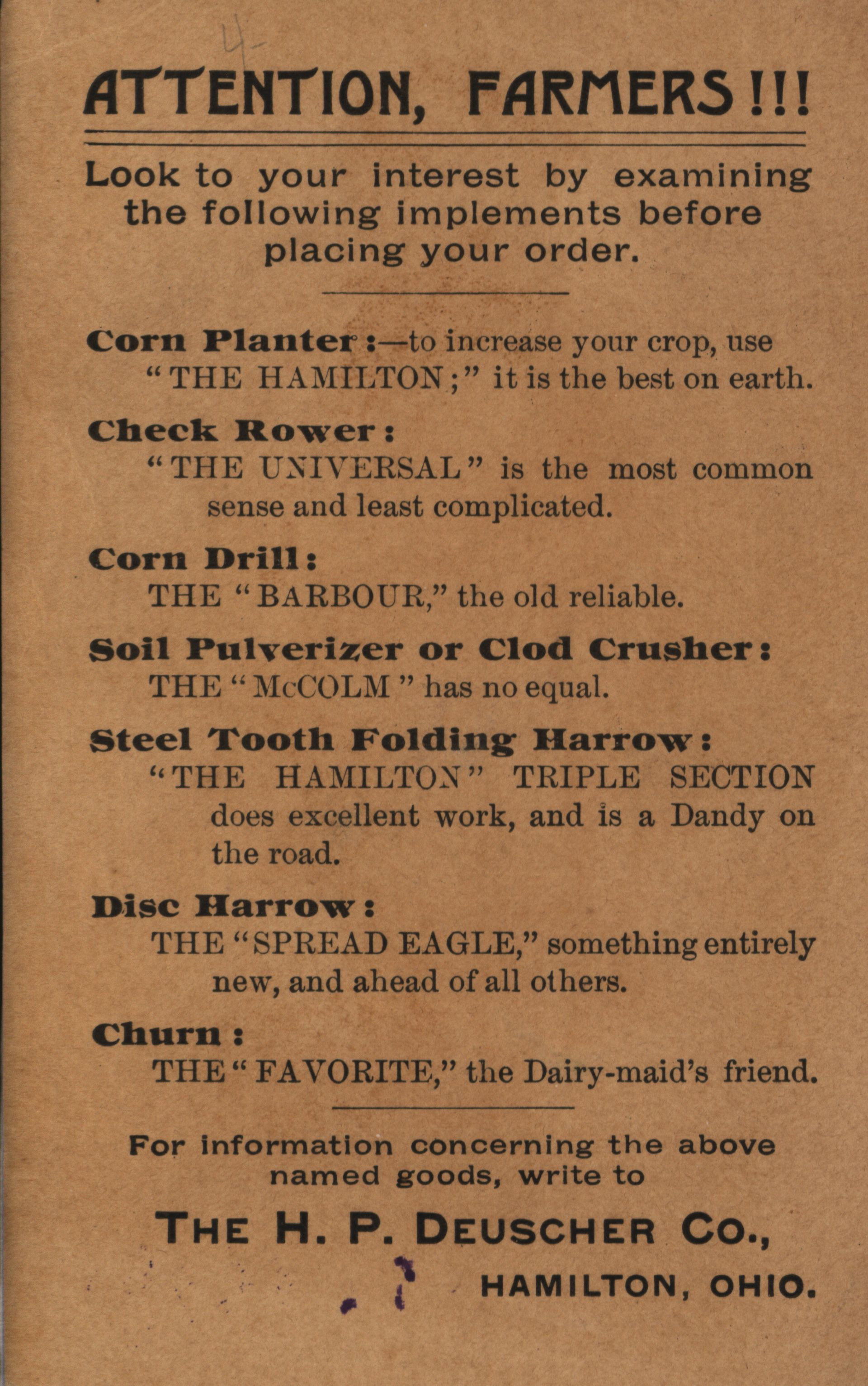 - "H. P. Deuscher Company advertisement card", Agricultural Machinery Literature Collection, Iowa State University Library Digital Collections