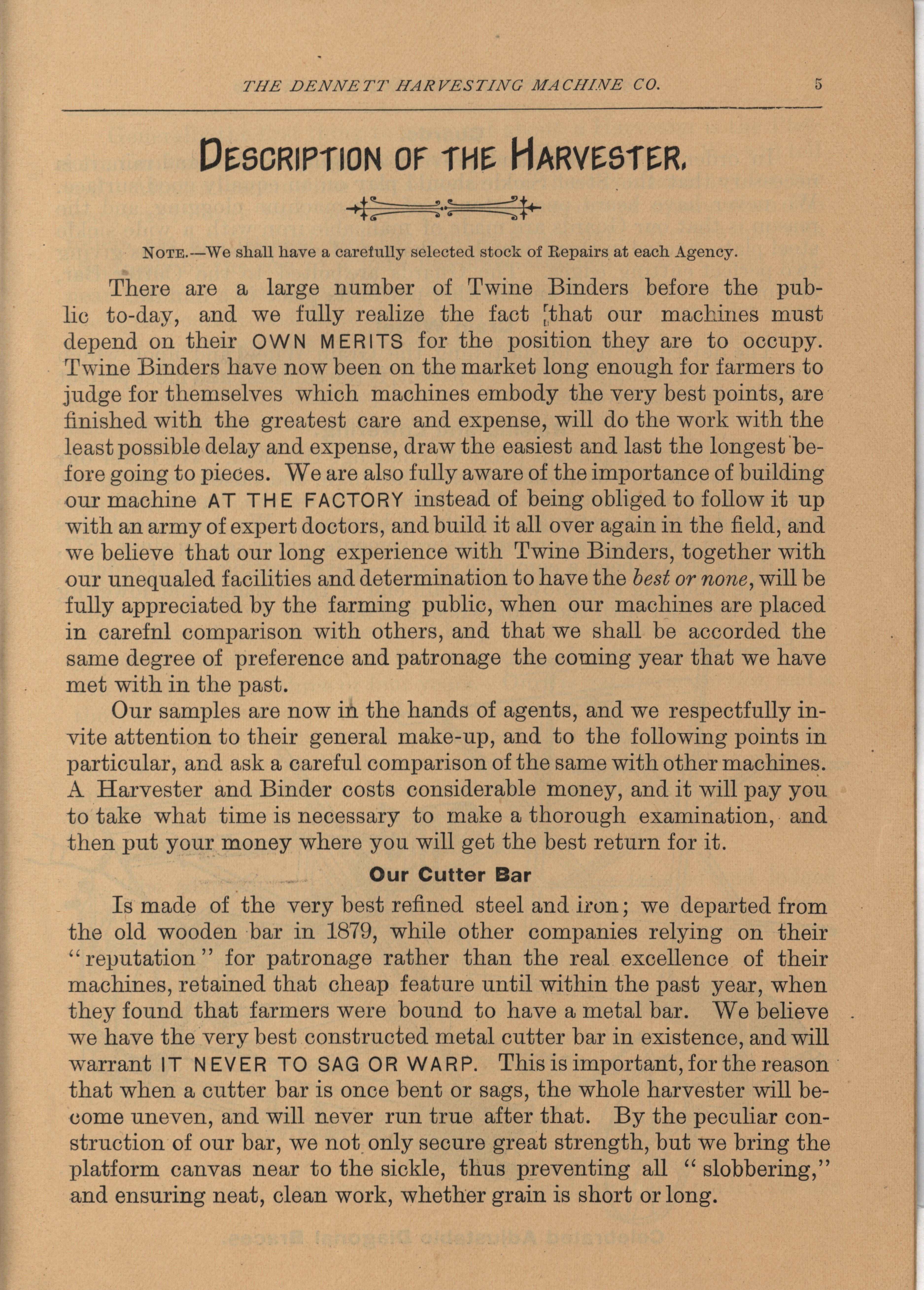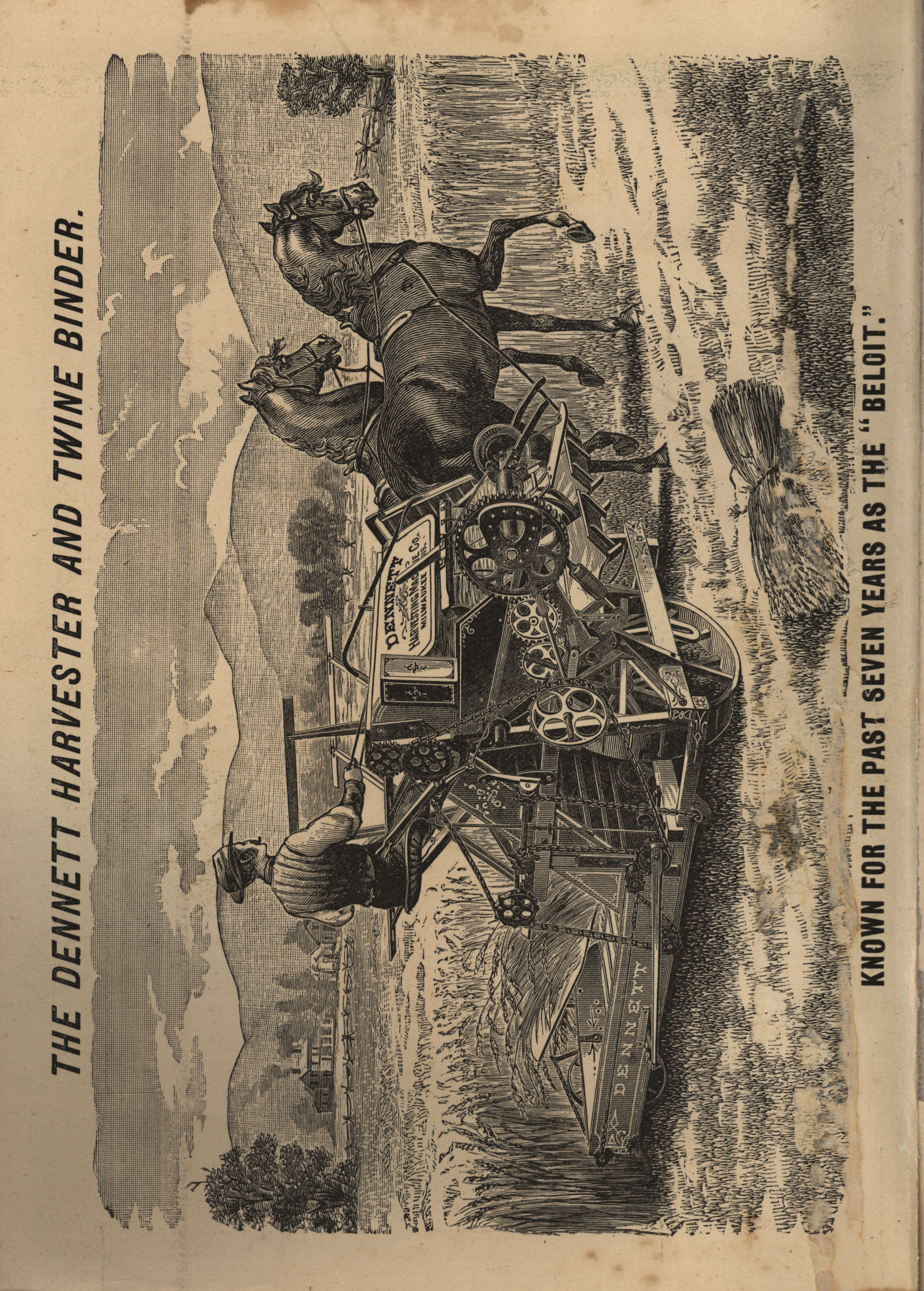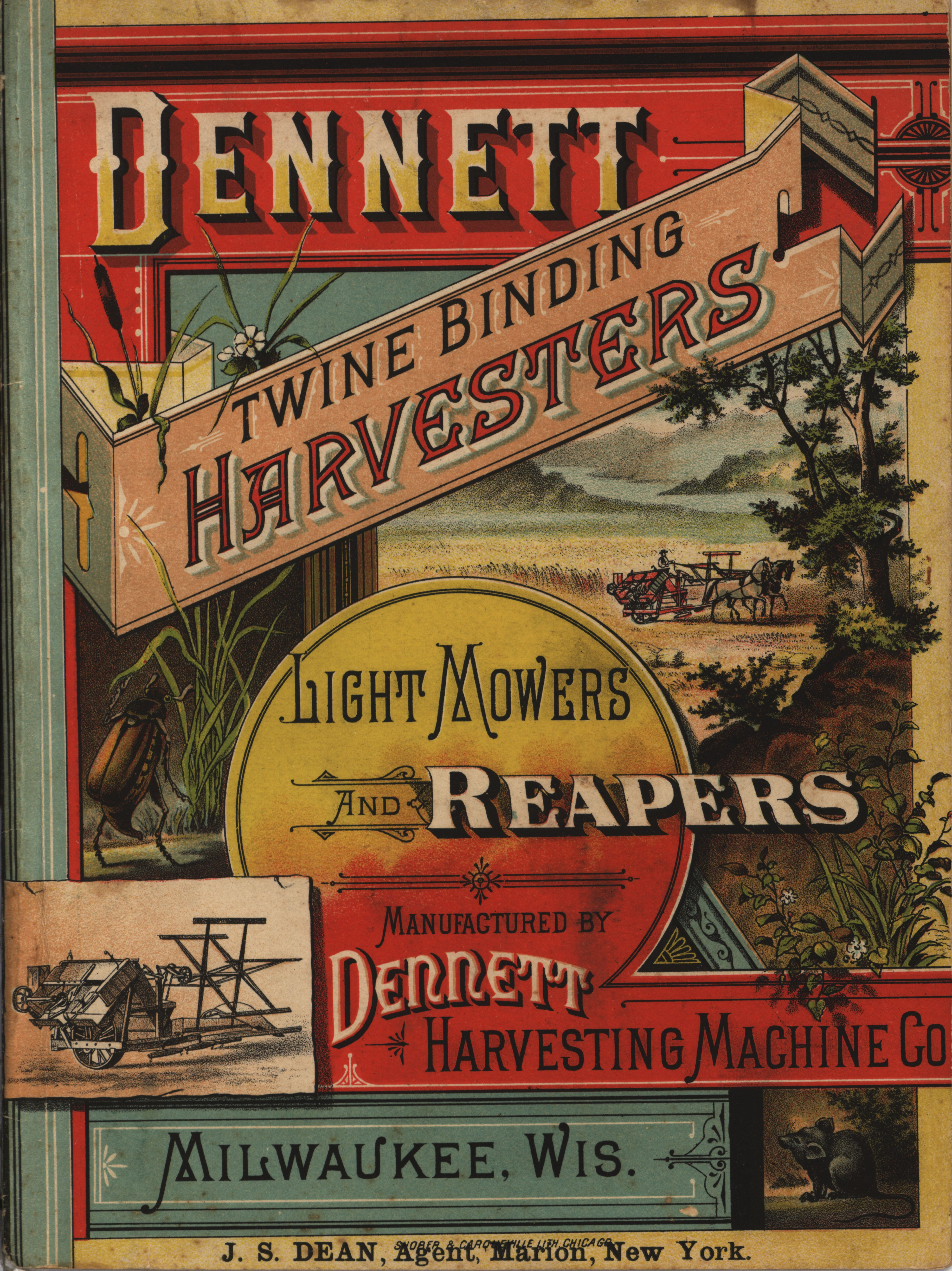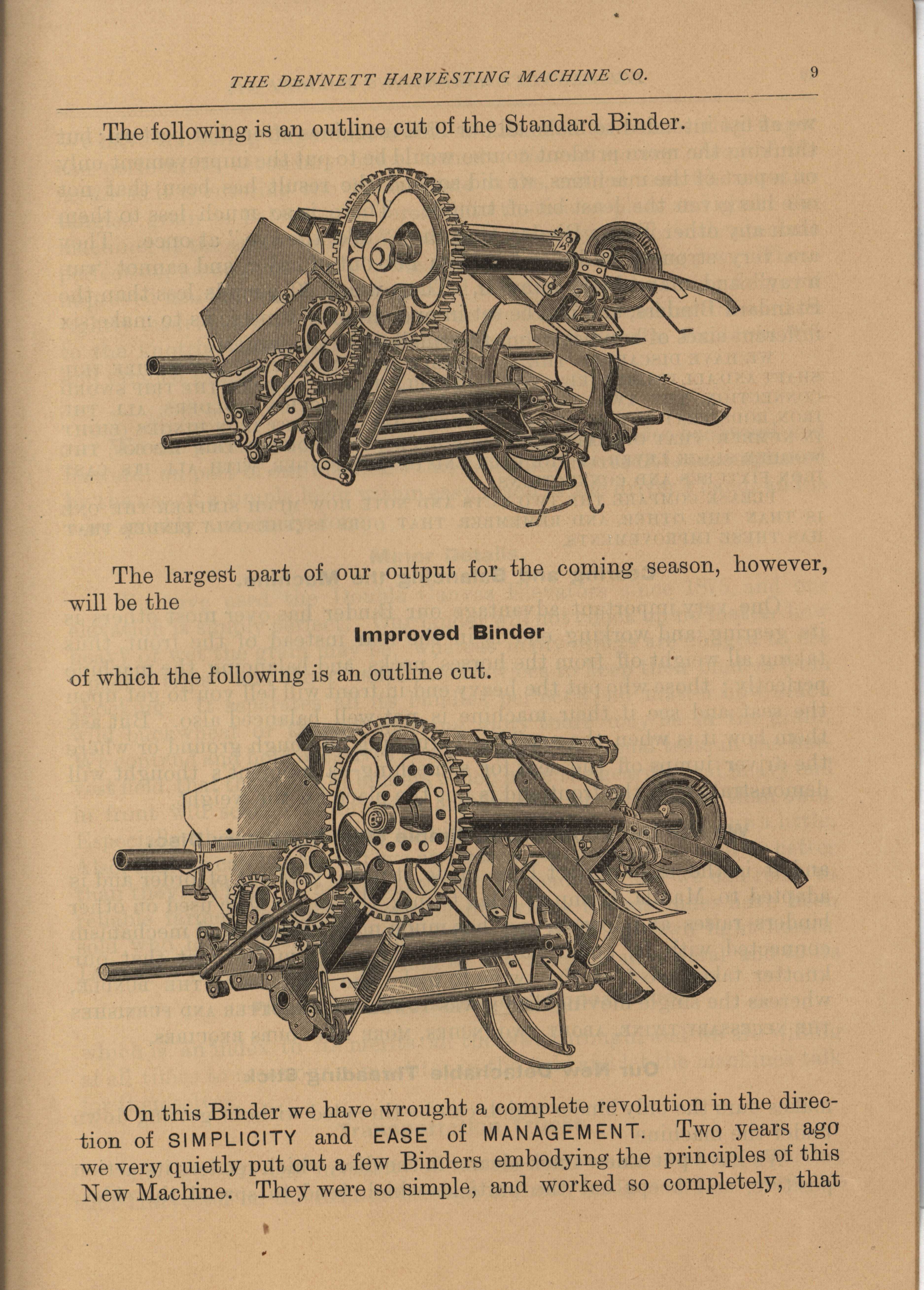 - Illustrated catalog describing the twine binders, harvesters, light mowers and reapers offered by Dennett Harvesting Machine Company, including a history of the company.