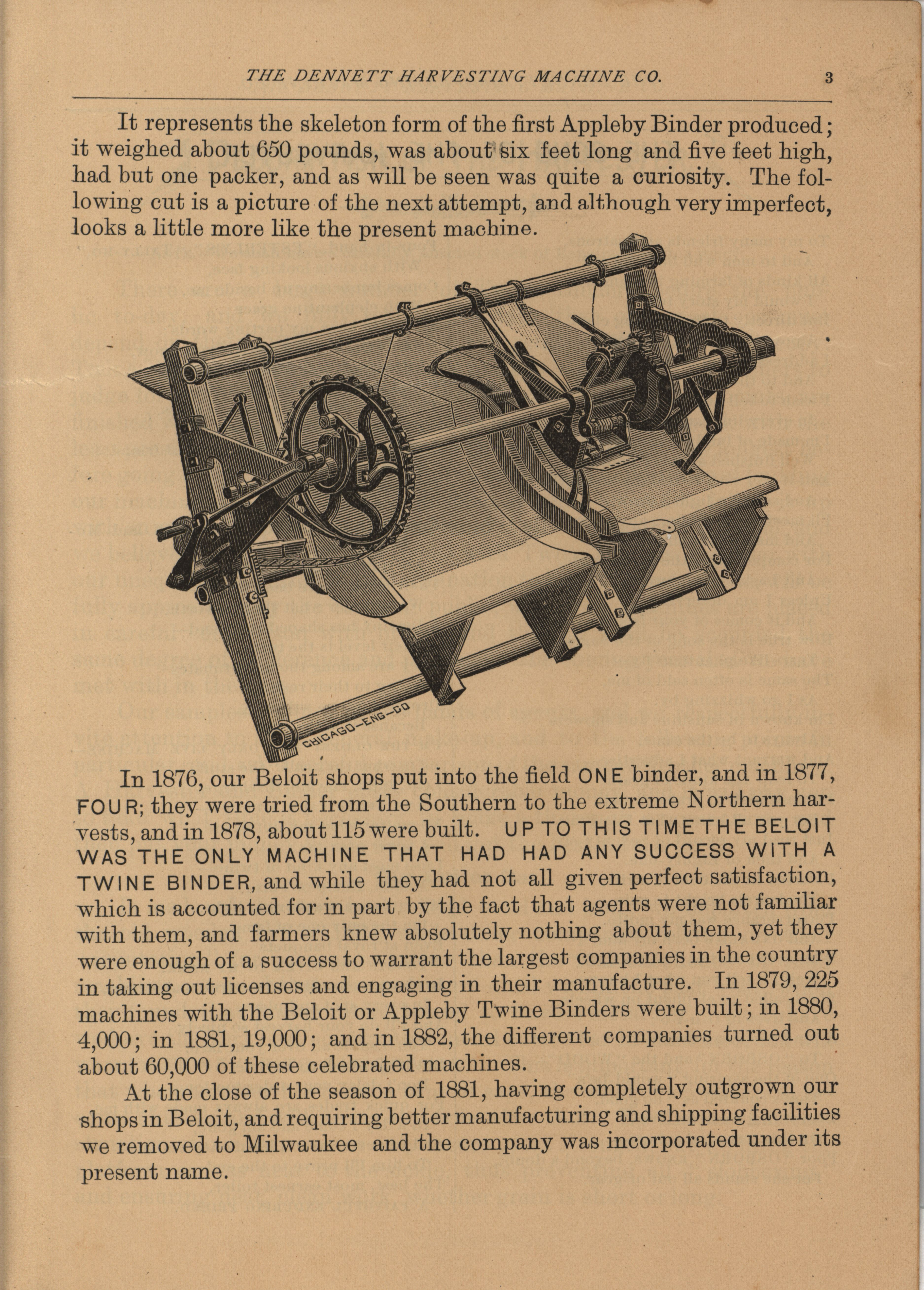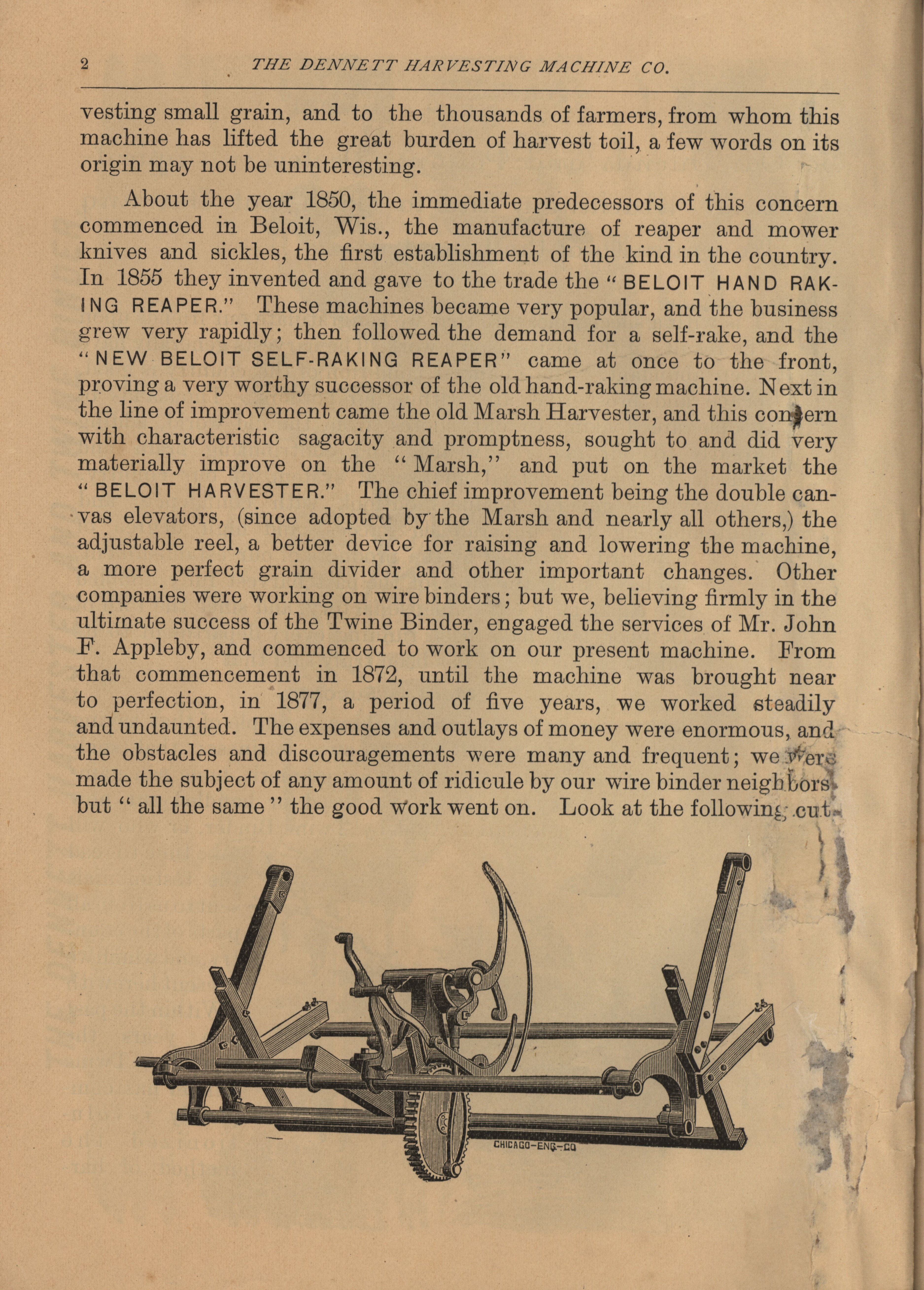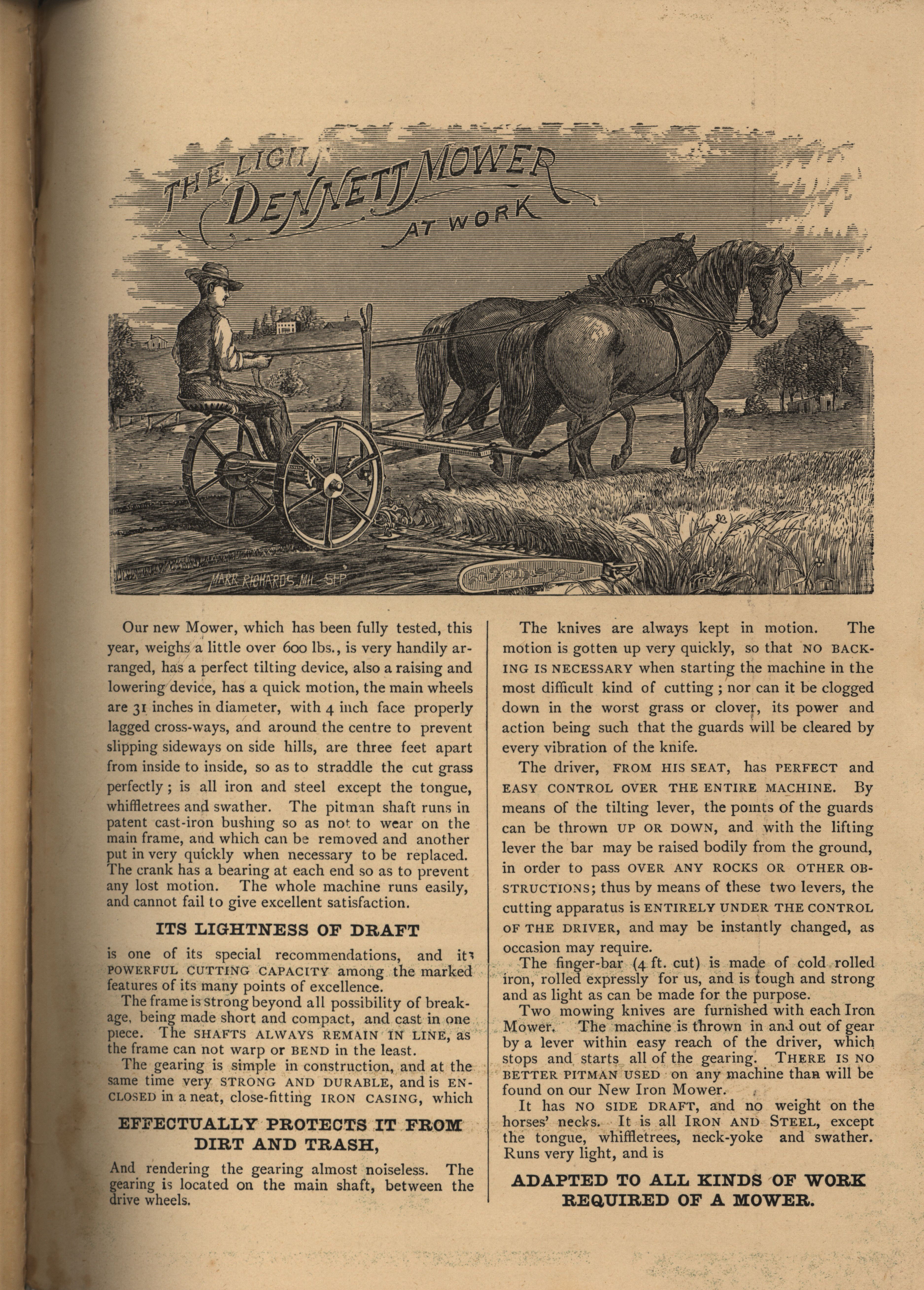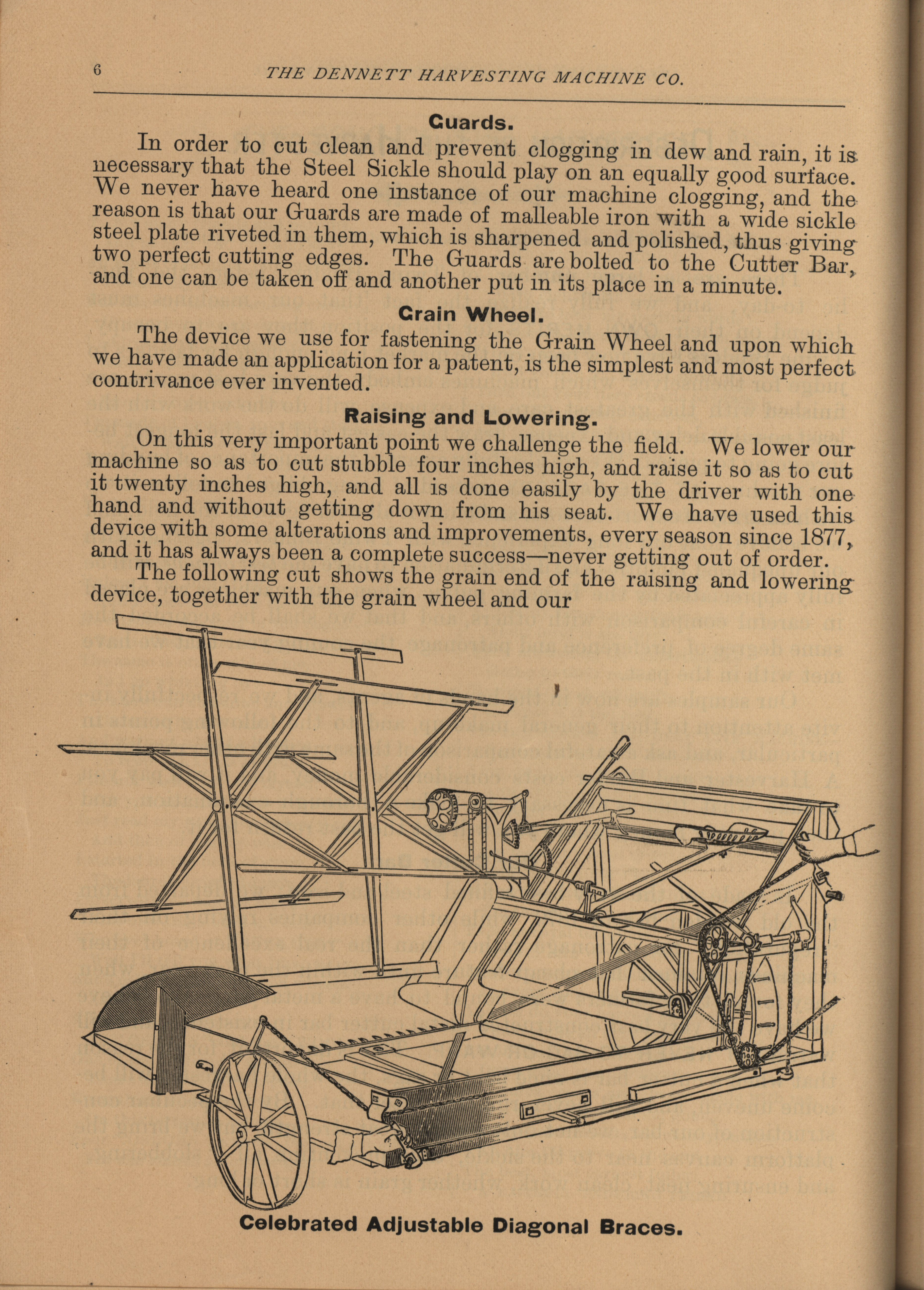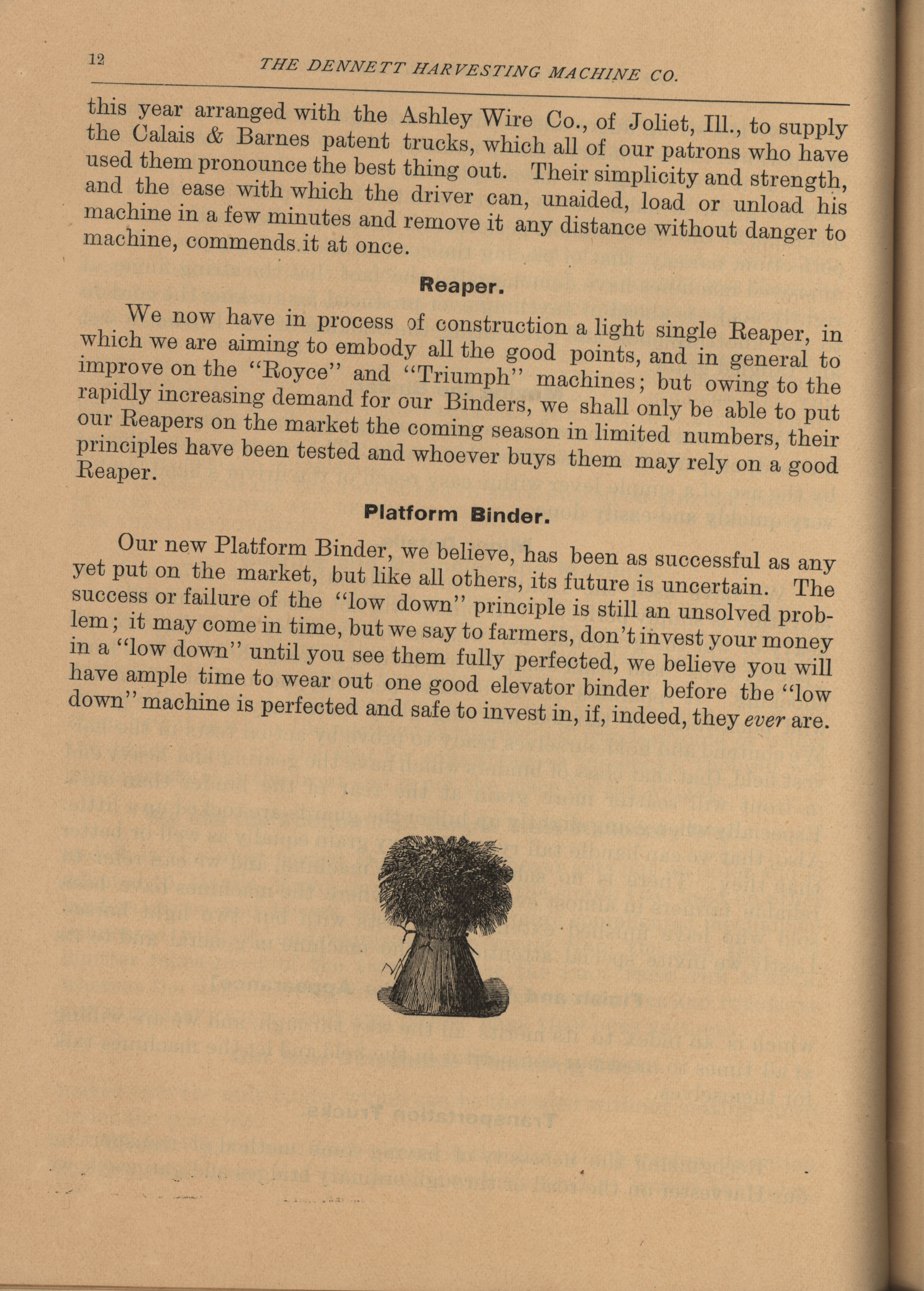 - Illustrated catalog describing the twine binders, harvesters, light mowers and reapers offered by Dennett Harvesting Machine Company, including a history of the company.