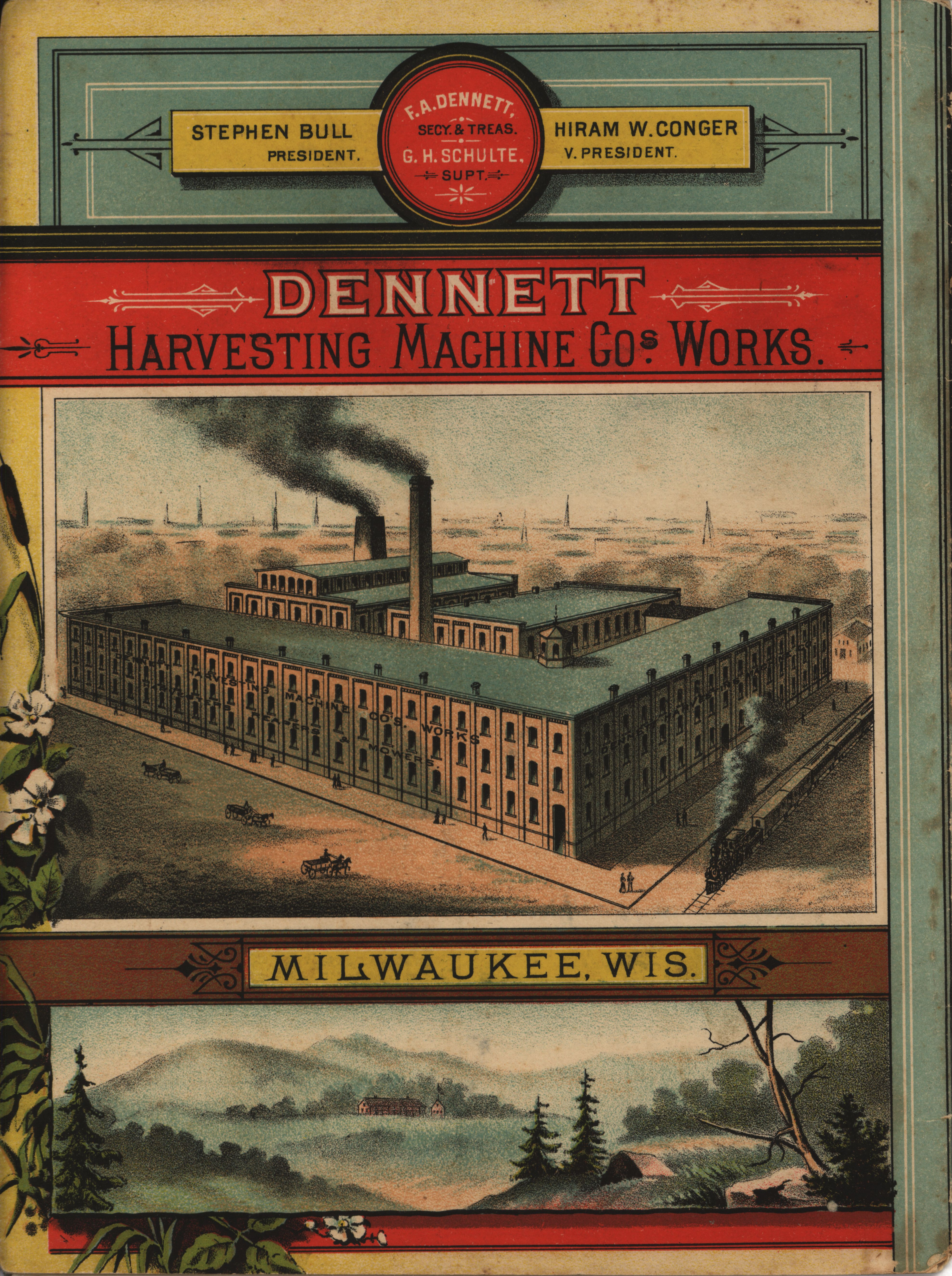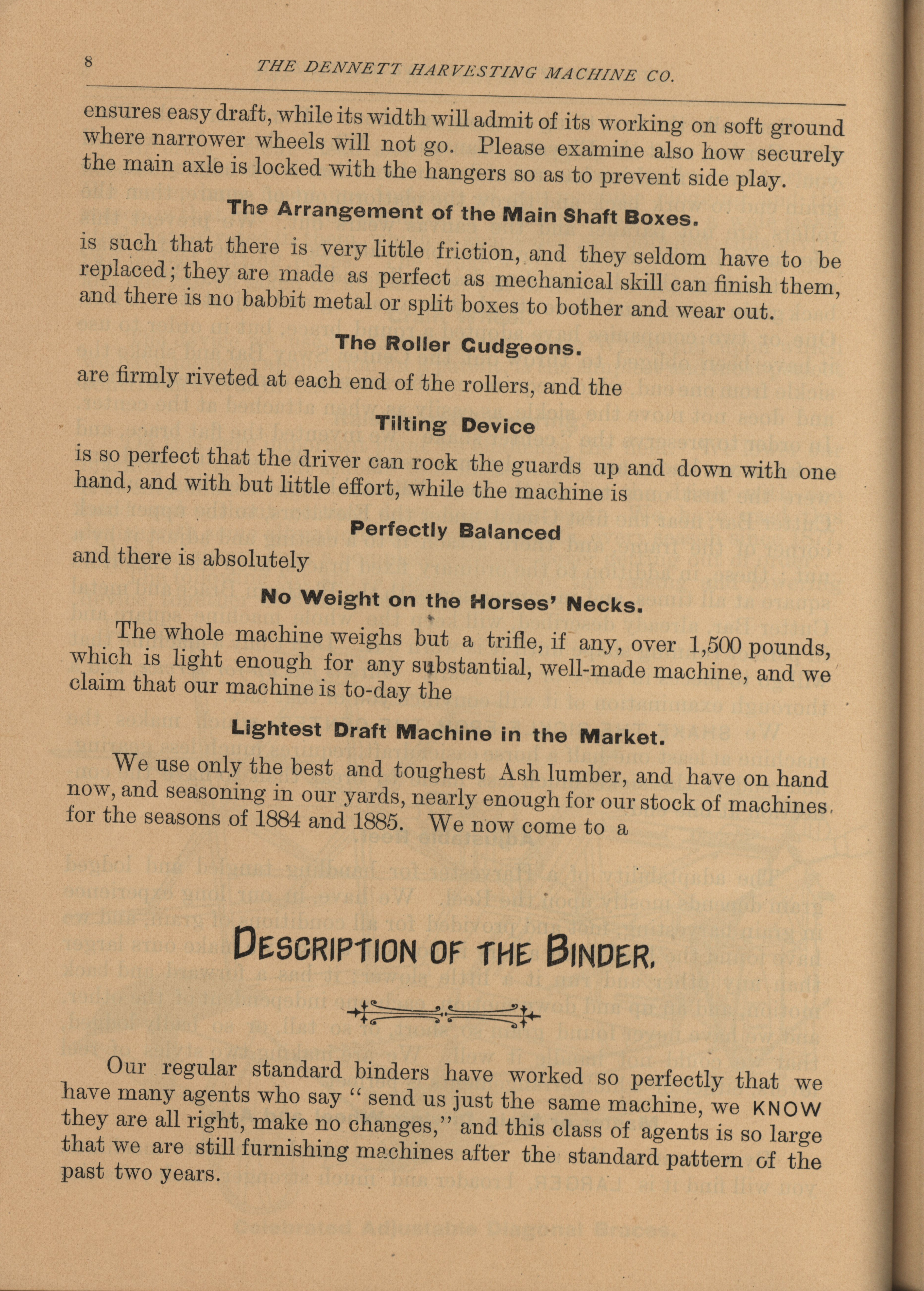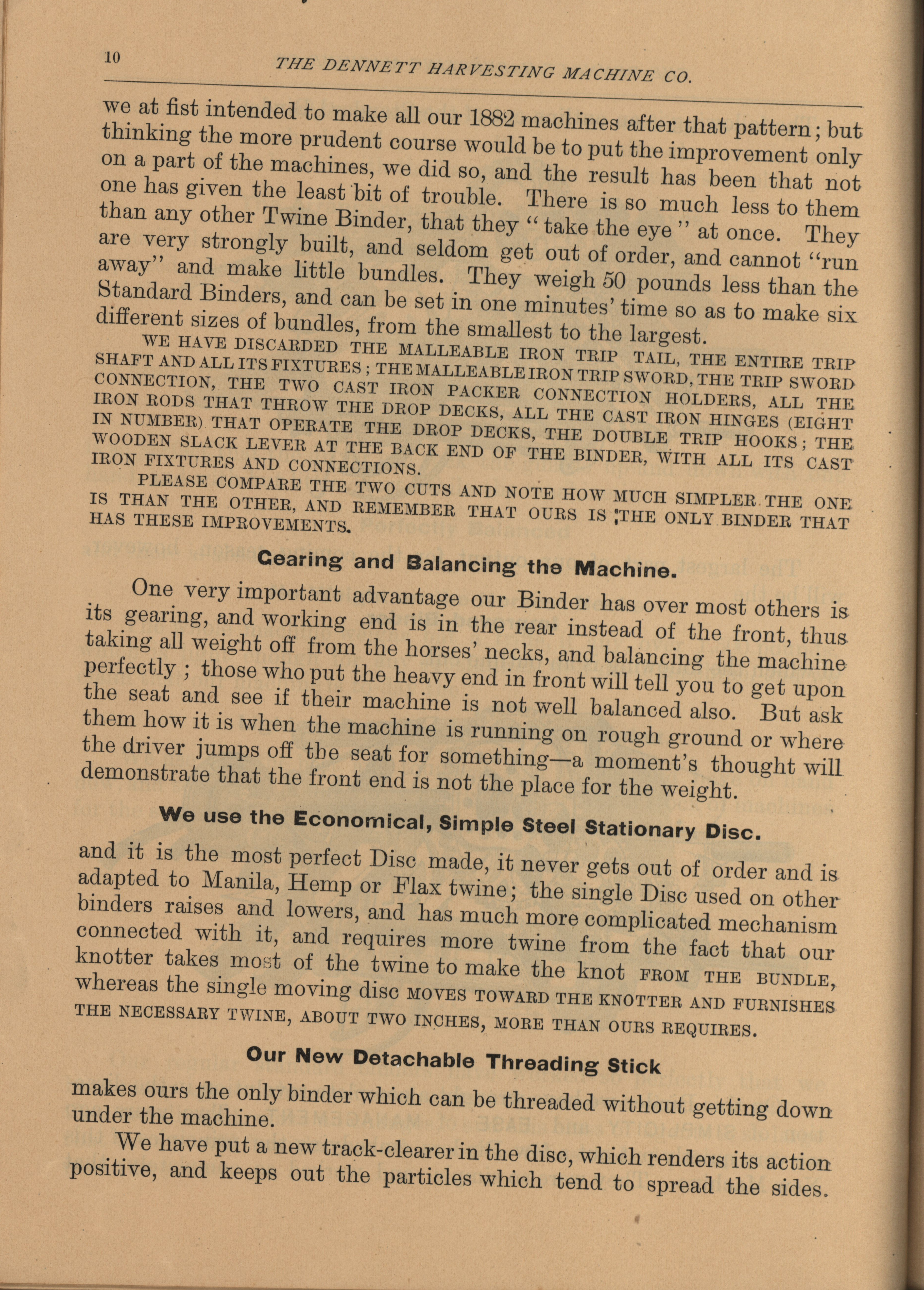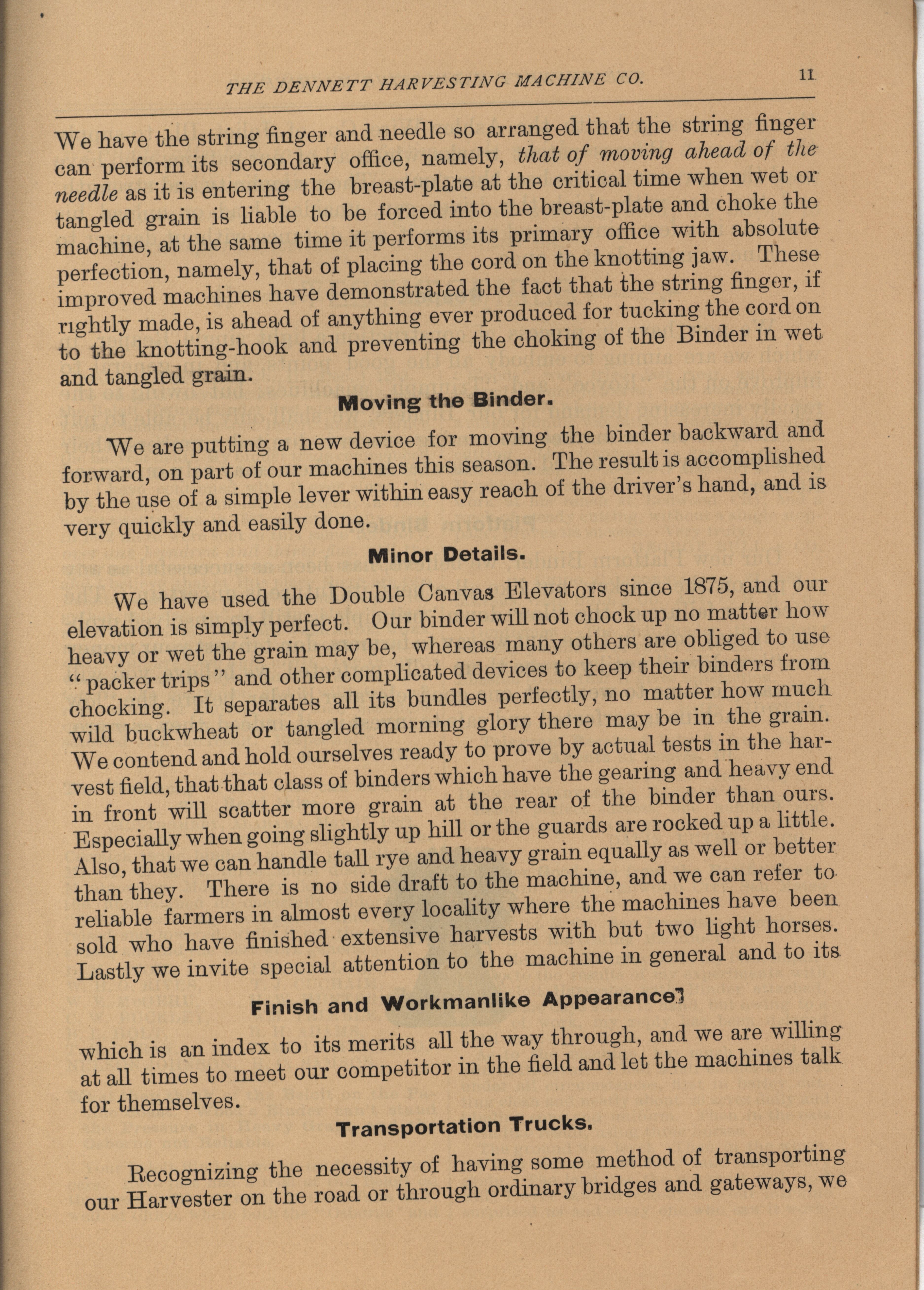 - Illustrated catalog describing the twine binders, harvesters, light mowers and reapers offered by Dennett Harvesting Machine Company, including a history of the company.