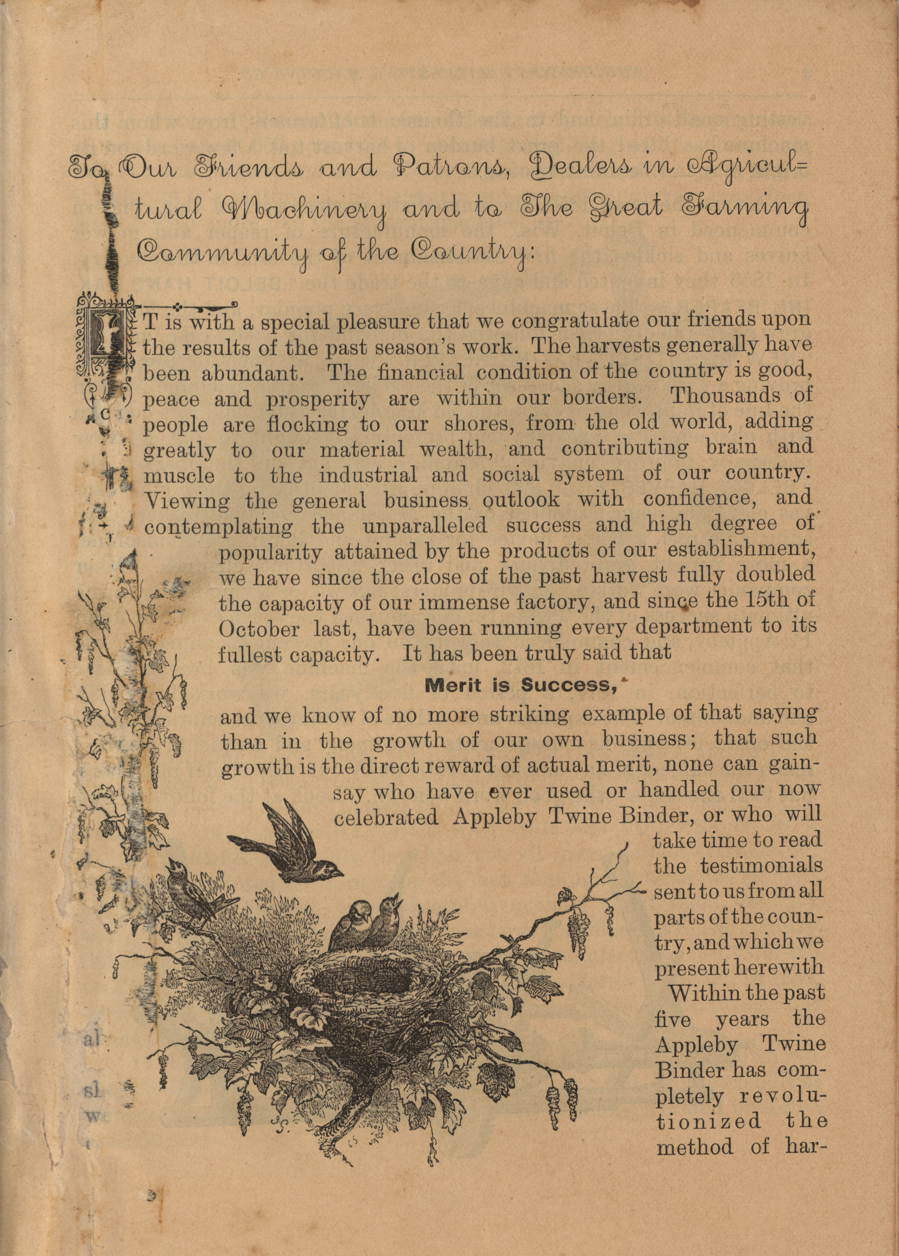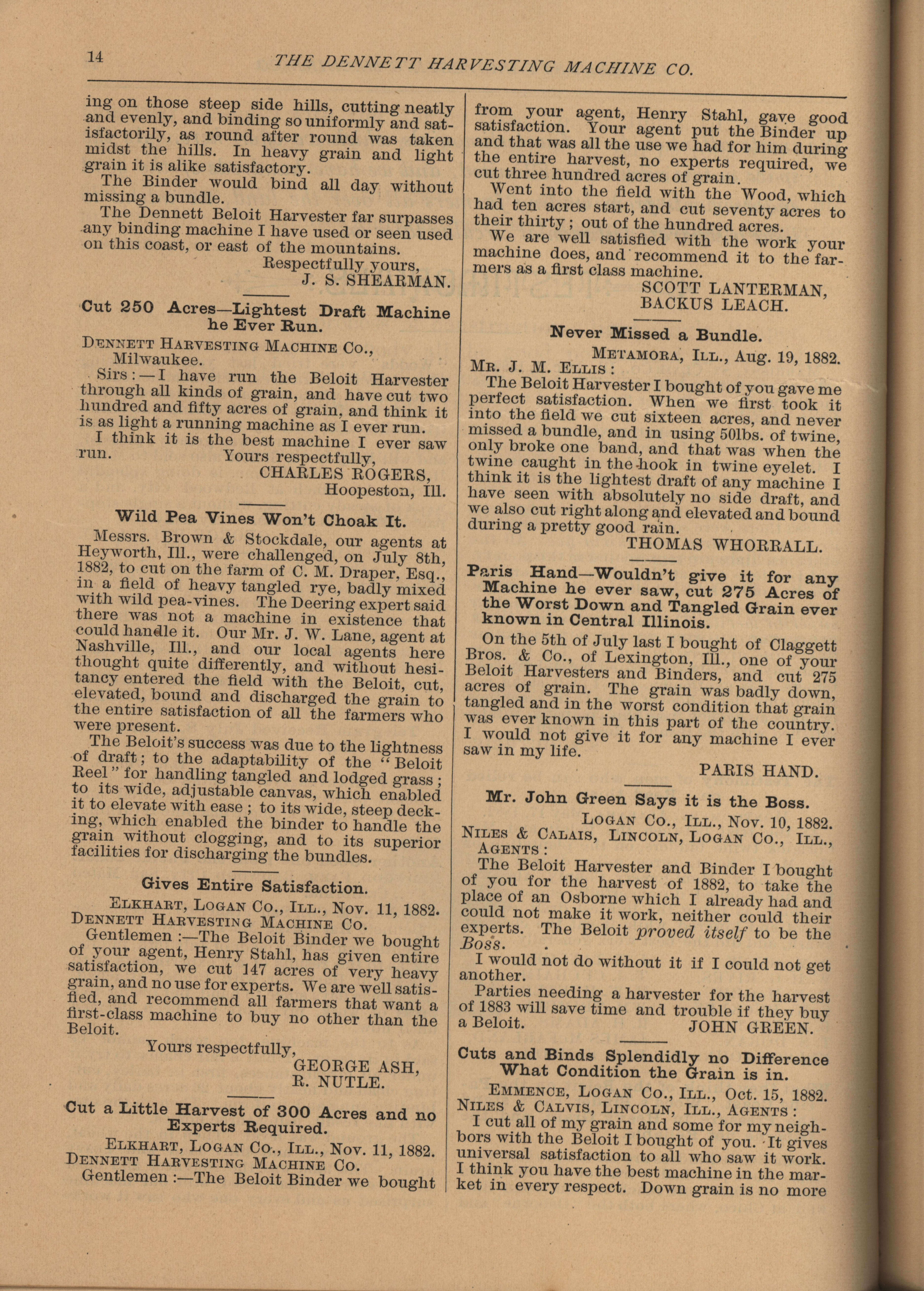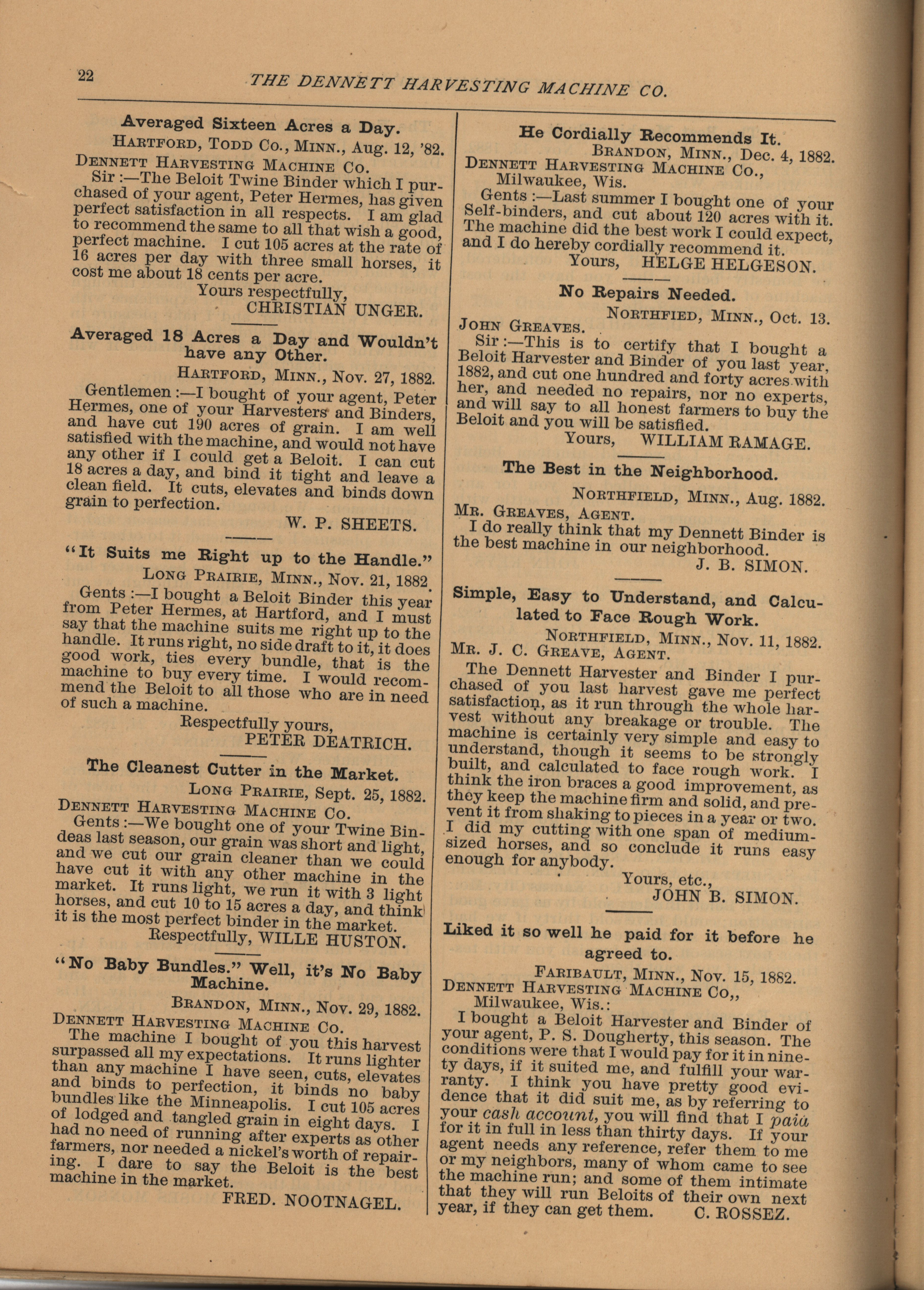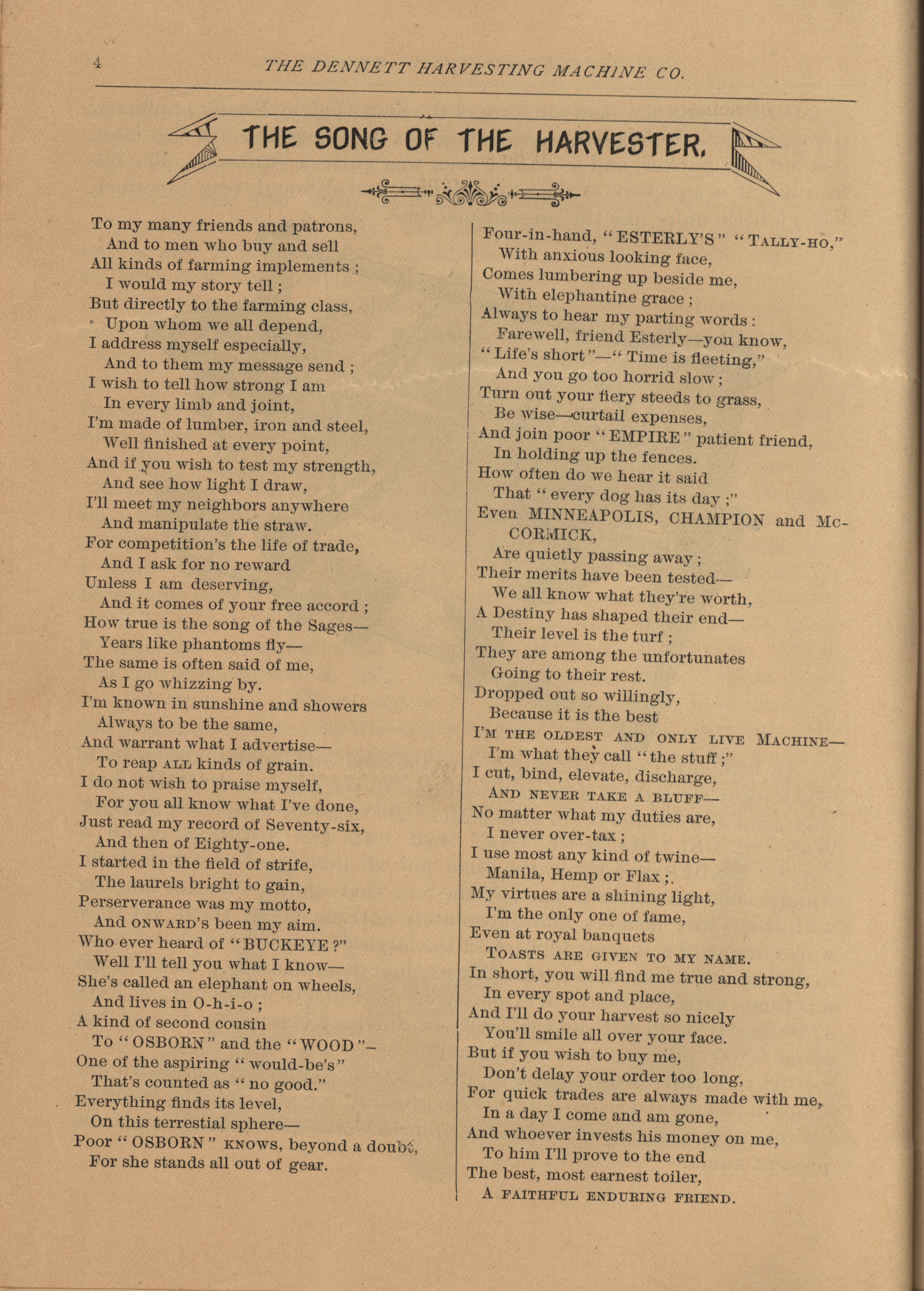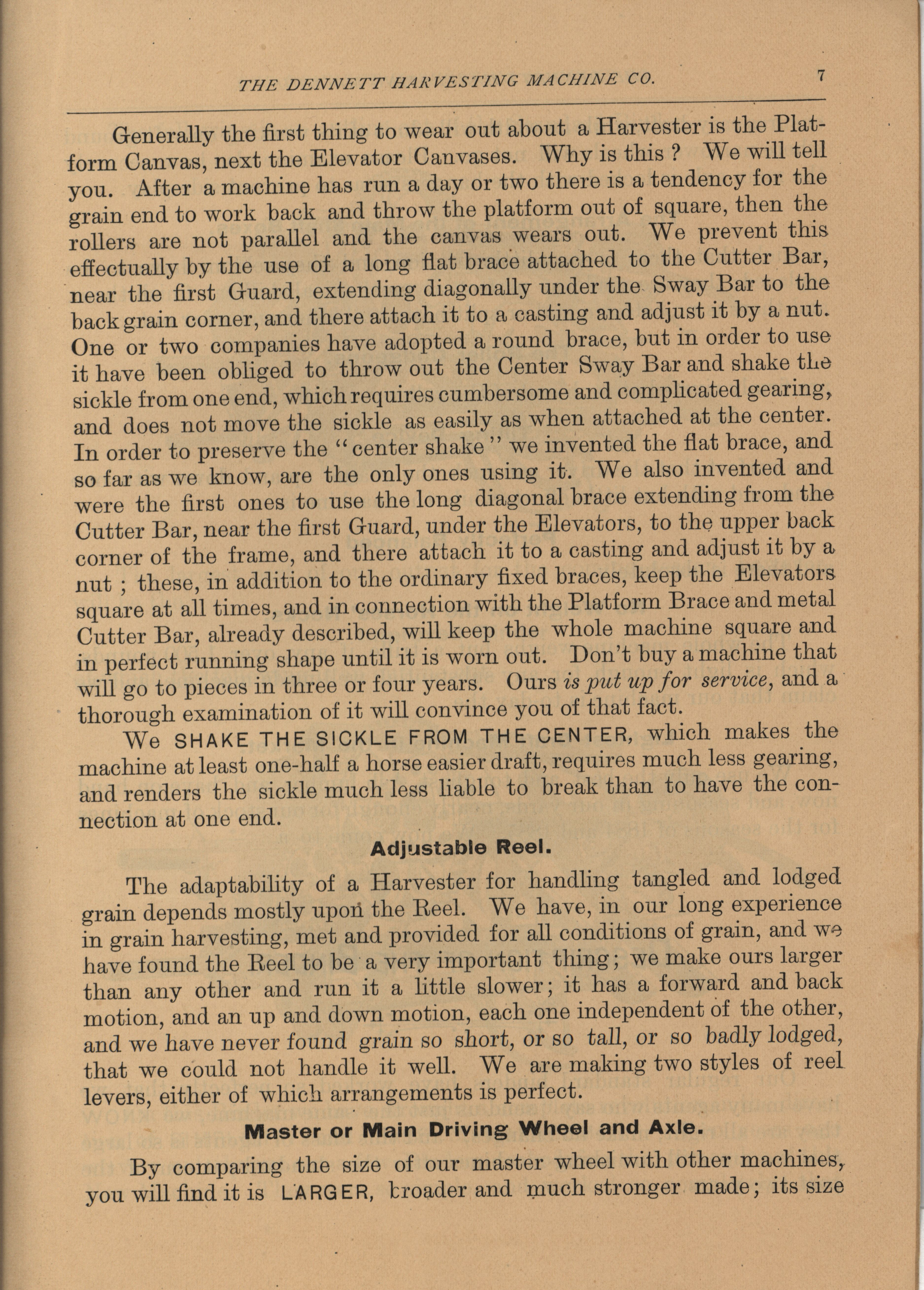 - Illustrated catalog describing the twine binders, harvesters, light mowers and reapers offered by Dennett Harvesting Machine Company, including a history of the company.