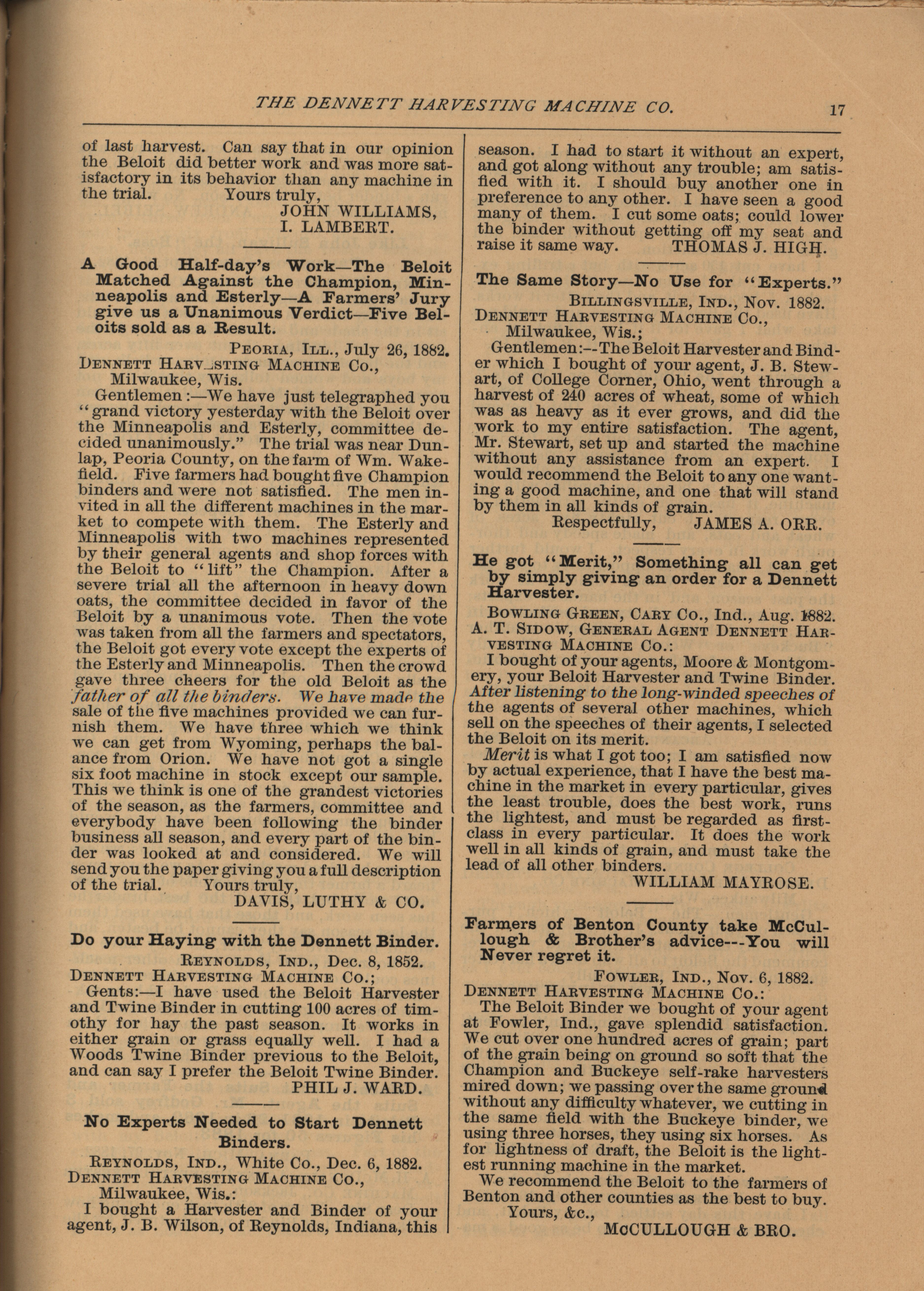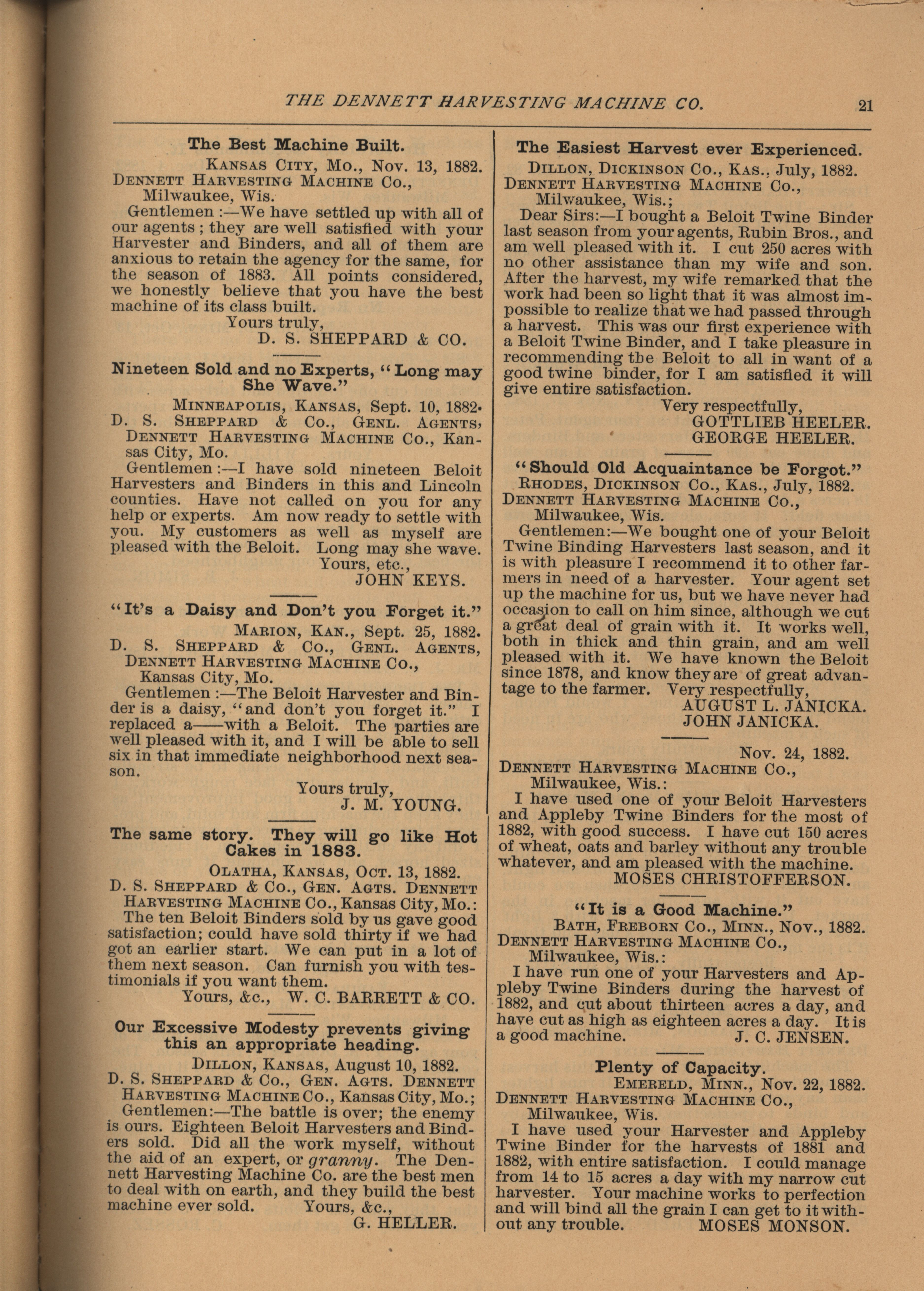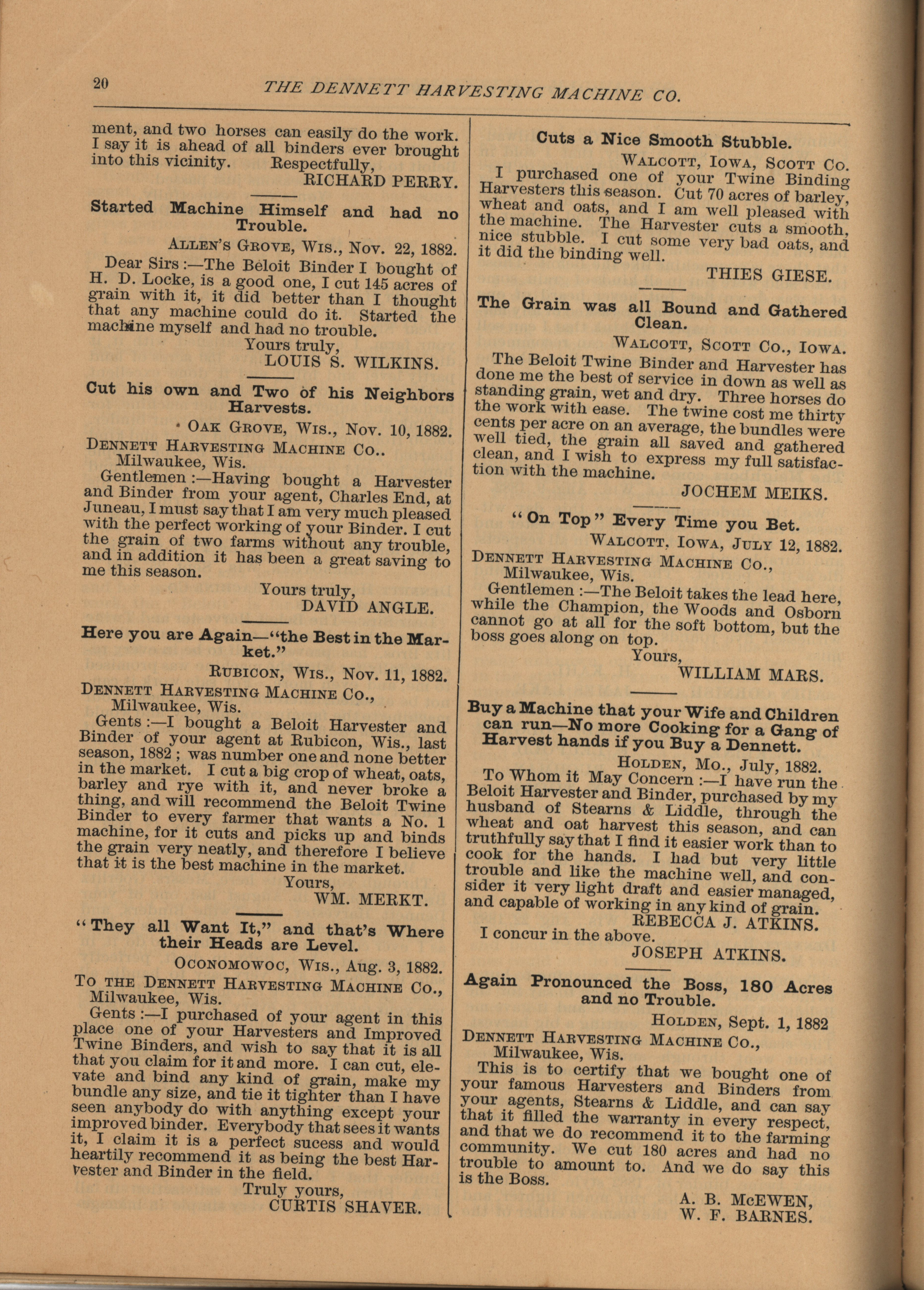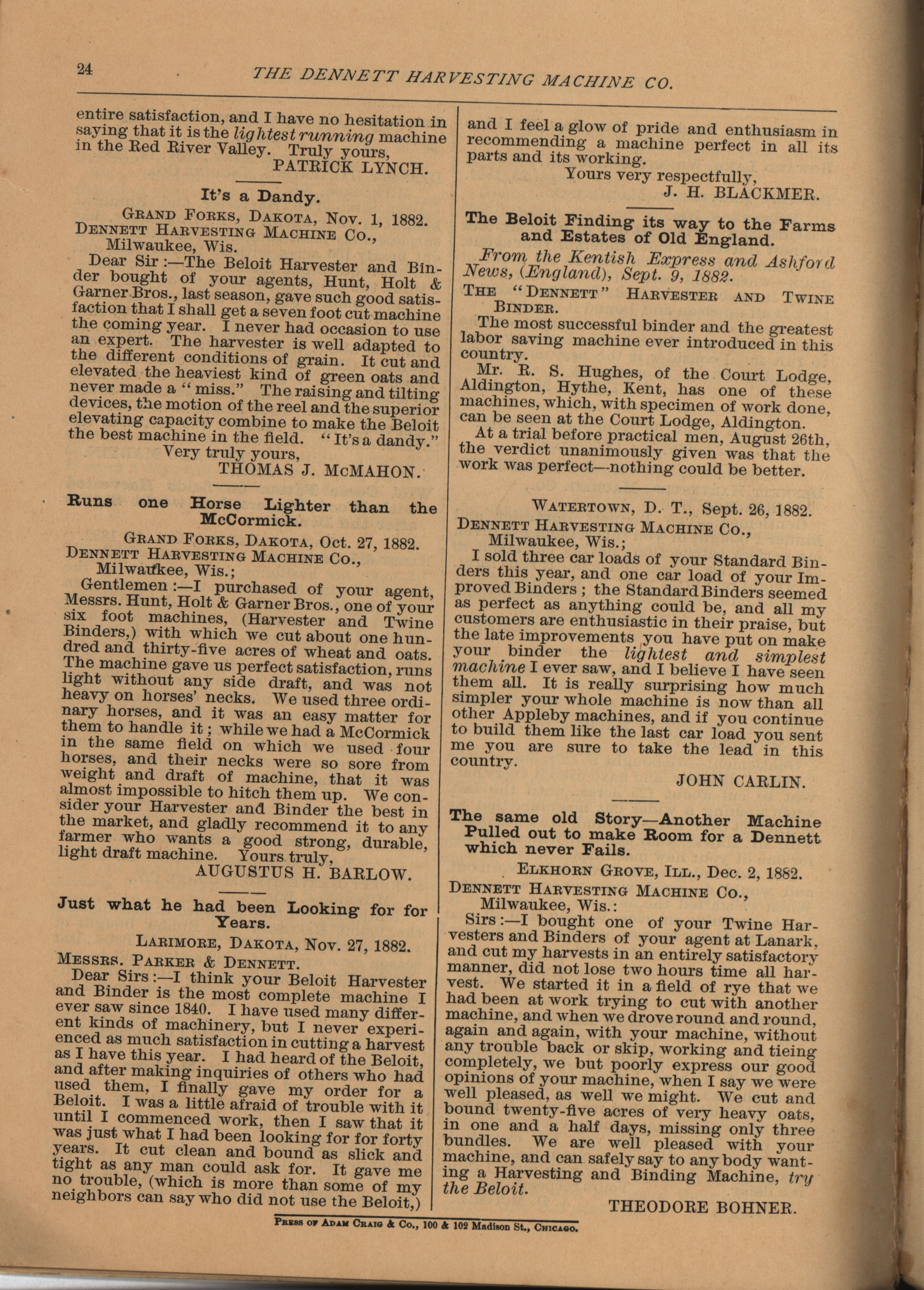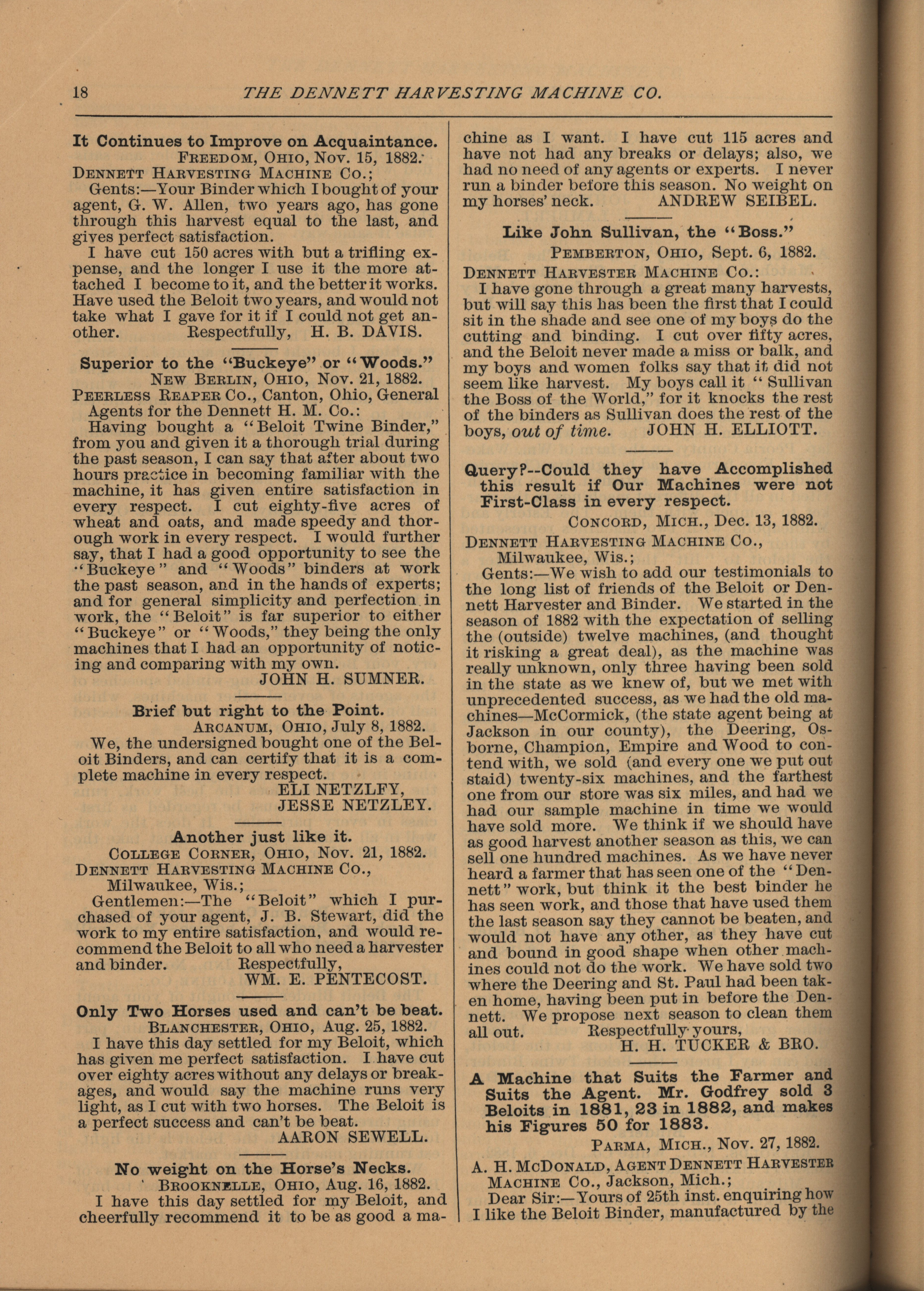 - "Dennett Harvesting Machine Company twine binders, harvesters, light mowers, and reapers catalog", Agricultural Machinery Literature Collection, Iowa State University Library Digital Collections