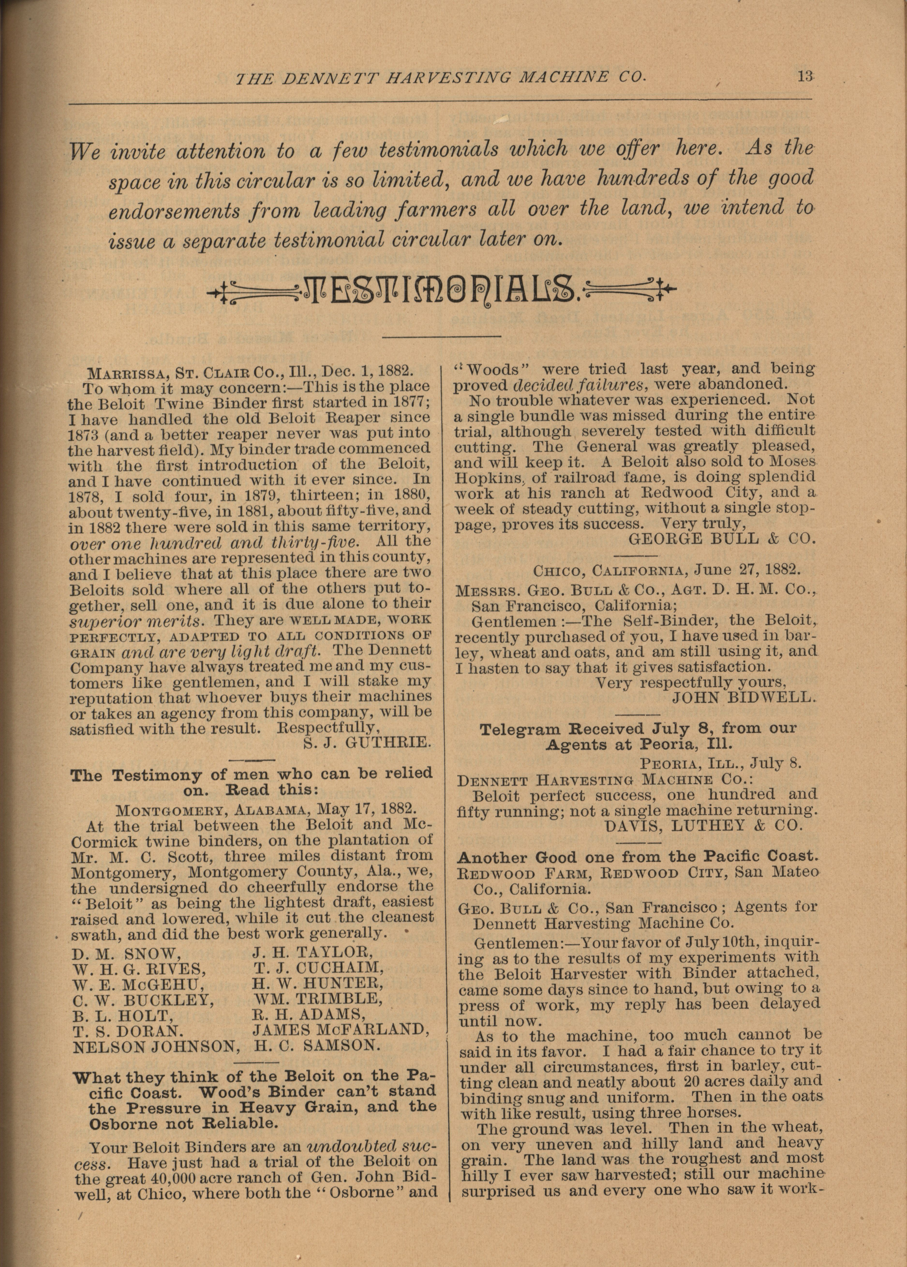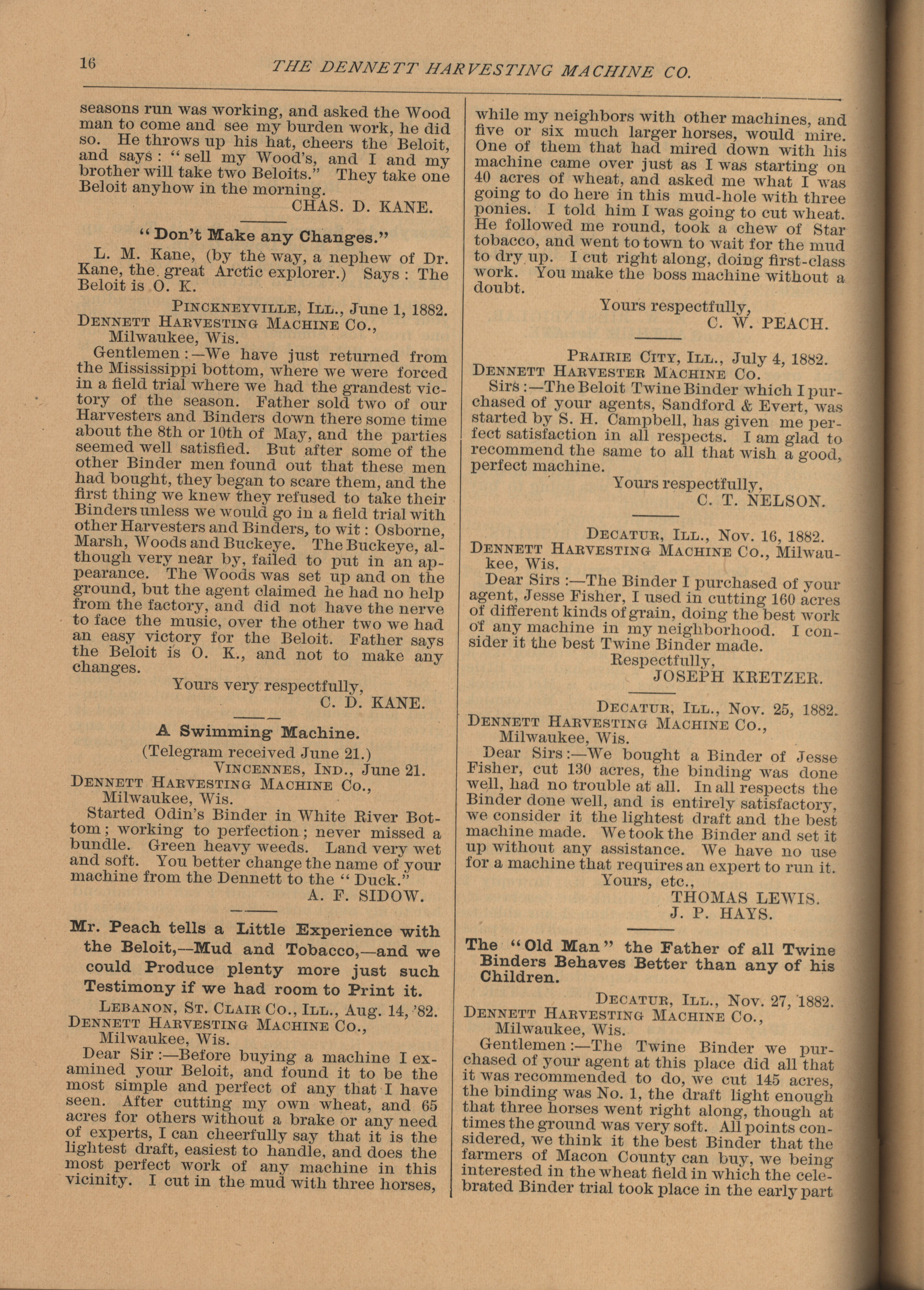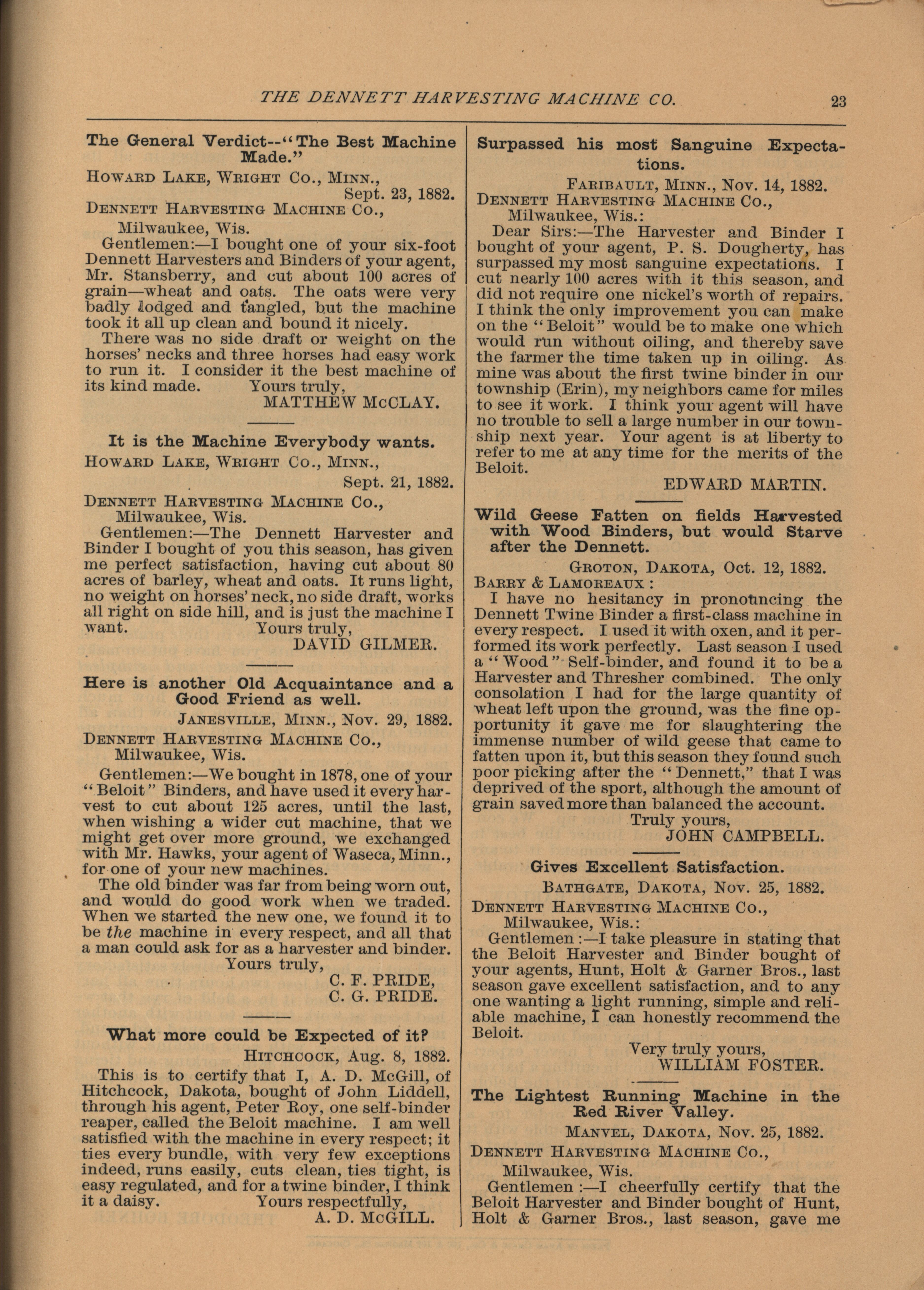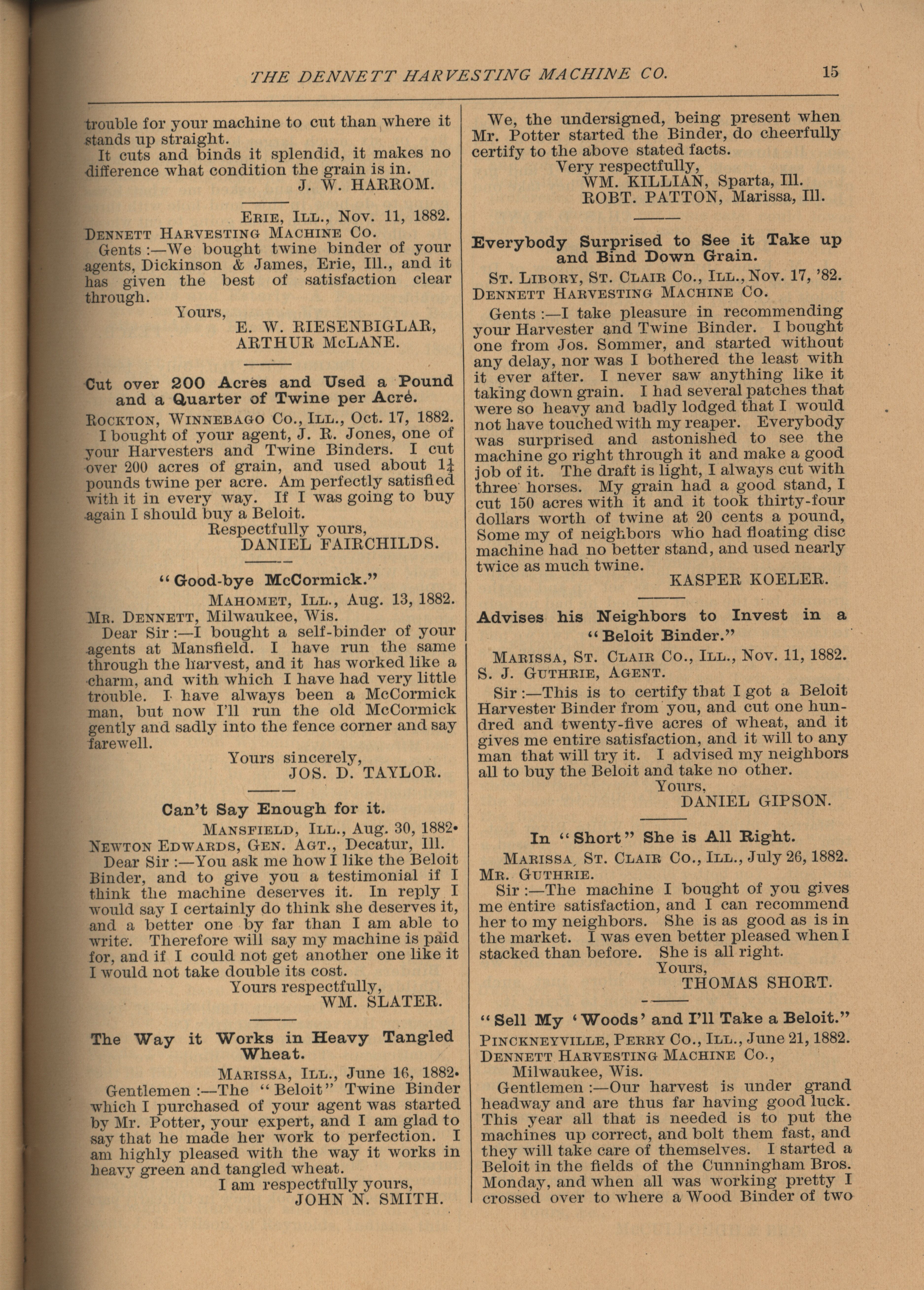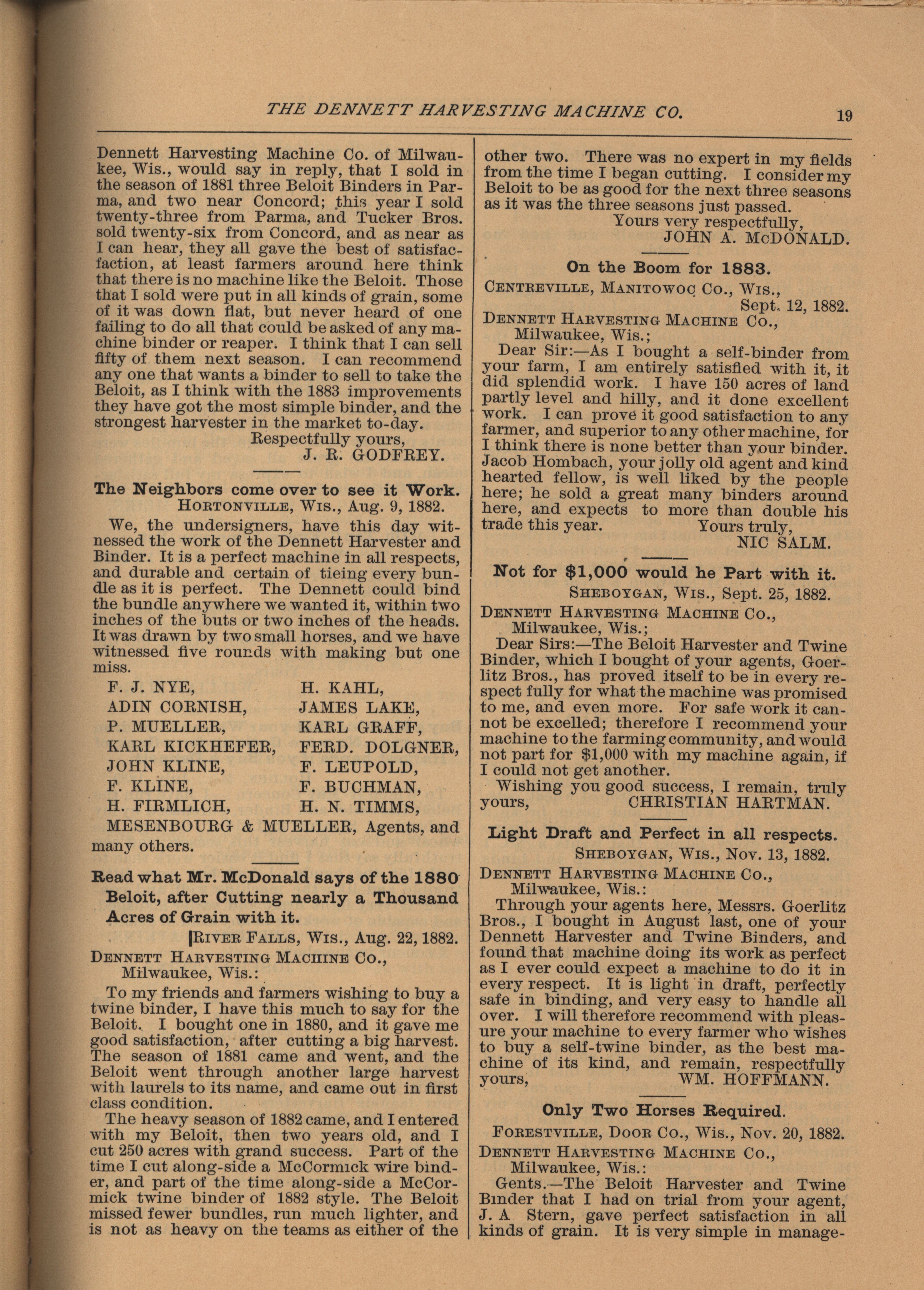 - "Dennett Harvesting Machine Company twine binders, harvesters, light mowers, and reapers catalog", Agricultural Machinery Literature Collection, Iowa State University Library Digital Collections
