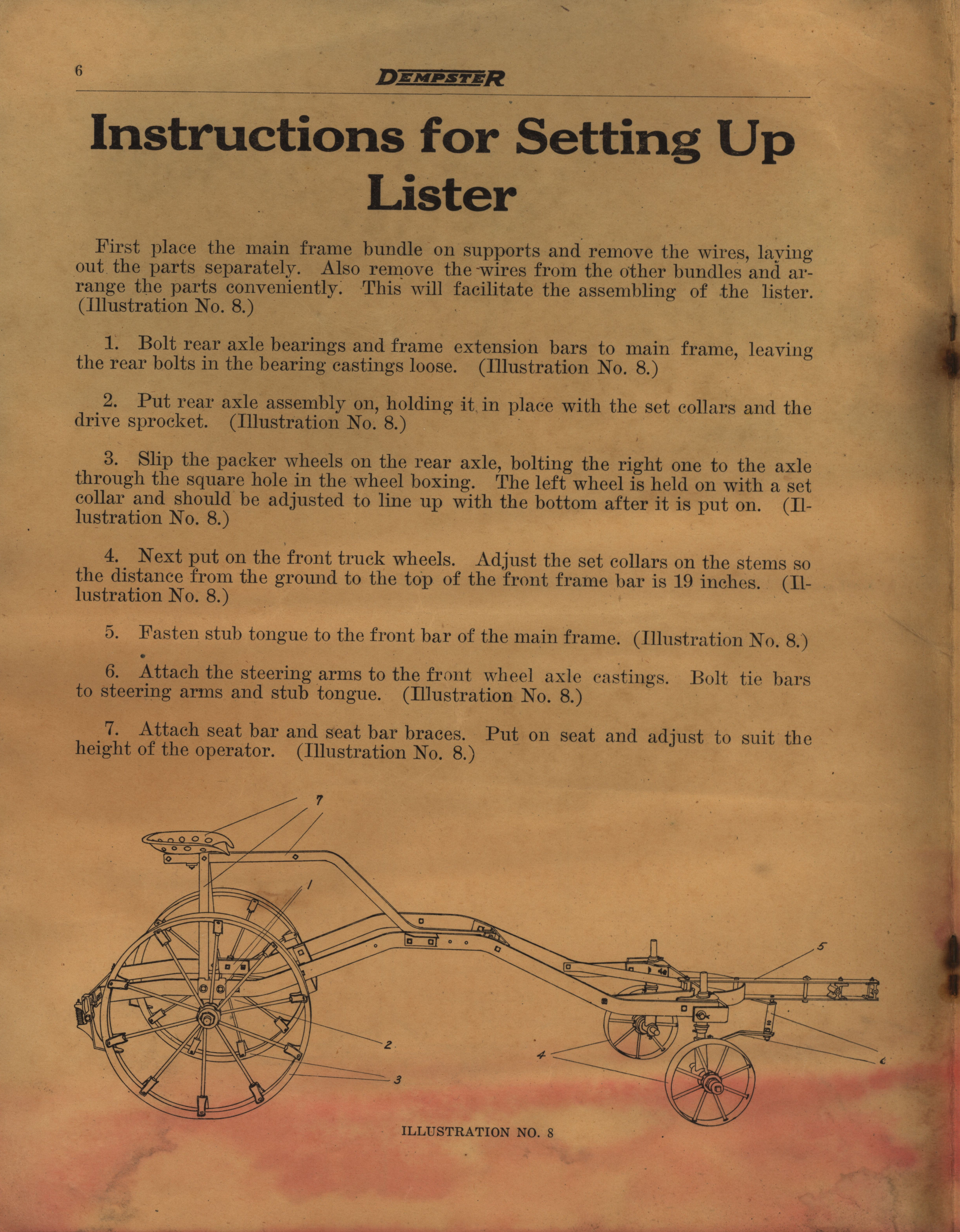- Illustrated instructions for setting up and operating the cultivators and listers offered by Dempster Mill Manufacturing Company.