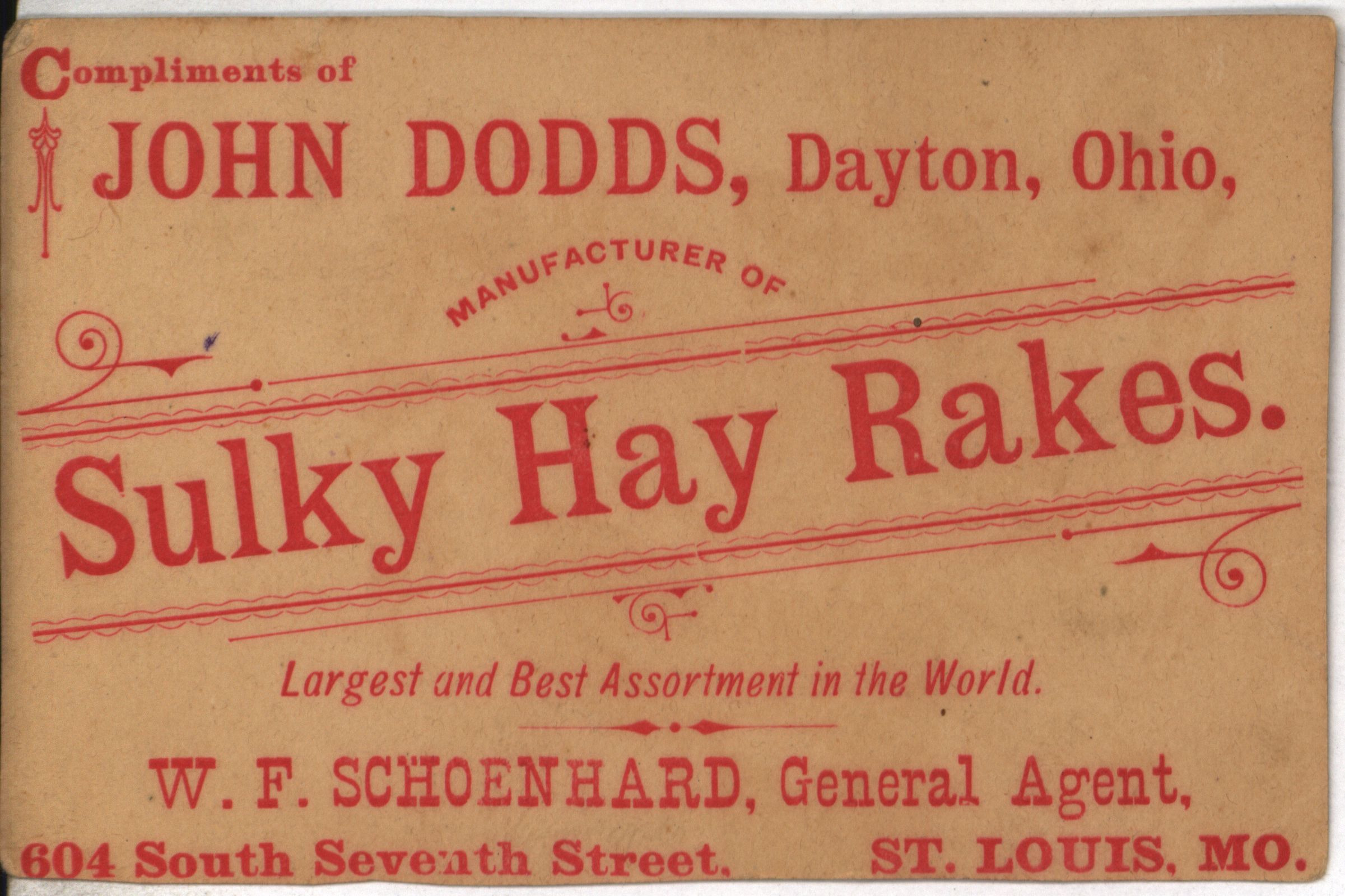 - "John Dodds Company sulky hay rakes advertisement card", Agricultural Machinery Literature Collection, Iowa State University Library Digital Collections