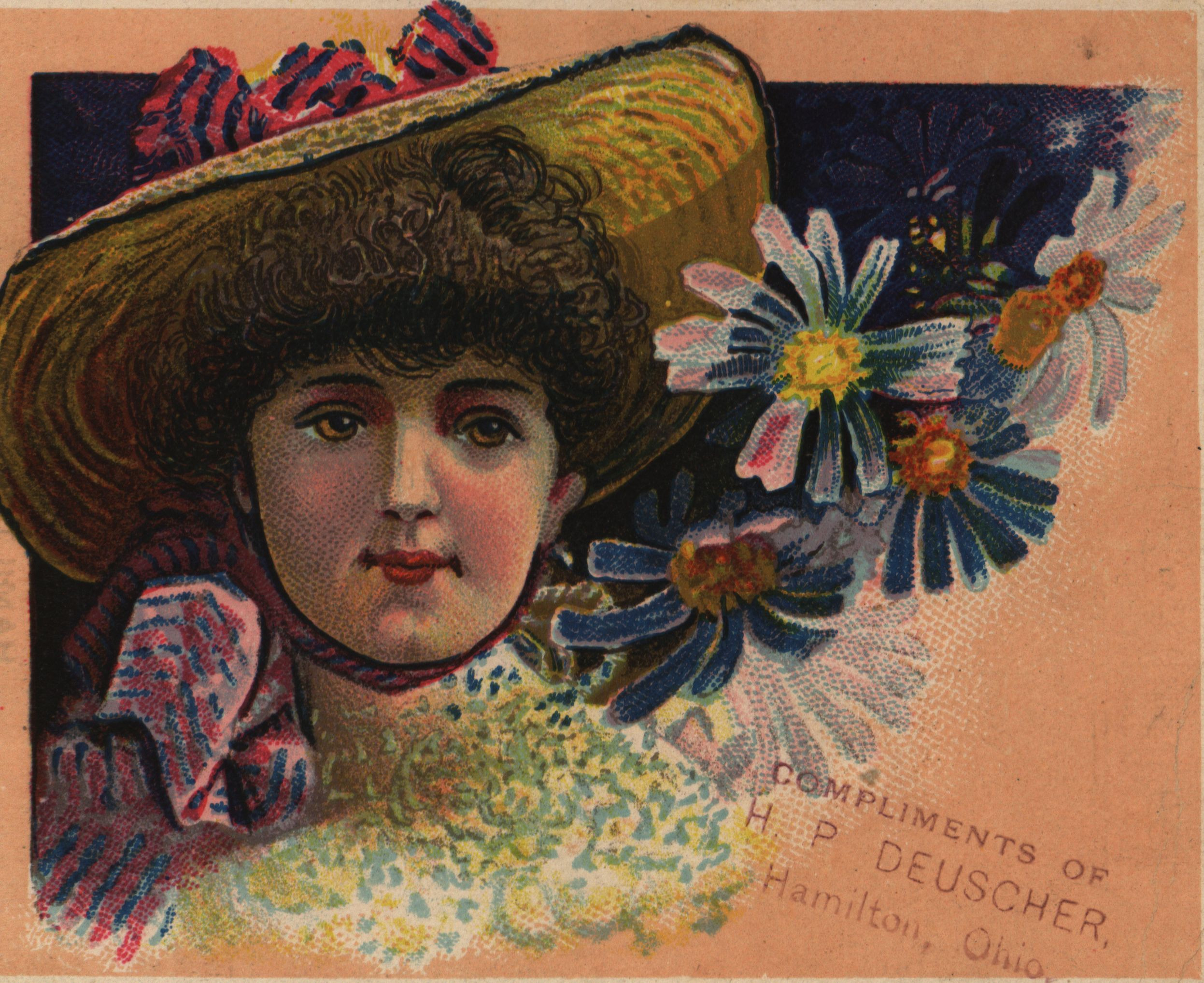 - Illustrated advertisement card for the Hamilton Corn Planter offered by H. P. Deuscher Company depicting a woman and a agricultural implement.