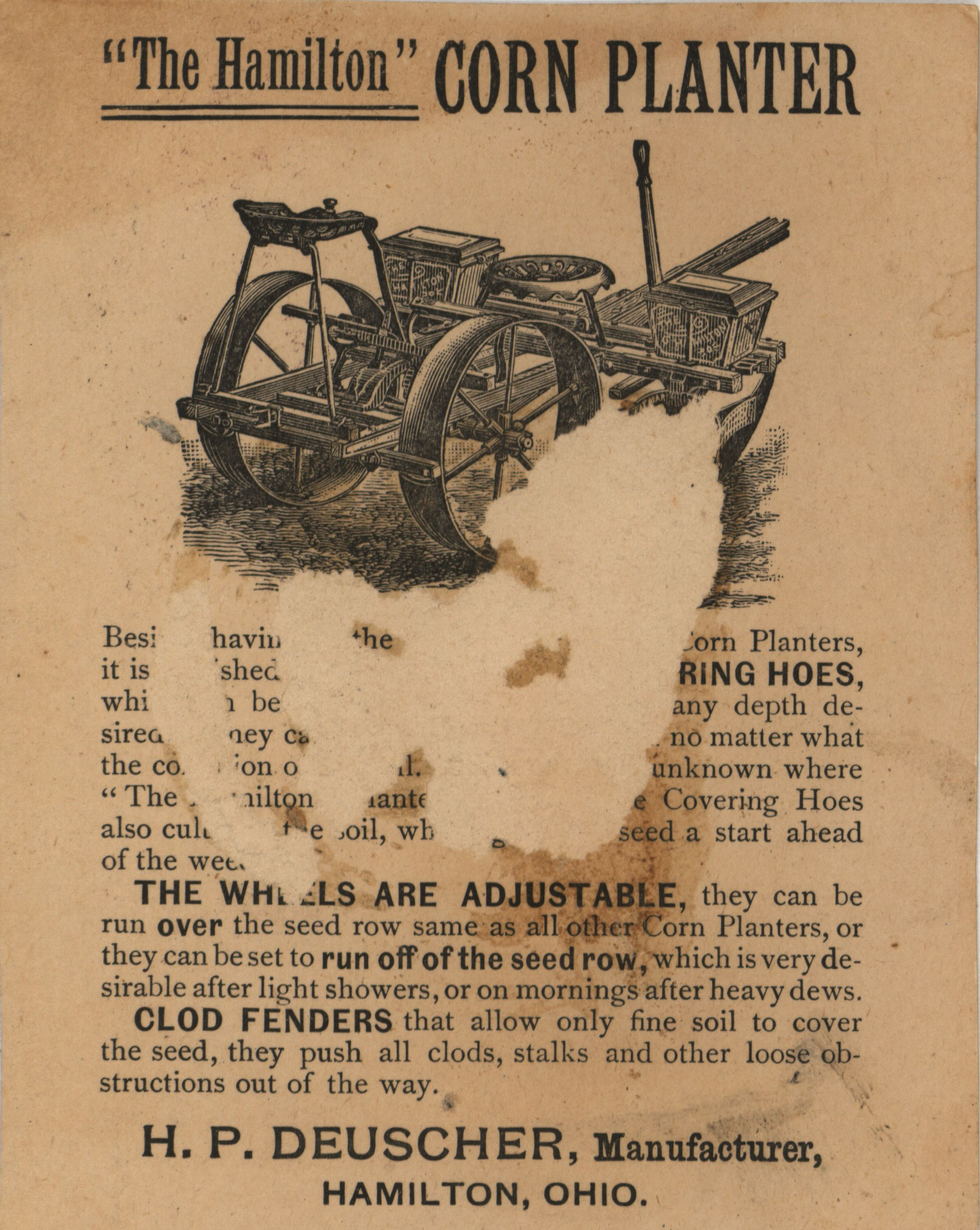 - "H. P. Deuscher Company The Hamilton Corn Planter advertisement card", Agricultural Machinery Literature Collection, Iowa State University Library Digital Collections
