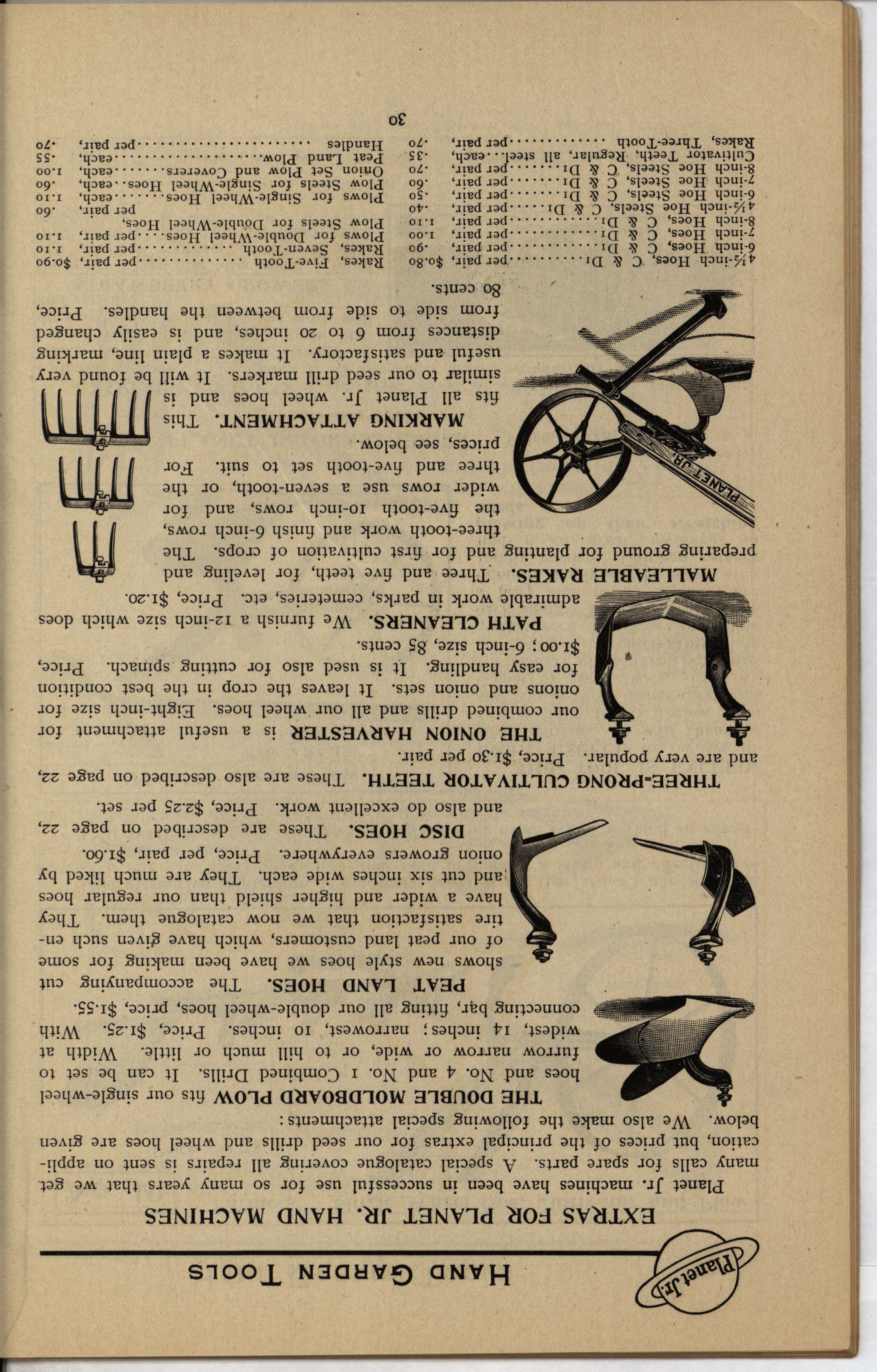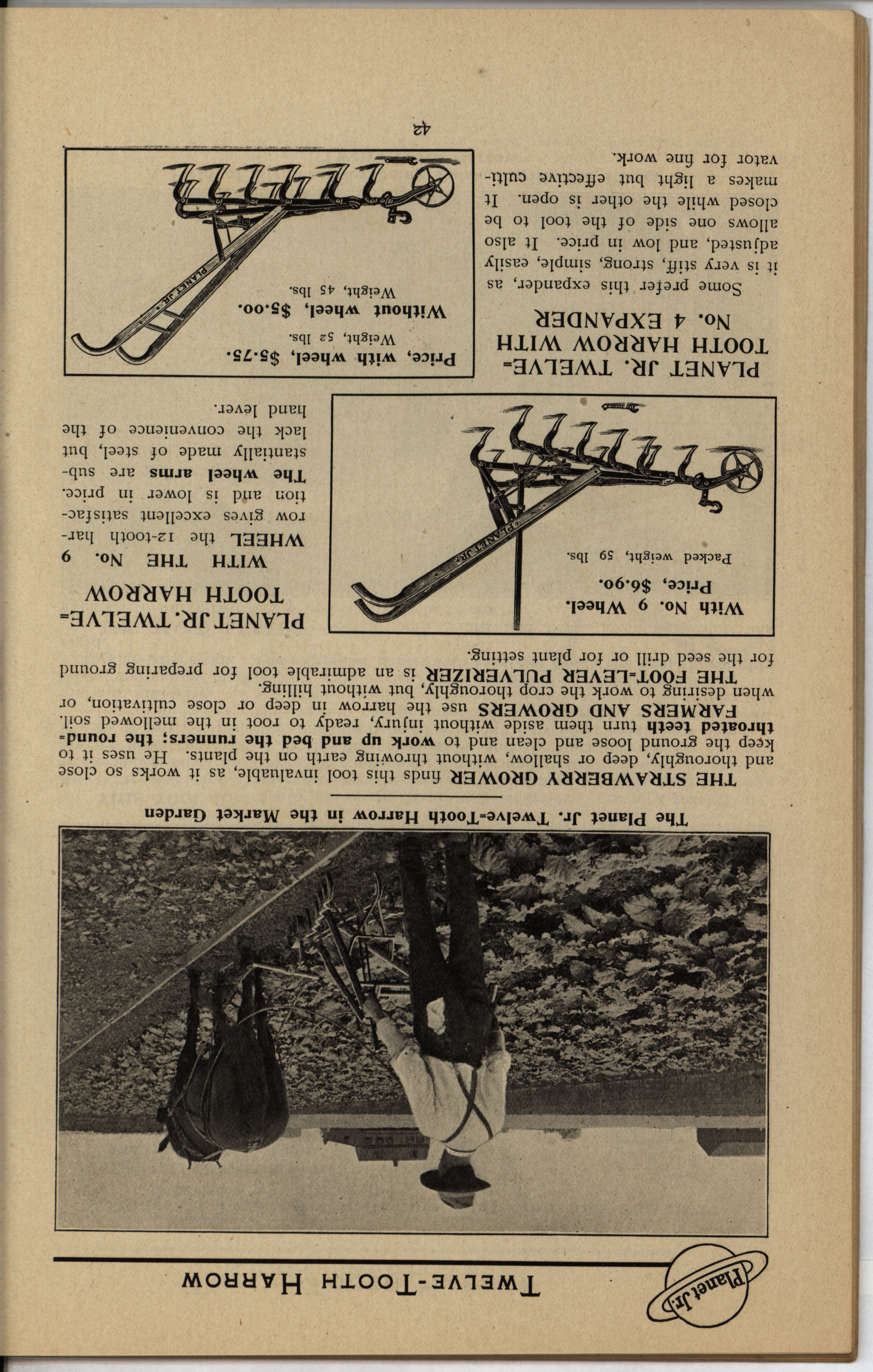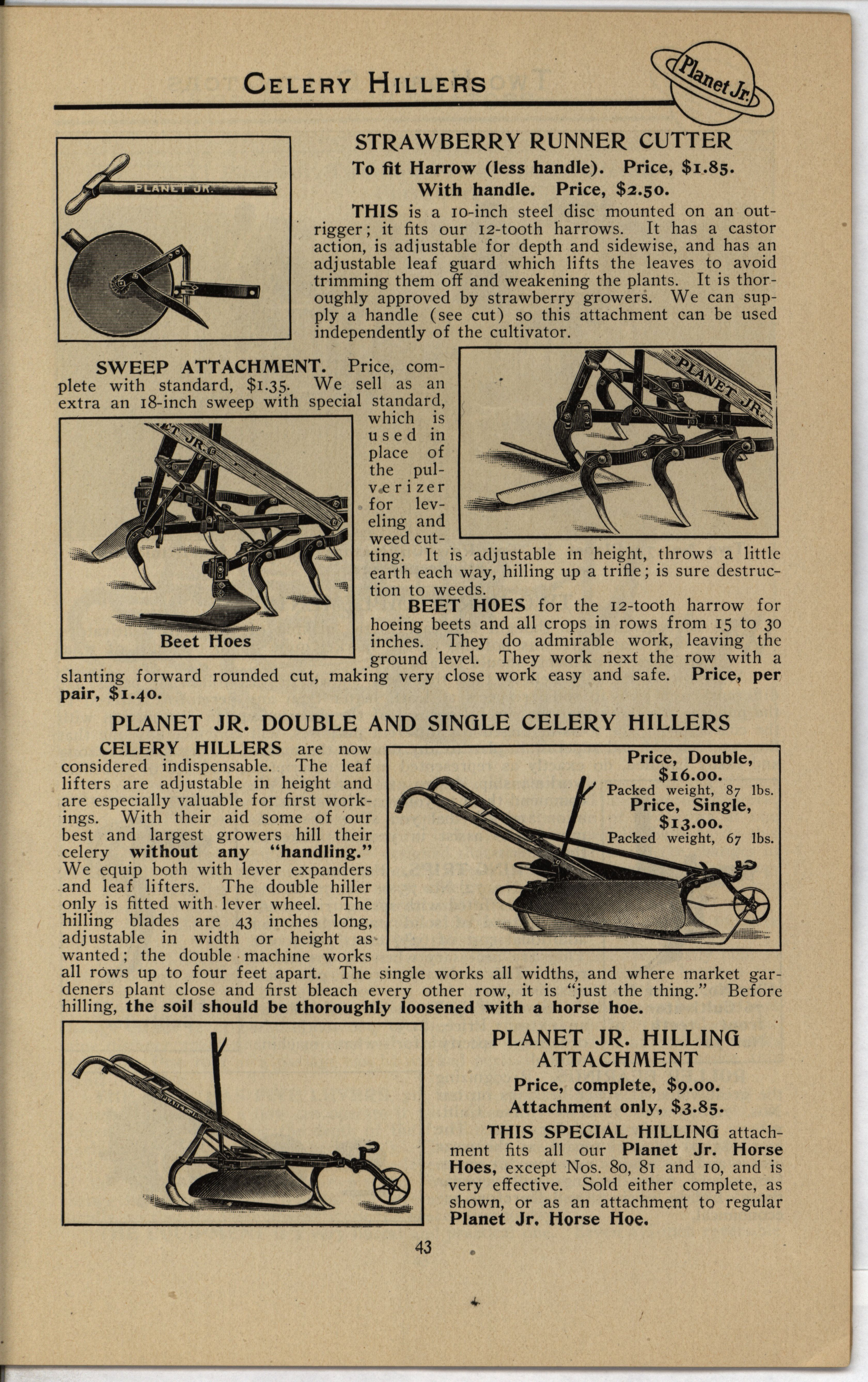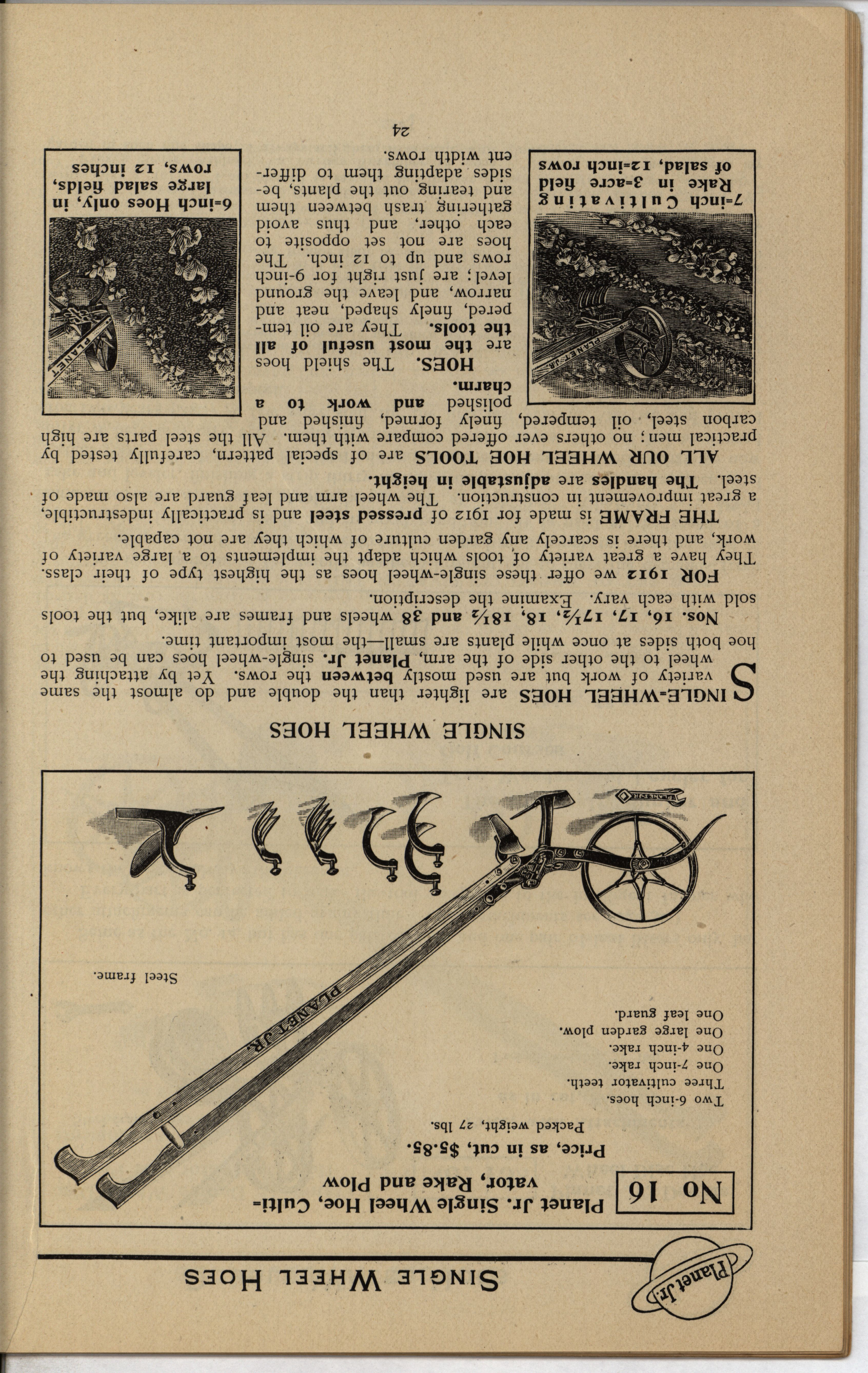 - Catalog detailing the products offered in the Planet Jr. line of farm and garden implements. Includes illustrations and price list.