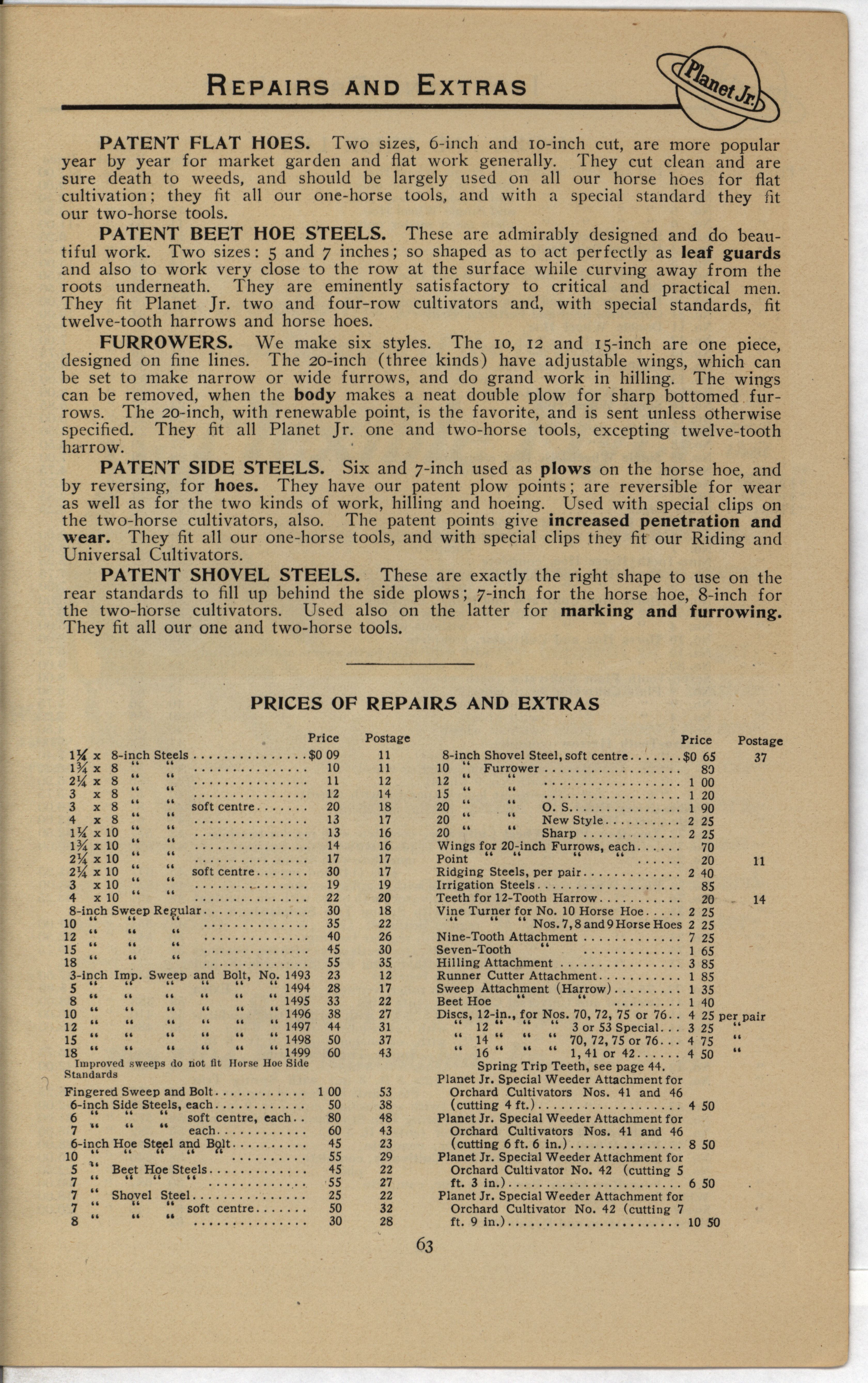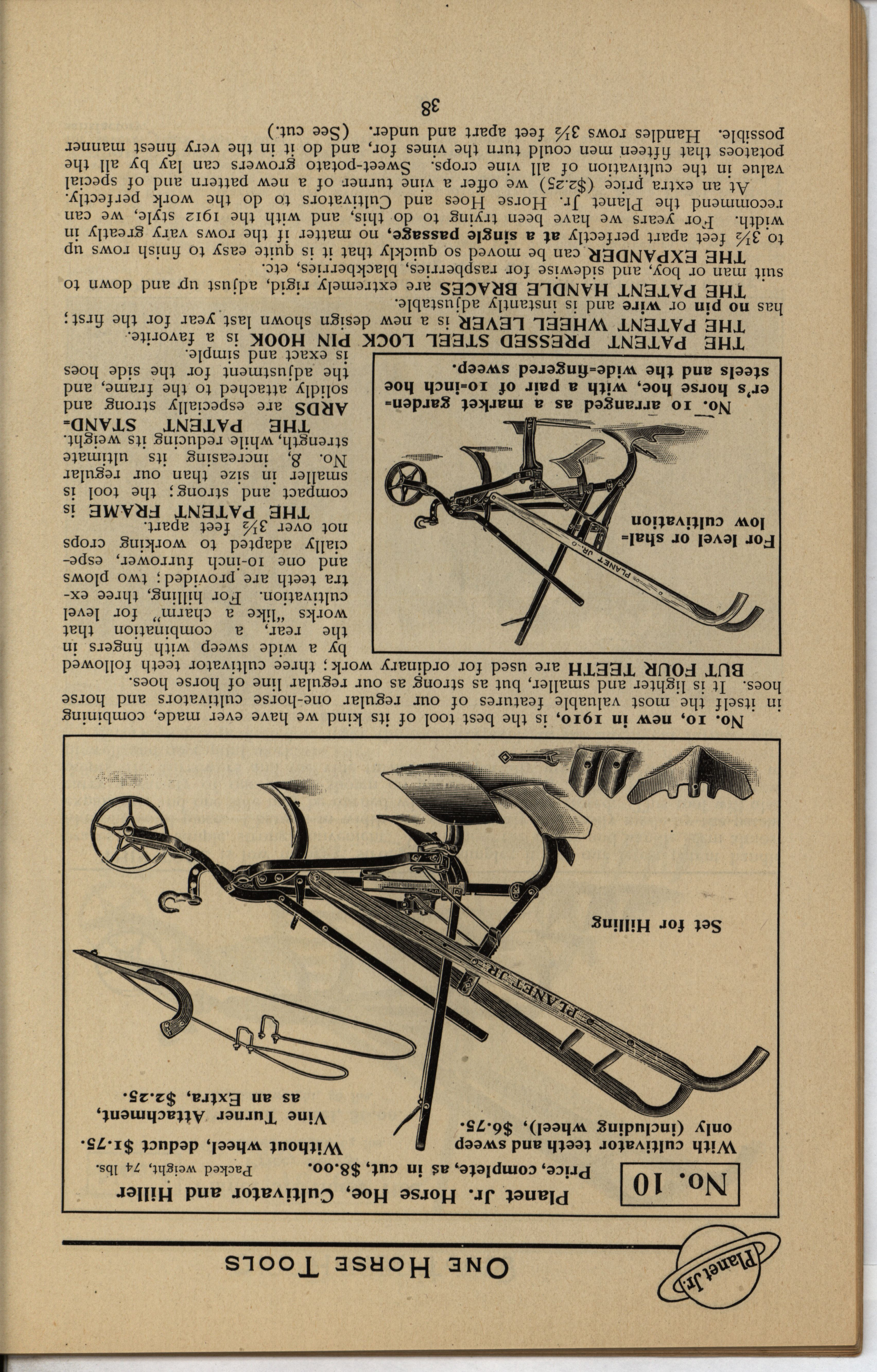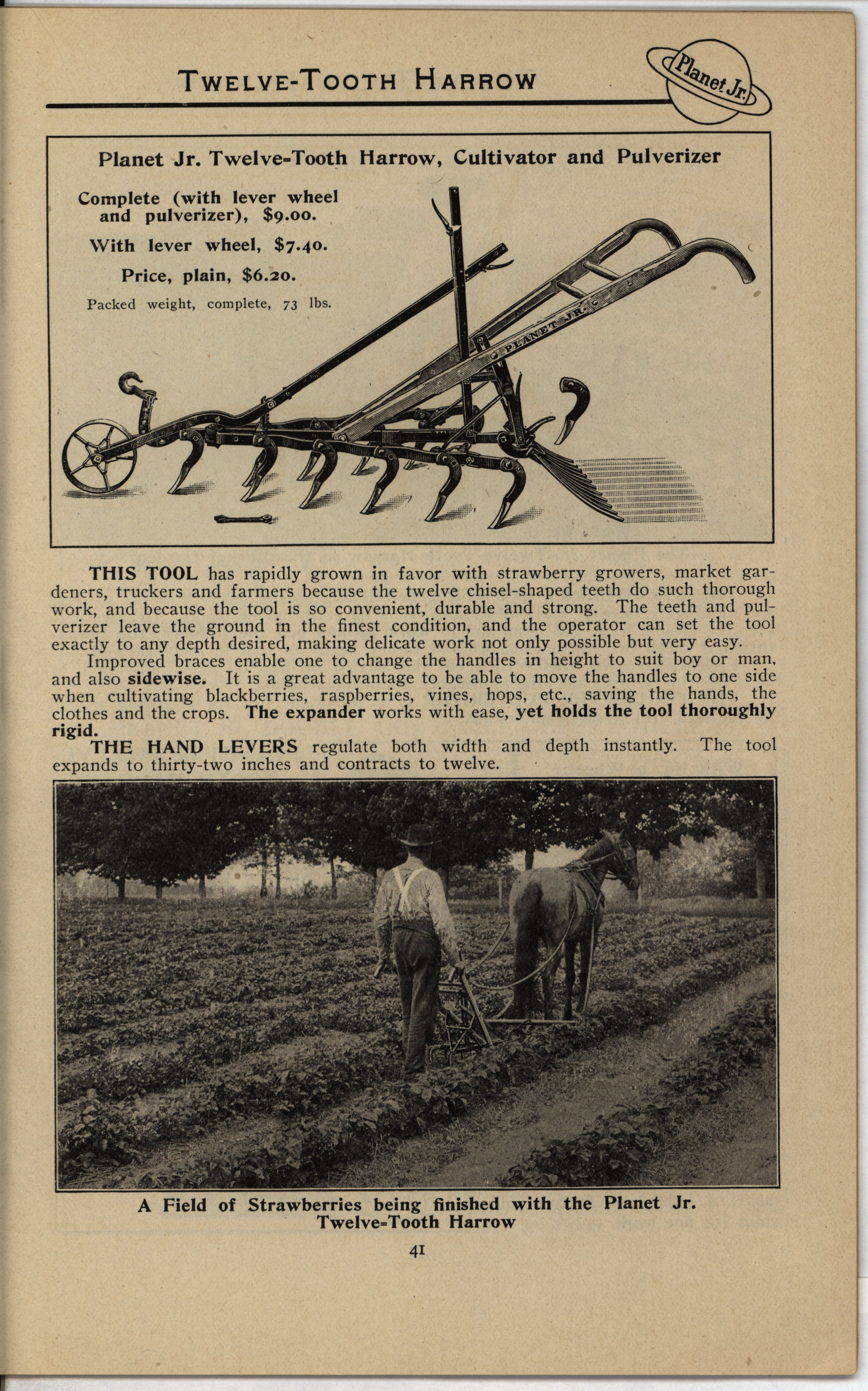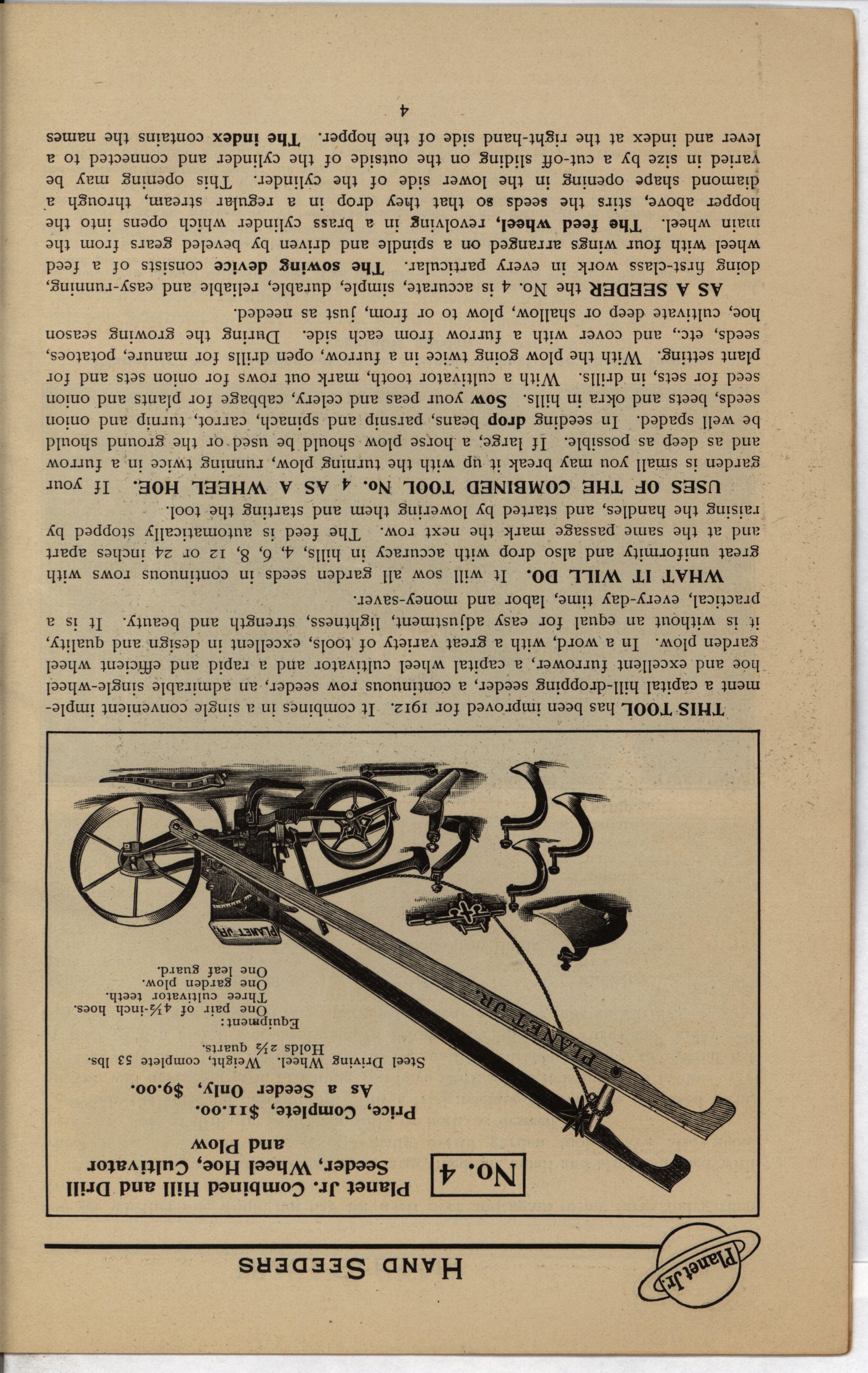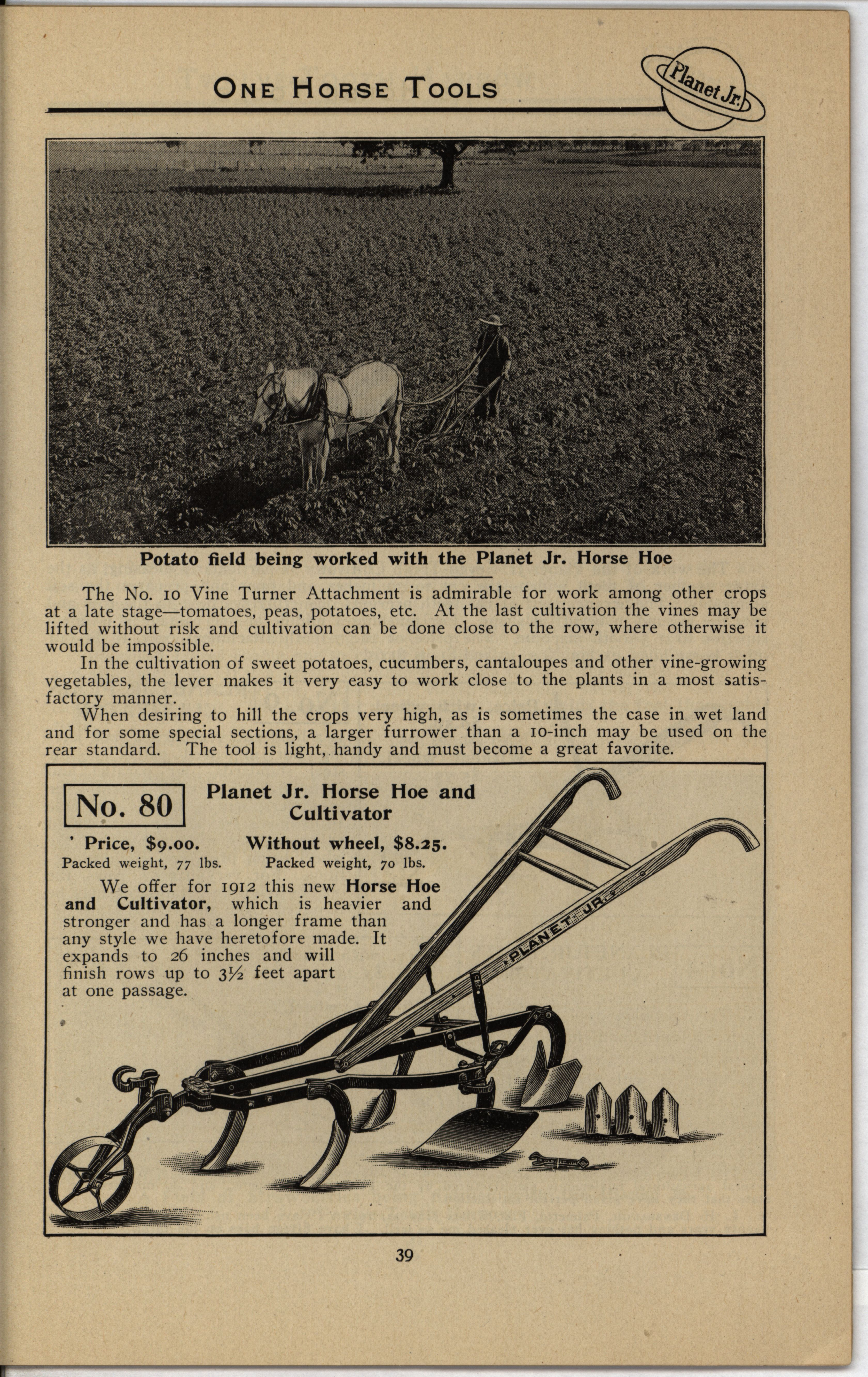 - Catalog detailing the products offered in the Planet Jr. line of farm and garden implements. Includes illustrations and price list.