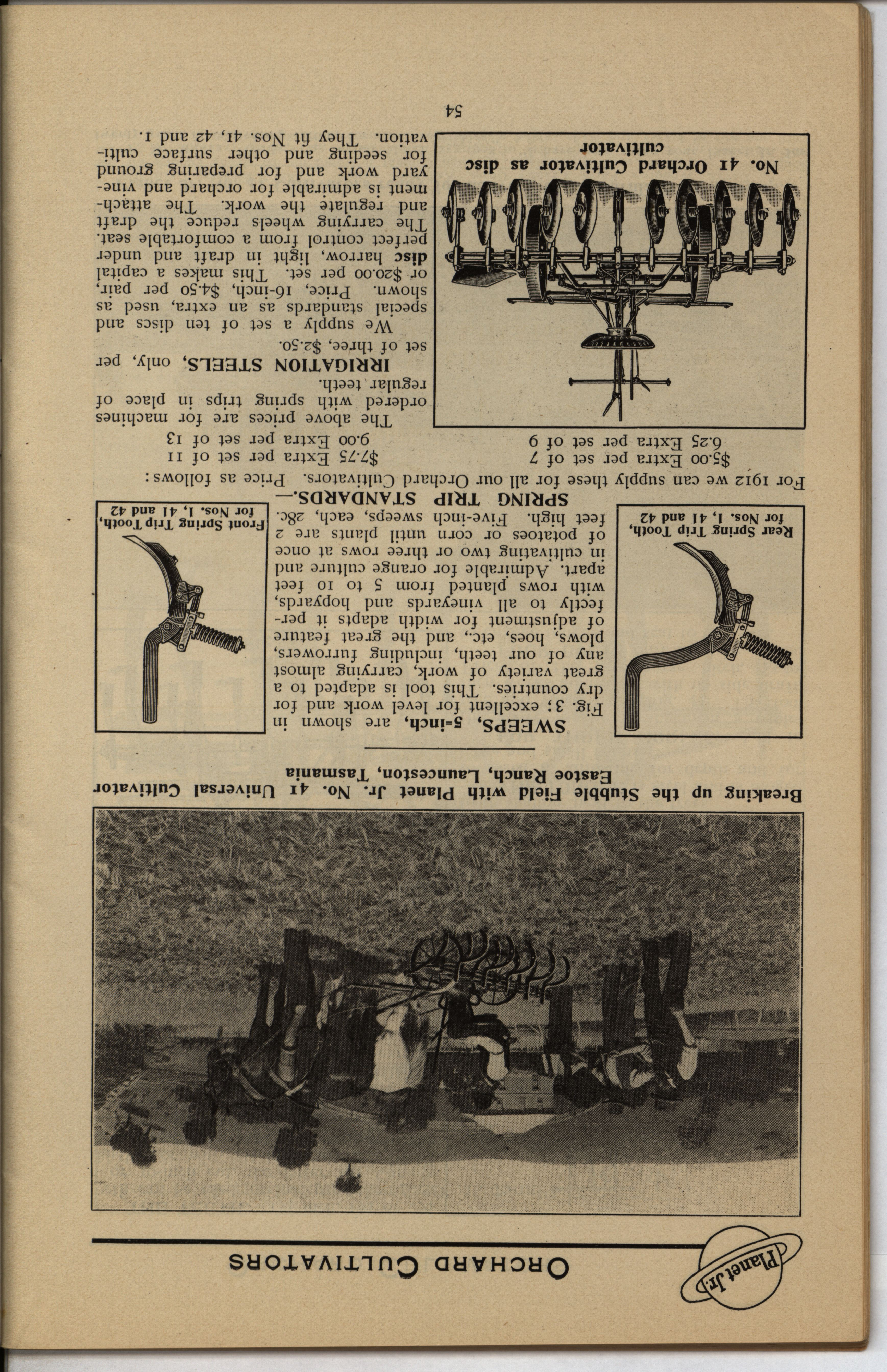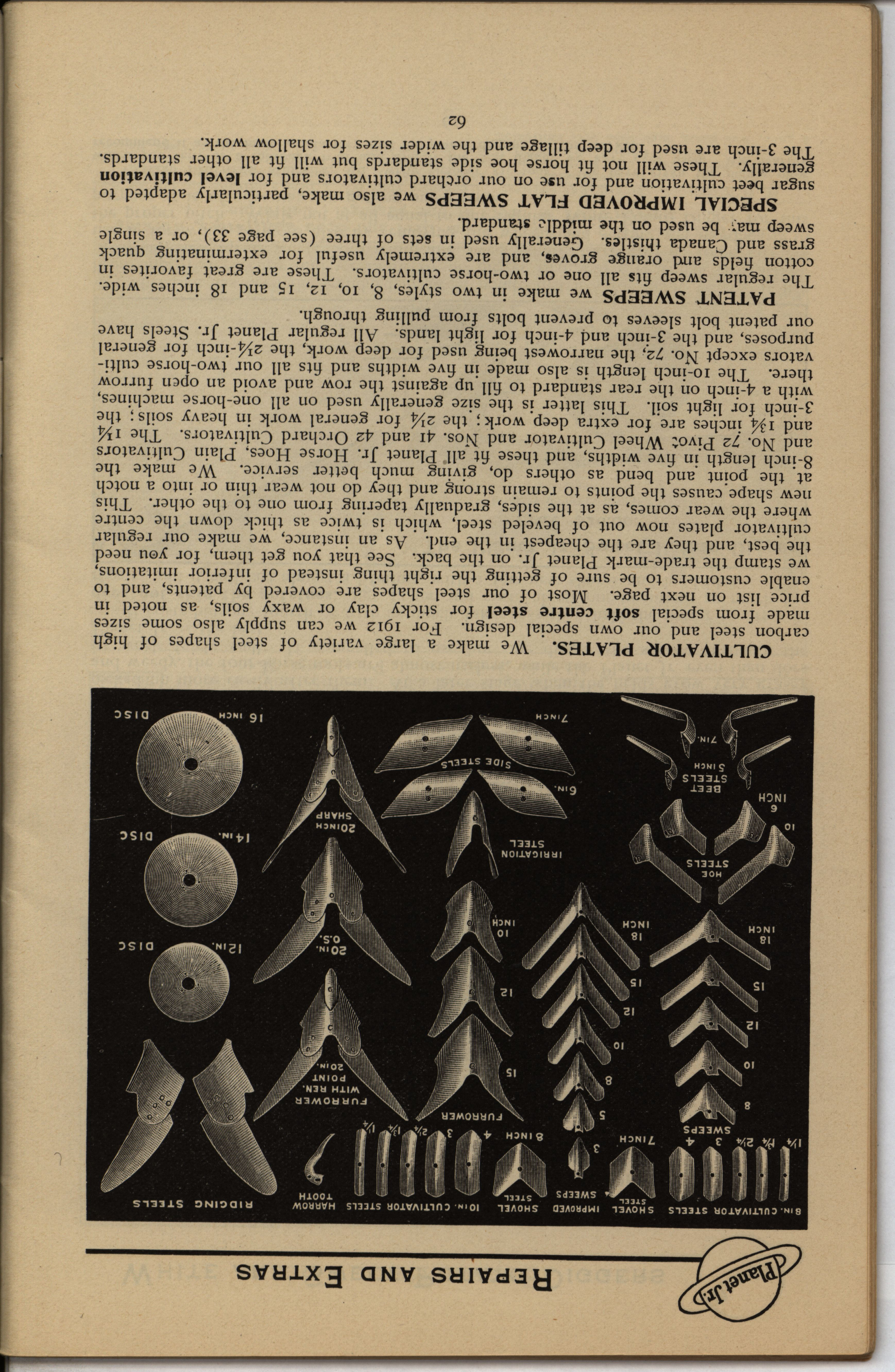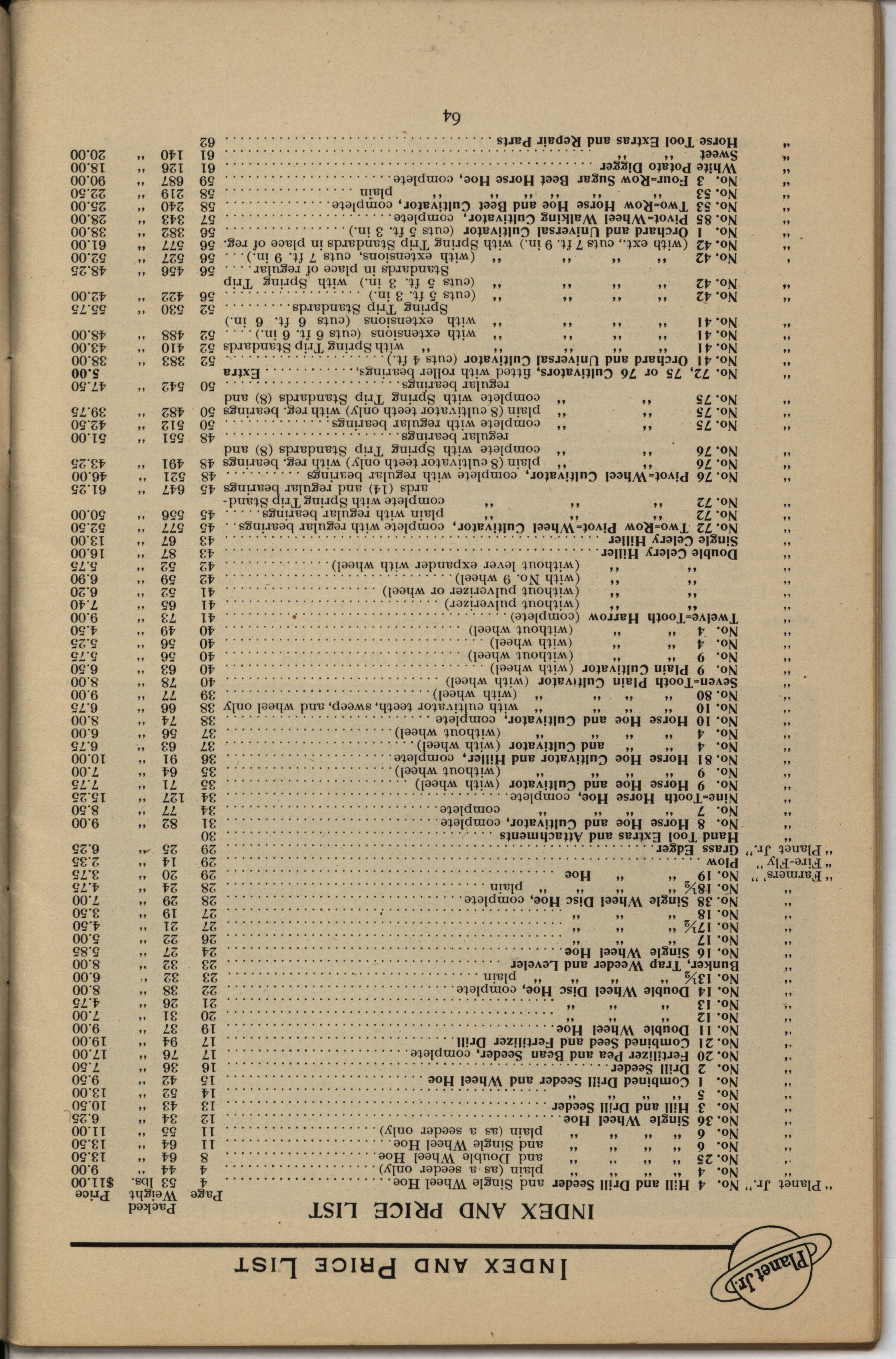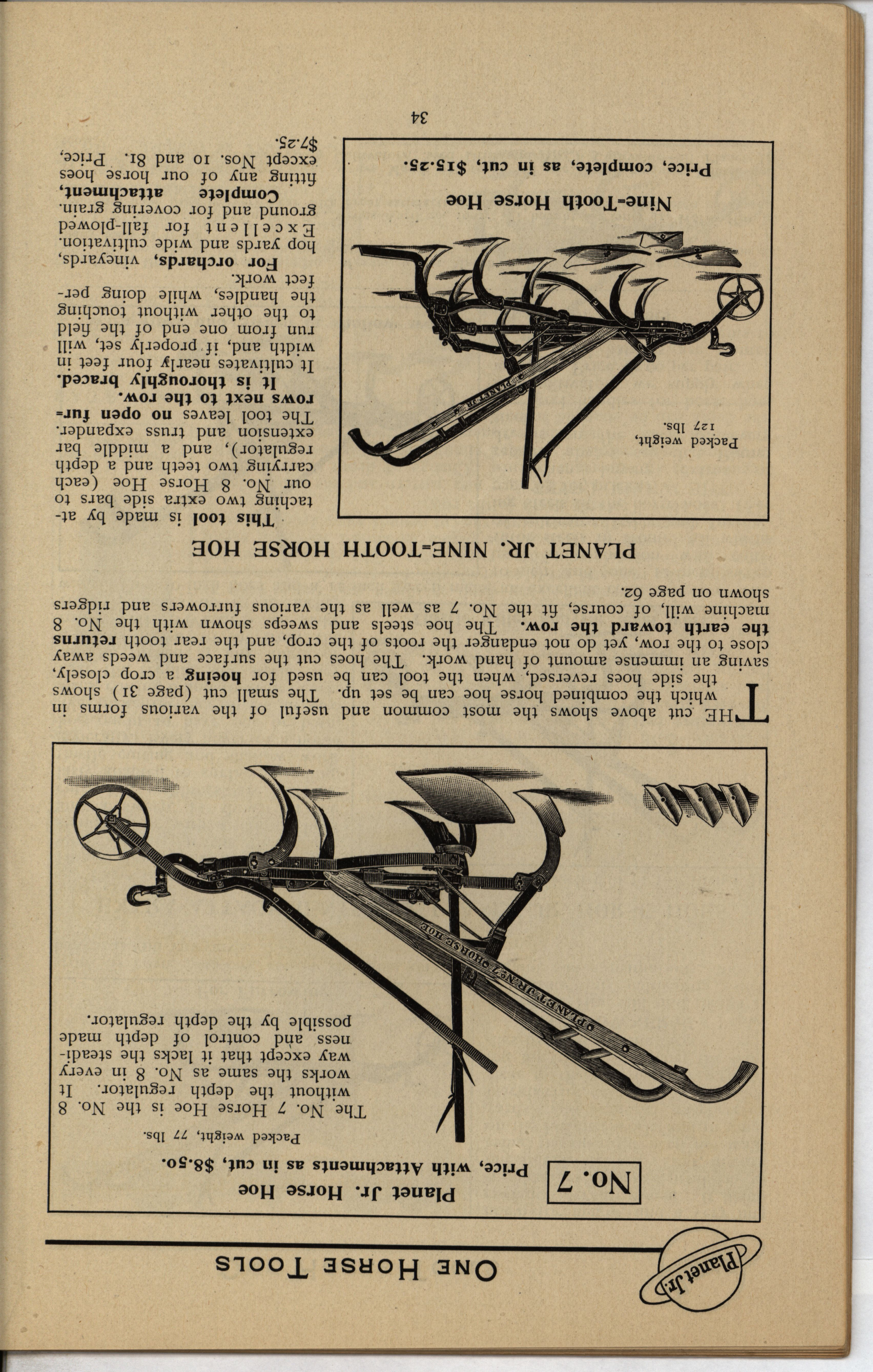 - Catalog detailing the products offered in the Planet Jr. line of farm and garden implements. Includes illustrations and price list.