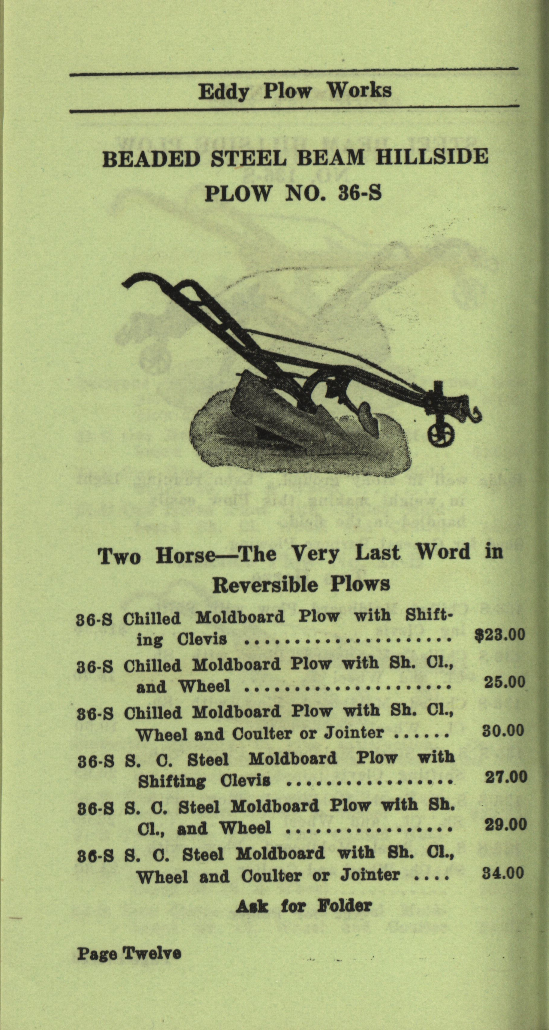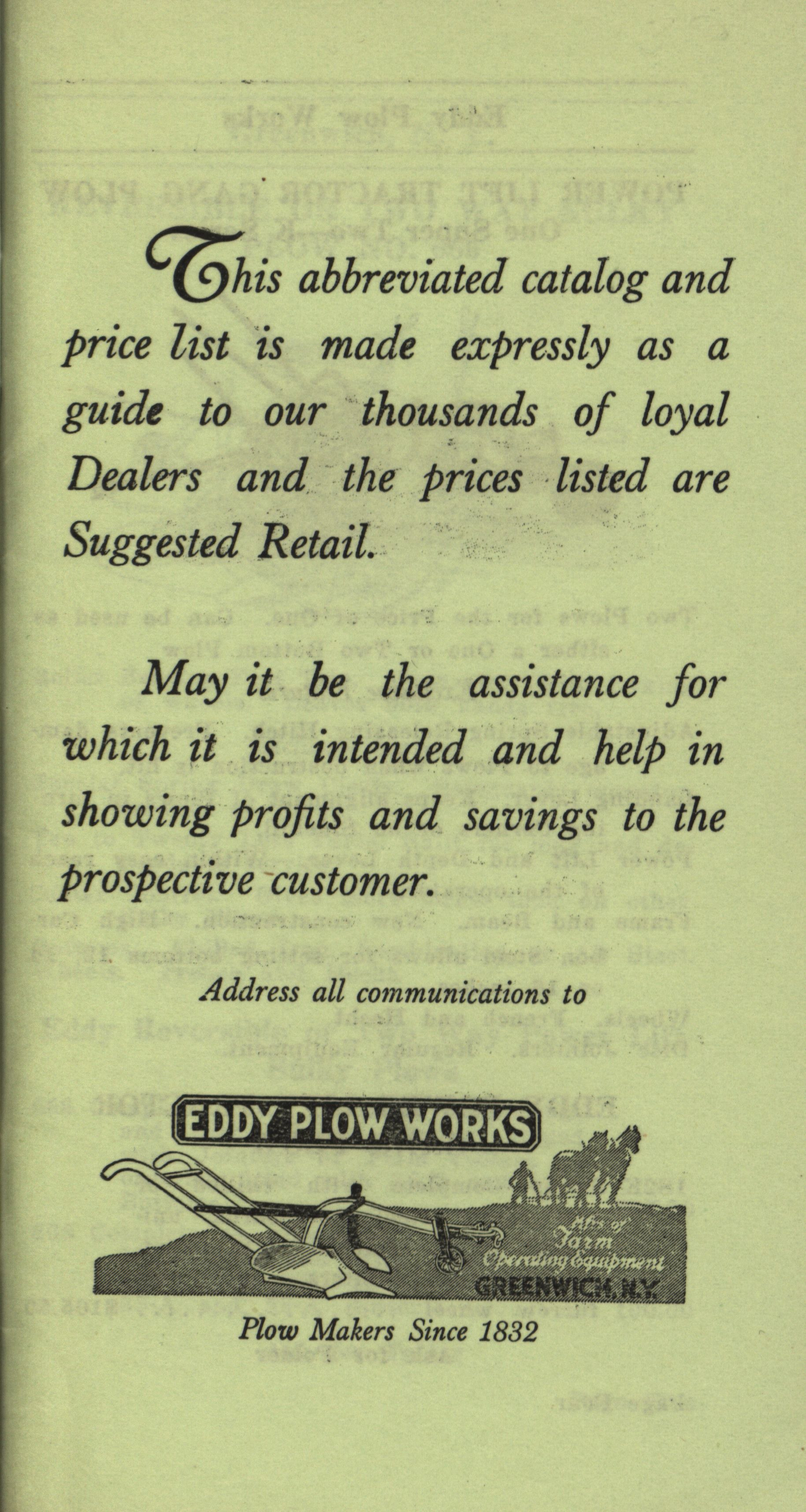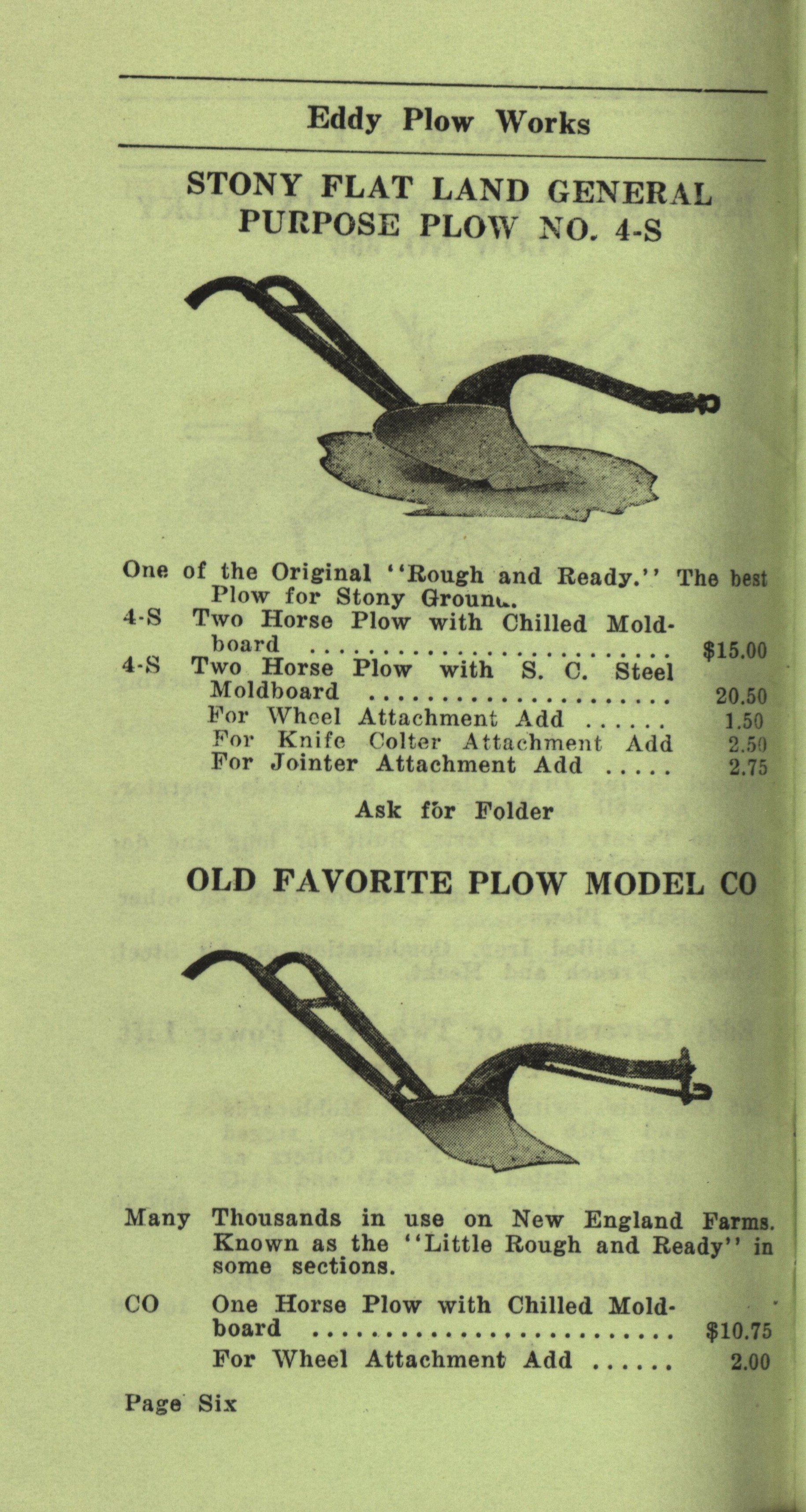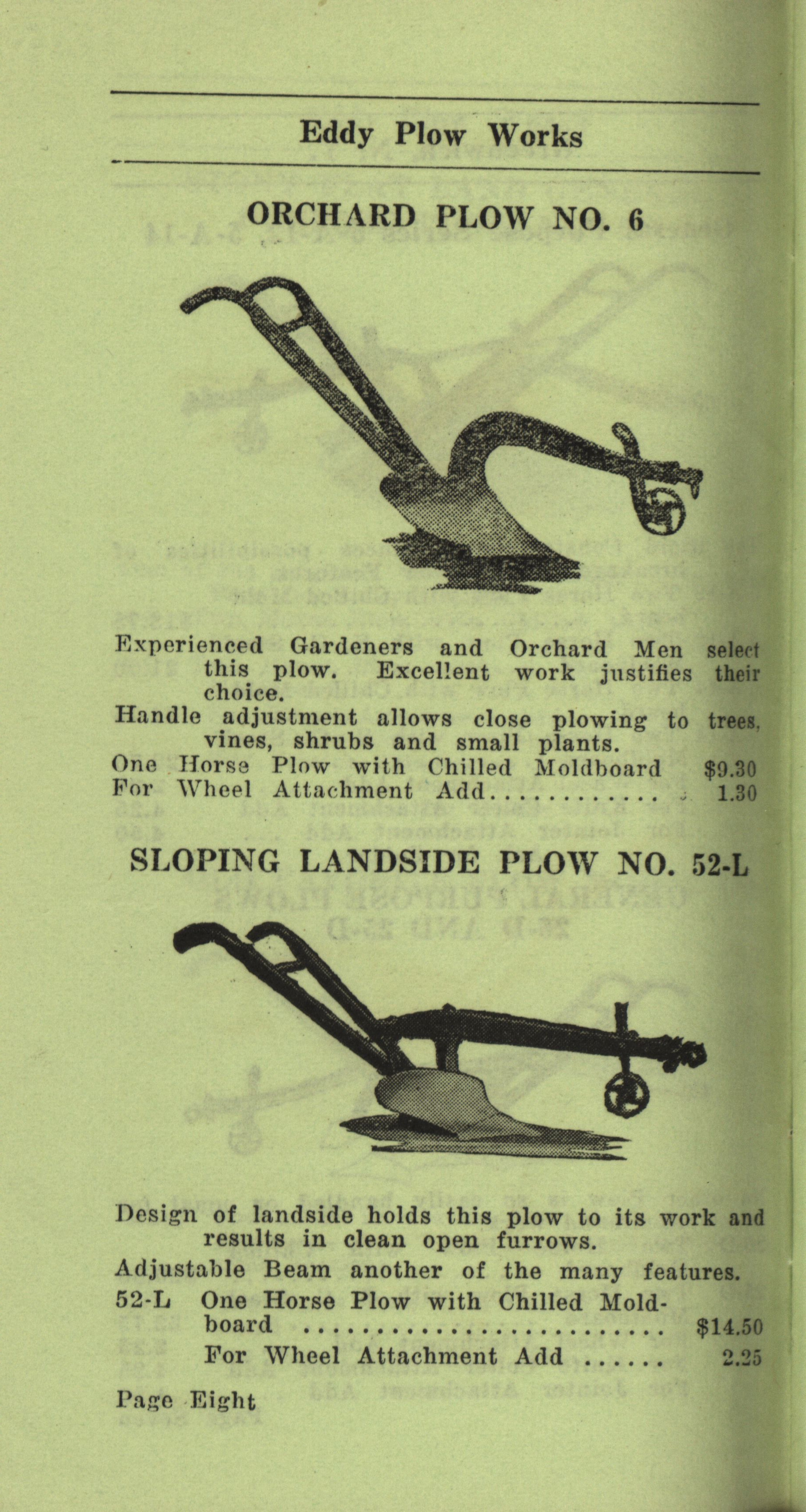 - "Eddy Plow Works Price List No. 44", Agricultural Machinery Literature Collection, Iowa State University Library Digital Collections