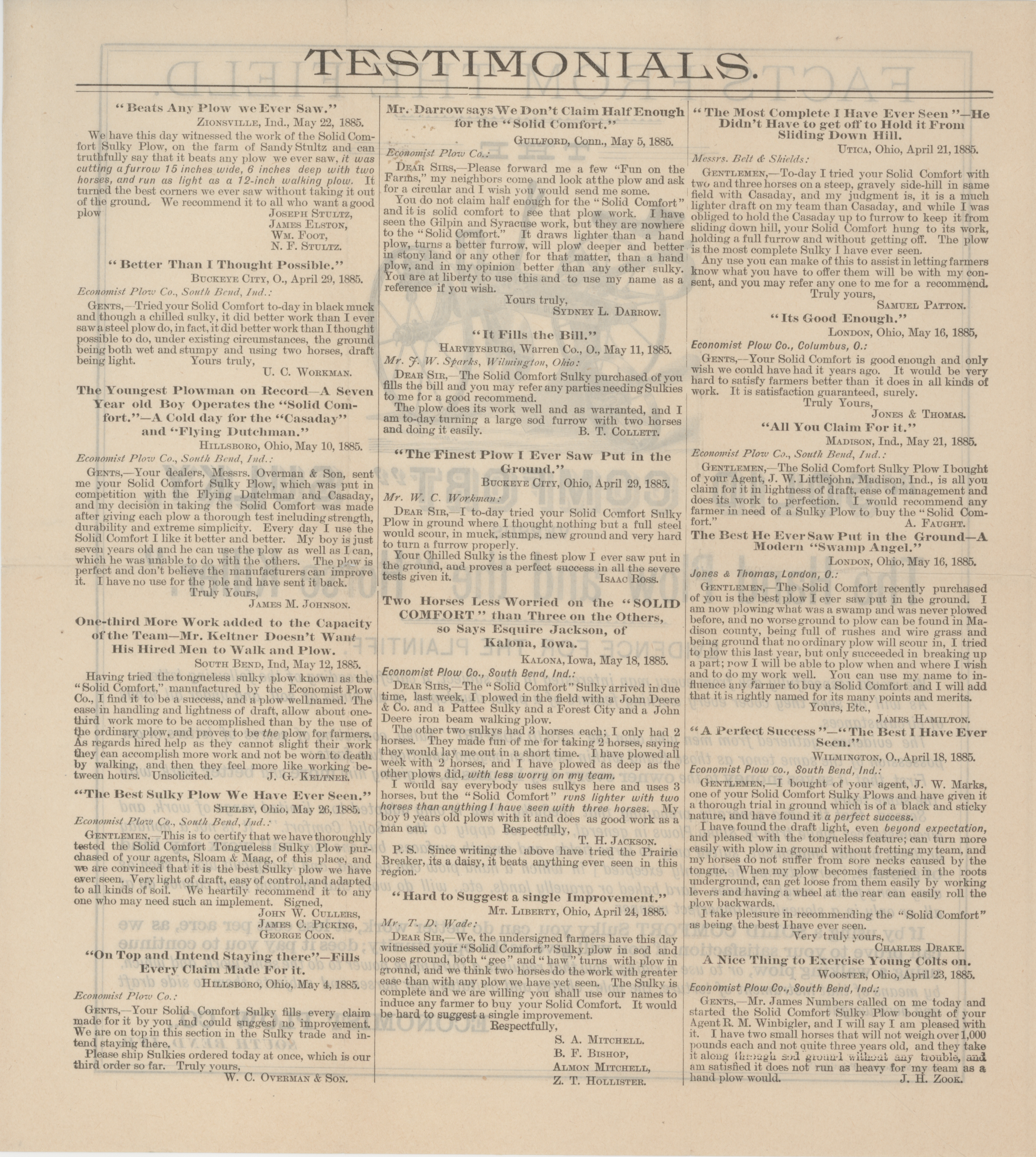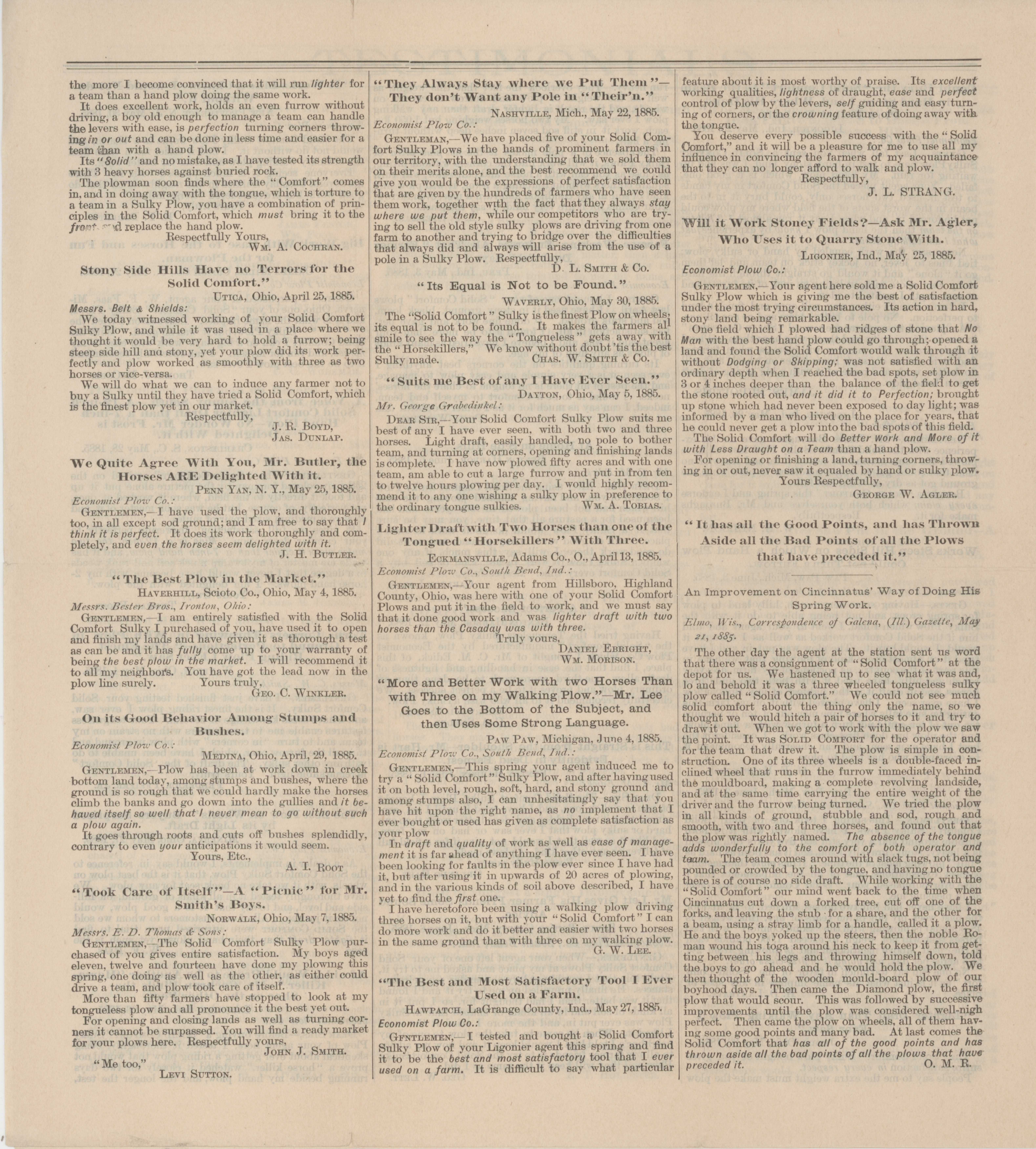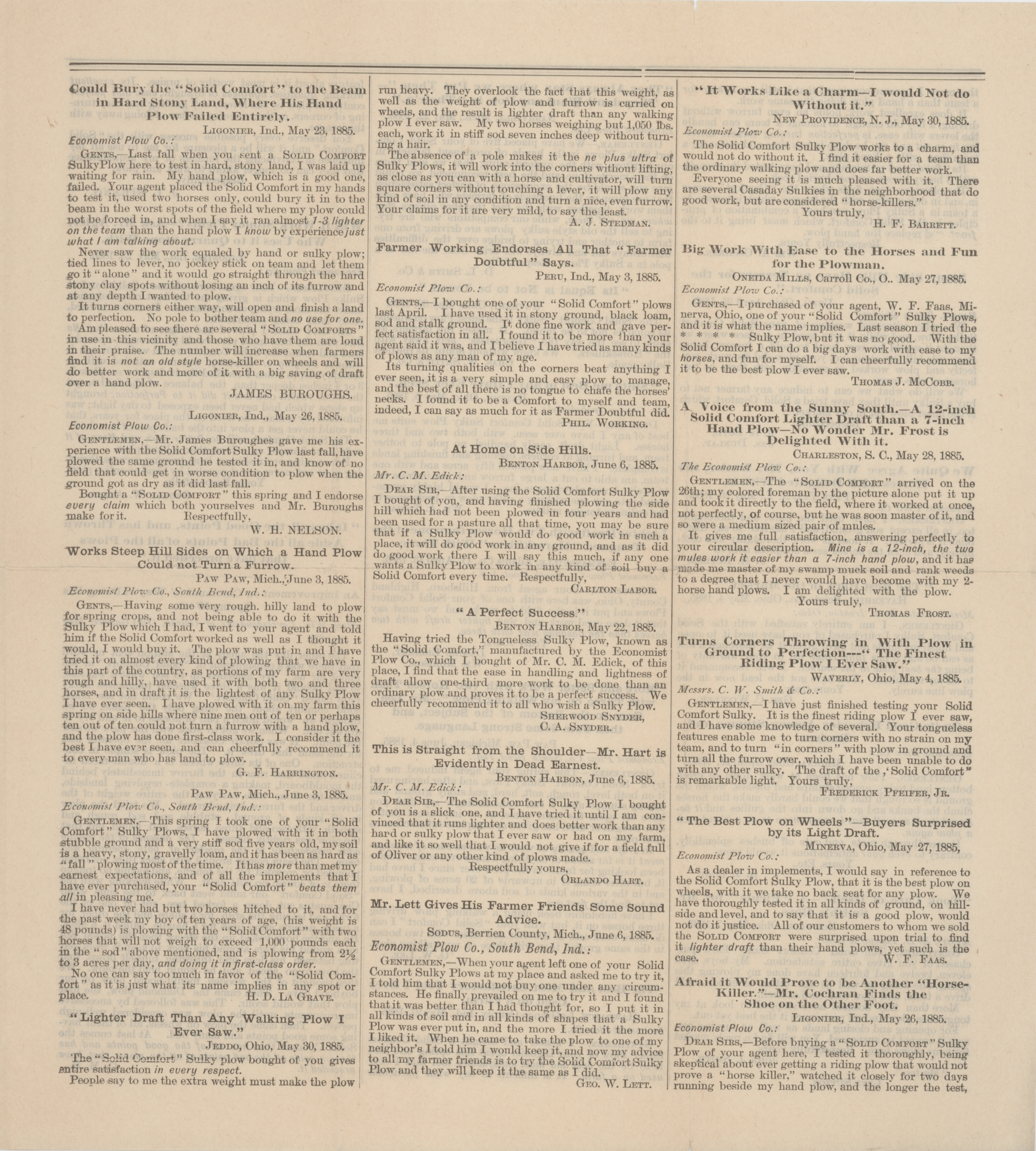 - Advertisement pamphlet for the agricultural products offered by Economist Plow Company, including testimonials from the field.