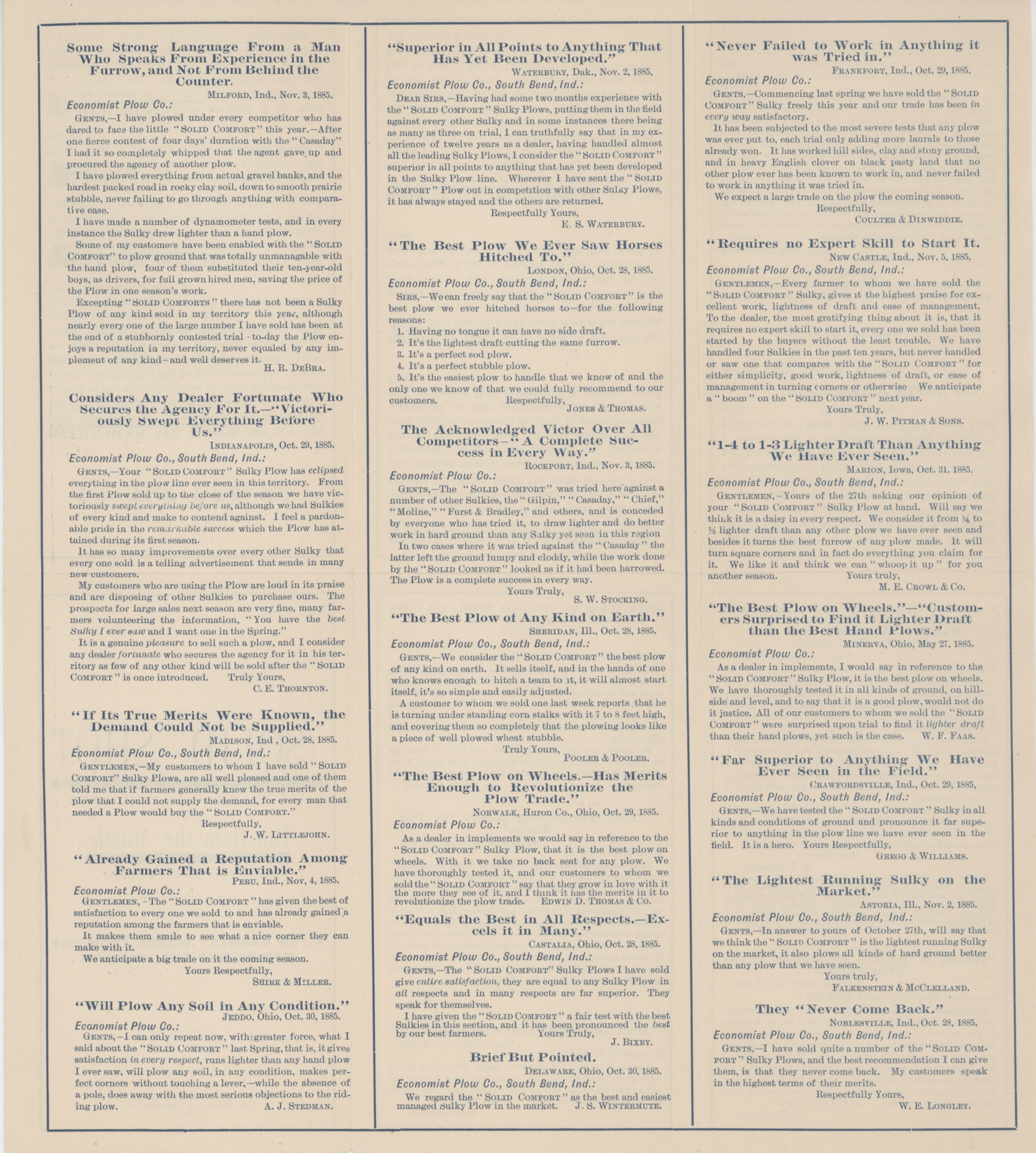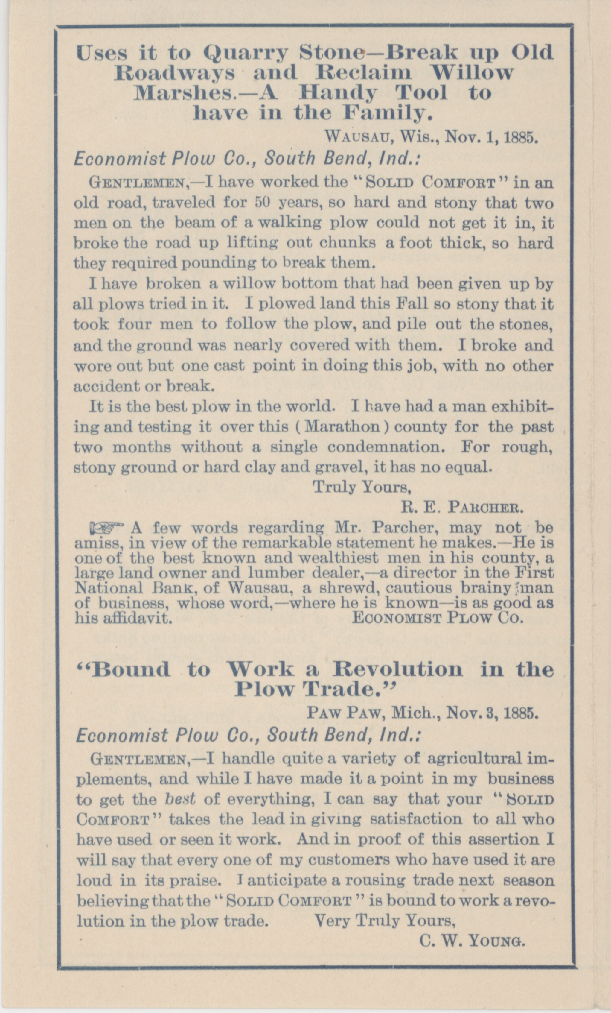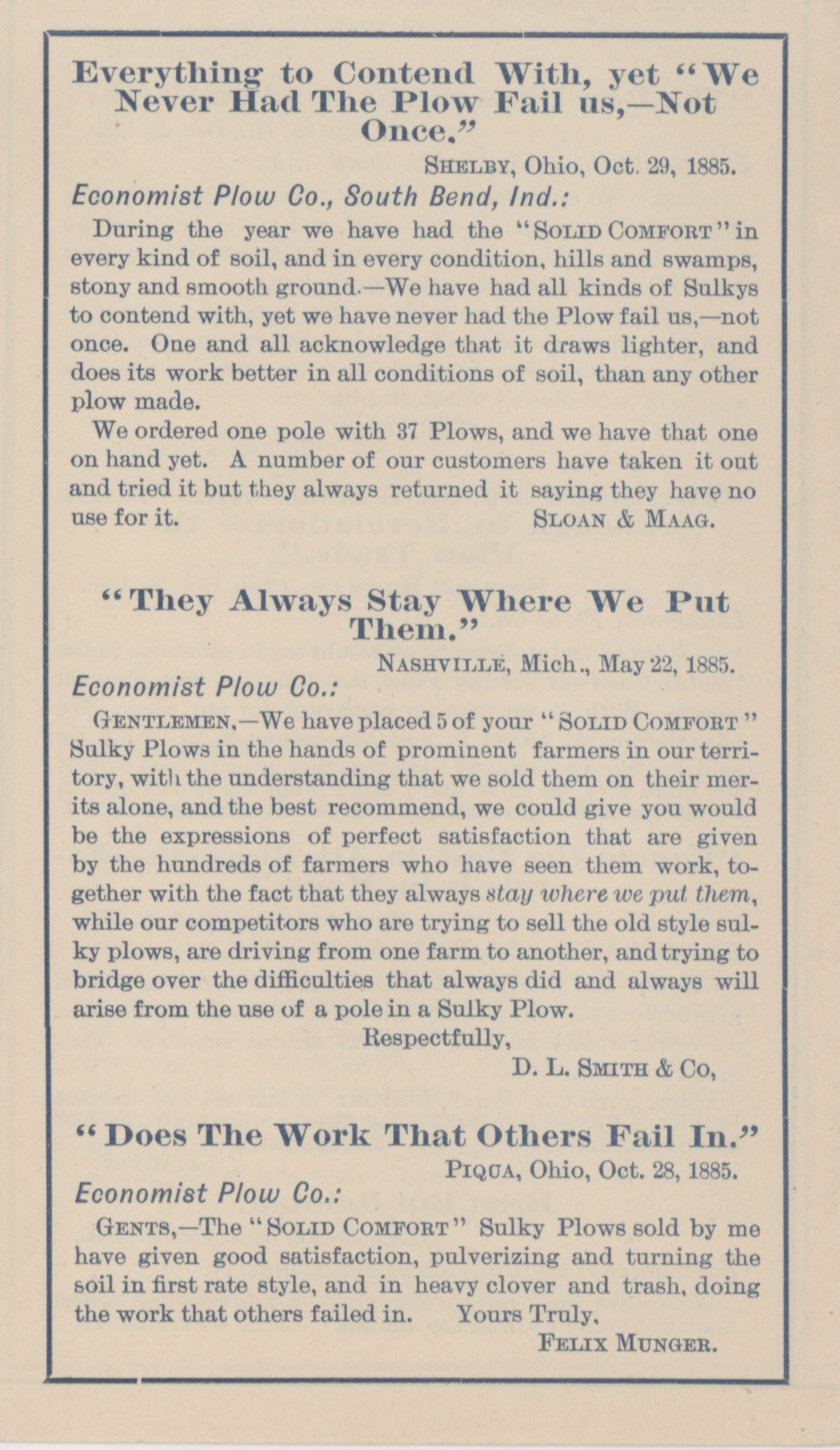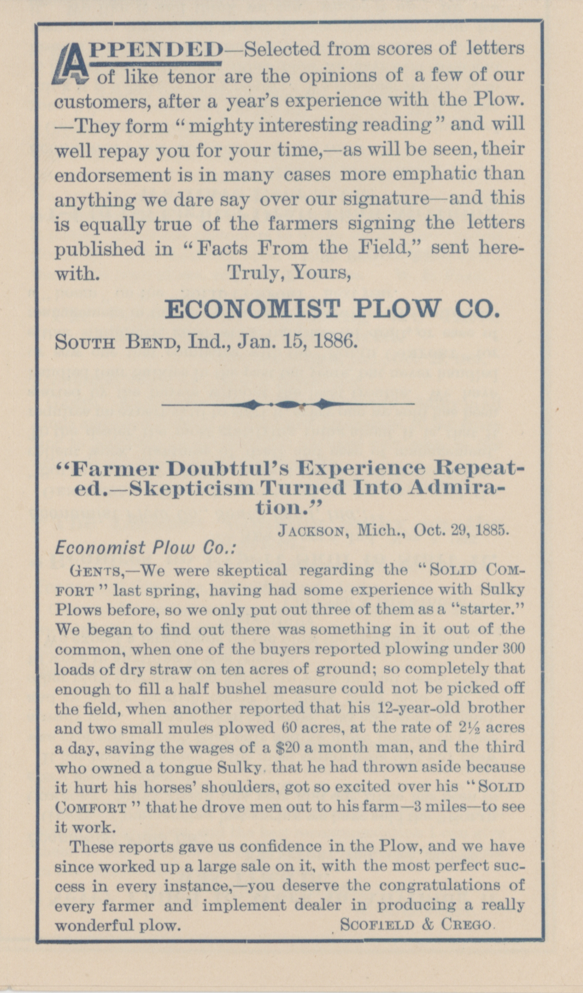 - Advertisement pamphlet for the agricultural products offered by the Economist Plow Company in 1886, including testimonials.