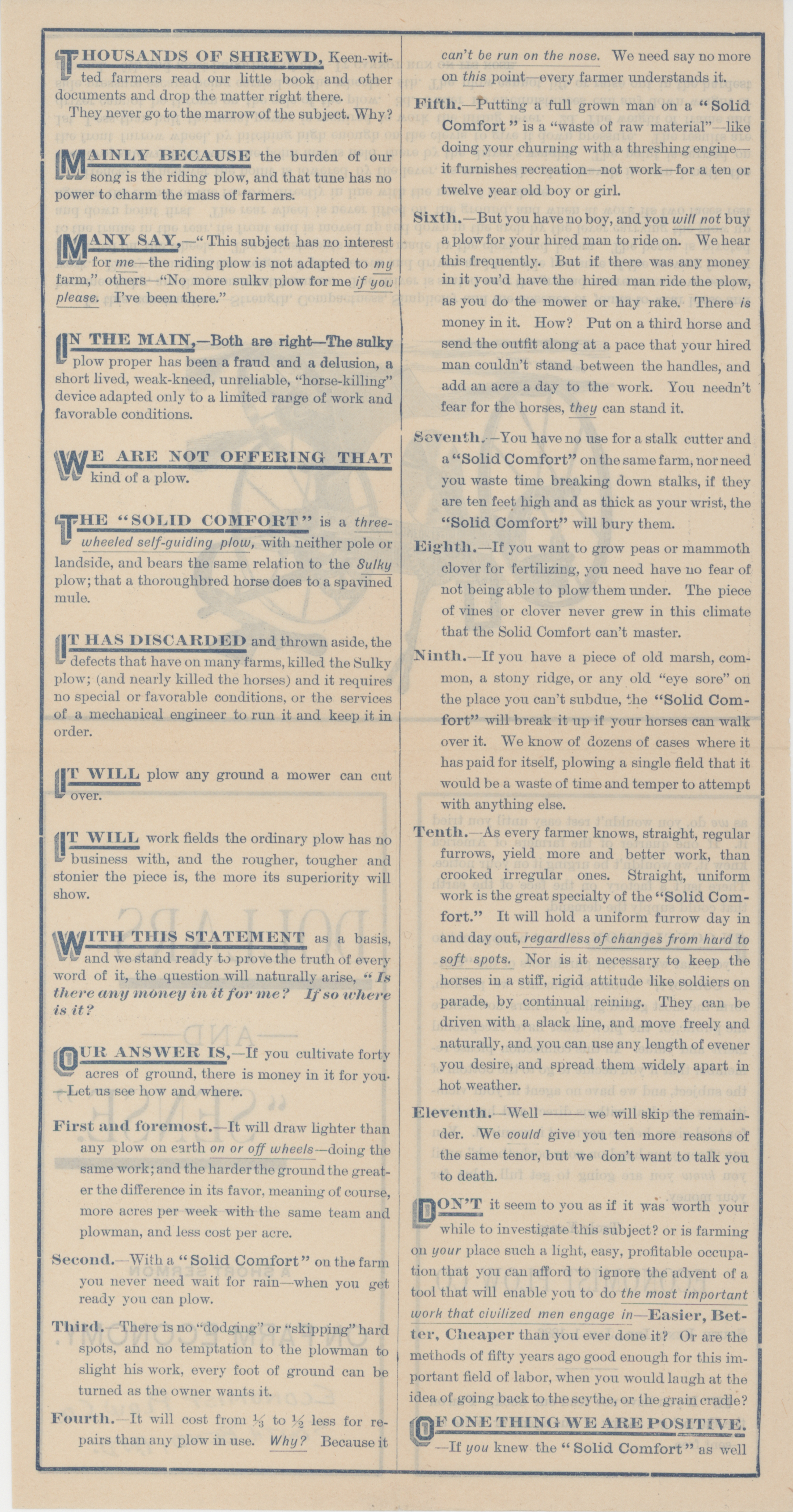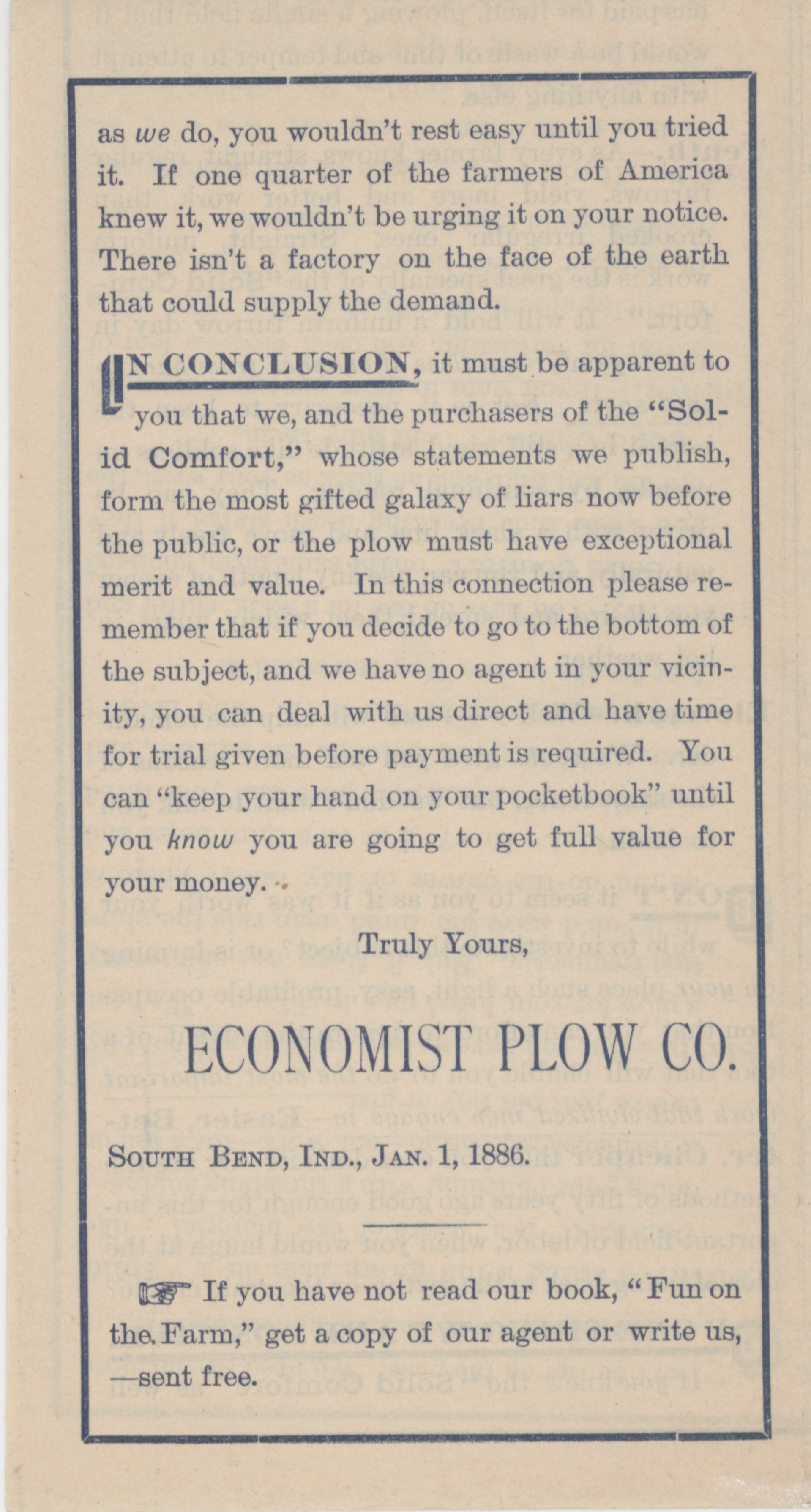 - Advertisement pamphlet describing the benefits of agricultural implements from the Economist Plow Company.
