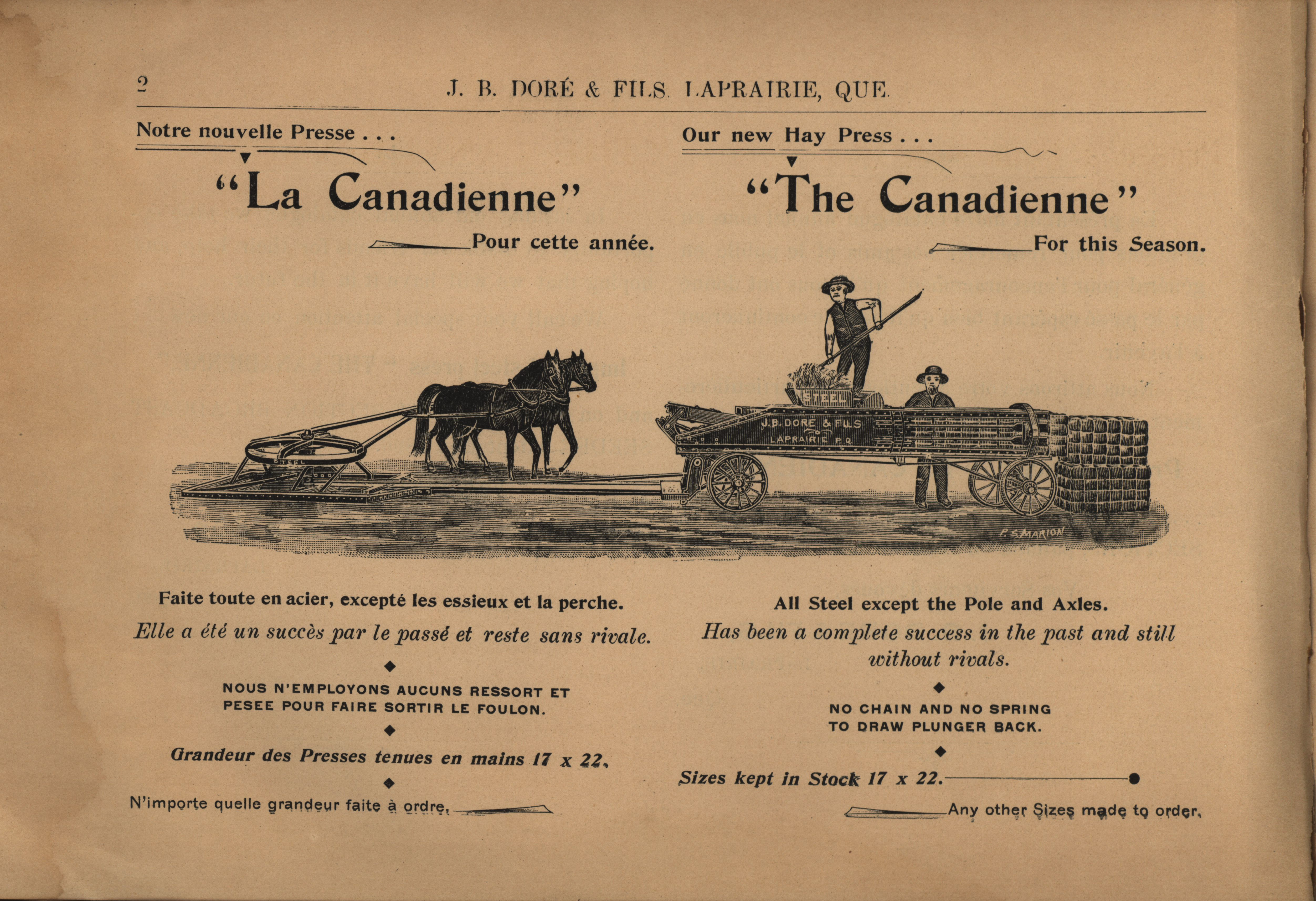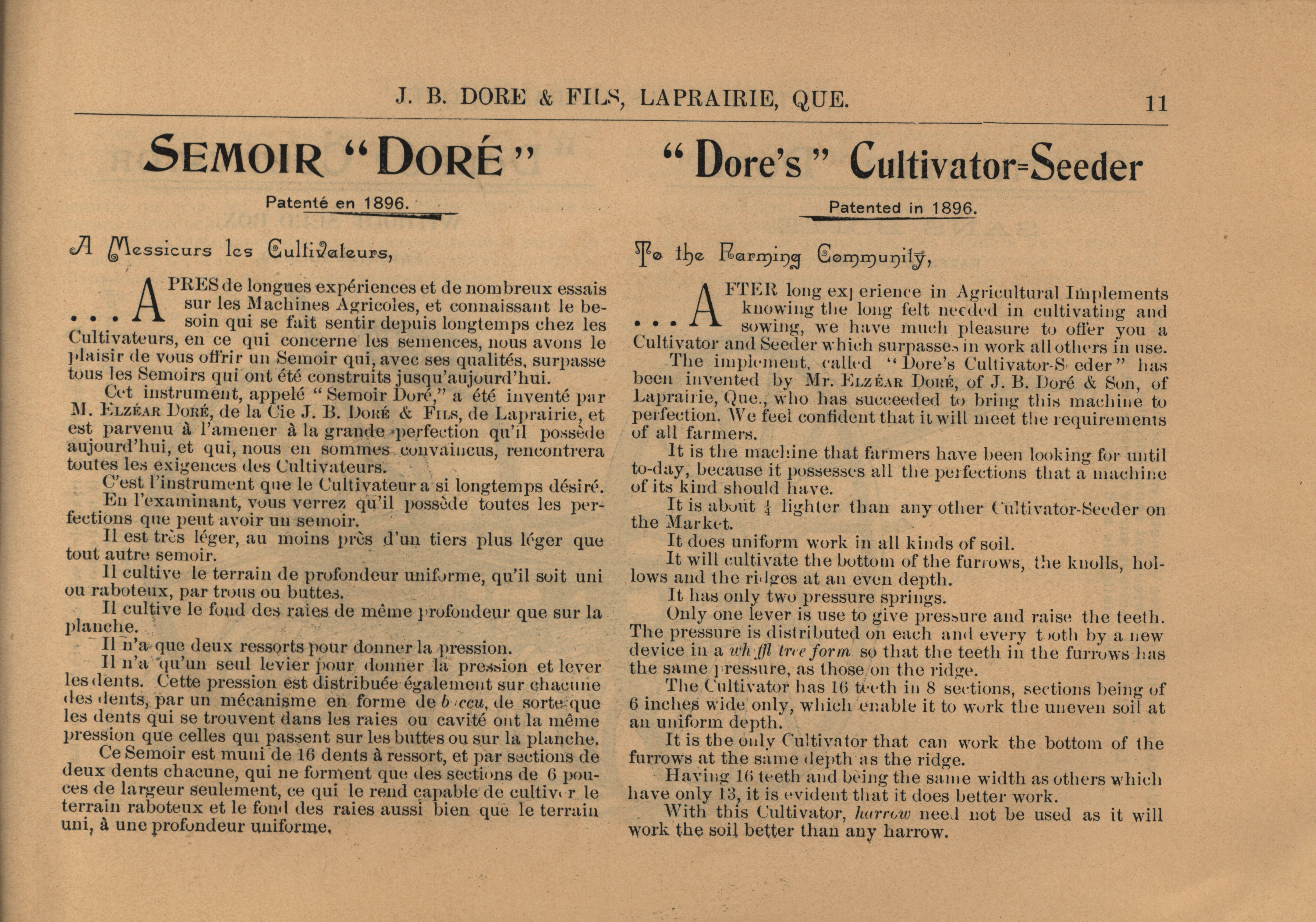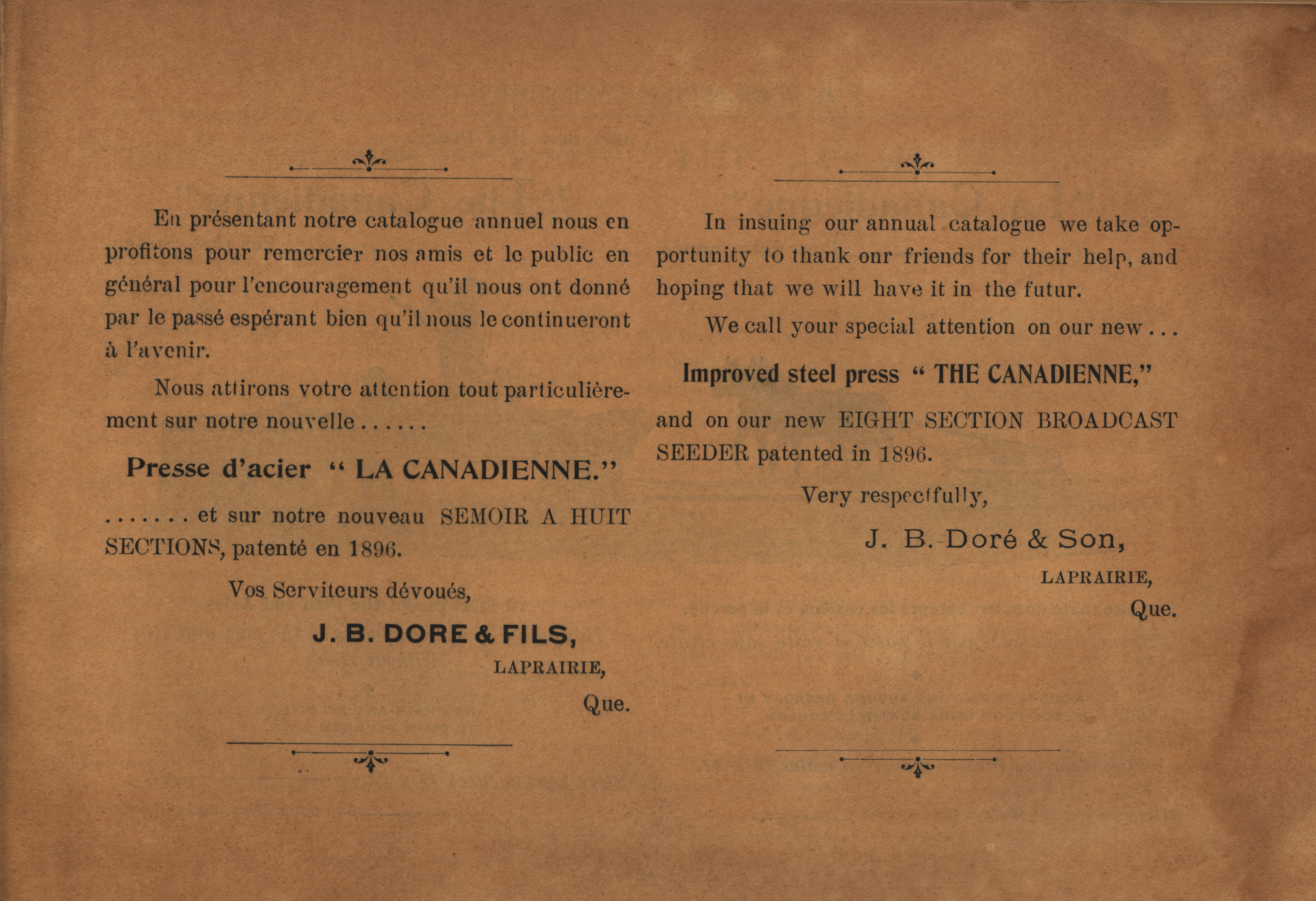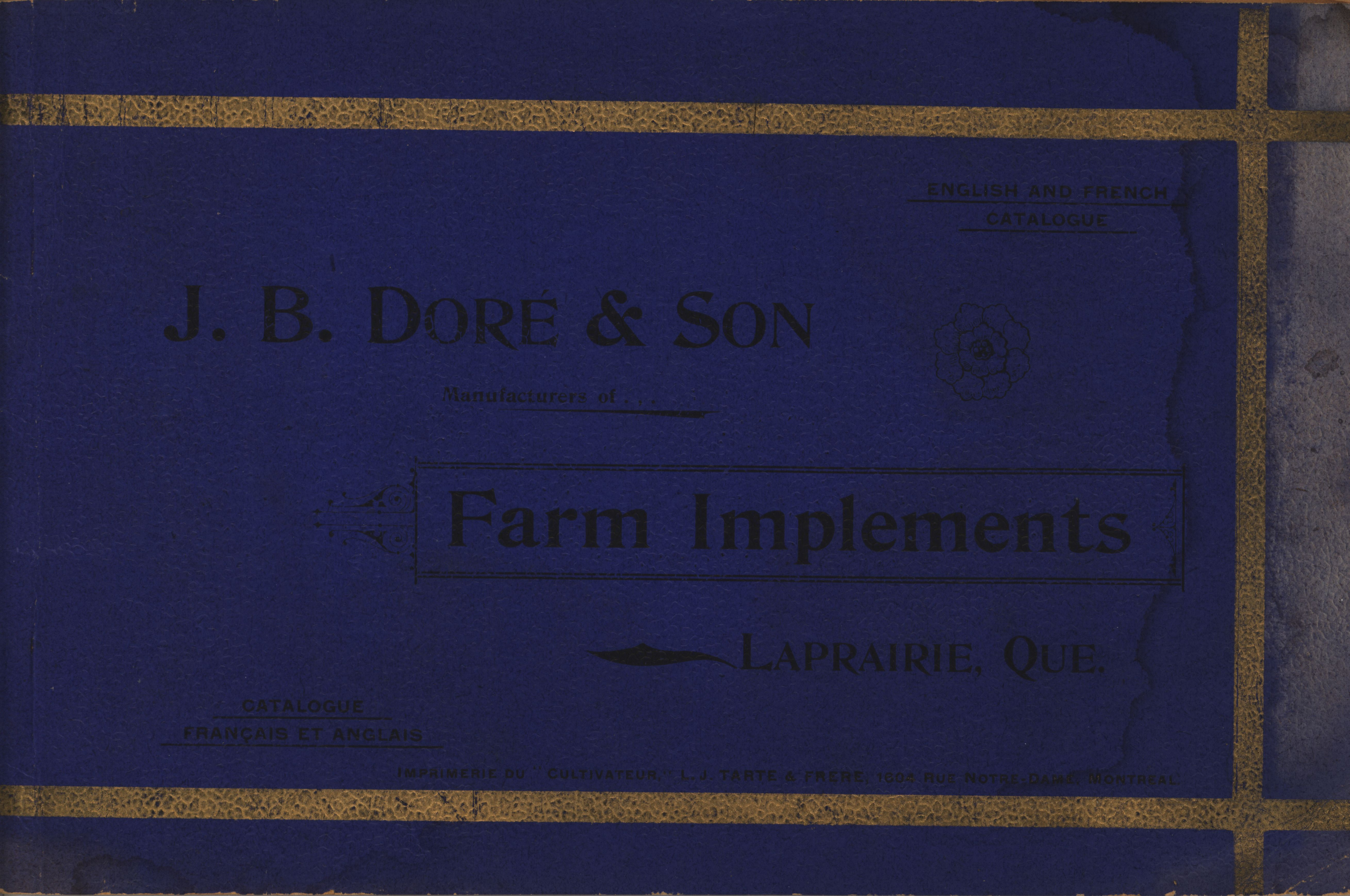 - Illustrated catalog describing the farm implements offered by J. B. Dore and Sons in 1896.