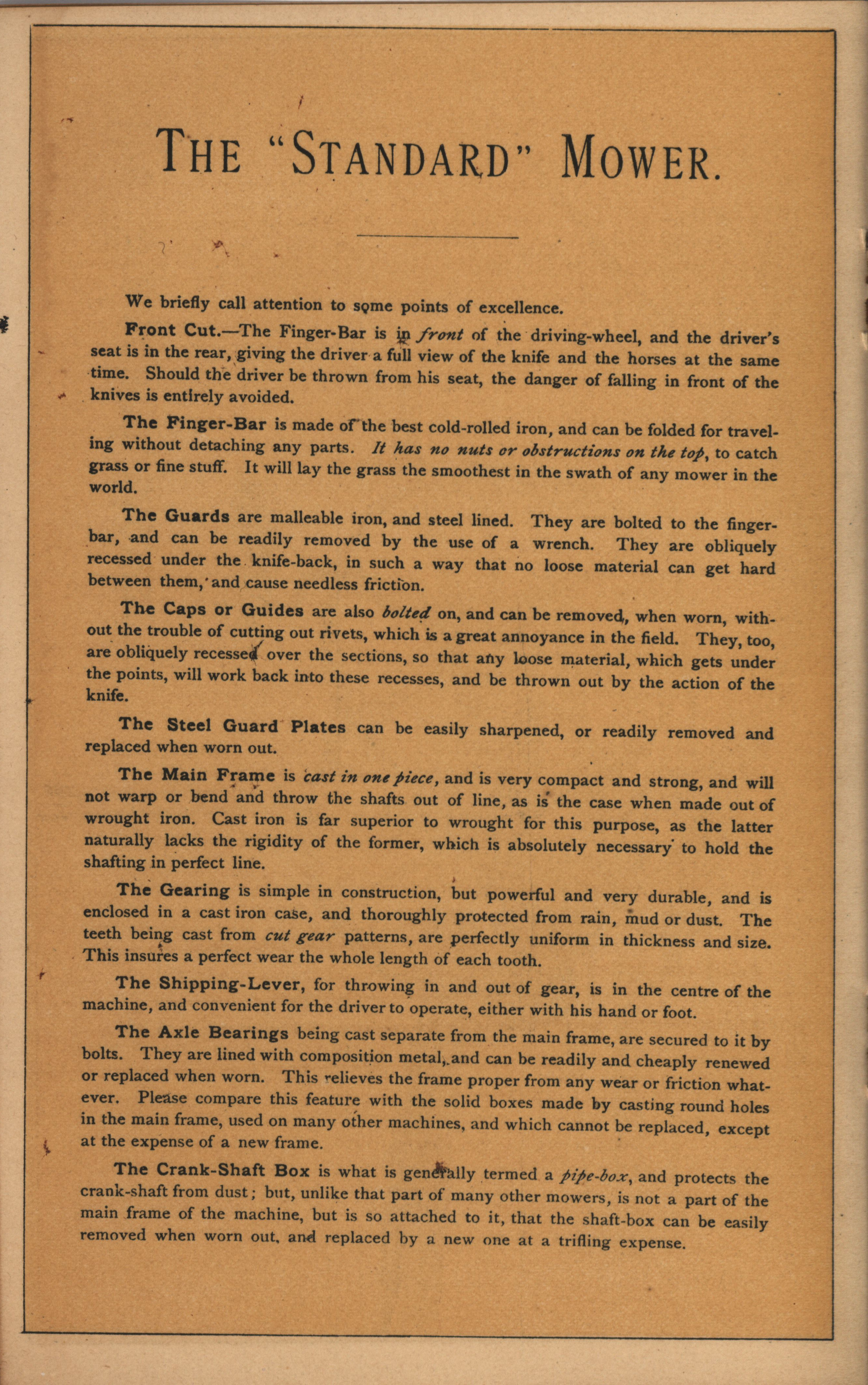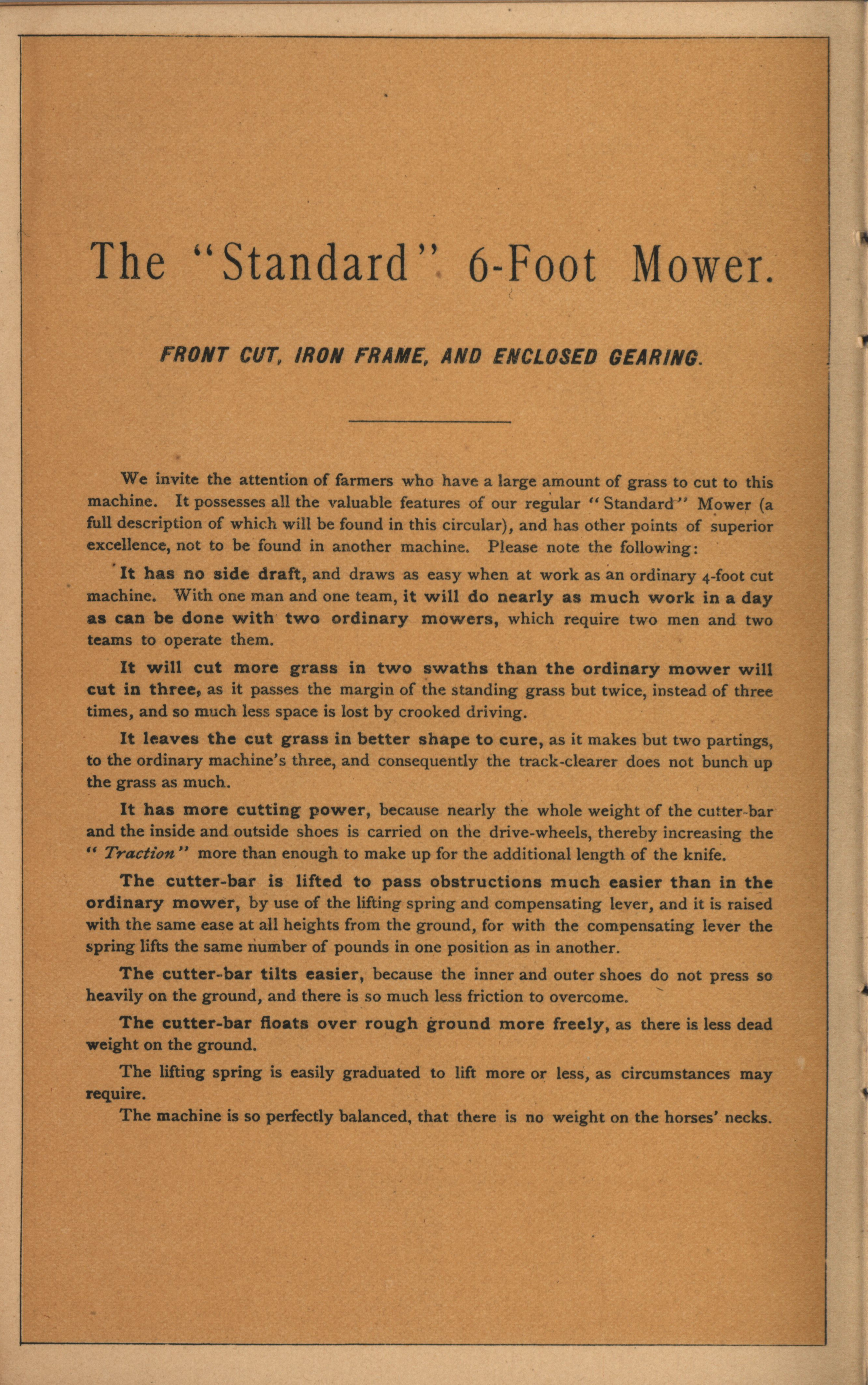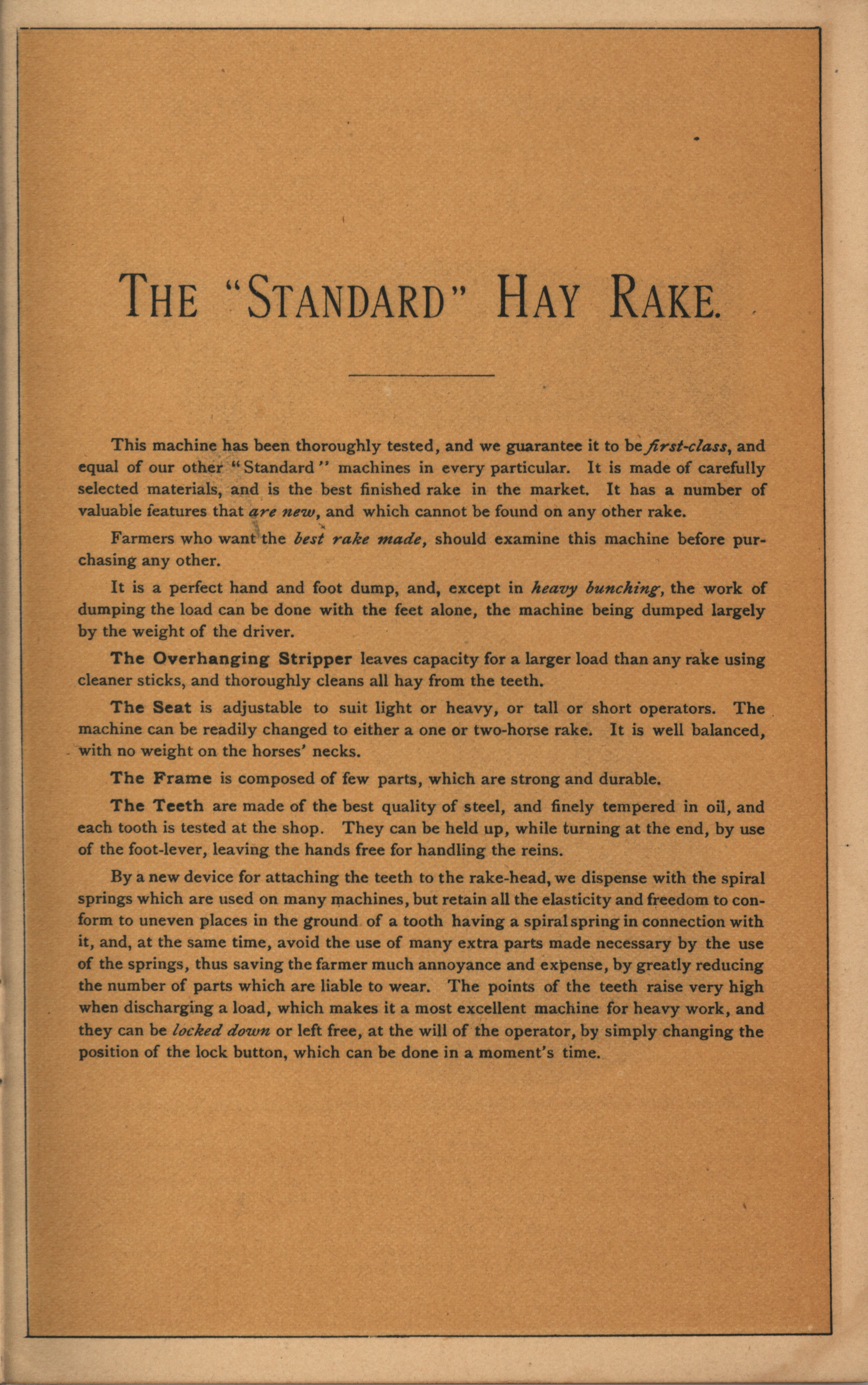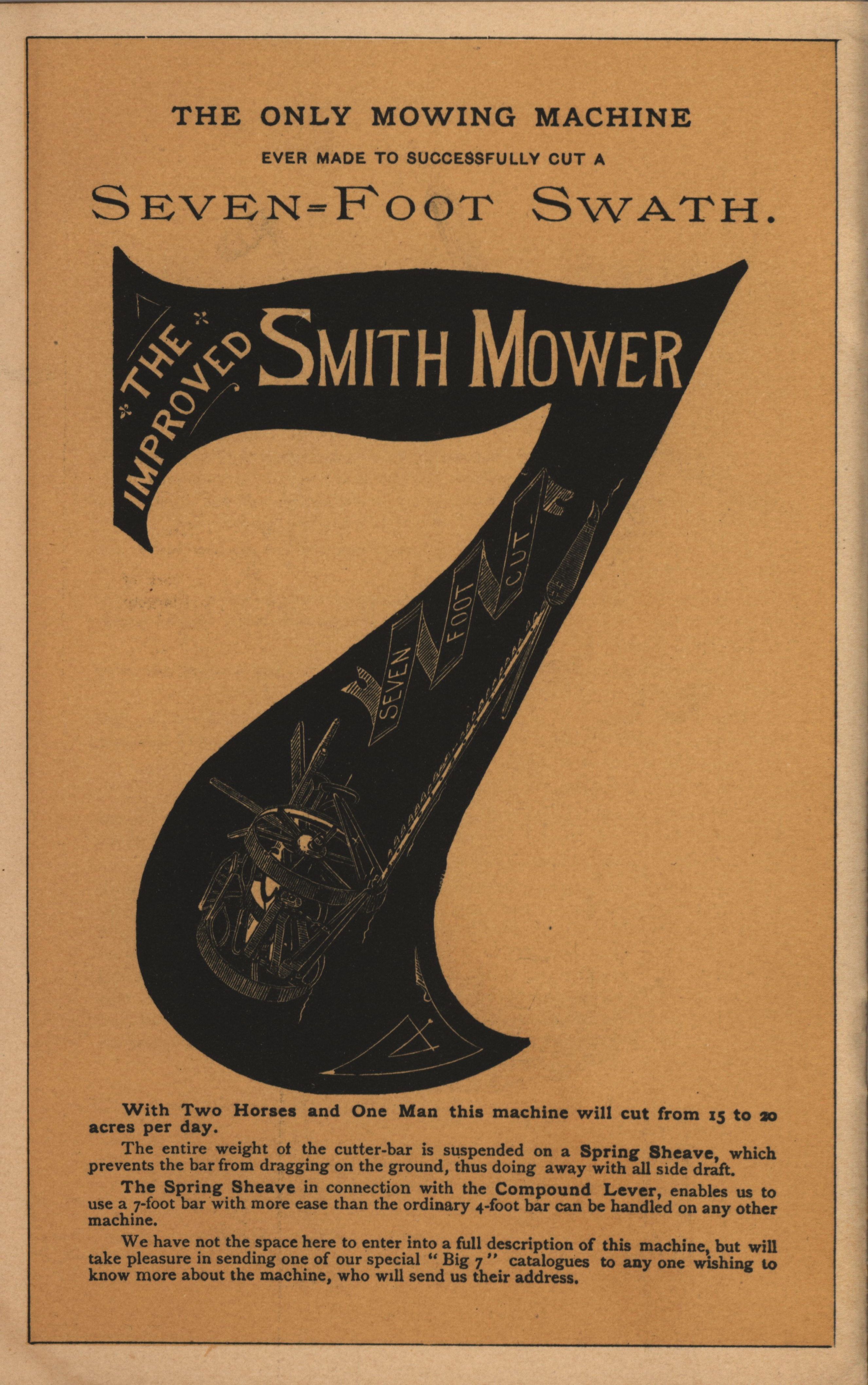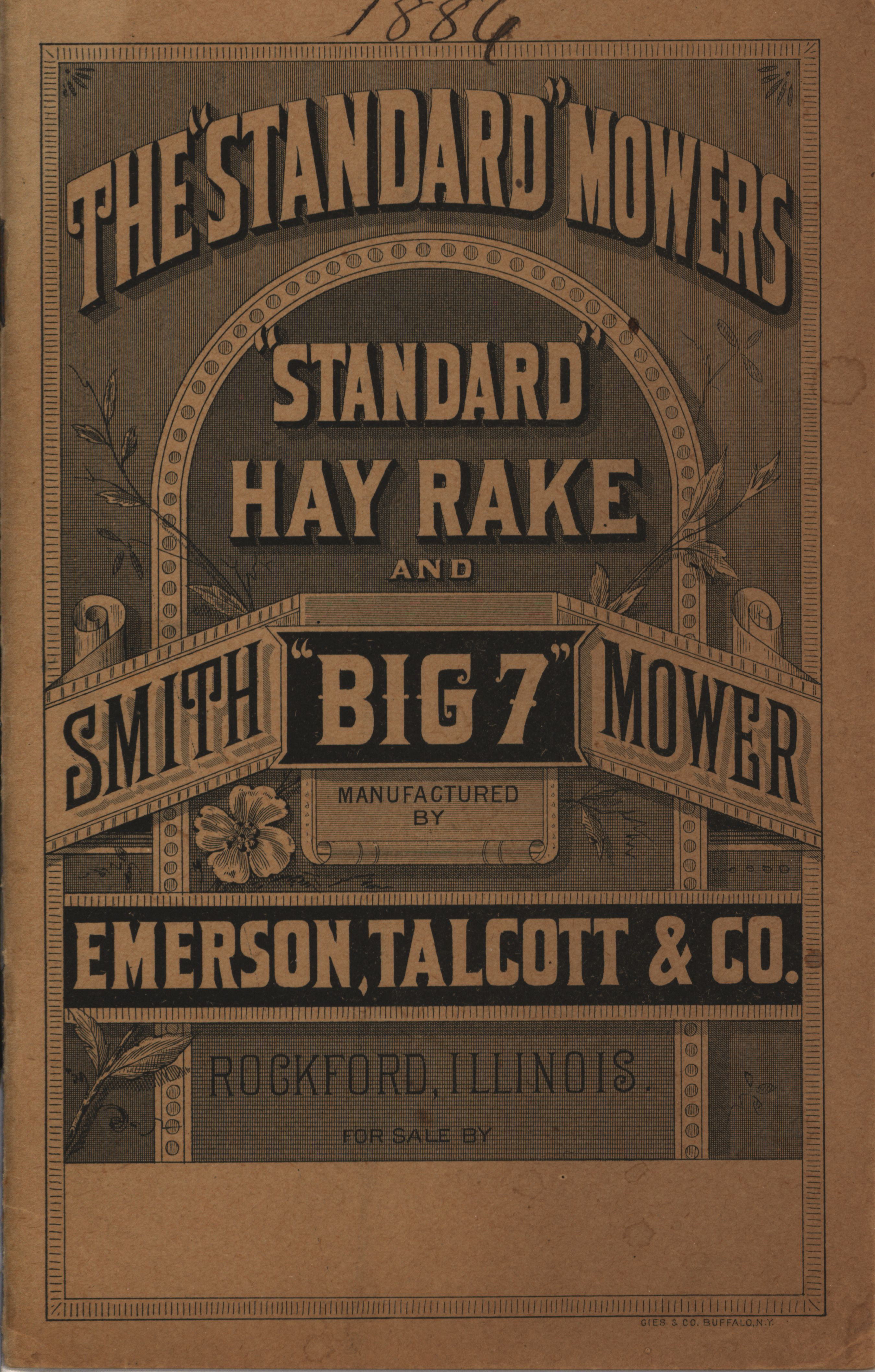 - Illustrated catalog describing the standard hay rake and smith big 7 mower offered by the Emerson, Talcott and Company in 1886.