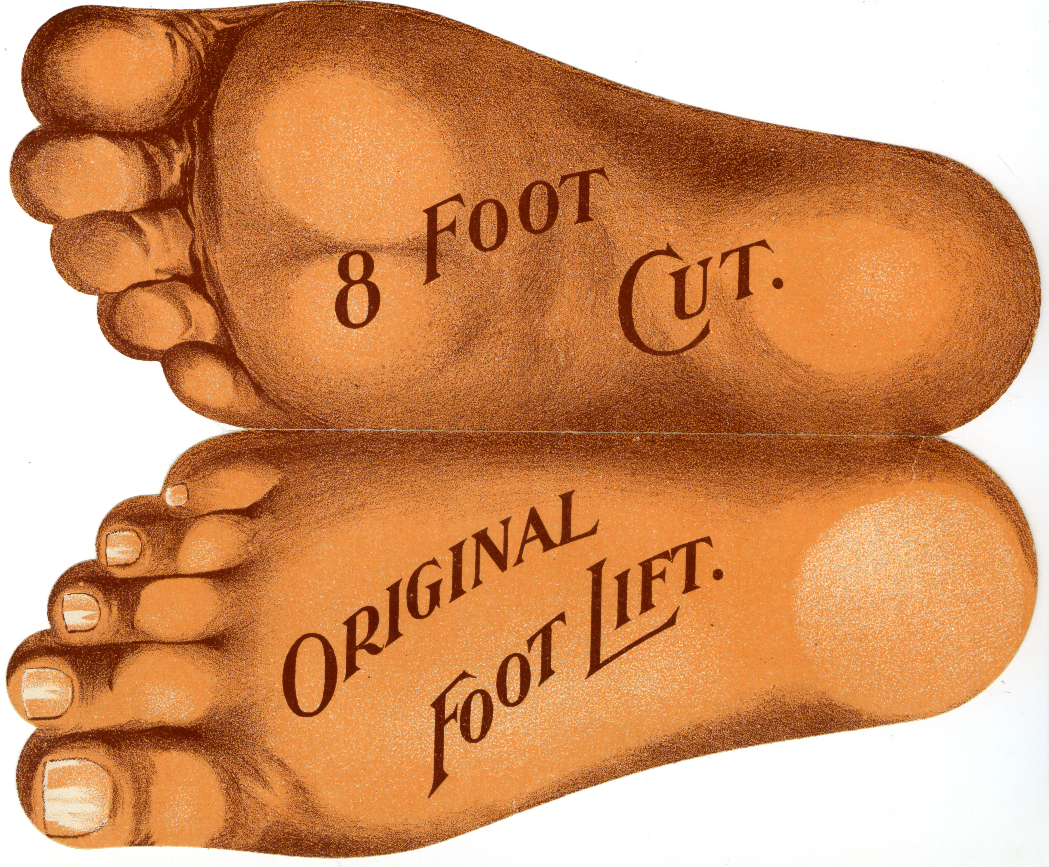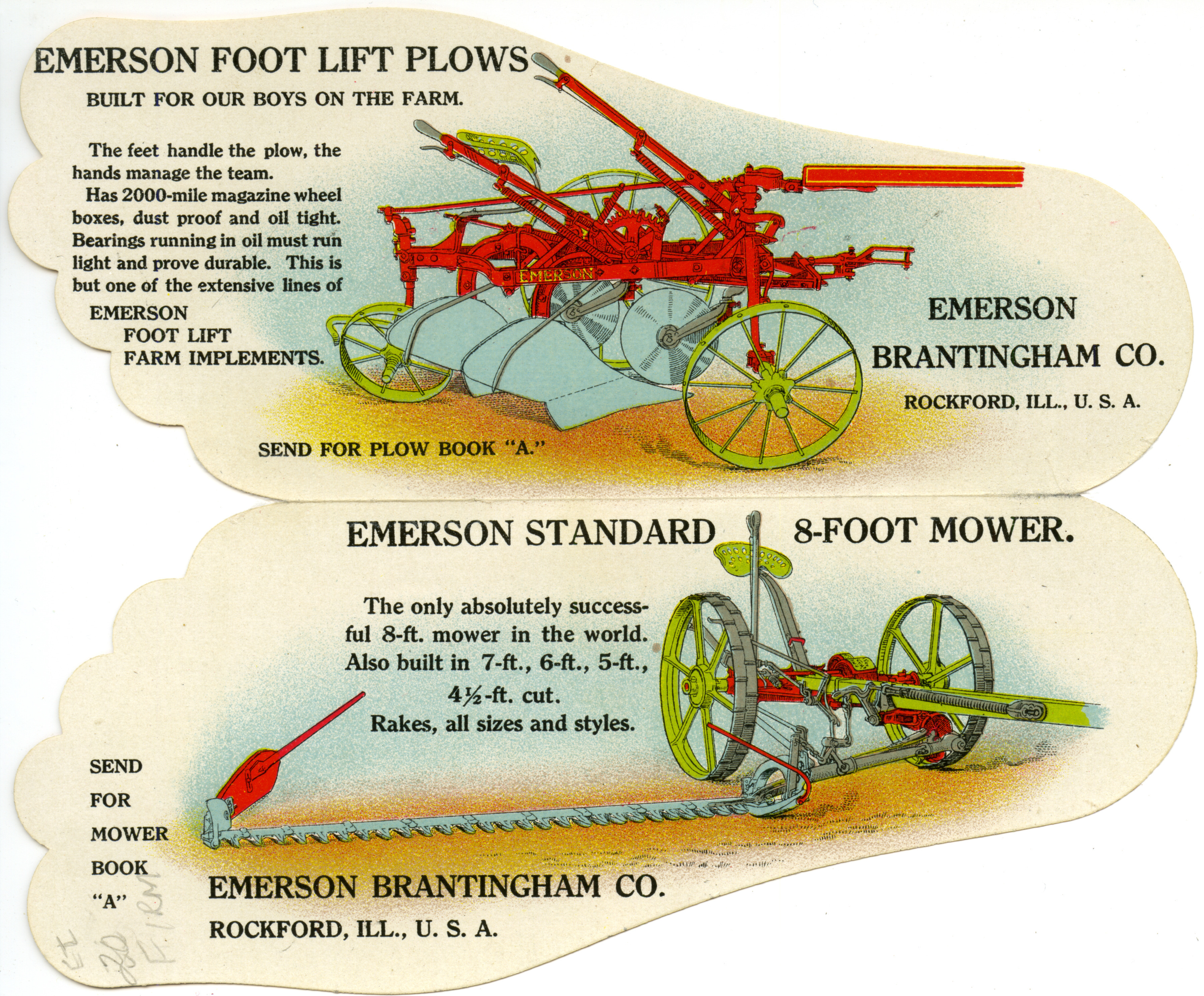 - Illustrated advertisement for the Emerson foot lift plows and the eight foot mowers. The advertisement is in the shape of a foot and depicts the machines.
