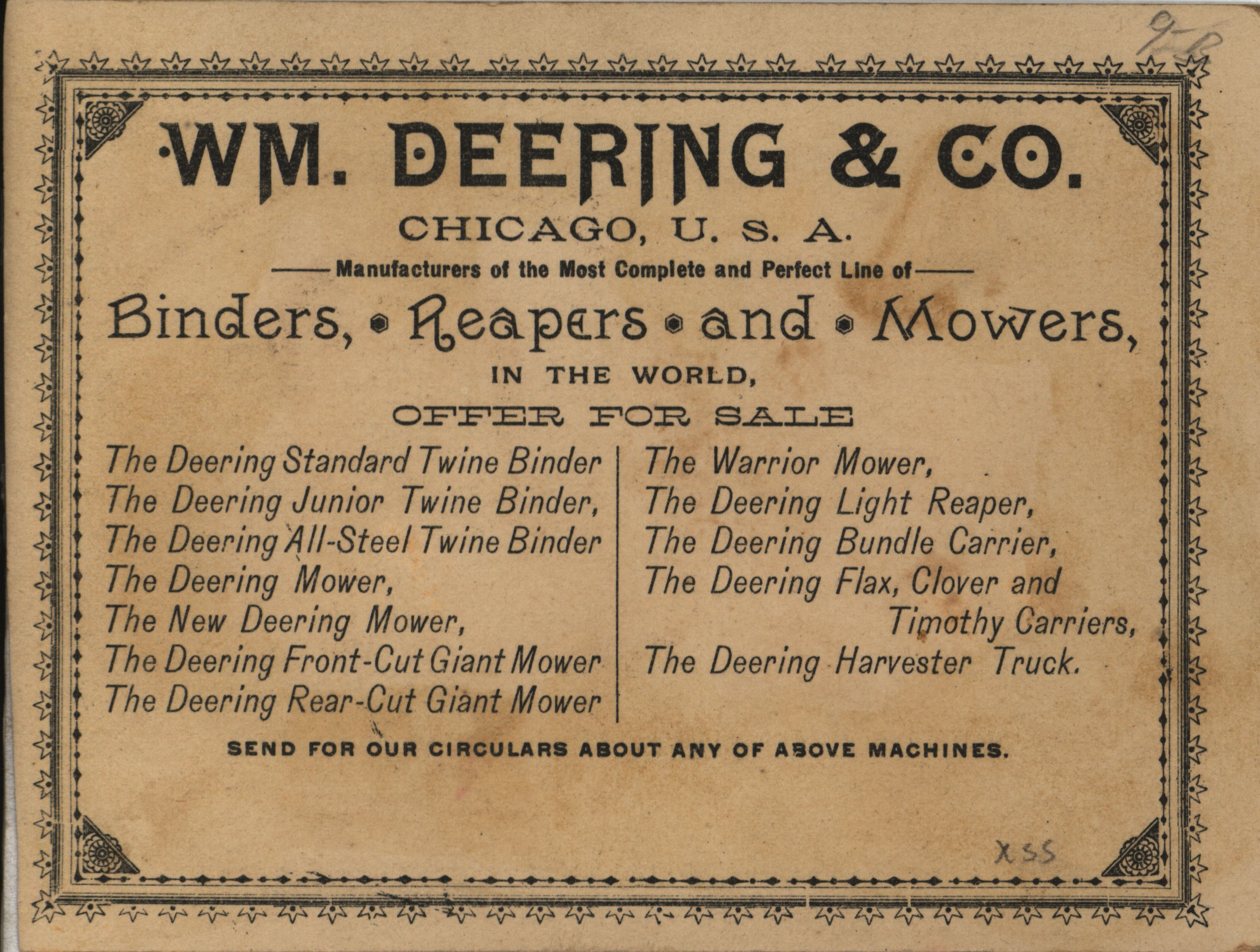 - "William Deering and Company grain and grass cutting machinery advertisement card", Agricultural Machinery Literature Collection, Iowa State University Library Digital Collections