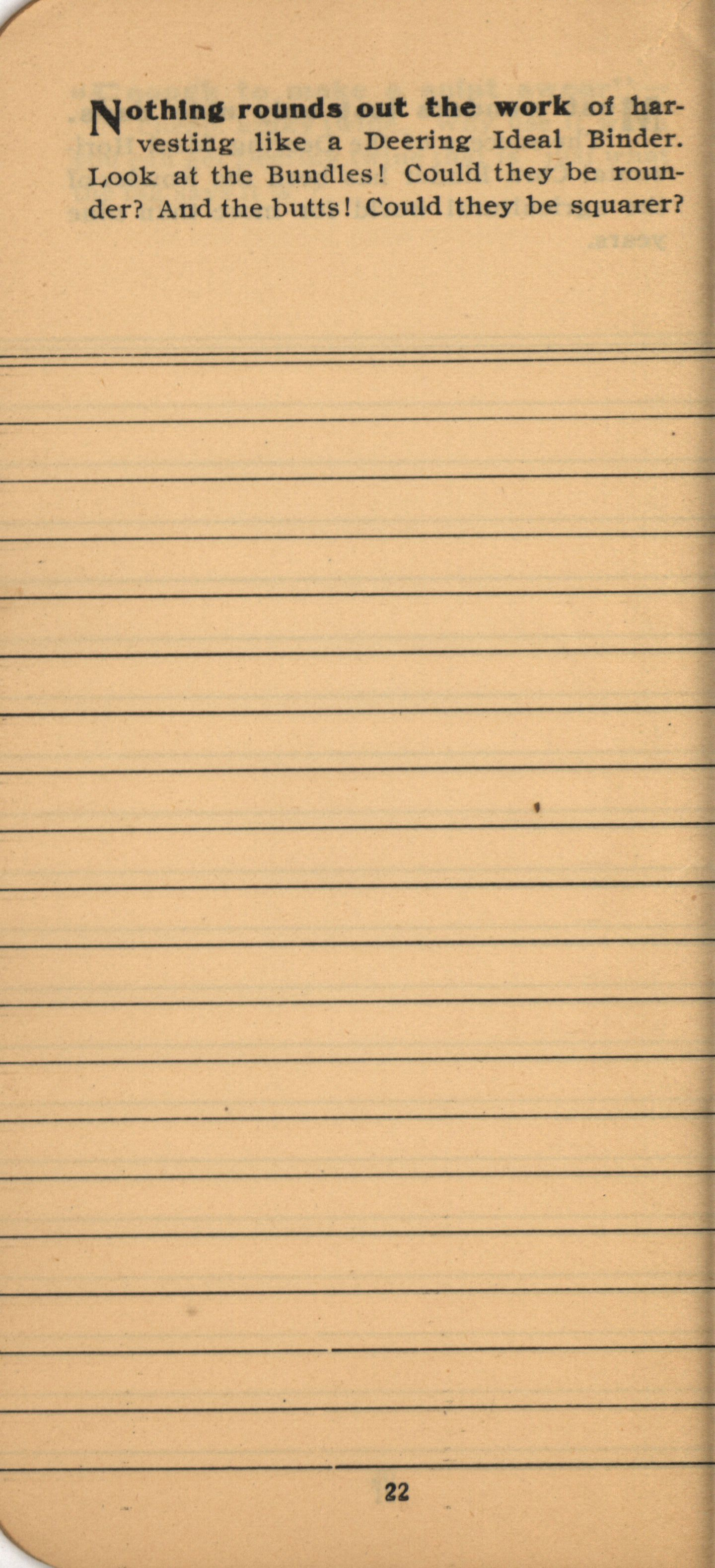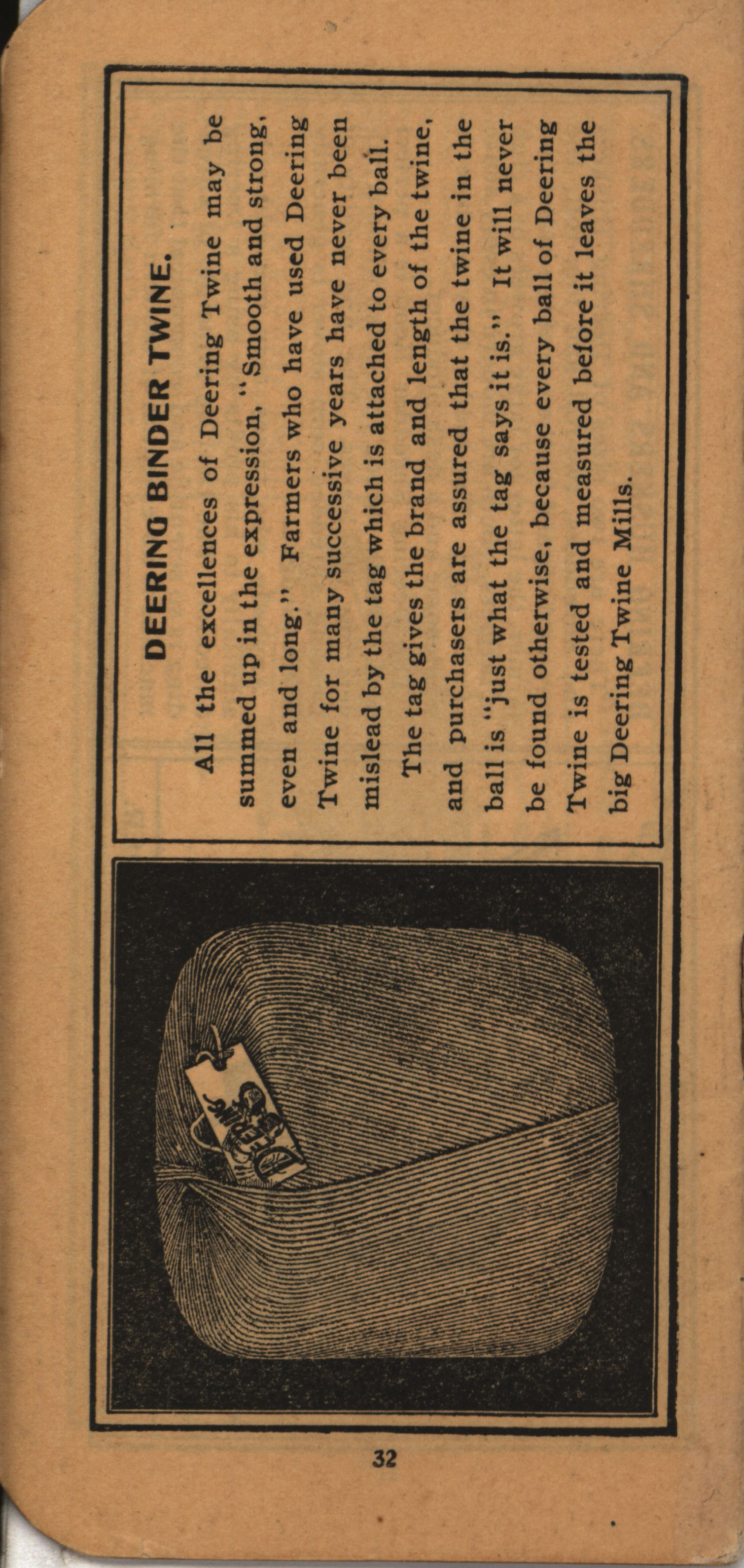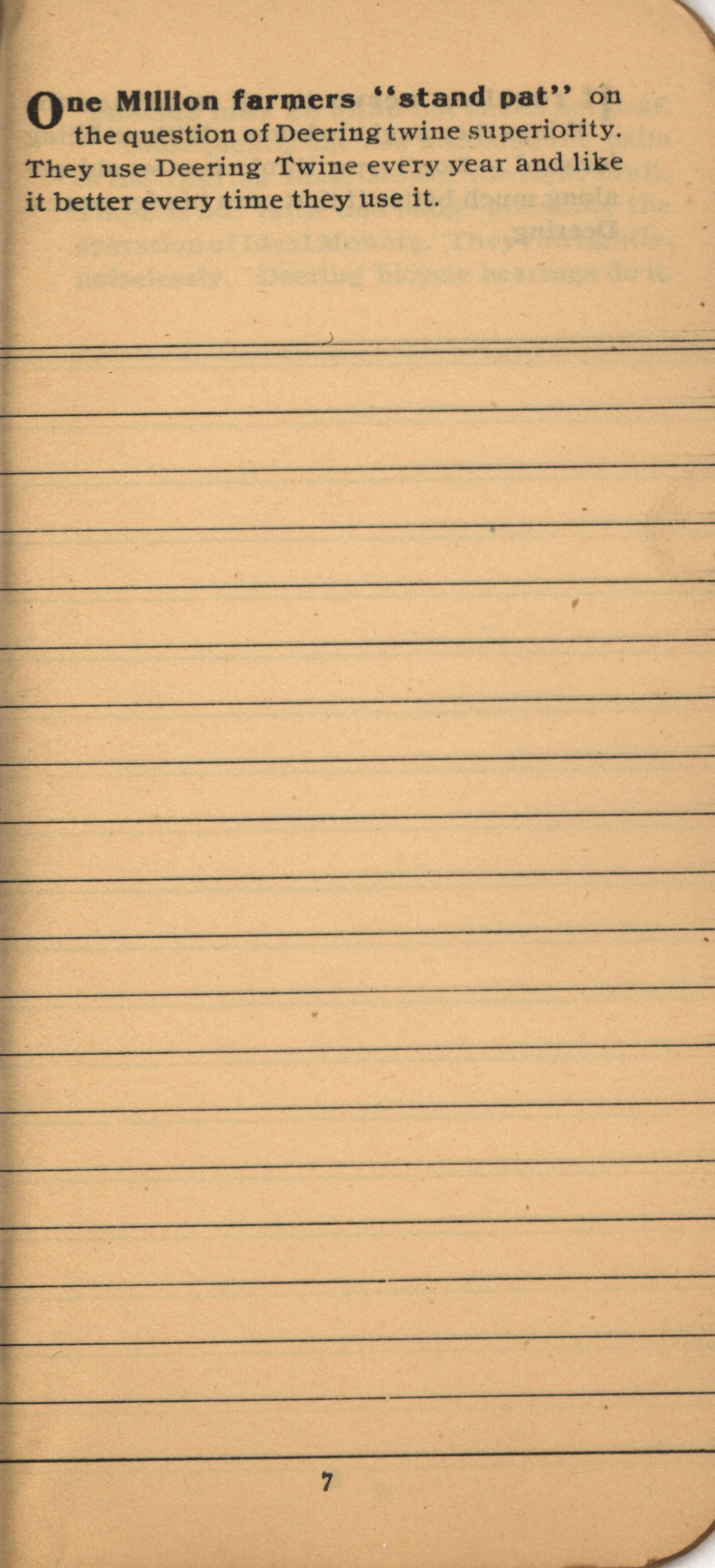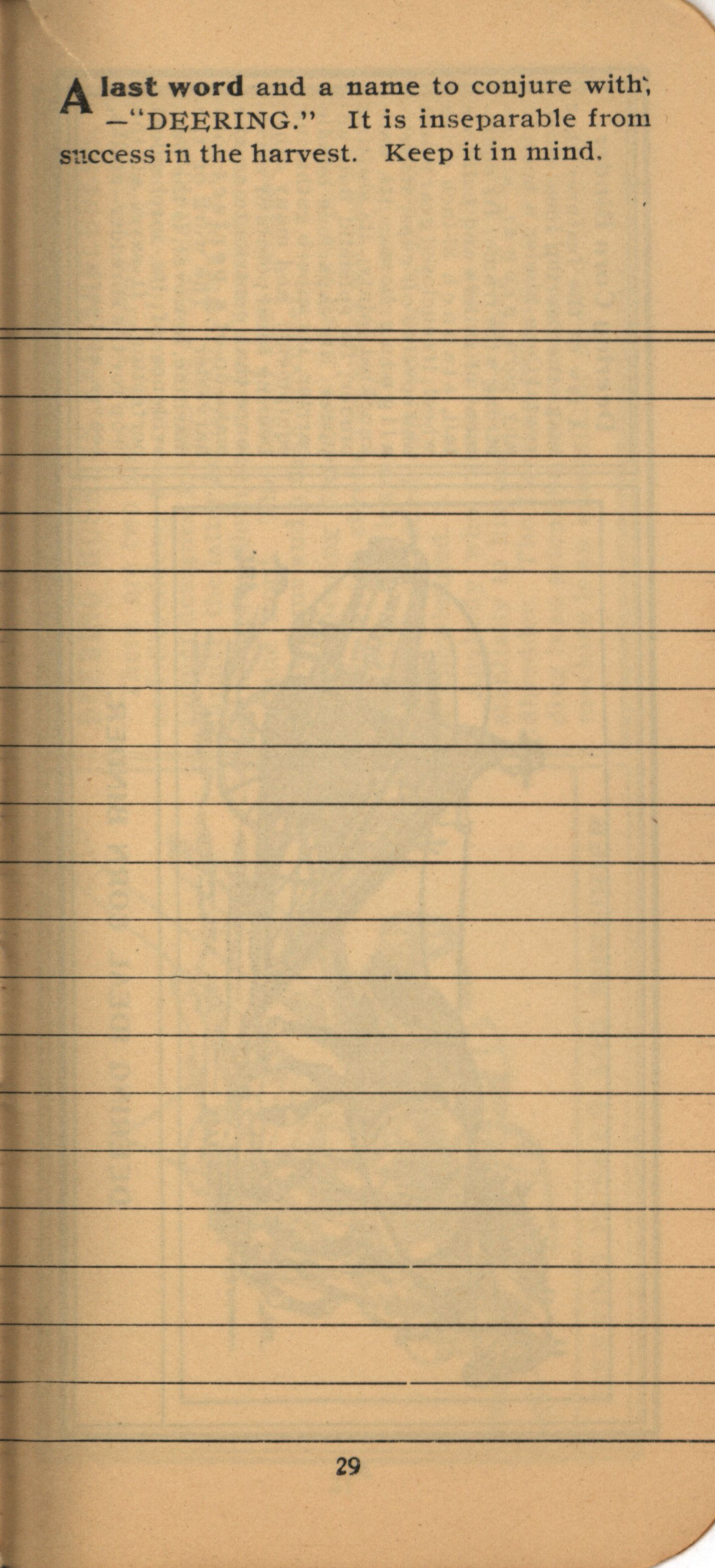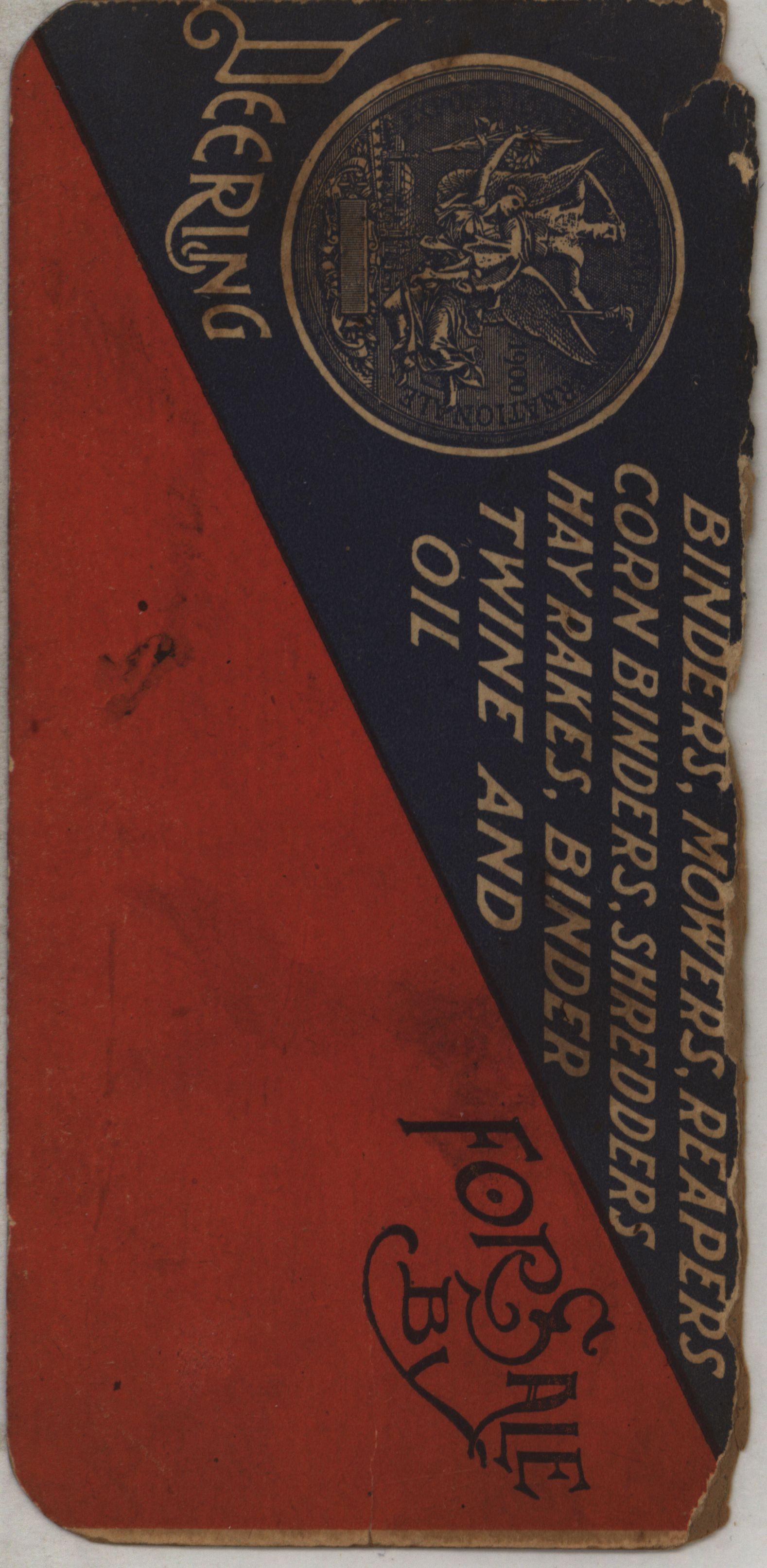 - Pocket notebook offered by William Deering and Company for advertisement purposes including a calendar and other useful information for farmers.